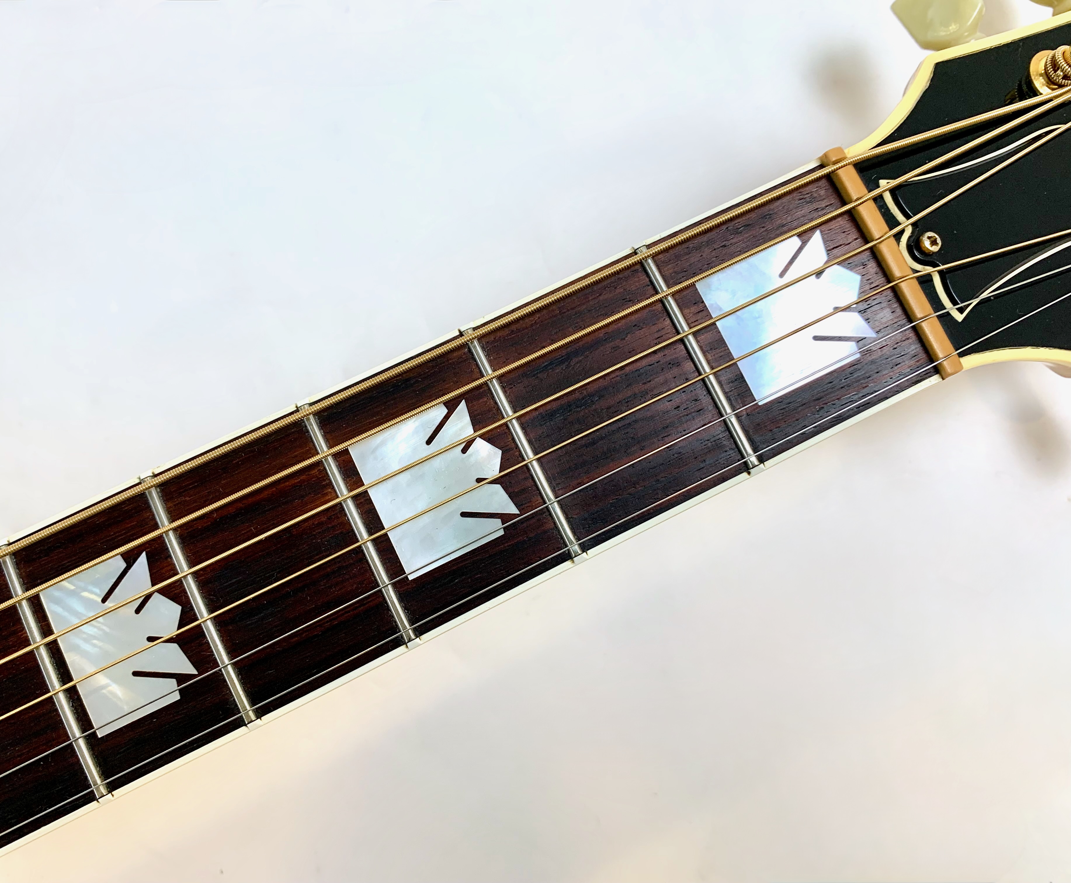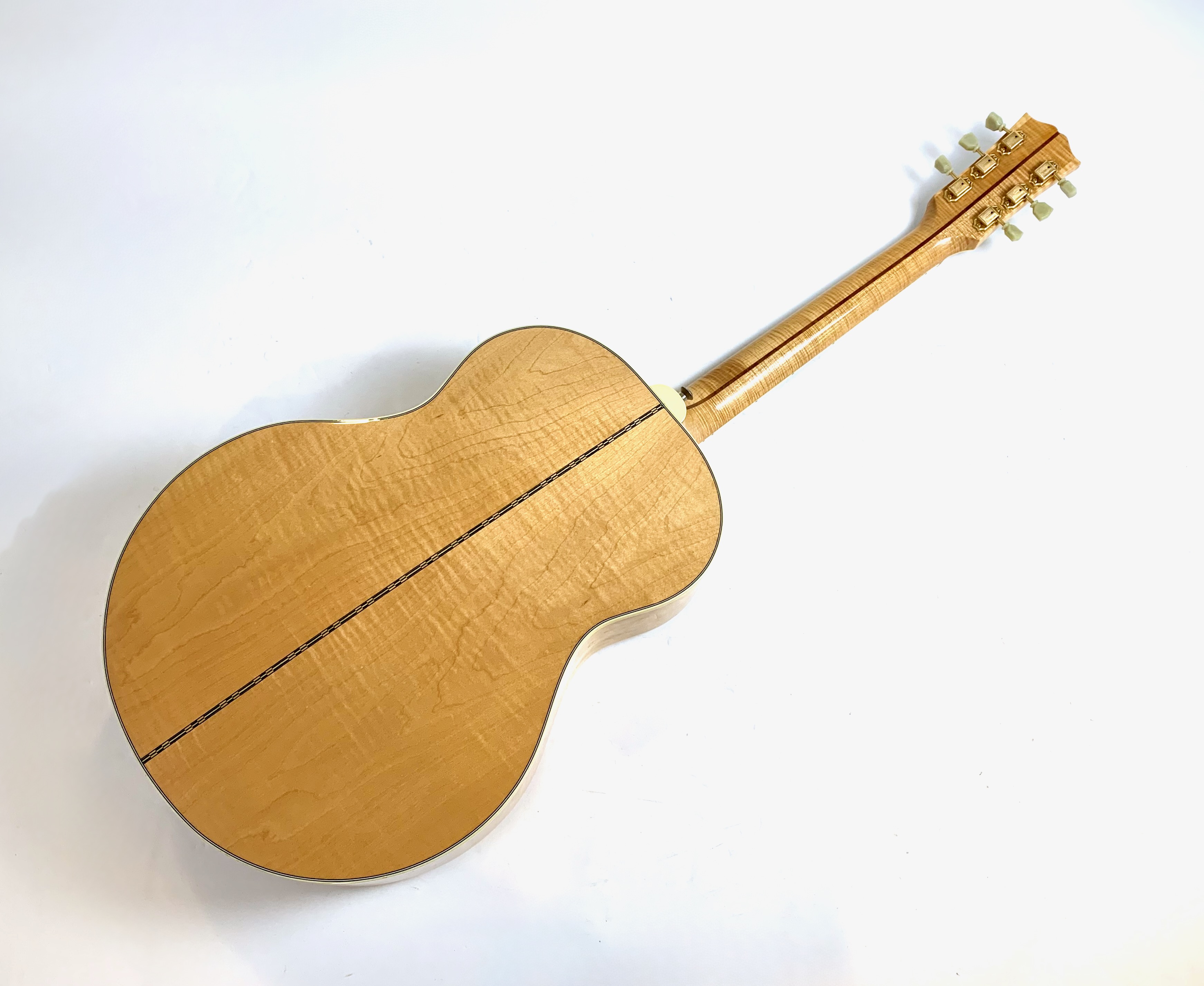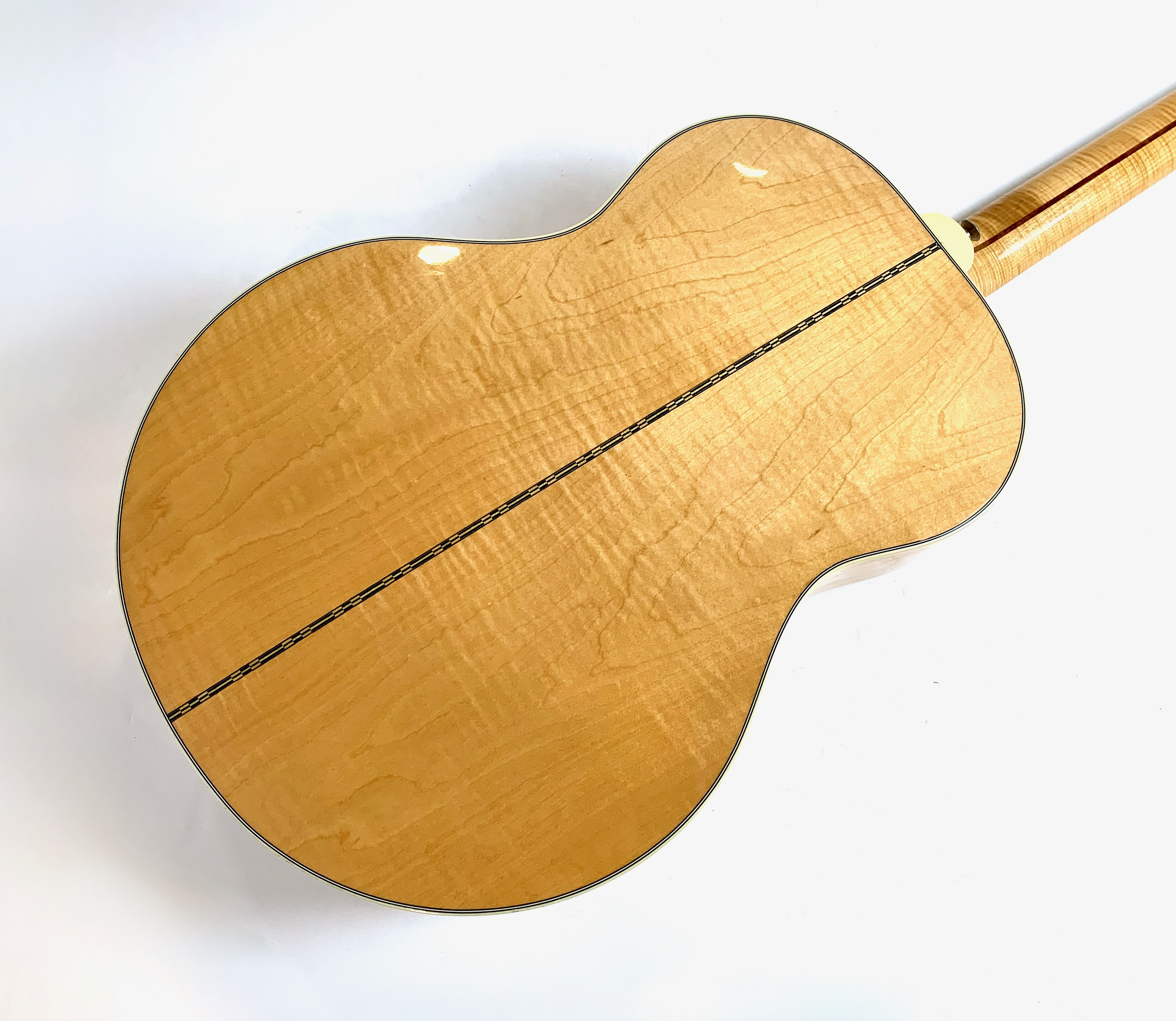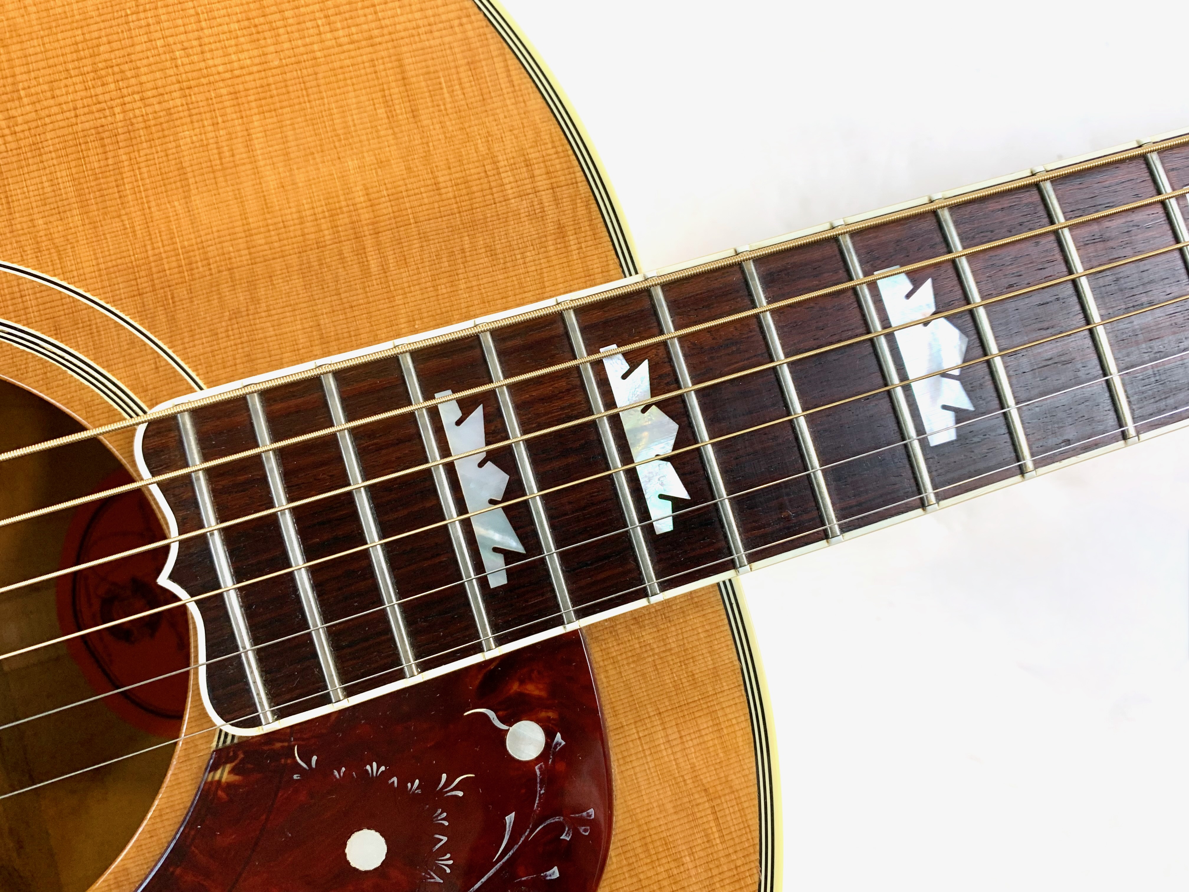 La J-200 est la reine des Jumbo ! Mais cette L-200 signature de l’artiste américaine Emmylou Harris est plus petite. L’érable qui compose ici le manche, le dos et les éclisses est particulièrement ondé, de toute beauté ! On trouve sur cette Gibson le fameux chevalet moustache, les repères de touche “crown” ou encore le pickguard joliment décoré. Elle est électro-acoustique d’usine avec un micro piezo. Rare, en bon état (on notera une fissure de vernis sur l’éclisse) et vendue dans son étui d’origine.Dépôt-vente, achat, vente, reprise, location.