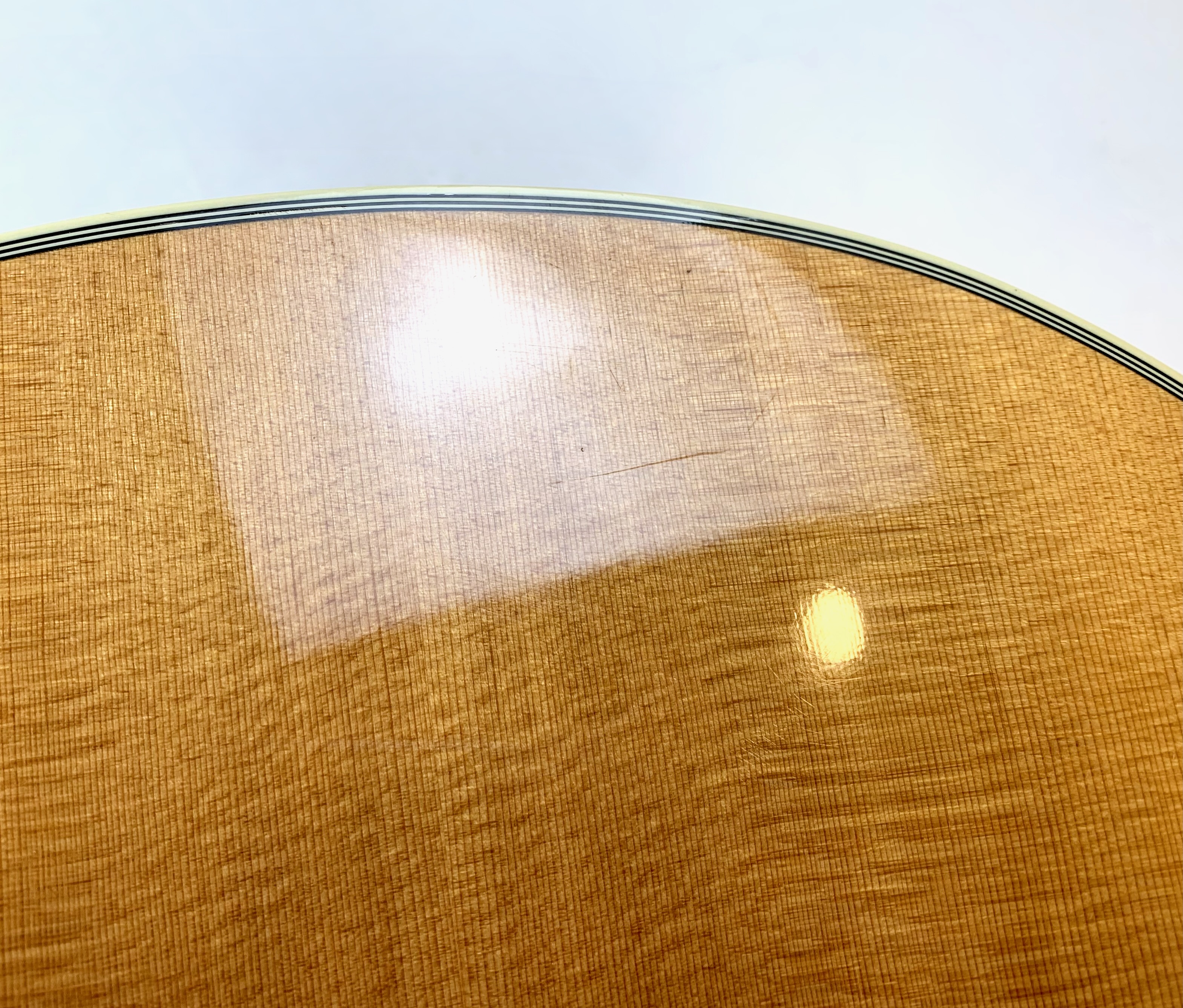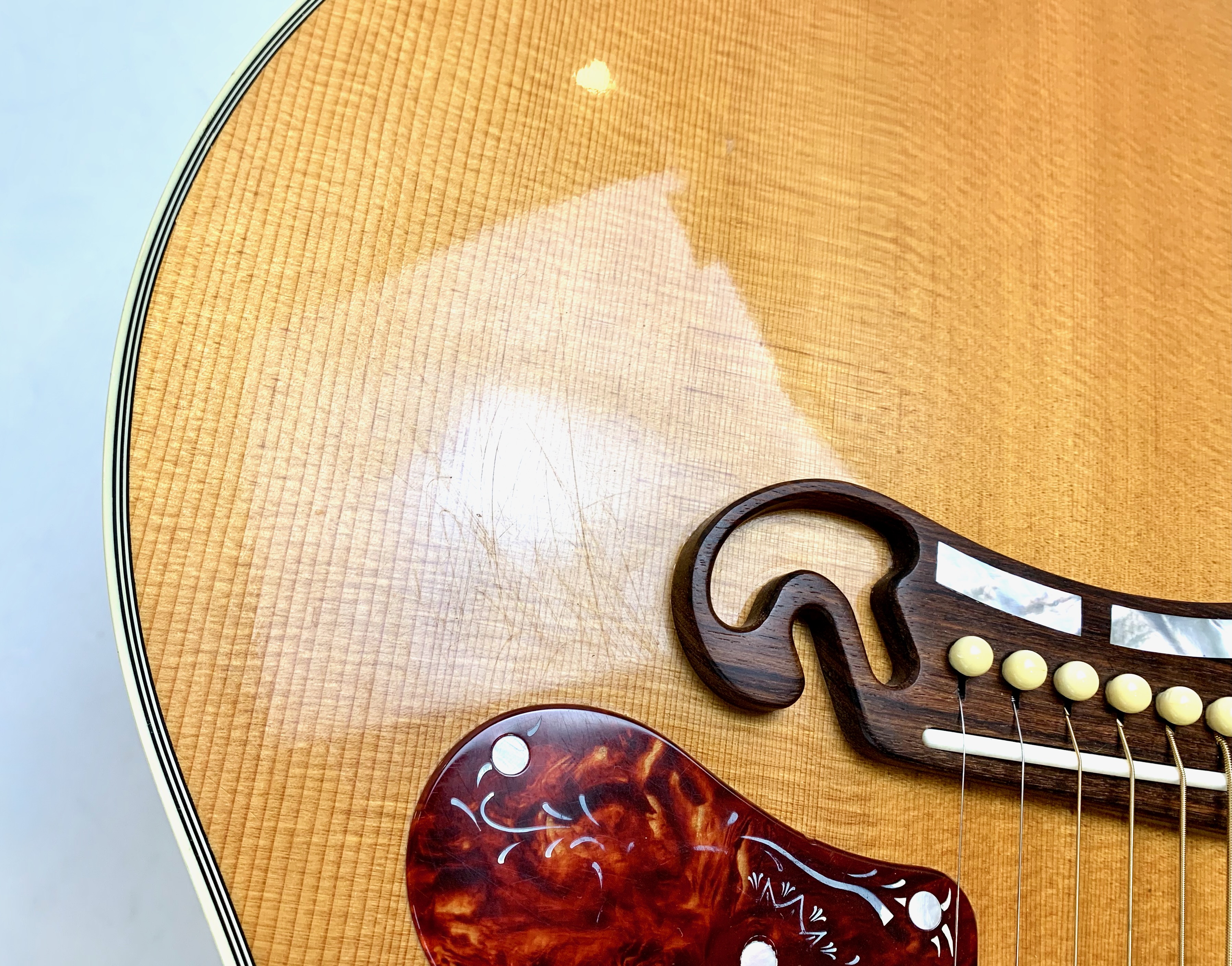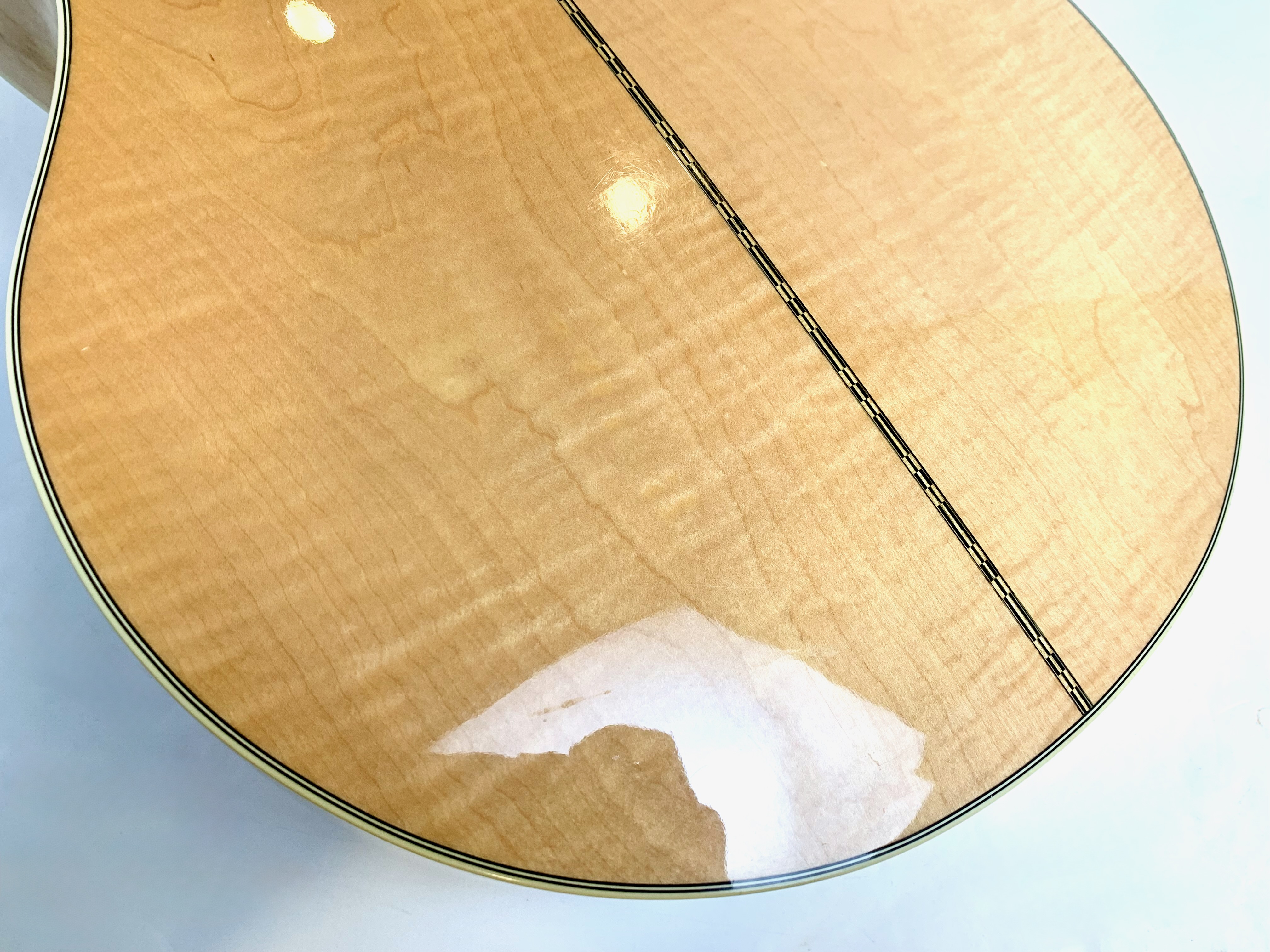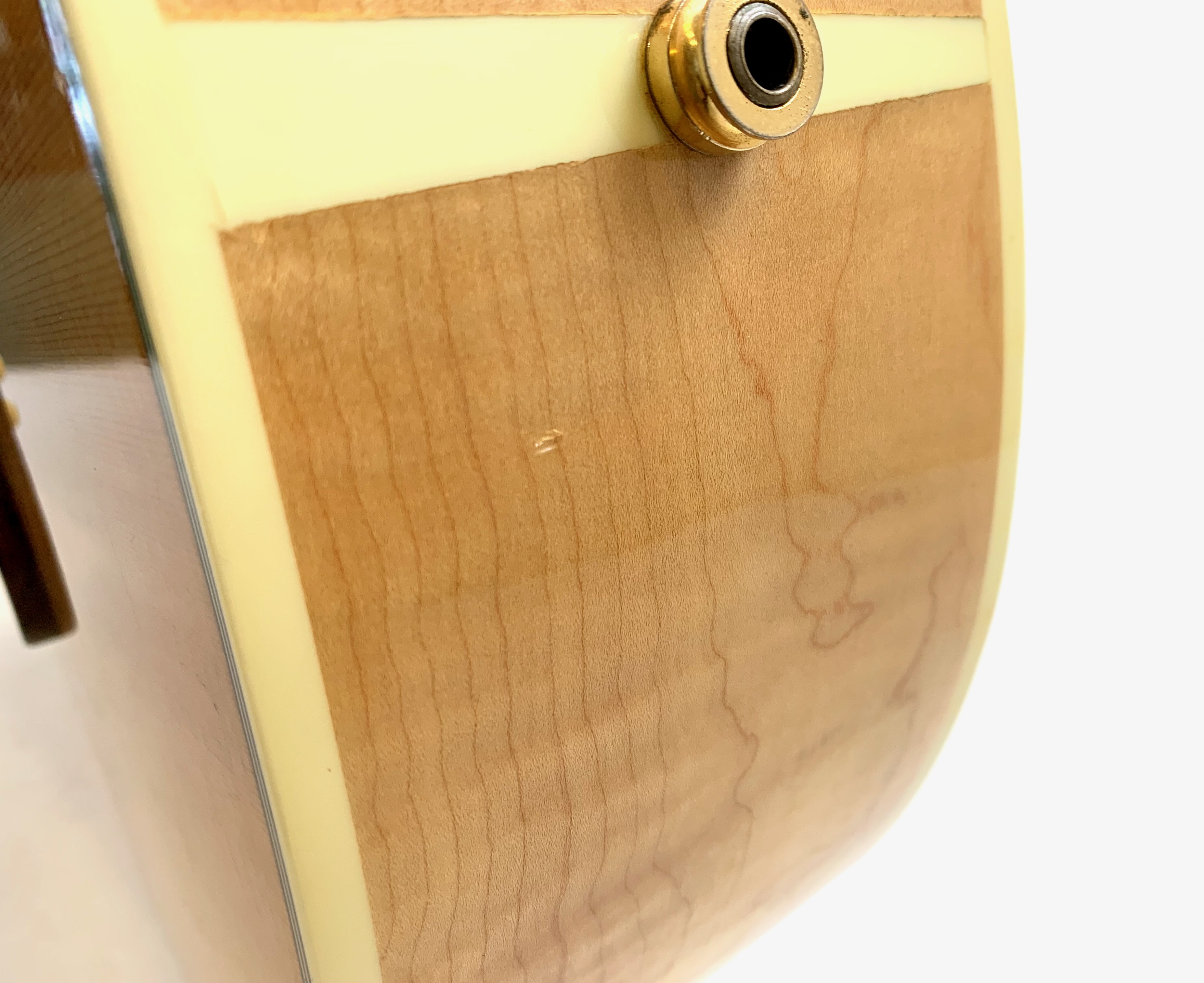La J-200 est la reine des Jumbo ! Mais cette L-200 signature de l’artiste américaine Emmylou Harris est plus petite. L’érable qui compose ici le manche, le dos et les éclisses est particulièrement ondé, de toute beauté ! On trouve sur cette Gibson le fameux chevalet moustache, les repères de touche “crown” ou encore le pickguard joliment décoré. Elle est électro-acoustique d’usine avec un micro piezo. Rare, en bon état (on notera une fissure de vernis sur l’éclisse) et vendue dans son étui d’origine.Dépôt-vente, achat, vente, reprise, location.