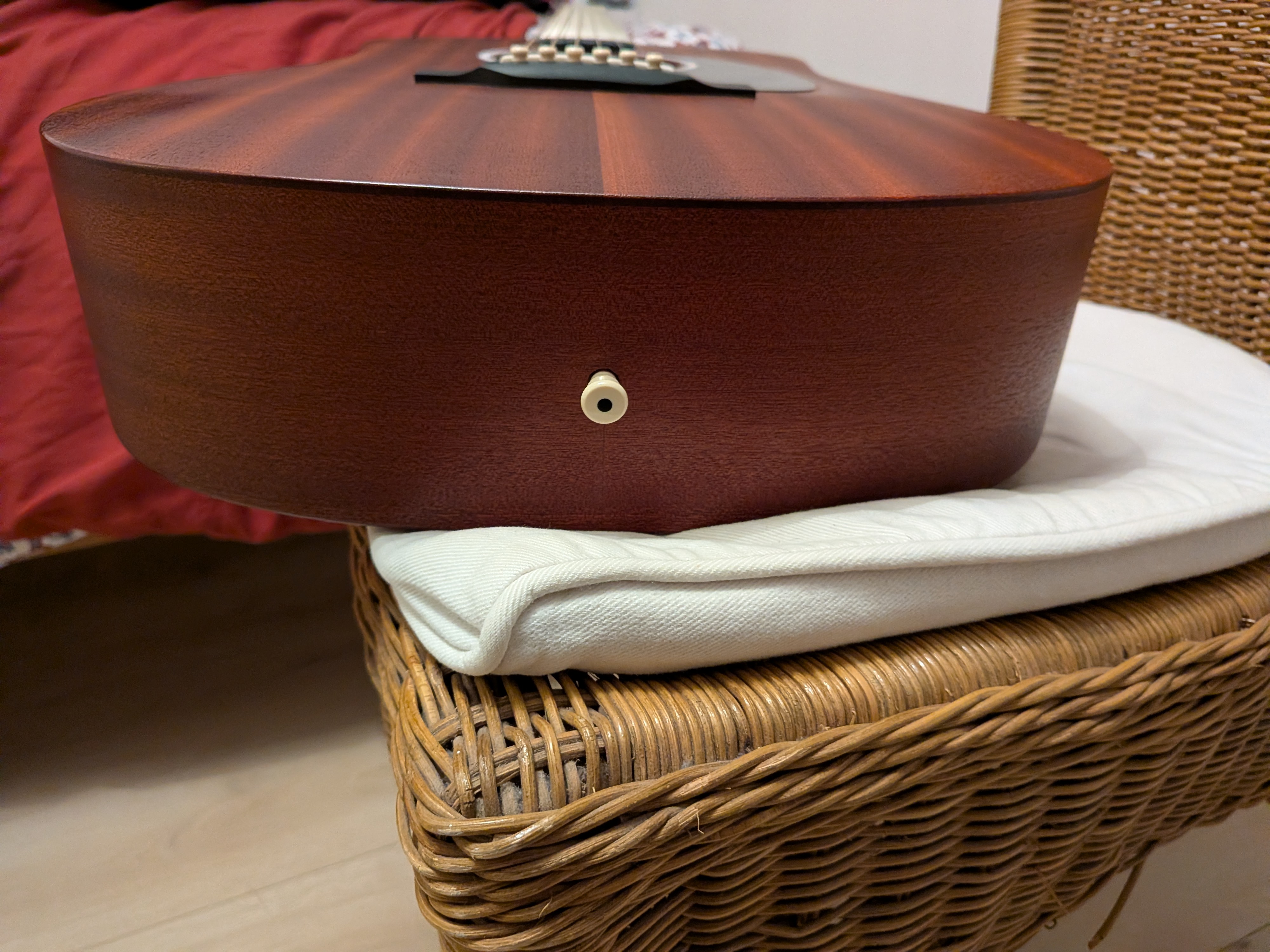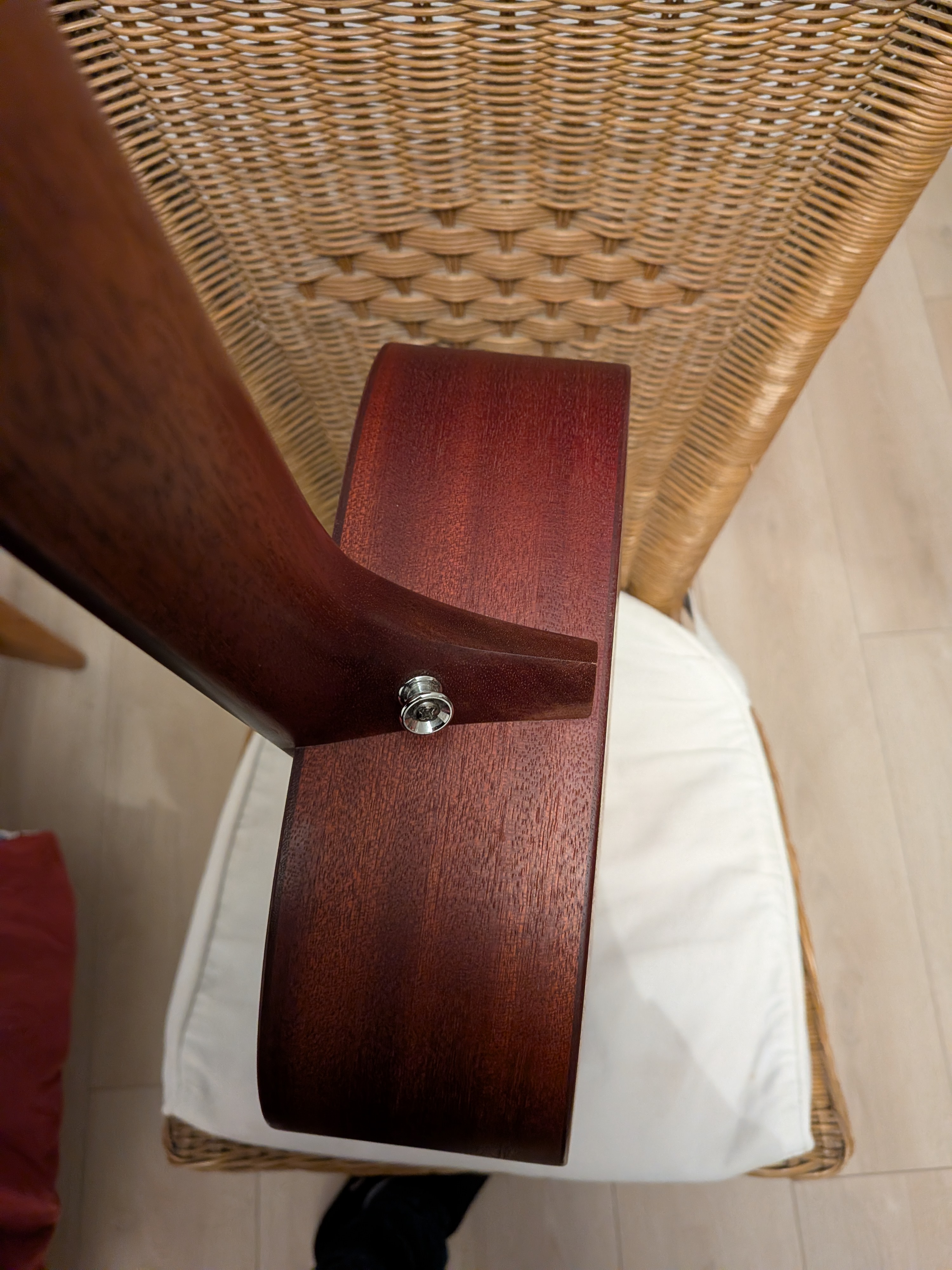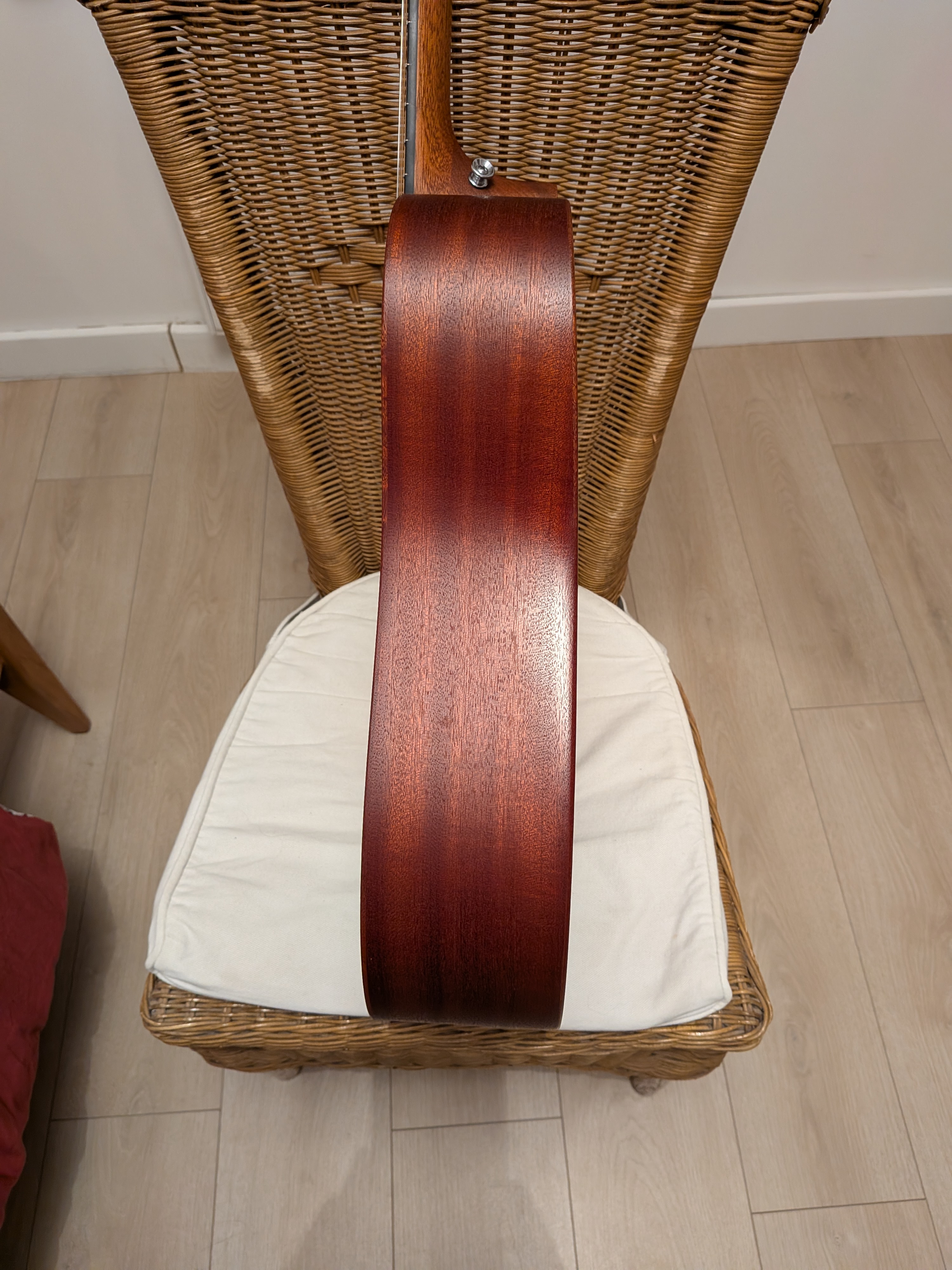 Entièrement massive (table + dos + éclisses). Bois massif de Sapele, proche Acajou Mahogany.