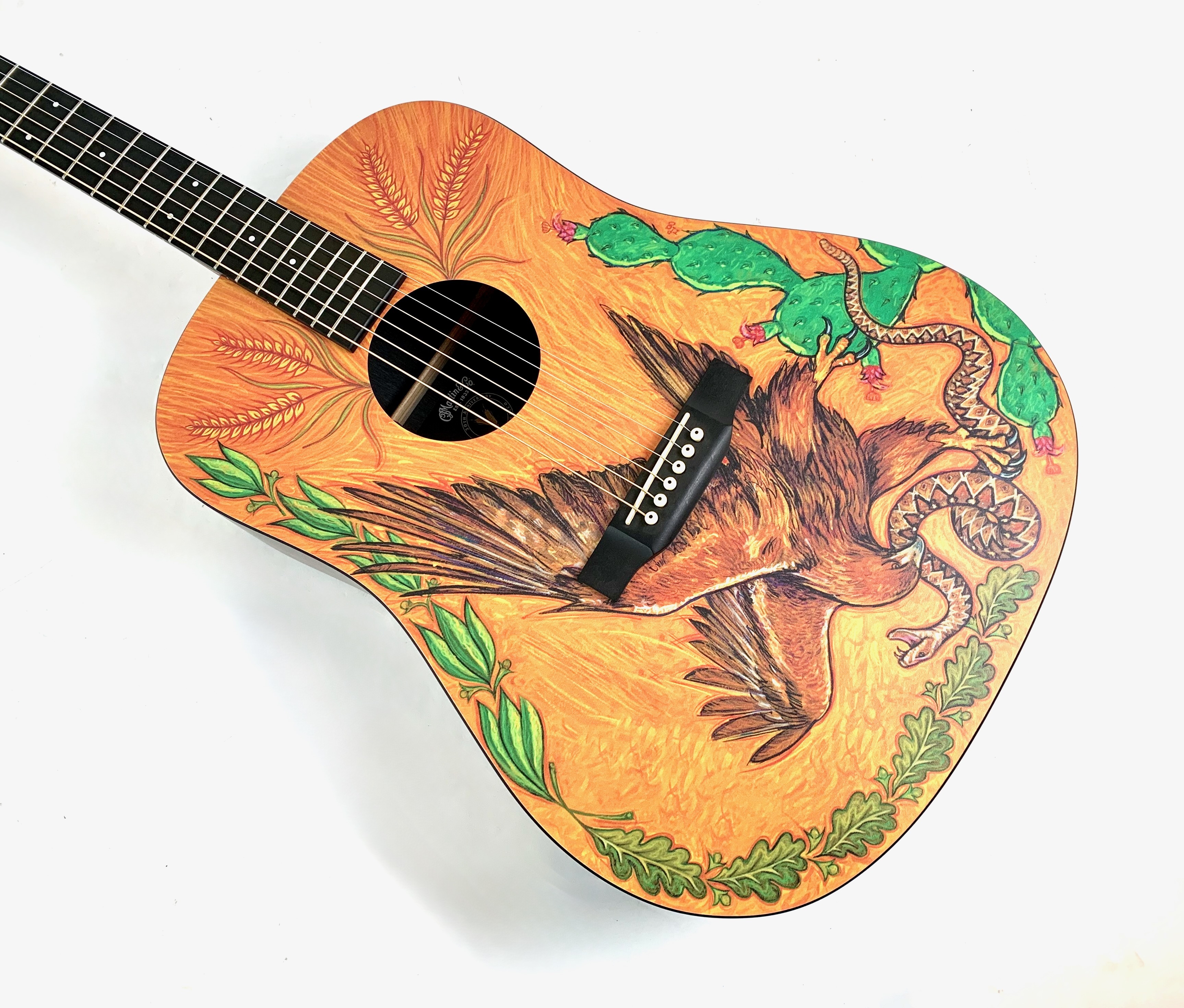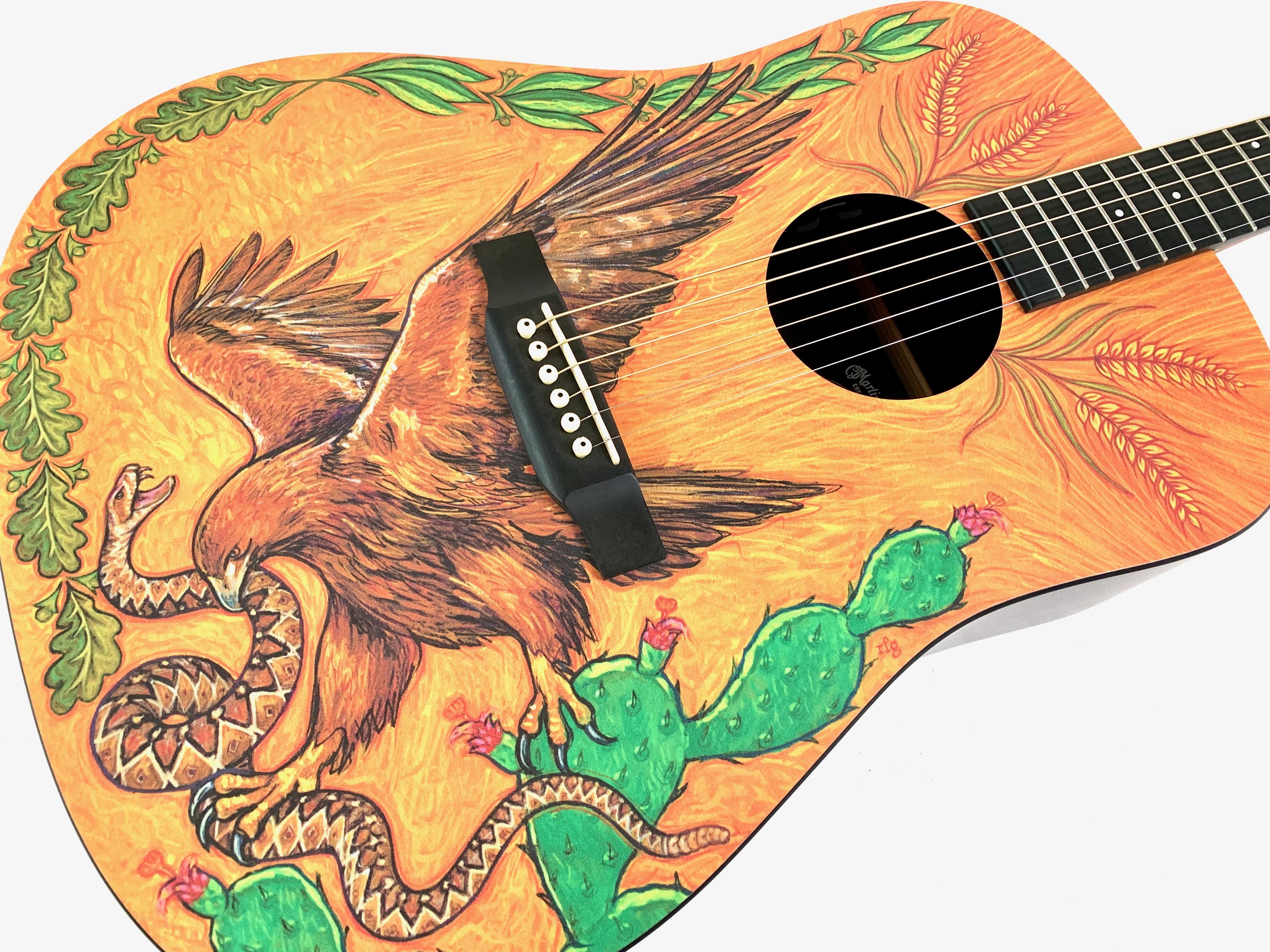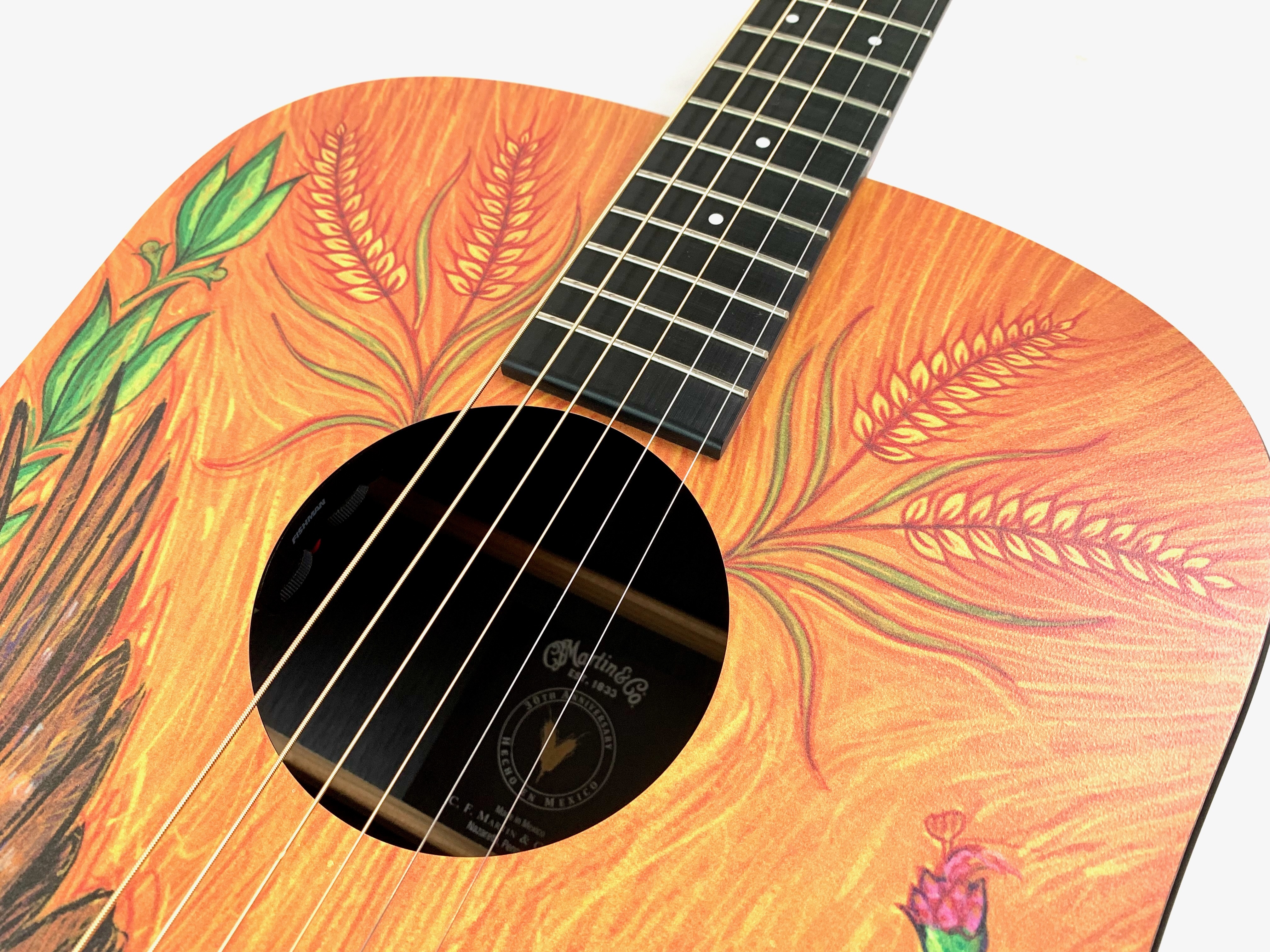 La DXMAE 30th Anniversary HPL est une électro-acoustique de la série X conçue pour célébrer les 30 ans de l’usine Martin au Mexique à Navojao : avec une table décorée d'un aigle attaquant un serpent. Contrairement aux Martin traditionnelles en bois massif, elle utilise du HPL (High Pressure Laminate) pour la table, le dos et les éclisses, avec un motif type Macassar, ce qui la rend plus robuste, stable et abordable tout en conservant une bonne projection. Équipée d’un manche en lamellé, d’une touche et d’un chevalet en Richlite, et d’un préampli Fishman Sonitone, elle est clairement pensée pour un usage pratique et amplifié. Son format dreadnought offre un son équilibré et efficace.Dépôt-vente, achat, vente, reprise, location.