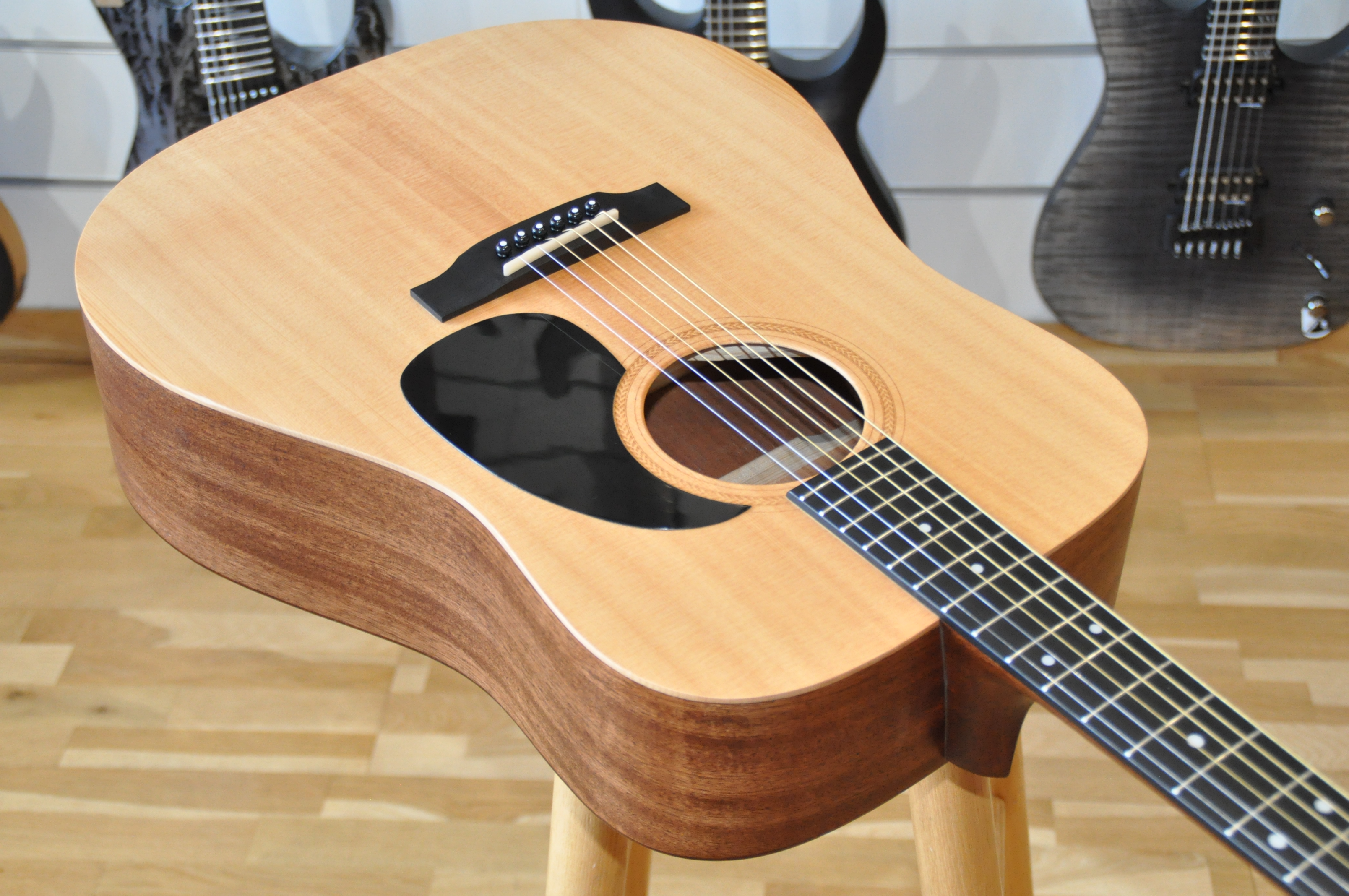 Ce caractère sonore si engageant est intimement lié au choix des bois et à la qualité de la lutherie. La table est en épicea massif (sitka), un bois réputé pour sa capacité à produire un son clair et vibrant avec une excellente réponse dynamique — à la fois puissant et articulé, idéal pour une grande variété de styles. Les éclisses et le dos en acajou ajoutent de la chaleur, une rondeur naturelle et une présence qui enrichissent le spectre tonal. Ensemble, ces bois forment un équilibre sonore rare : ampleur, définition et complexité harmonique coexistent sans rivalité, offrant un rendu musical aussi séduisant que cohérent.