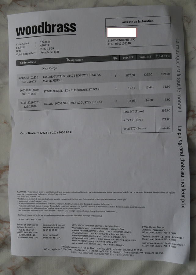 Sa Taylor 214ce de 2022. Elle est dans un état proche du neuf, et a pas mal été jouée d'où un son bien "ouvert". Il en a toujours pris grand soin, nettoyage après chaque utilisation. Une planimétrie ainsi qu'un sillet en os, sur mesure ont étés réalisés par un luthier en juillet 2024 (la facture en sera remise au moment de l'achat).