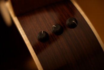 Concernant les lettres « ce », elles signifient « avec Cutaway (pan coupé) et avec la technologie Expression System ». Cet ensemble de capteurs était originellement positionné dans la caisse derrière le manche et au-dessus de la rosace, endroits clés de la transmission des ondes sonores au sein de la caisse. Mais il est important de préciser que ce système a également été revu (on en est à la version 2) et est désormais présent sur toutes les nouvelles guitares électro-acoustiques de Taylor. C’est un retour aux micros piezos, au nombre de trois et placés derrière le sillet de chevalet. On dispose toujours de trois potentiomètres : aigus, basses et volume.
