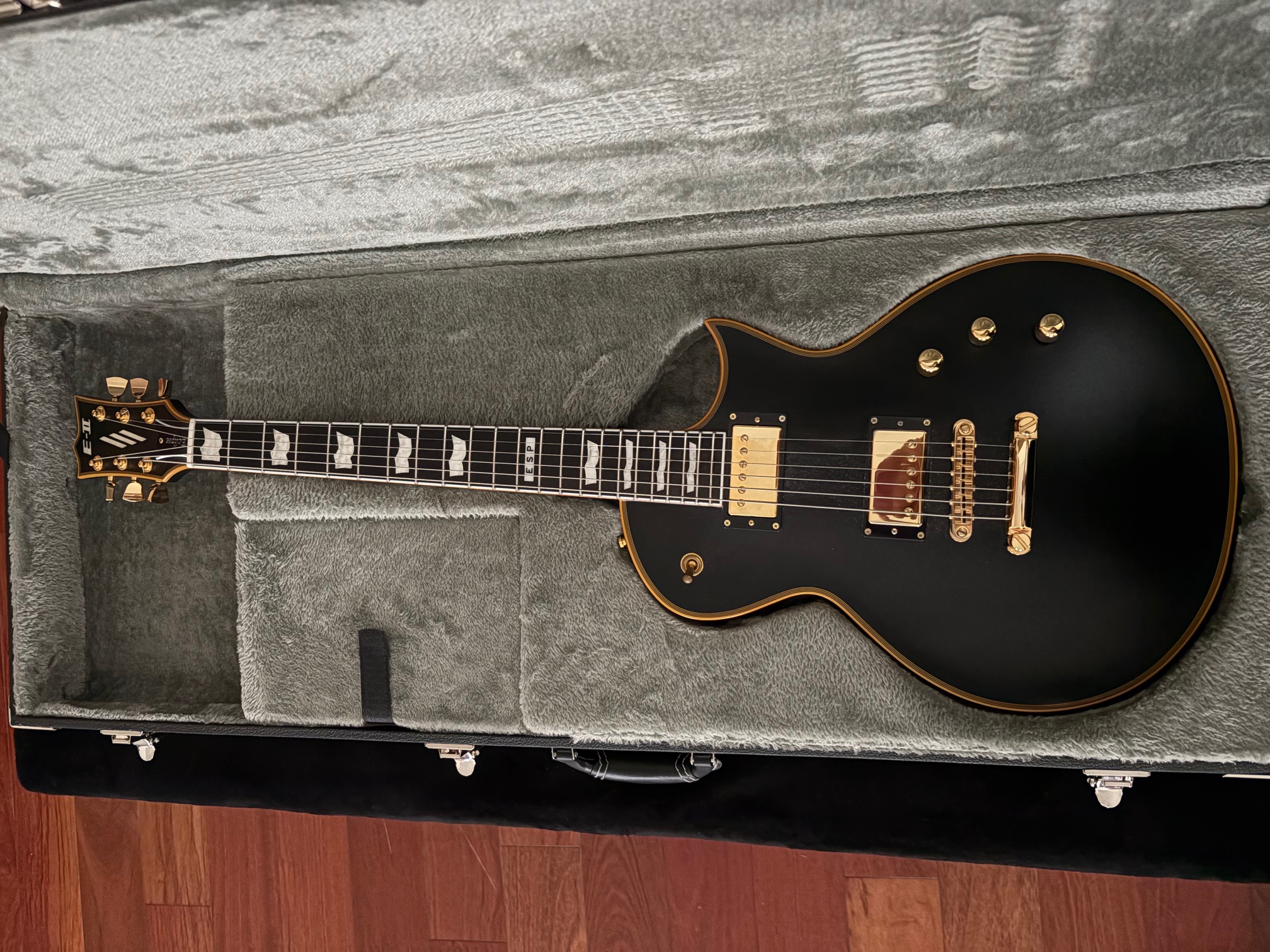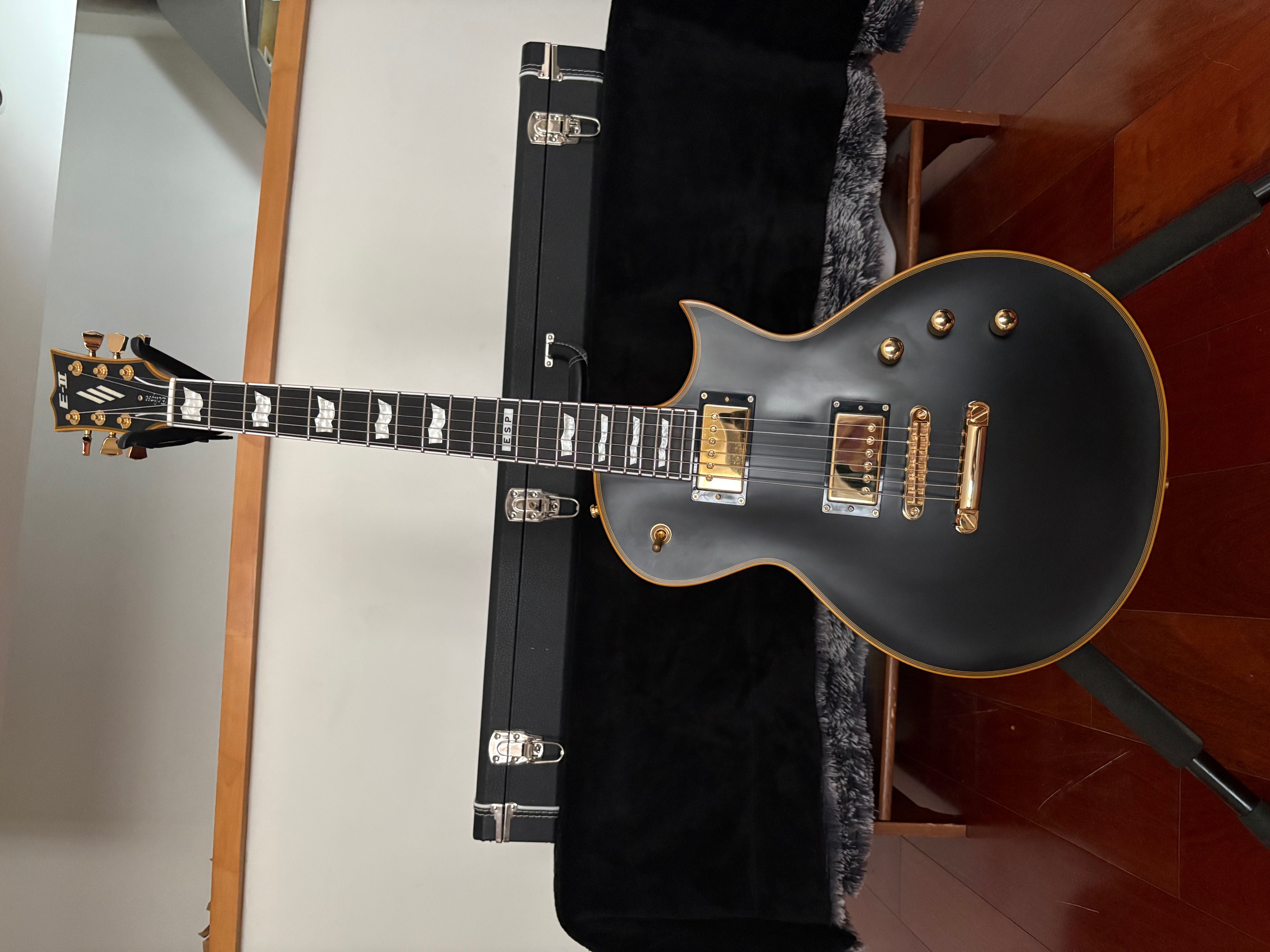 ESP E-II Eclipse made in Japan avec son finish légendaire : vintage black double bindings dorés.La guitare est comme neuve, fut utilisée pour enregistrement studio uniquement, n'a pas de rayures, pets, ni défaut ; n'est jamais sortie du studio, aucun concert à son actif. Accessoires, hardcase, tout est là, comme au magasin. La guitare n'a pas été retouché : pas de luthier/révision, pas de modification ni changement de micro ; tout est original. Elle n'a été joué que par moi-même, traîtée avec grand soin, nettoyée et rangée dans sa caisse après chaque session, aucune exposition extérieure ni exposition en studio.