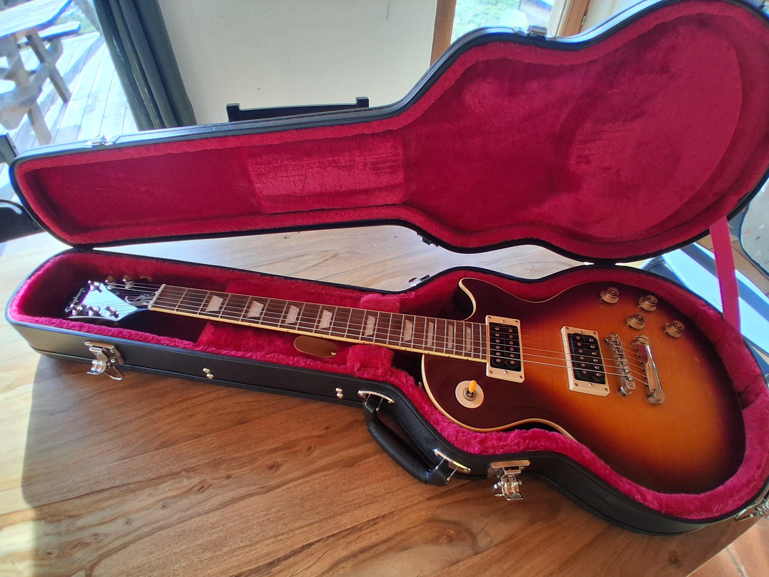 Vends Epiphone by Gibson Slash Les Paul Standard november burst avec étuiGuitare achetée en mai 2024 775€.