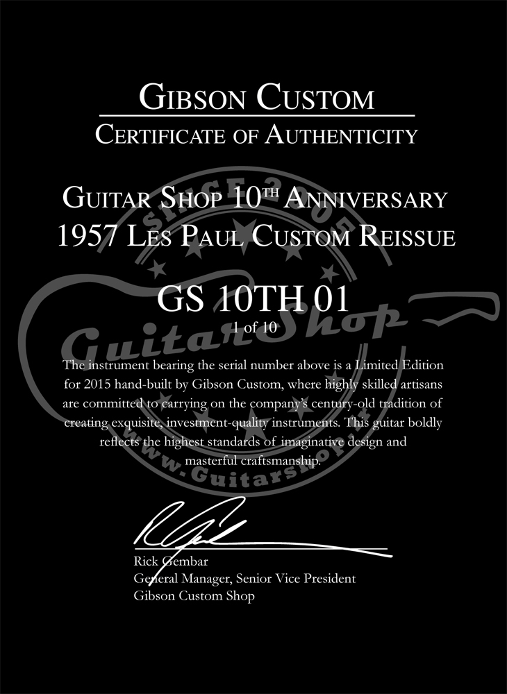 Fabriquée à seulement 10 exemplaires, cette Gibson 1957 Les Paul Custom Reissue est proposée en finition VOS. Chaque exemplaire est numéroté et accompagné d’un certificat d’authenticité.