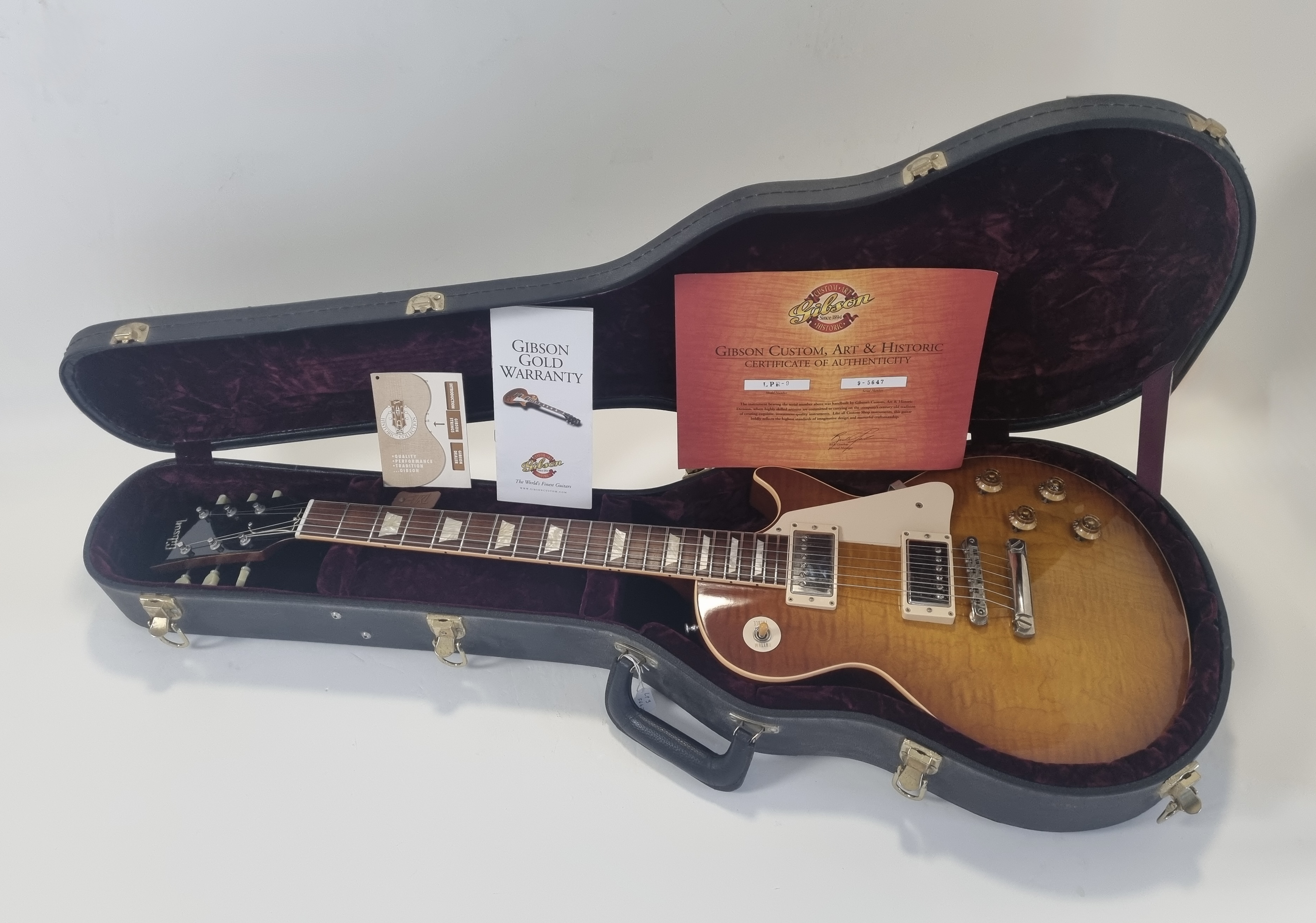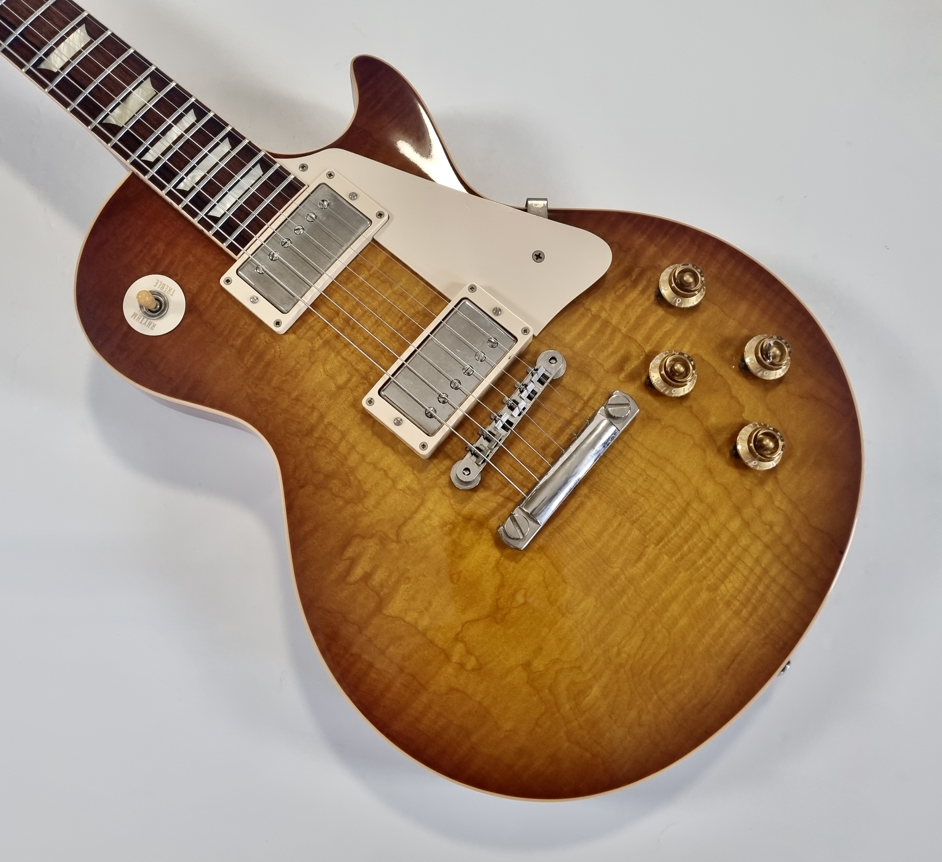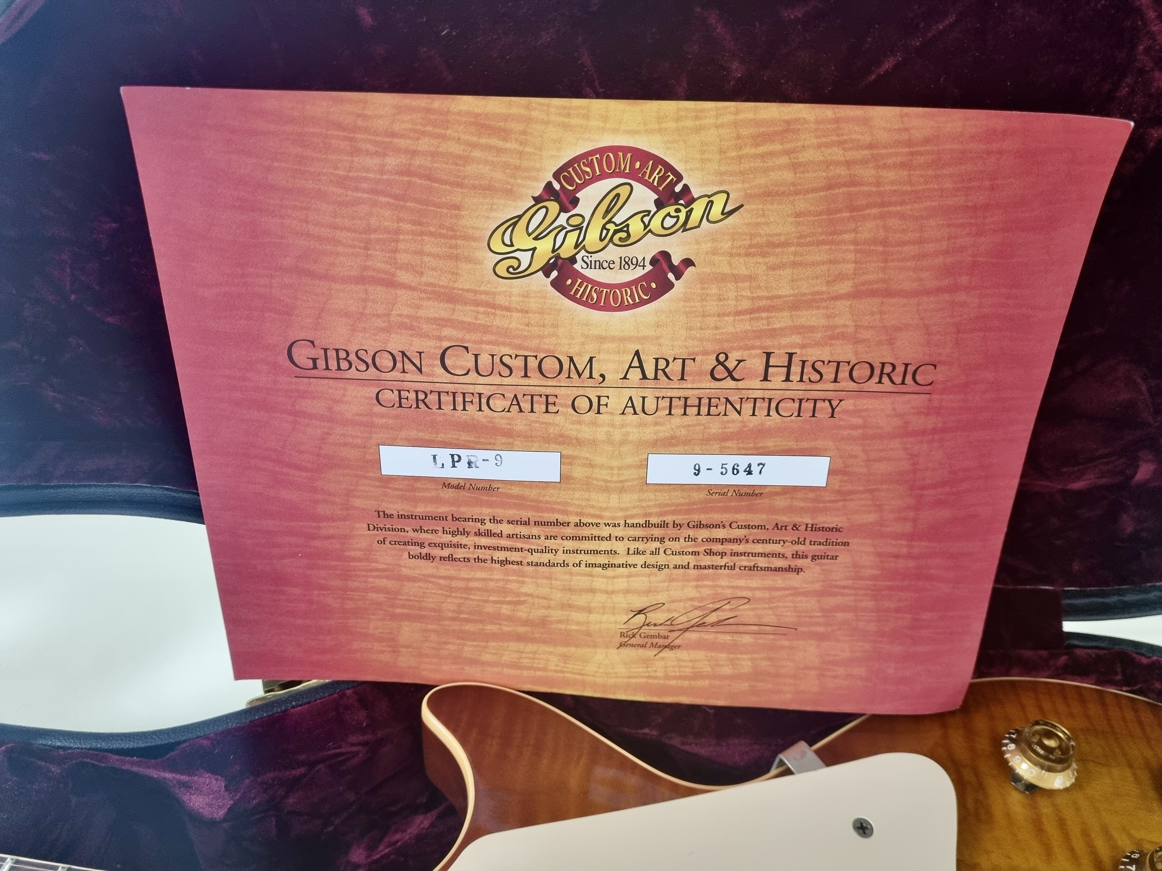 1959 est sans doute l’année la plus mythique pour Gibson… Cette R9 a un manche en acajou entre deux, ni trop gros, ni trop fin. La table en érable de celle-ci est très belle, flammée… Le corps est également en acajou et la touche en palissandre a un radius de 12 pouces. Sur cette Custom Shop les micros sont des Burstbuckers 1 et 2. Vendue dans son étui d’origine avec son certificat d’authenticité.Dépôt-vente, achat, vente, reprise, location.