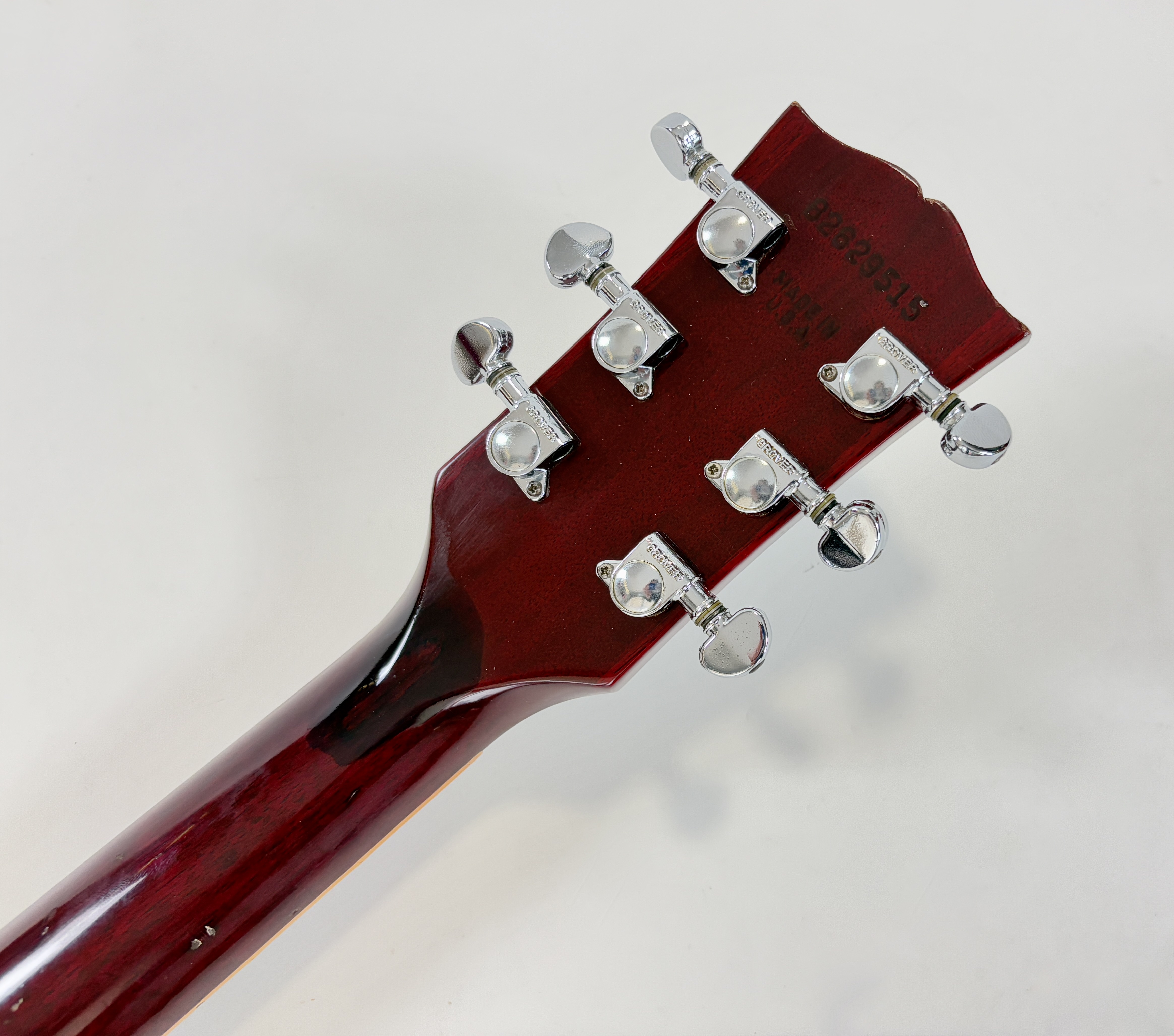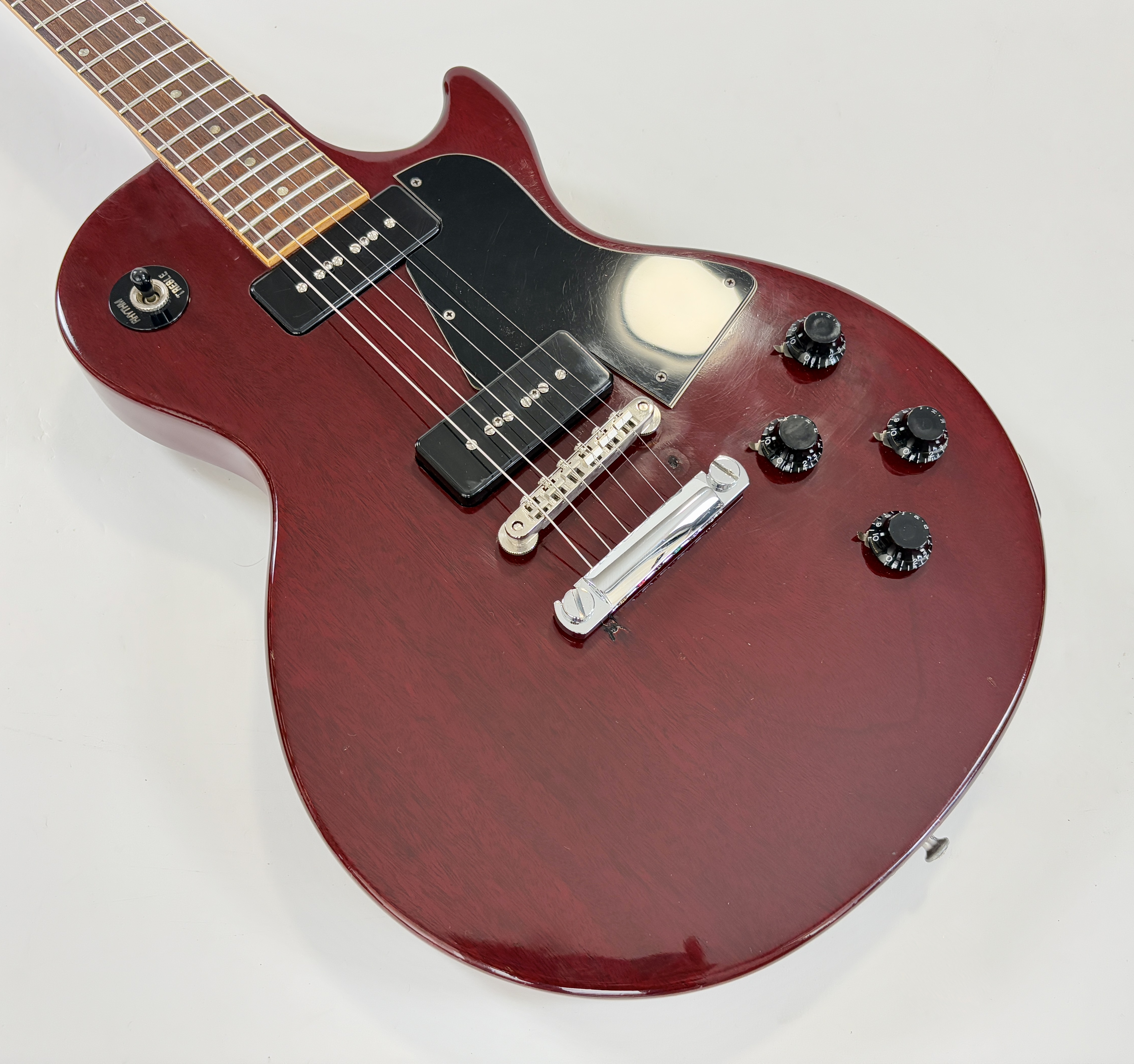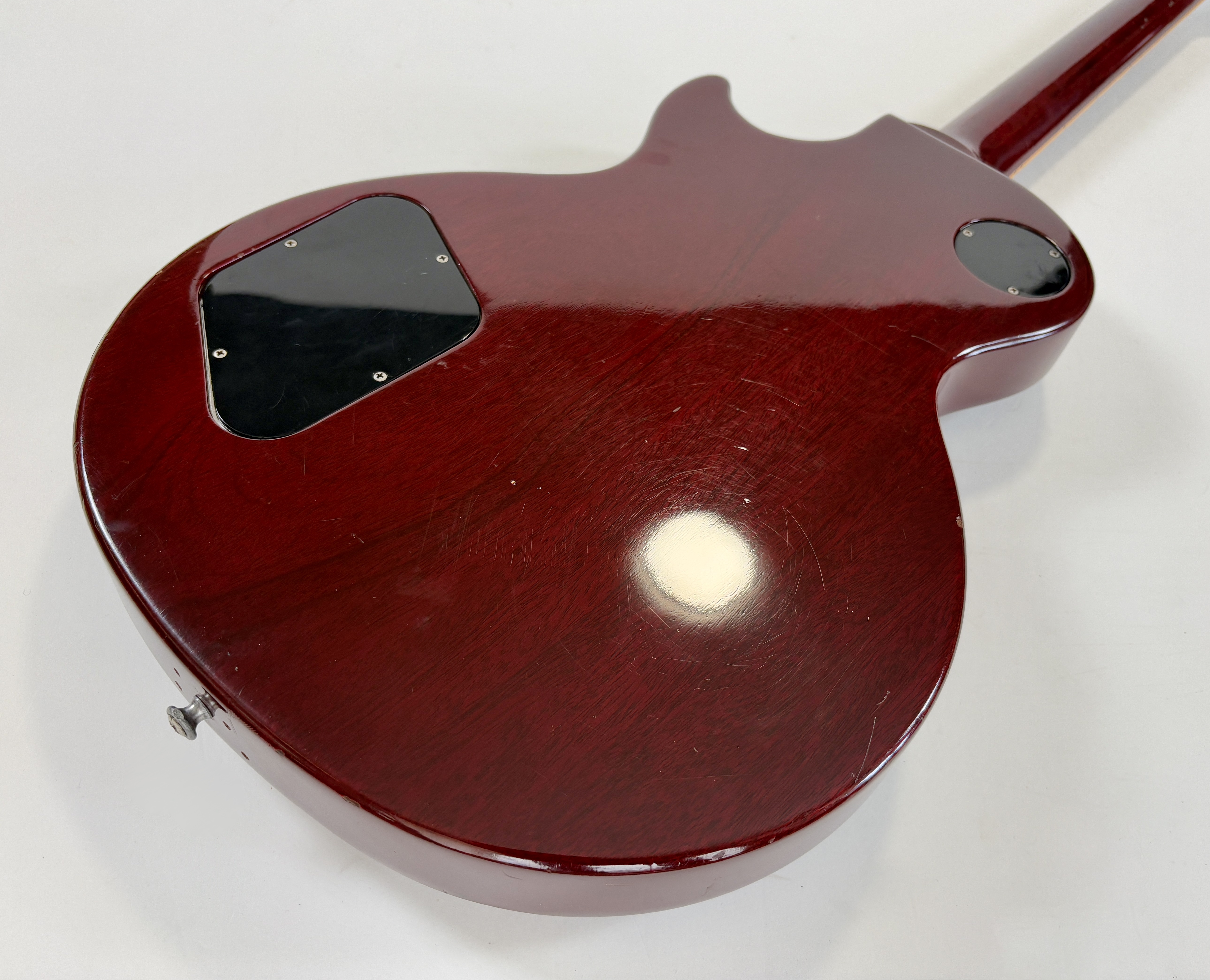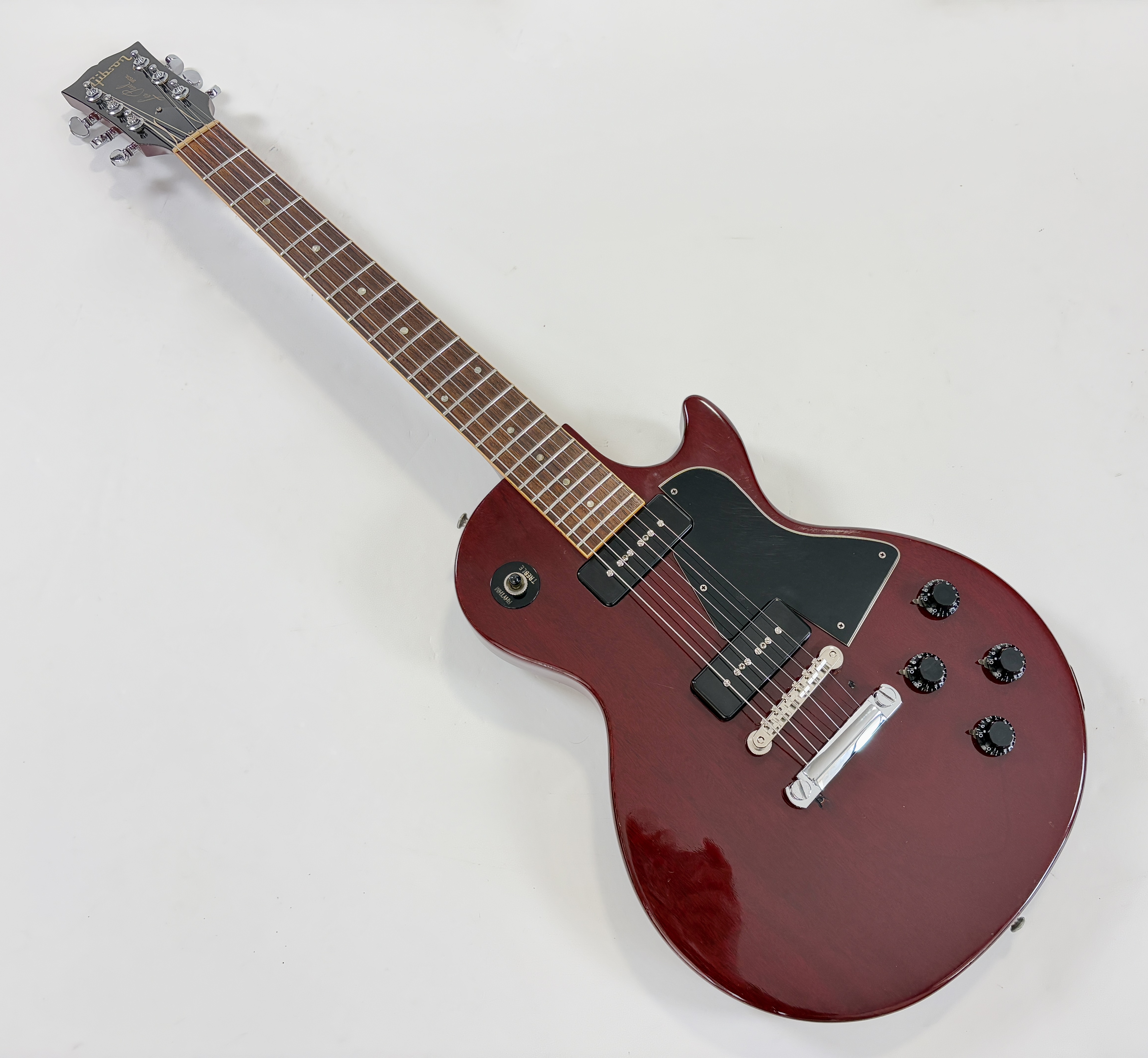 Par rapport à la Junior, la Special offre un binding autour de la touche en palissandre, un beau logo ainsi que… un second micro. La construction est classique : corps et manche en acajou, touche en palissandre au radius de 12 pouces. On notera sur cet exemplaire le remplacement des micros, des condos Sprague, chevalet remplacé, tête réparé, enfin un ajout puis retrait d'un Bigsby. A cette période Gibson ne montait plus des wraparound mais un classique Tune-O-Matic plus pratique au quotidien. Elle date d'une période prisée des amateurs de la marque : 1989 ! Vendue en housse.Location, achat, vente, reprise, dépôt-vente.