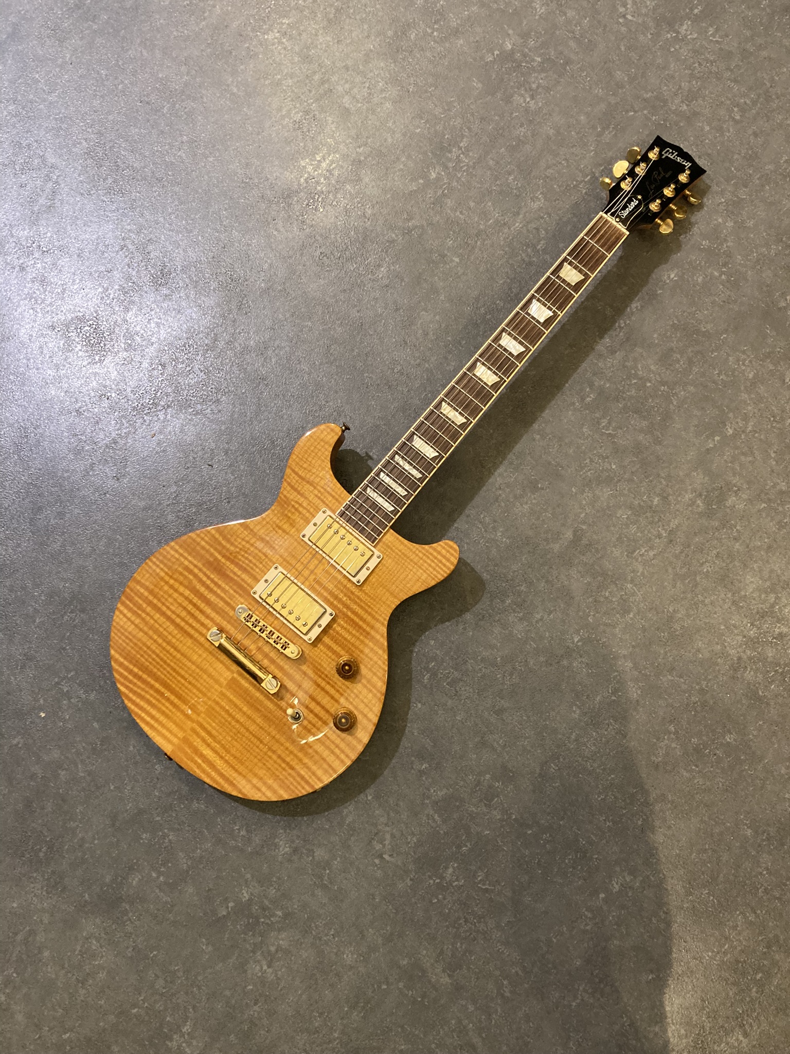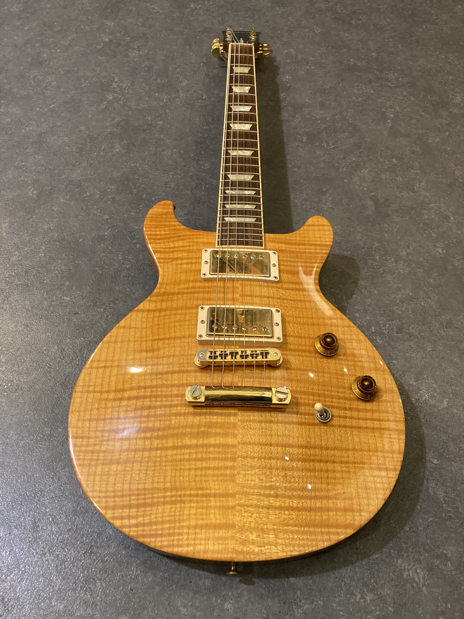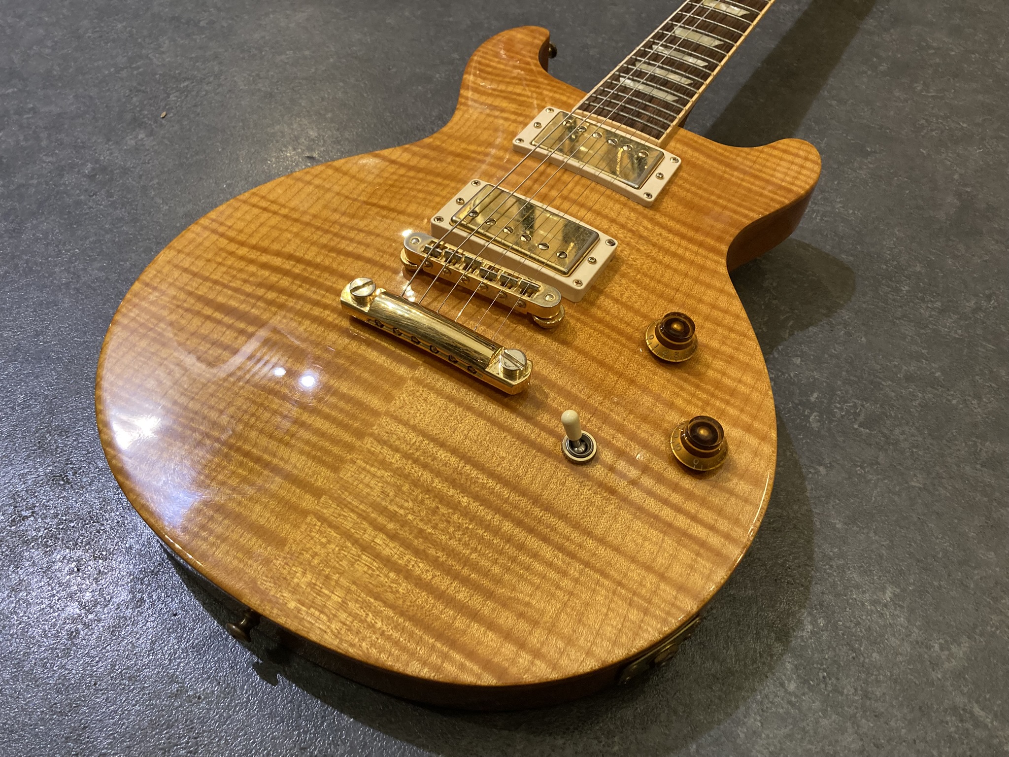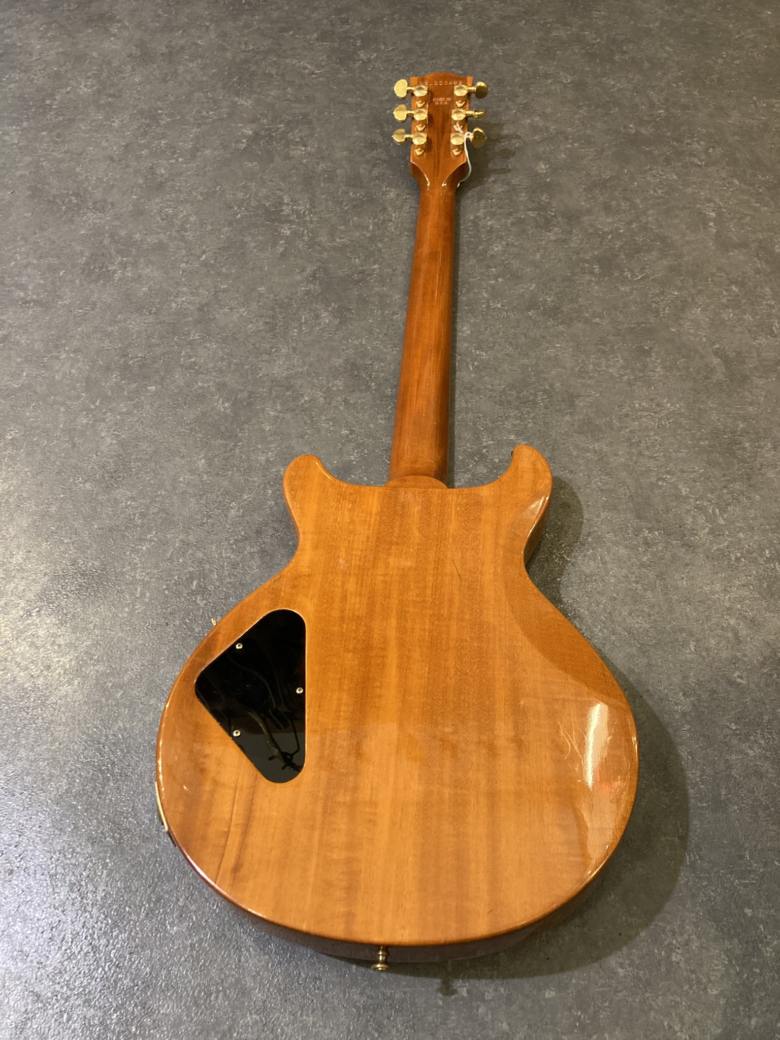 - Bon état (la finition Gold de l'accastillage est un peu passée par endroits, visible sur les photos)- Corps : acajou (mahogany) avec table sculptée en érable (maple top)