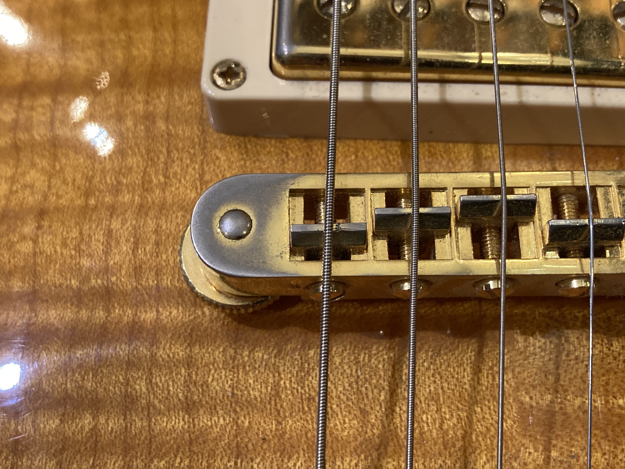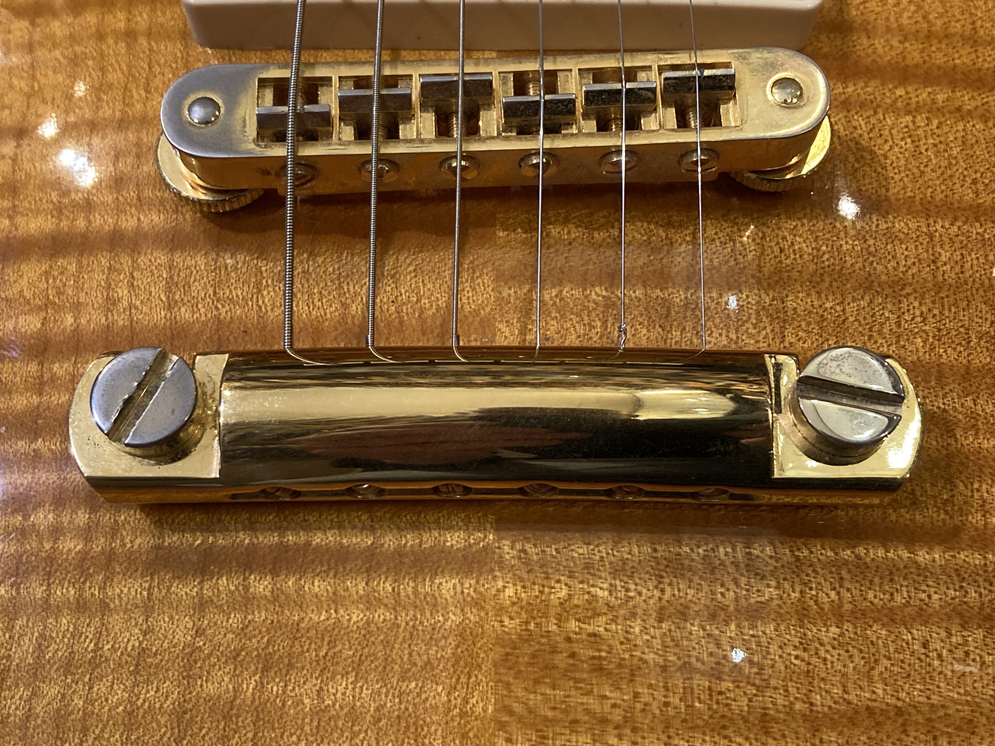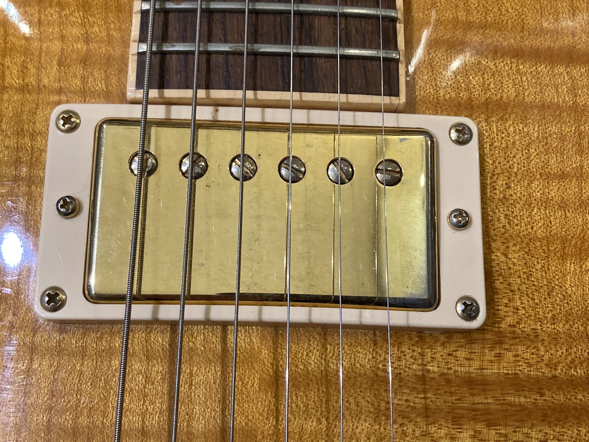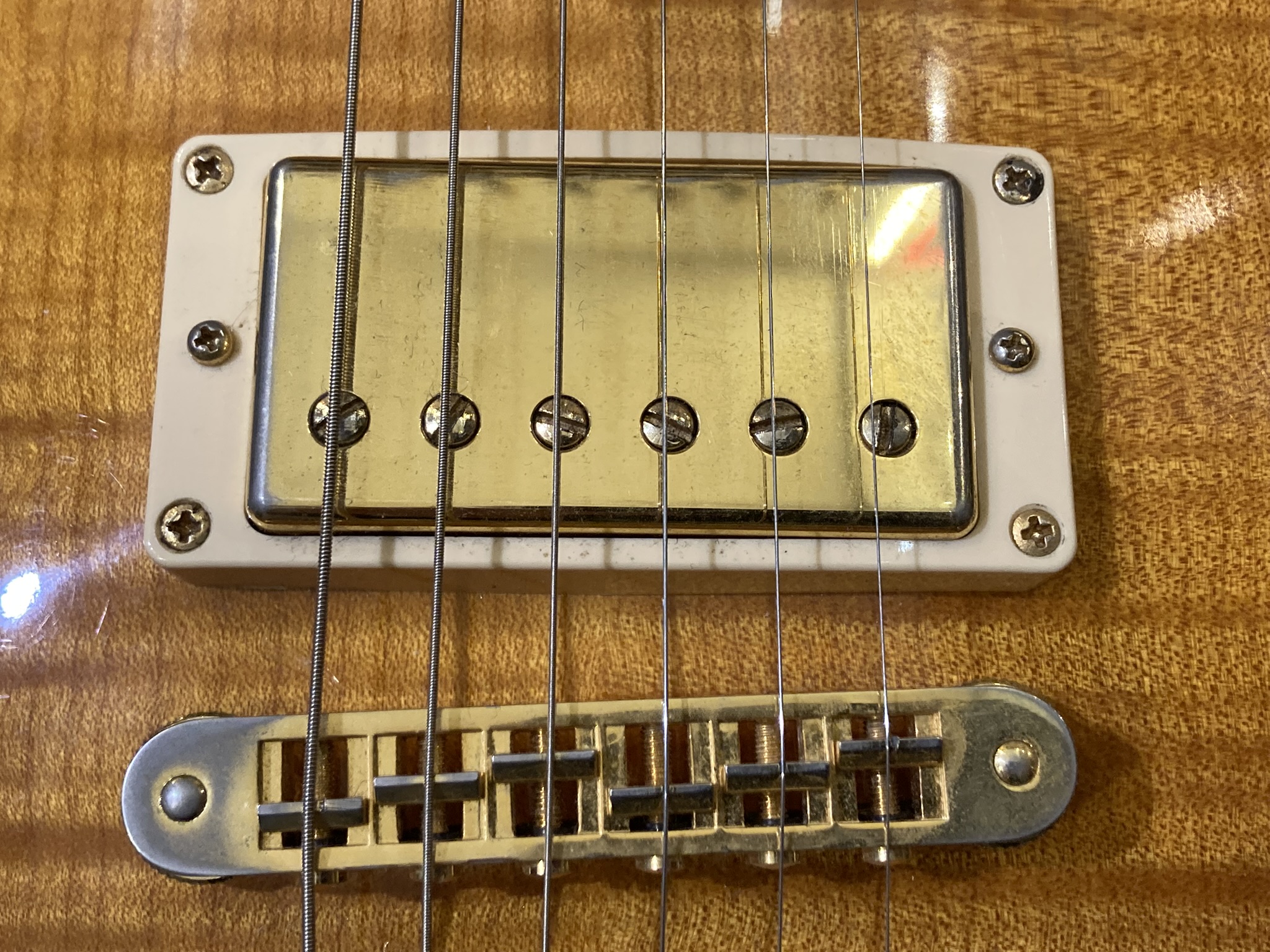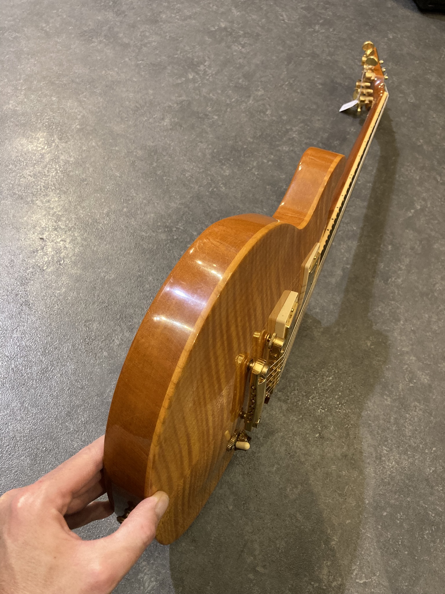 - Bon état (la finition Gold de l'accastillage est un peu passée par endroits, visible sur les photos)- Corps : acajou (mahogany) avec table sculptée en érable (maple top)