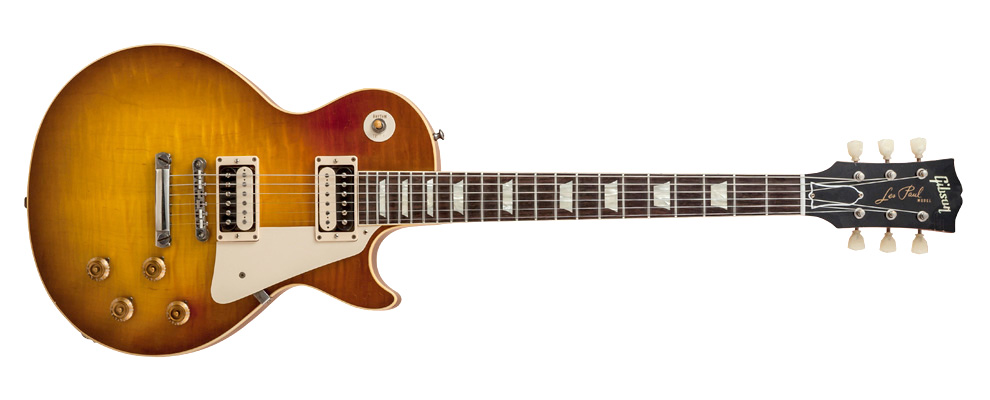 La guitare reproduite ici par le Custom Shop de Gibson possède un corps en une pièce d’acajou avec une table en érable figuré, un manche collé en acajou et érable avec profil 1959, une touche en palissandre avec radius de 12” et des incrustations en trapèze, une paire de micros Custom Bucker Alnico II au manche et Alnico III au chevalet, un chevalet ABR-1 plaqué nickel et un cordier Stop Bar en aluminium et des mécaniques Kluson Deluxe Nickel Reissue Green Keys avec un ratio de 12:1. La finition est de type nitro-cellulosique avec teinte Aged Dirty Lemon et le binding de la touche et du manche est crème vintage, tout comme la plaque de protection.