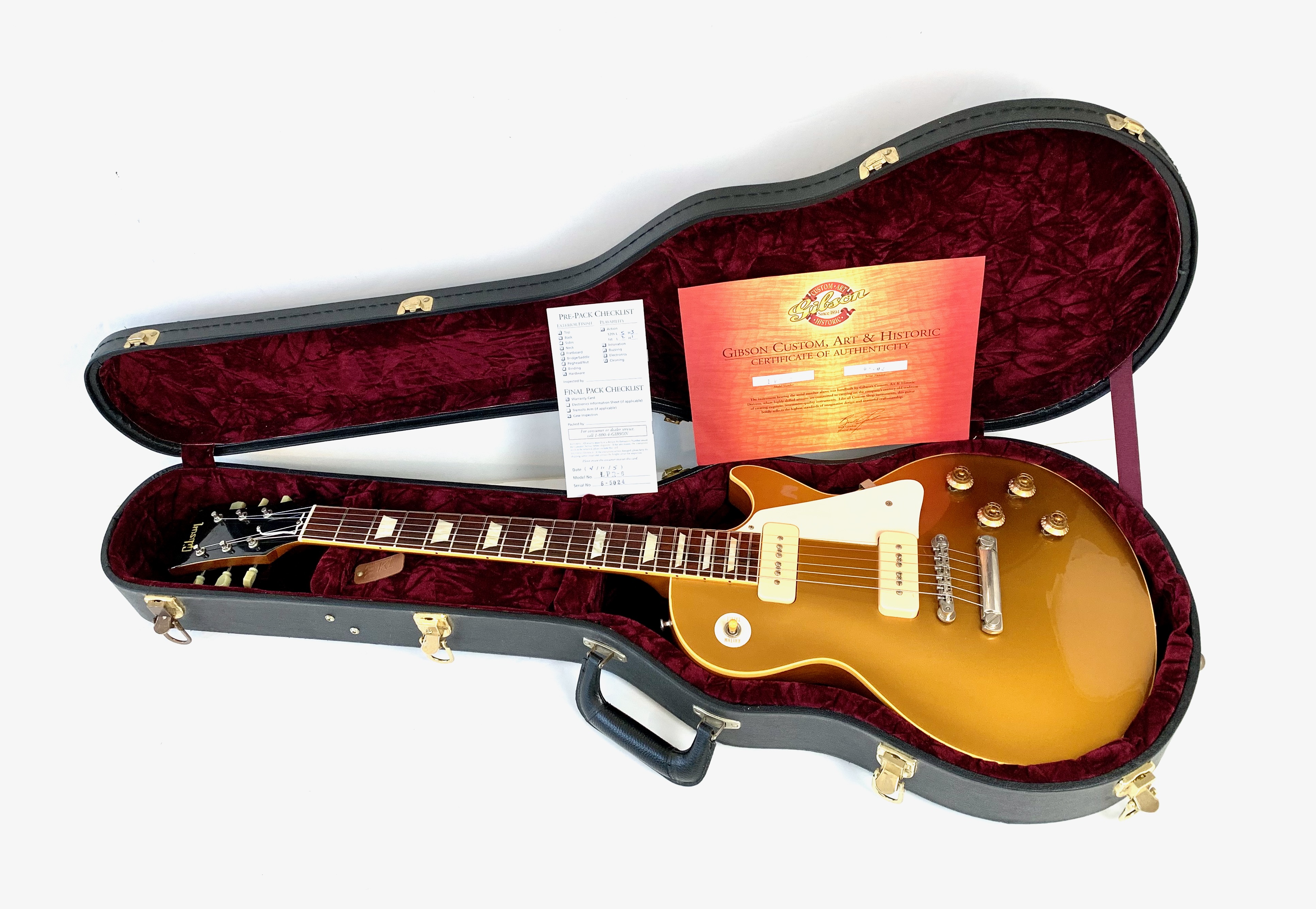Apparue en 1952, la Les Paul n’a pas cessé d’évoluer au cours de la décennie. En 1956 la version « ultime », avant la création des humbuckers PAF, fait son entrée, elle se dote non plus d’un wraparound mais d’un Tune-O-Matic et toujours bien sûr, d’une paire de P-90. La construction est pour sa part classique : corps et manche épais en acajou, table en érable, touche en palissandre au radius de 12 pouces. Ce modèle Custom Shop est en très bon état, vendue avec son certificat d’authenticité, dans son étui Lifton d’origine.Location, achat, vente, reprise, dépôt-vente.