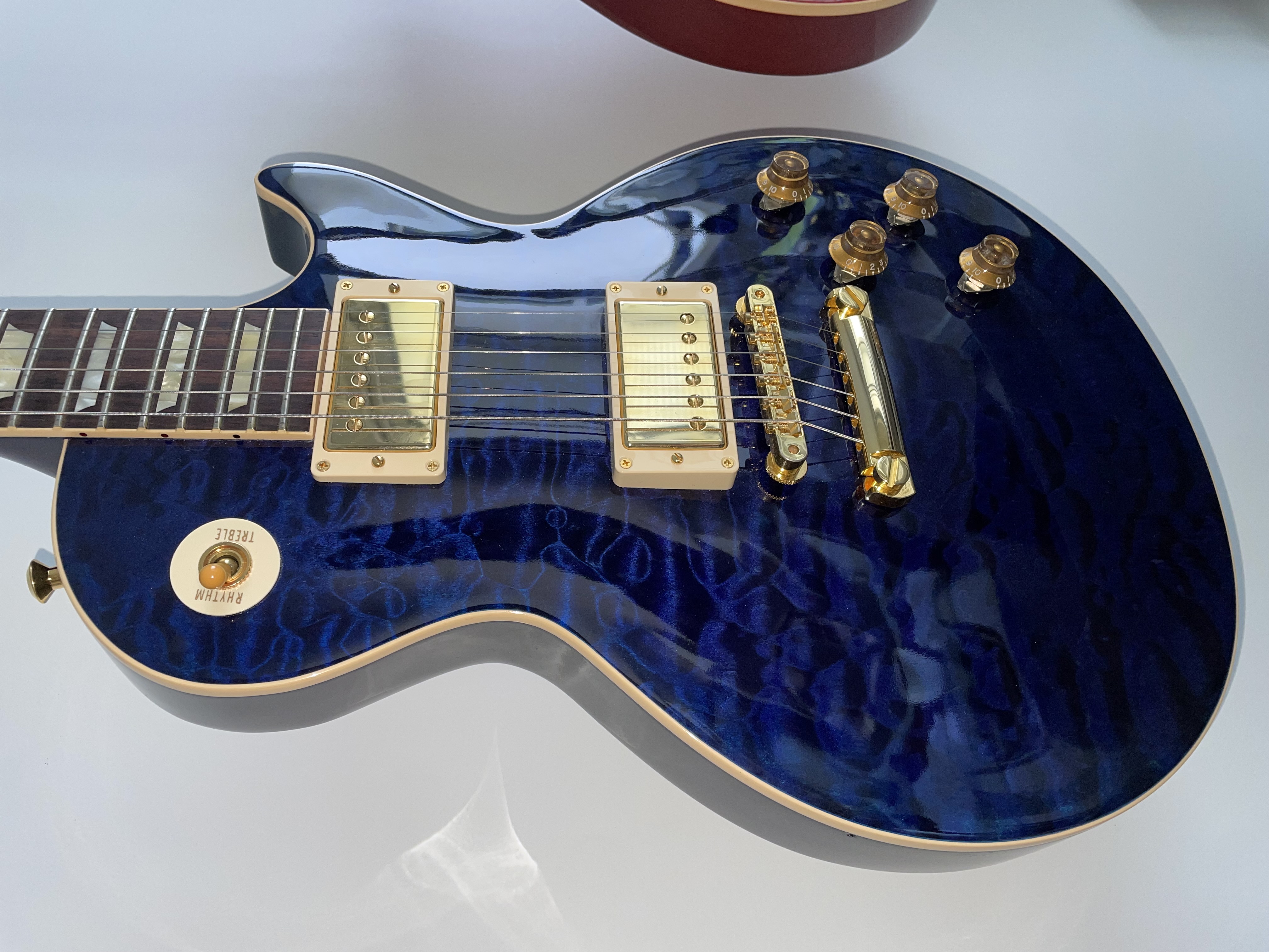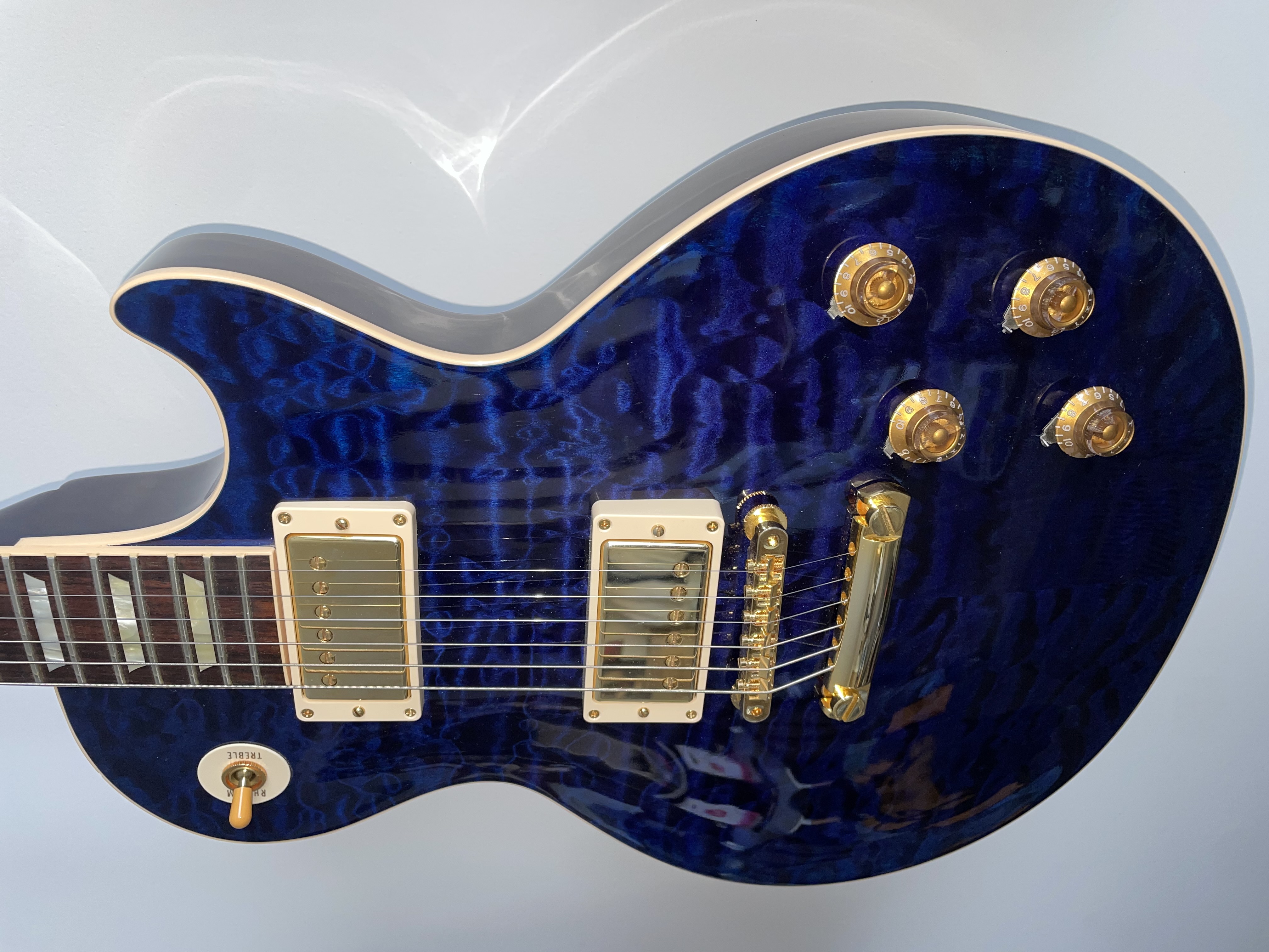 Bonjour,Je tâte le terrain pour un éventuel échange de cette Gibson Les Paul R9 quilt top transluscent blue de 2012 en quasi parfait état.
