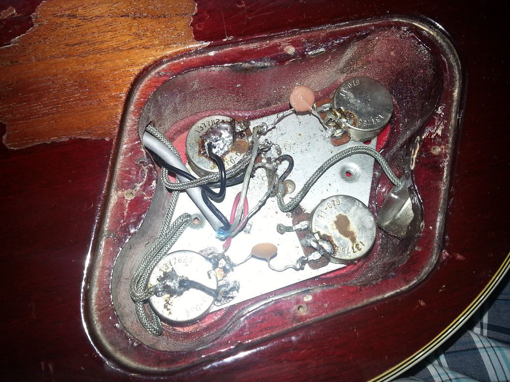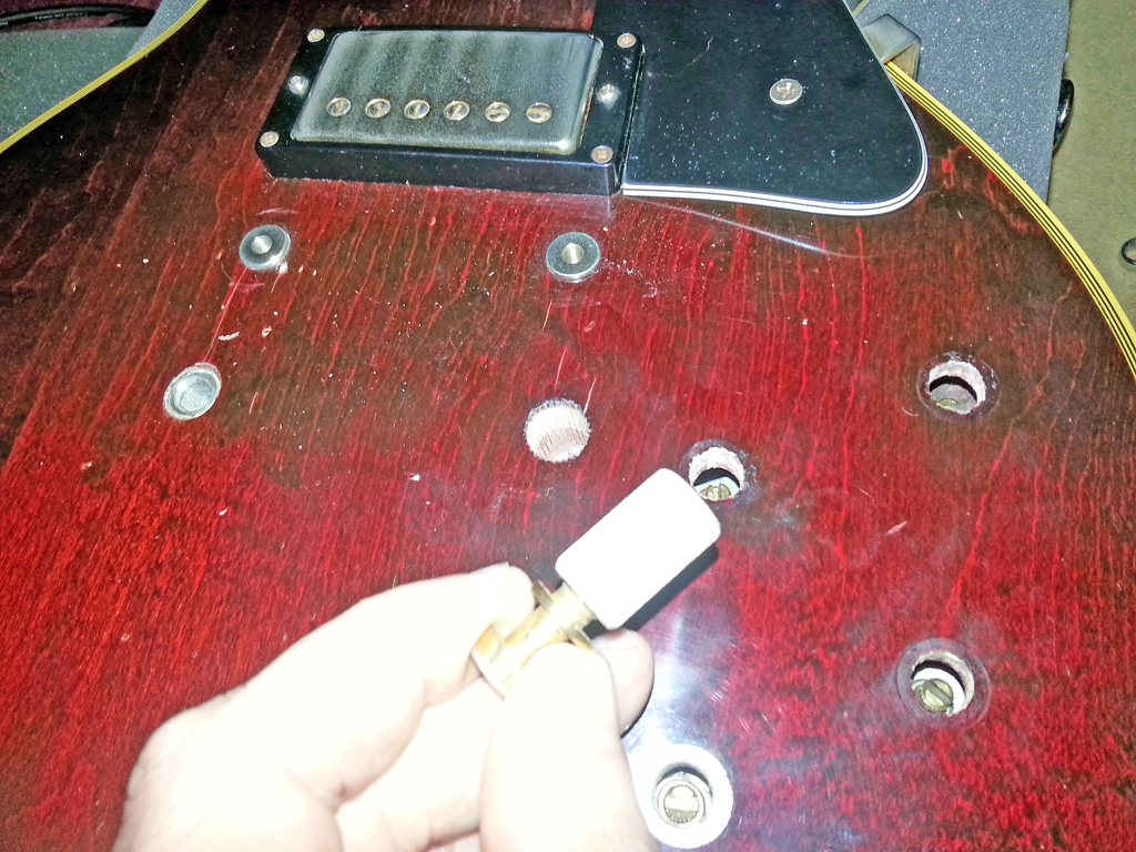 Conclusion, d'origine, le conduit n'est pas percé sur ma Les Paul. Je réfléchis ... (pas longtemps) et me dis que je vais le faire moi ce raccordement à la masse ! Pour ça, il faut réfléchir afin de ne pas commettre l'irréparable ! Je vais donc relier le trou du cordier avec l'emplacement de l'électronique (chemin le plus court) par un perçage de faible diamètre.