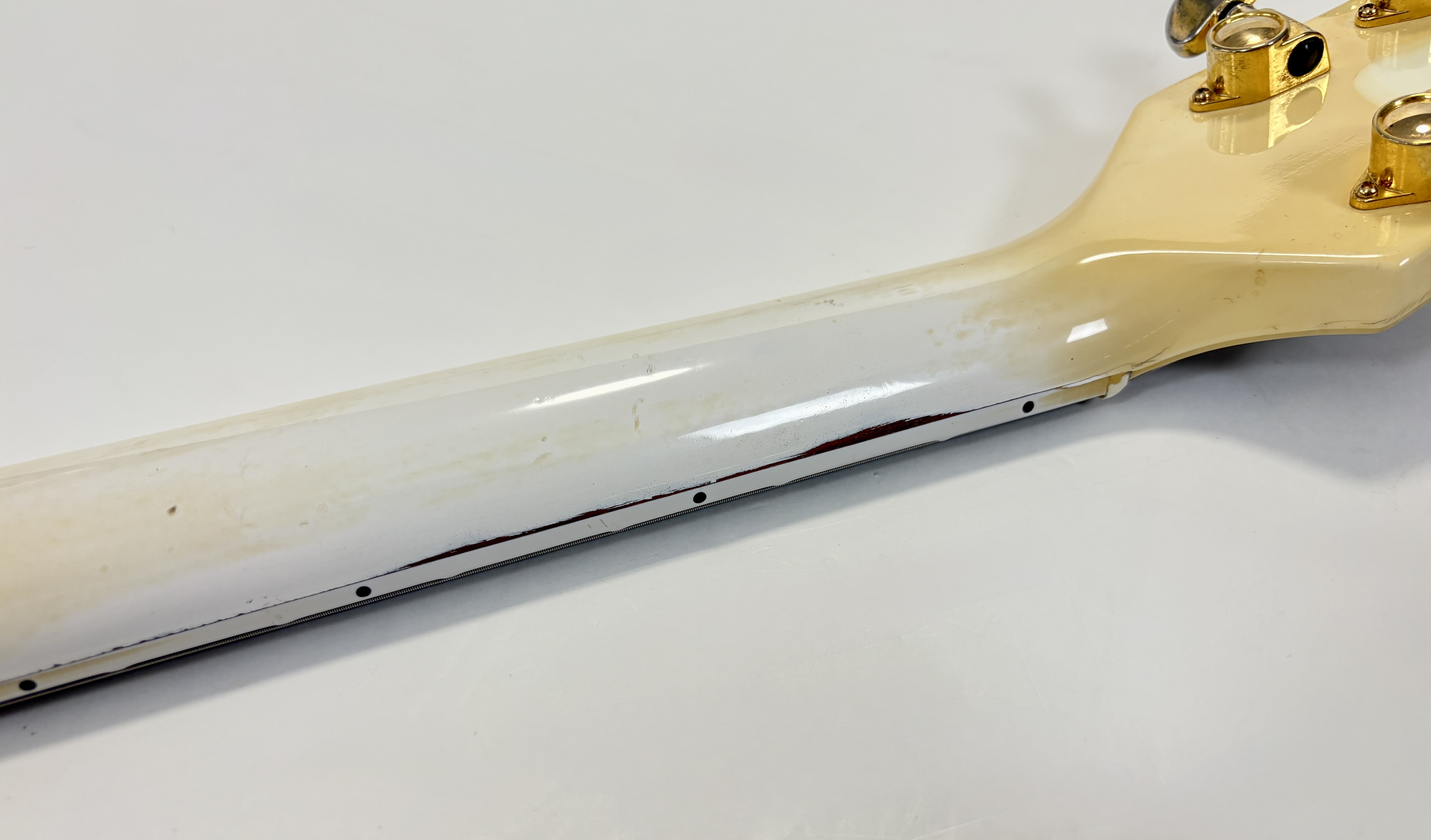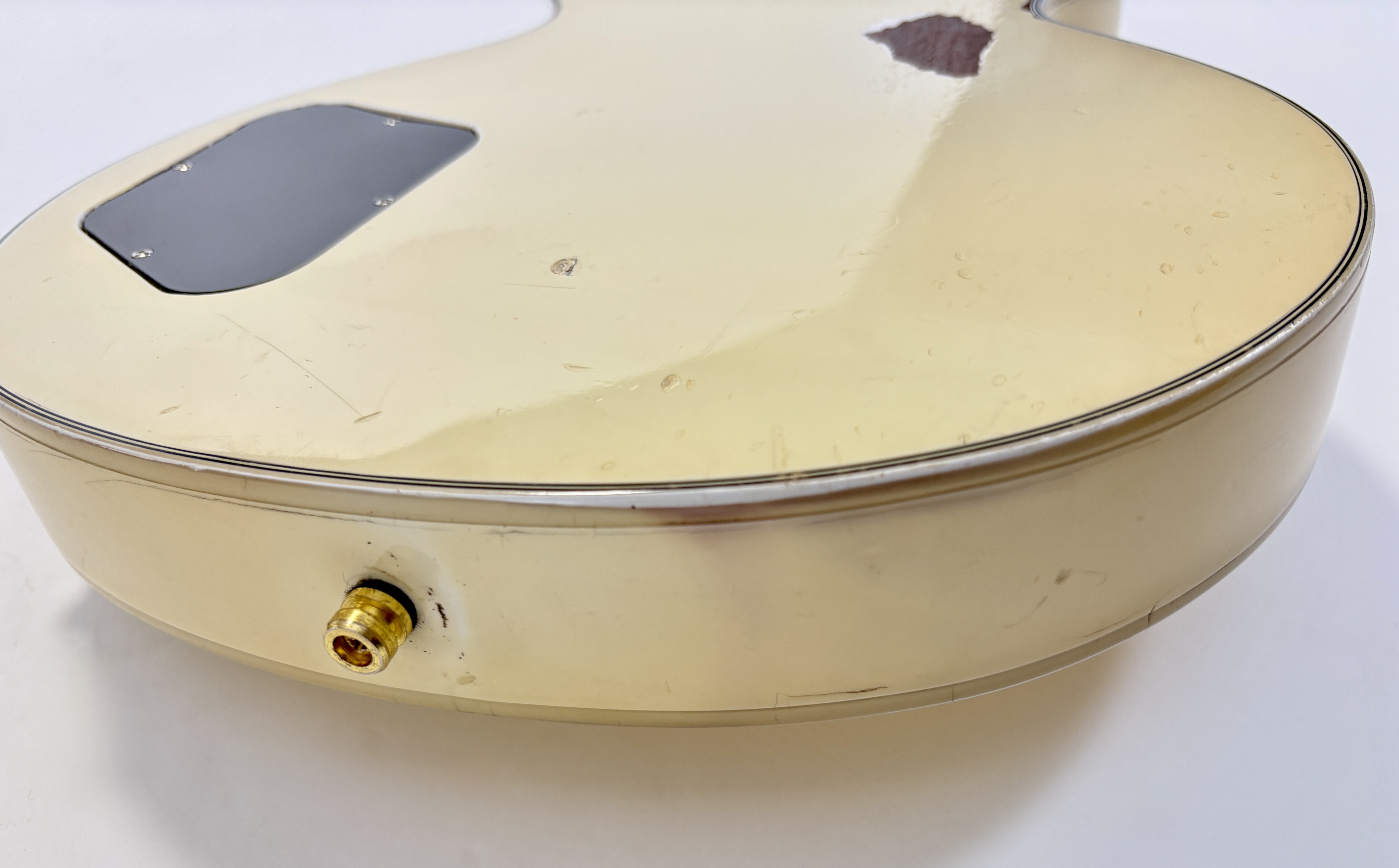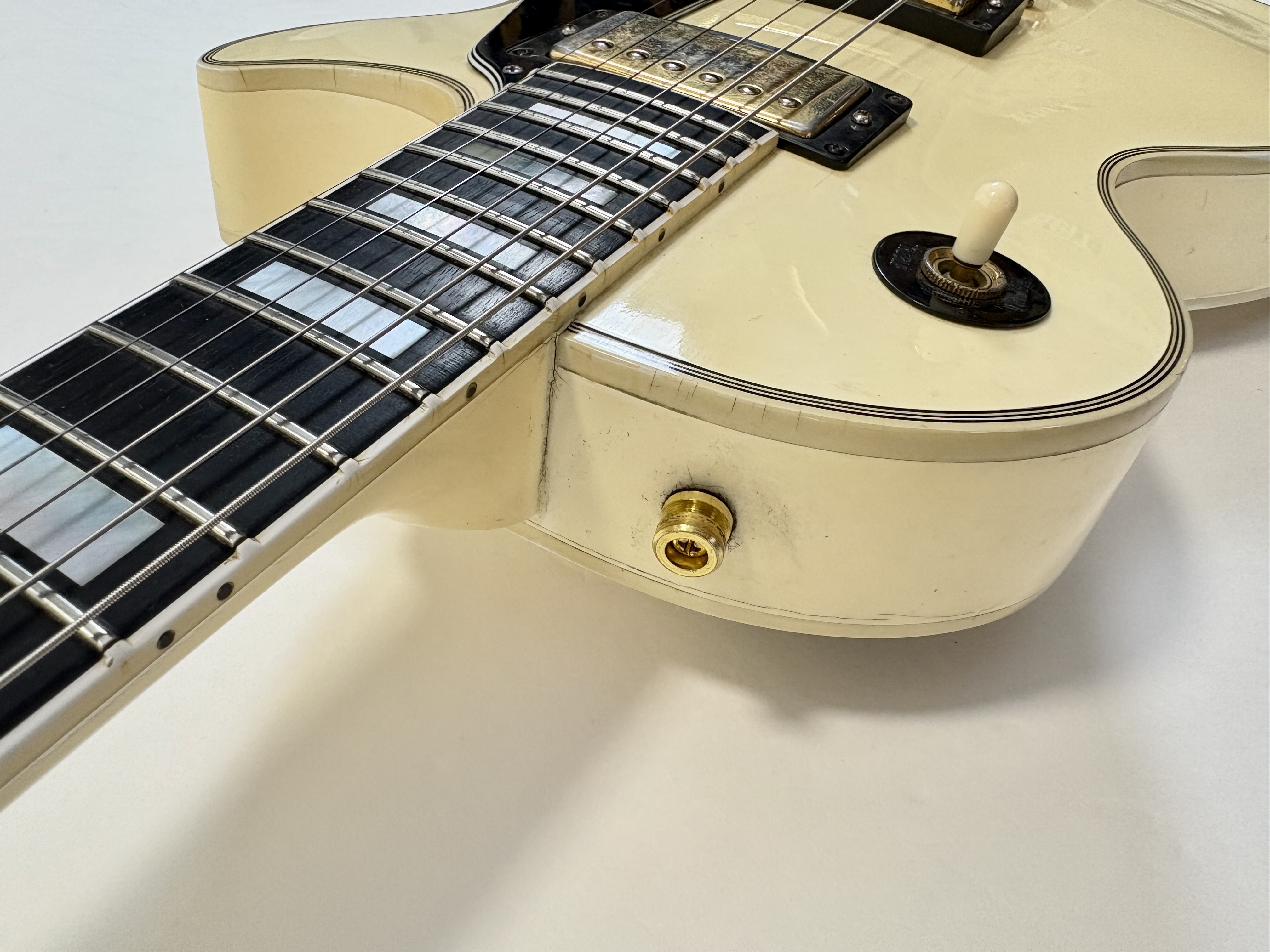 Apparue en 1954, la Custom Chapeaute la gamme : touche ébène, binding au dos, autour de la table, de la touche, logo split diamond, etc… elle en fait beaucoup plus qu’une Standard ! La voici dans une livrée fort désirable, rappelant la Randy Rhoads, avec une belle patine : Alpine white ! Celle-ci se dote du duo classique de l’époque : un doux 490R en position manche et un puissant 498T côté chevalet. Elle date d’une période appréciée des amateurs des la marque : les 90’s et ici plus précisément de 1993. Vendue dans son étui marron à moumoute rose typique de la décennie (dont les charnières sont cassées).