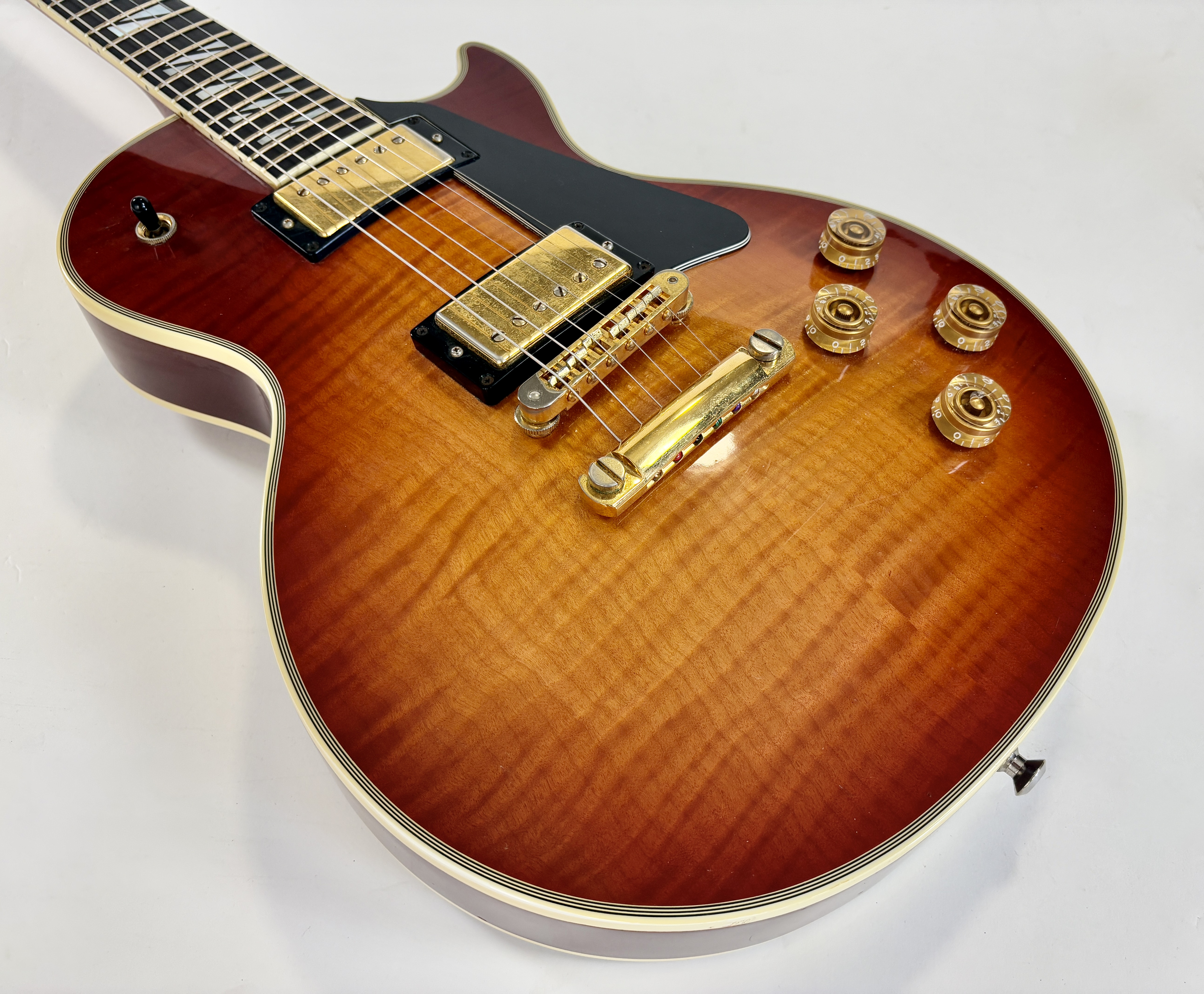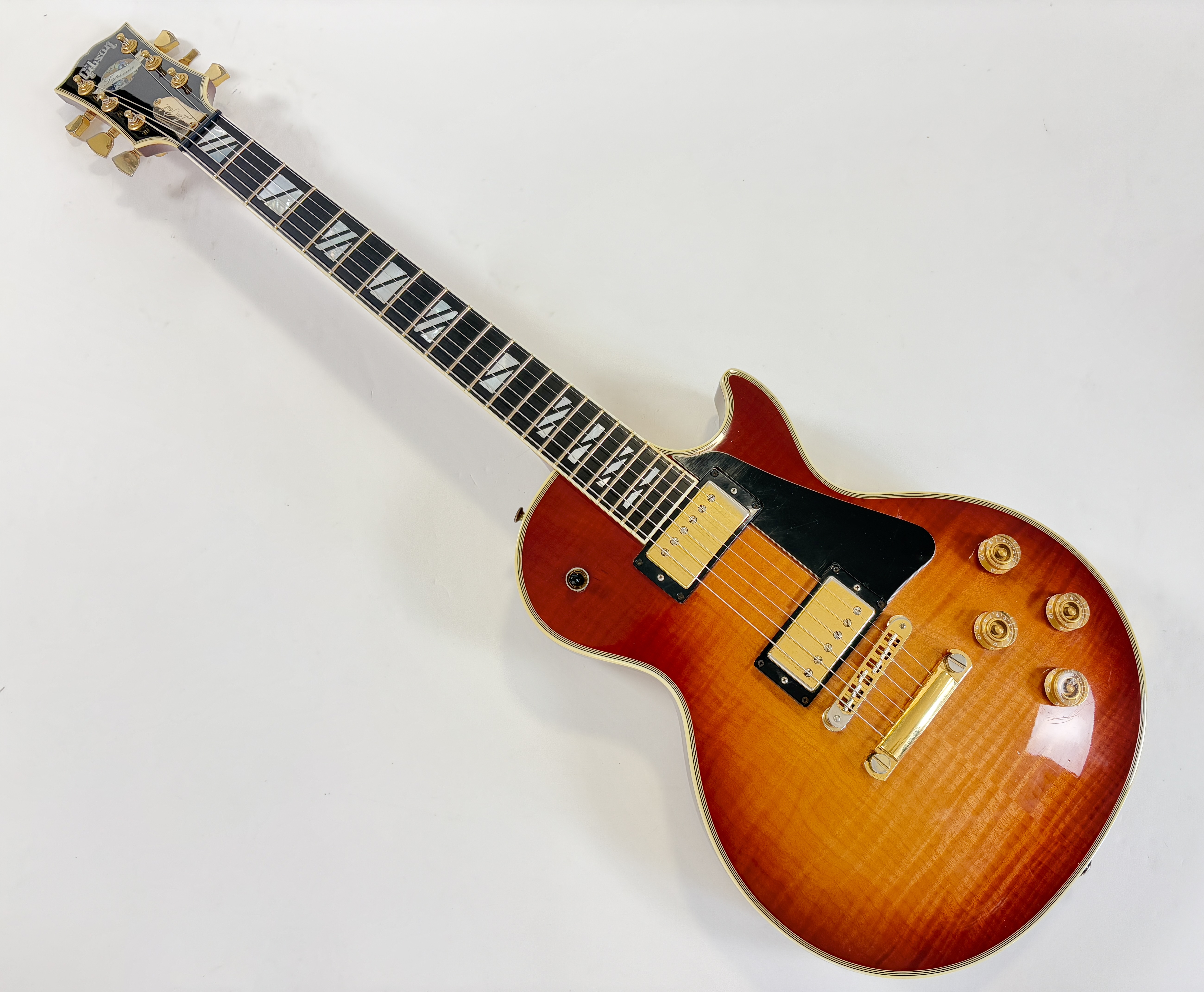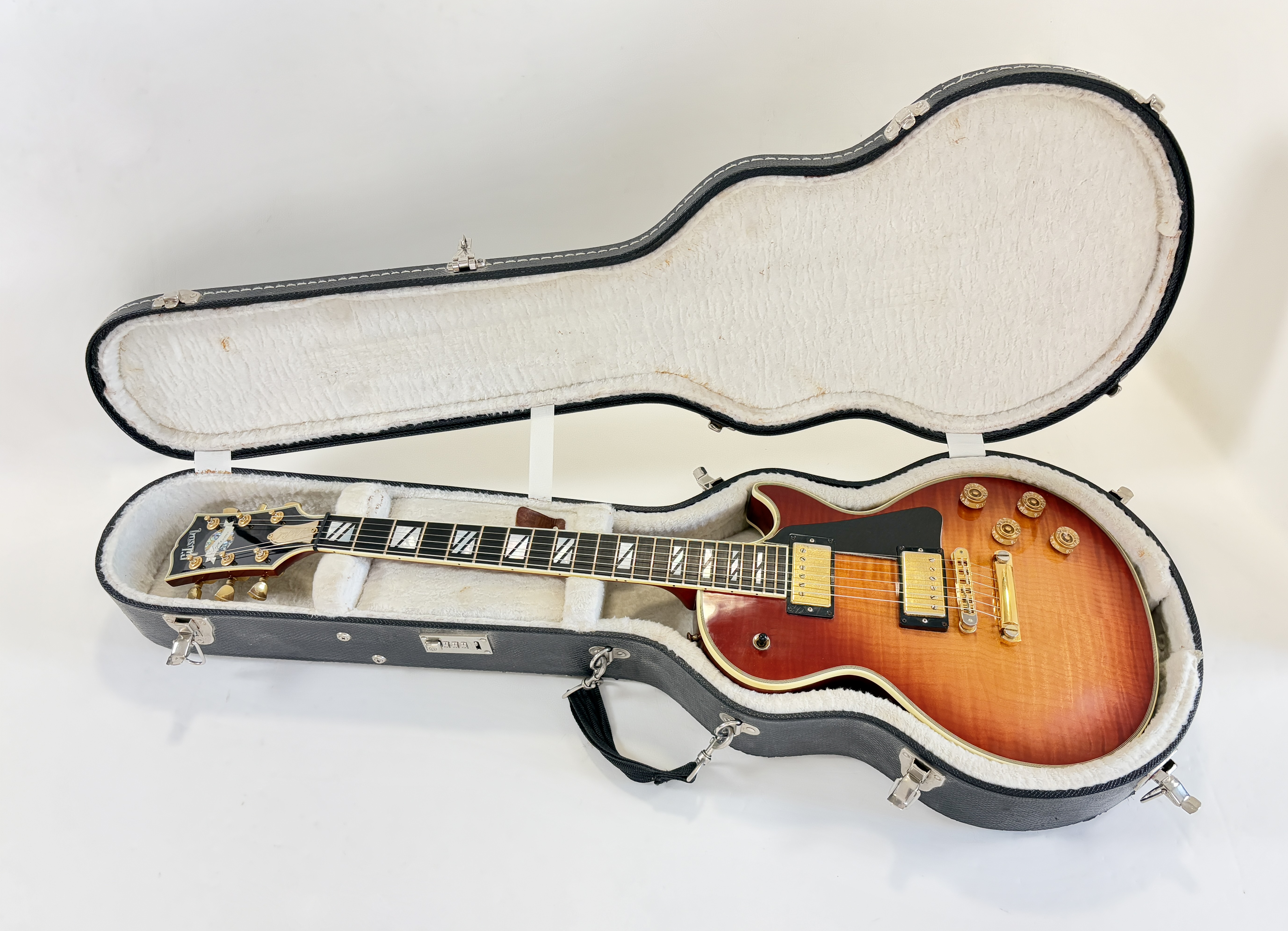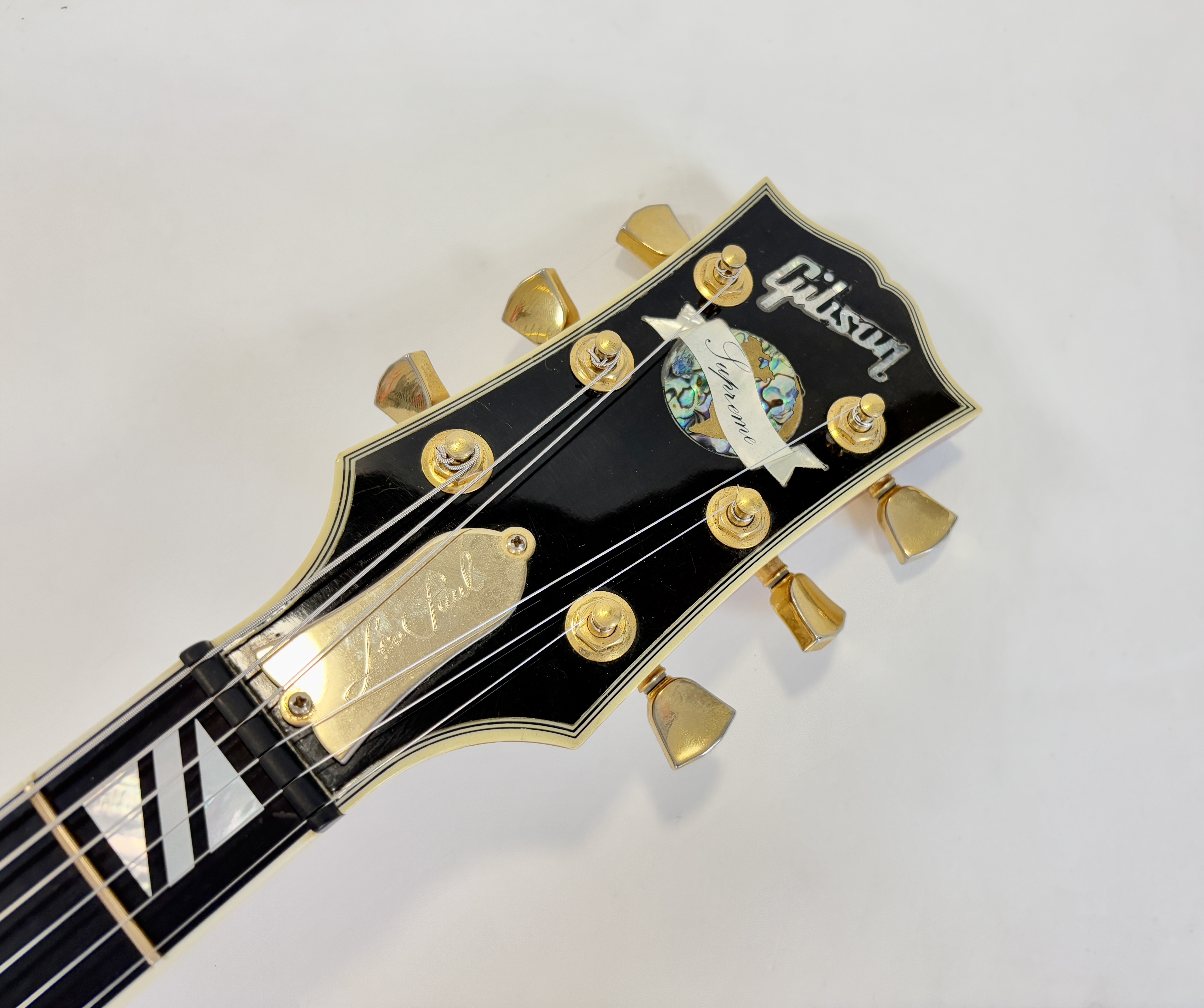 La Supreme s’éloigne des standards de la Les Paul et offre des caractéristiques inédites. Dotée d’un corps chambered en acajou, elle dispose d’une table bombée en érable AAAA ainsi qu’un dos construit de la même façon. Ainsi la Supreme est un peu plus épaisse qu’une Les Paul traditionnelle. A la manière d'une Custom elle s'offre de beaux bindings, on trouve aussi des inlays travaillés sur la touche ou encore une incrustation inédite sur le placage de tête. Côté micro on trouve le duo 490R et 498T, doux en manche et puissant en chevalet. La touche au radius compensé de 10 à 16 pouces est faite d’ébène. Un pickguard a été ajouté sur cet exemplaire afin de masquer l'usure du temps sur son vernis. Vendue dans son étui d'origine.Dépôt-vente, achat, vente, reprise, location.