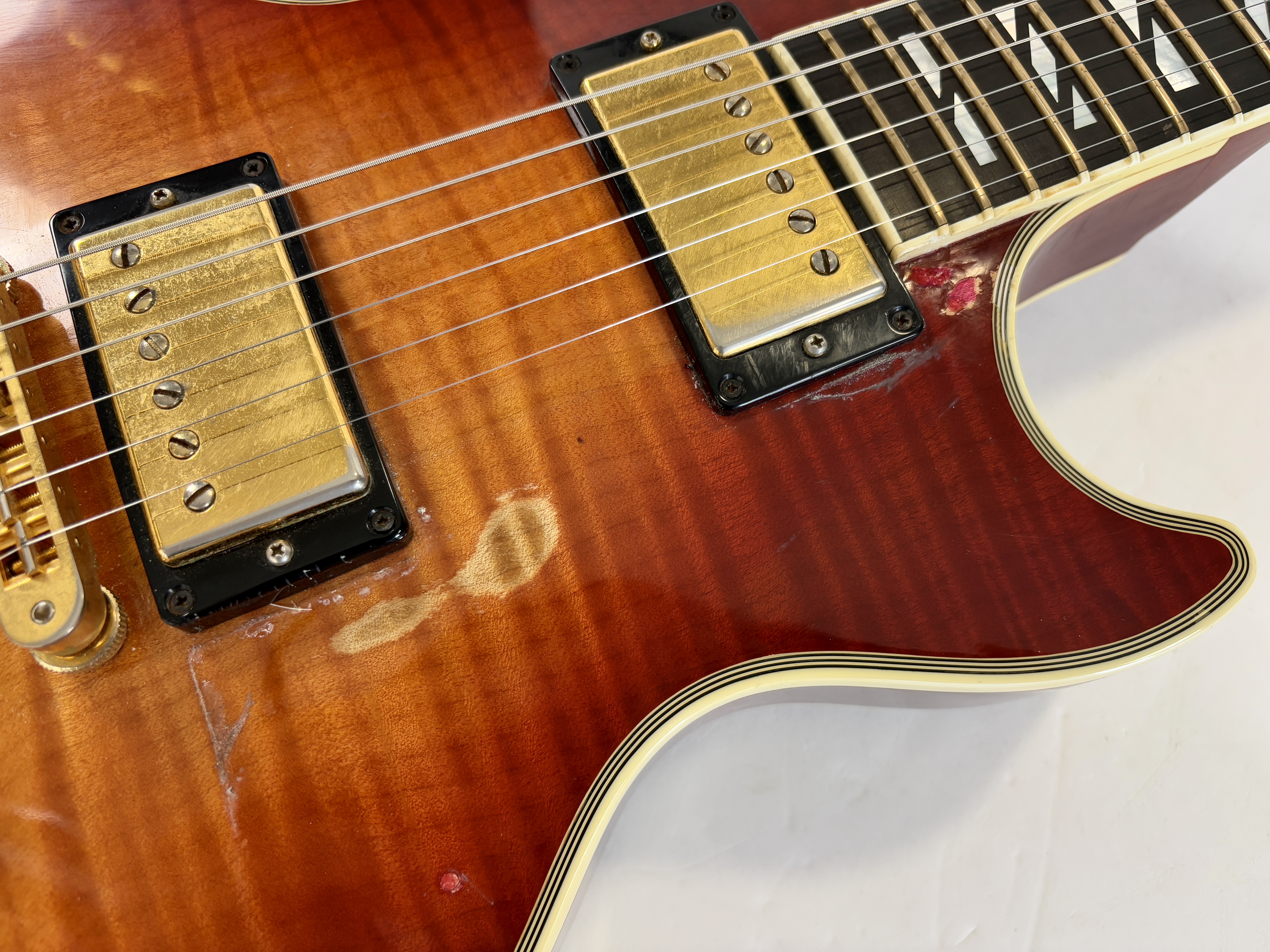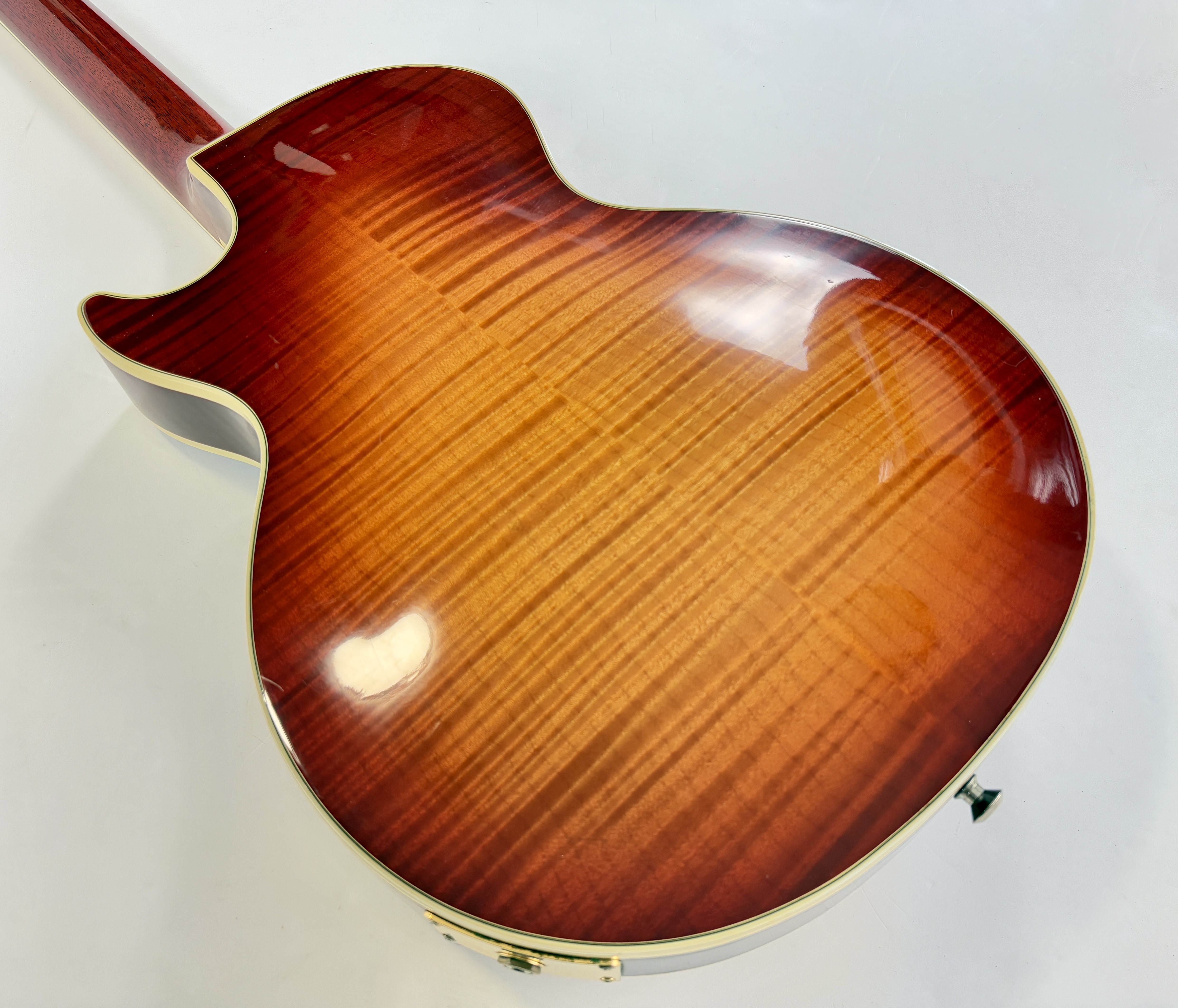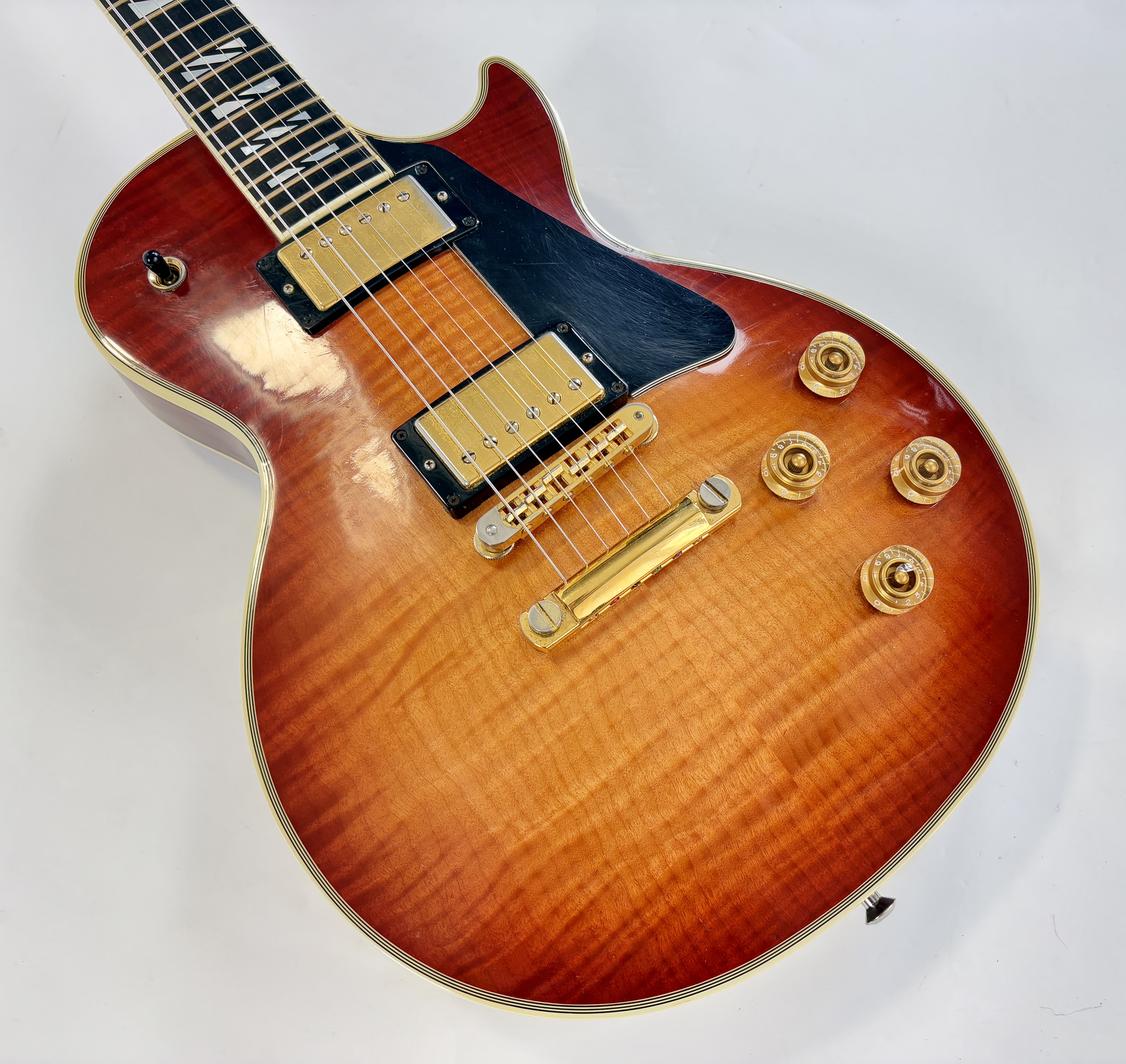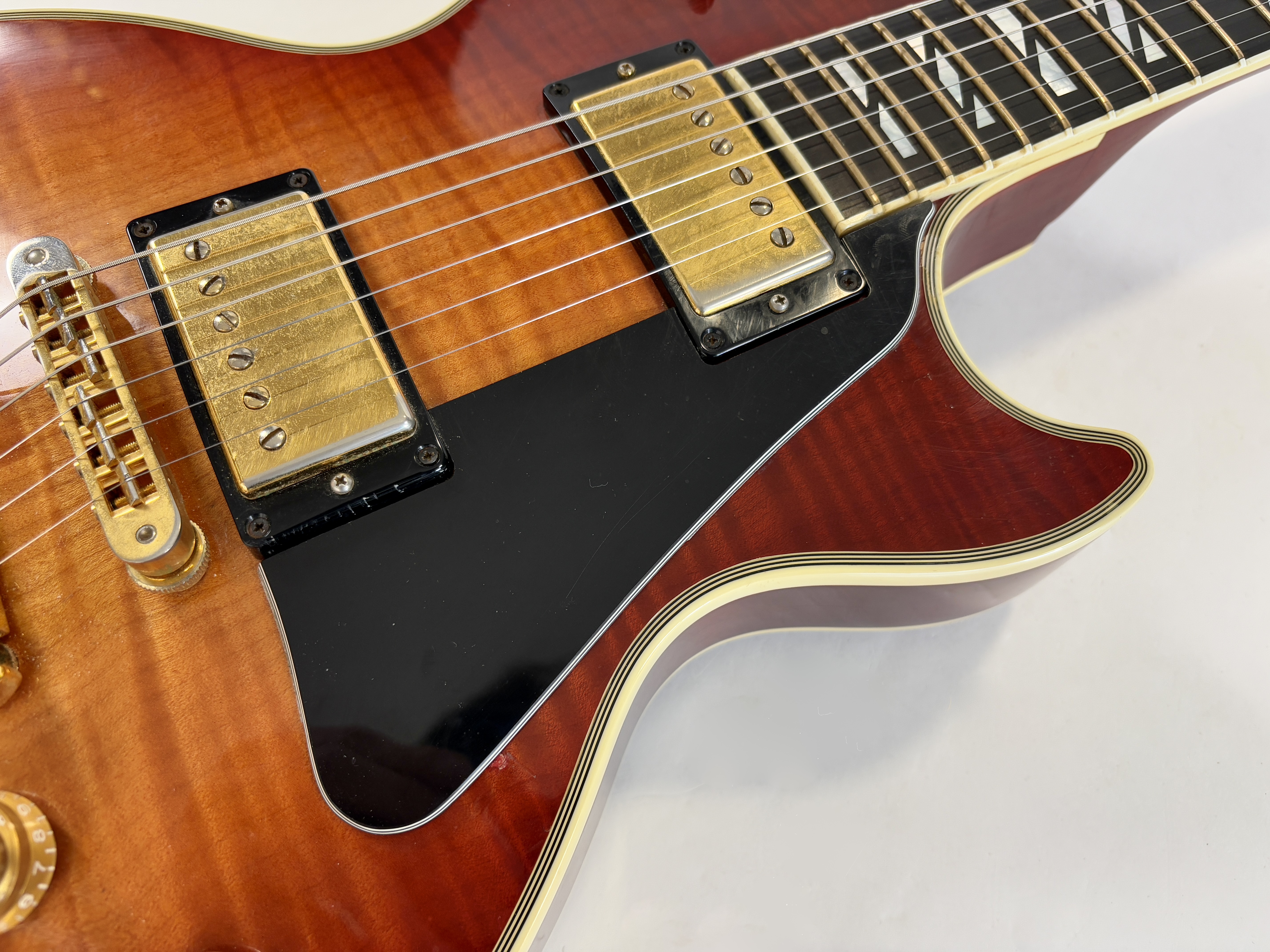 La Supreme s’éloigne des standards de la Les Paul et offre des caractéristiques inédites. Dotée d’un corps chambered en acajou, elle dispose d’une table bombée en érable AAAA ainsi qu’un dos construit de la même façon. Ainsi la Supreme est un peu plus épaisse qu’une Les Paul traditionnelle. A la manière d'une Custom elle s'offre de beaux bindings, on trouve aussi des inlays travaillés sur la touche ou encore une incrustation inédite sur le placage de tête. Côté micro on trouve le duo 490R et 498T, doux en manche et puissant en chevalet. La touche au radius compensé de 10 à 16 pouces est faite d’ébène. Un pickguard a été ajouté sur cet exemplaire afin de masquer l'usure du temps sur son vernis. Vendue dans son étui d'origine.Dépôt-vente, achat, vente, reprise, location.