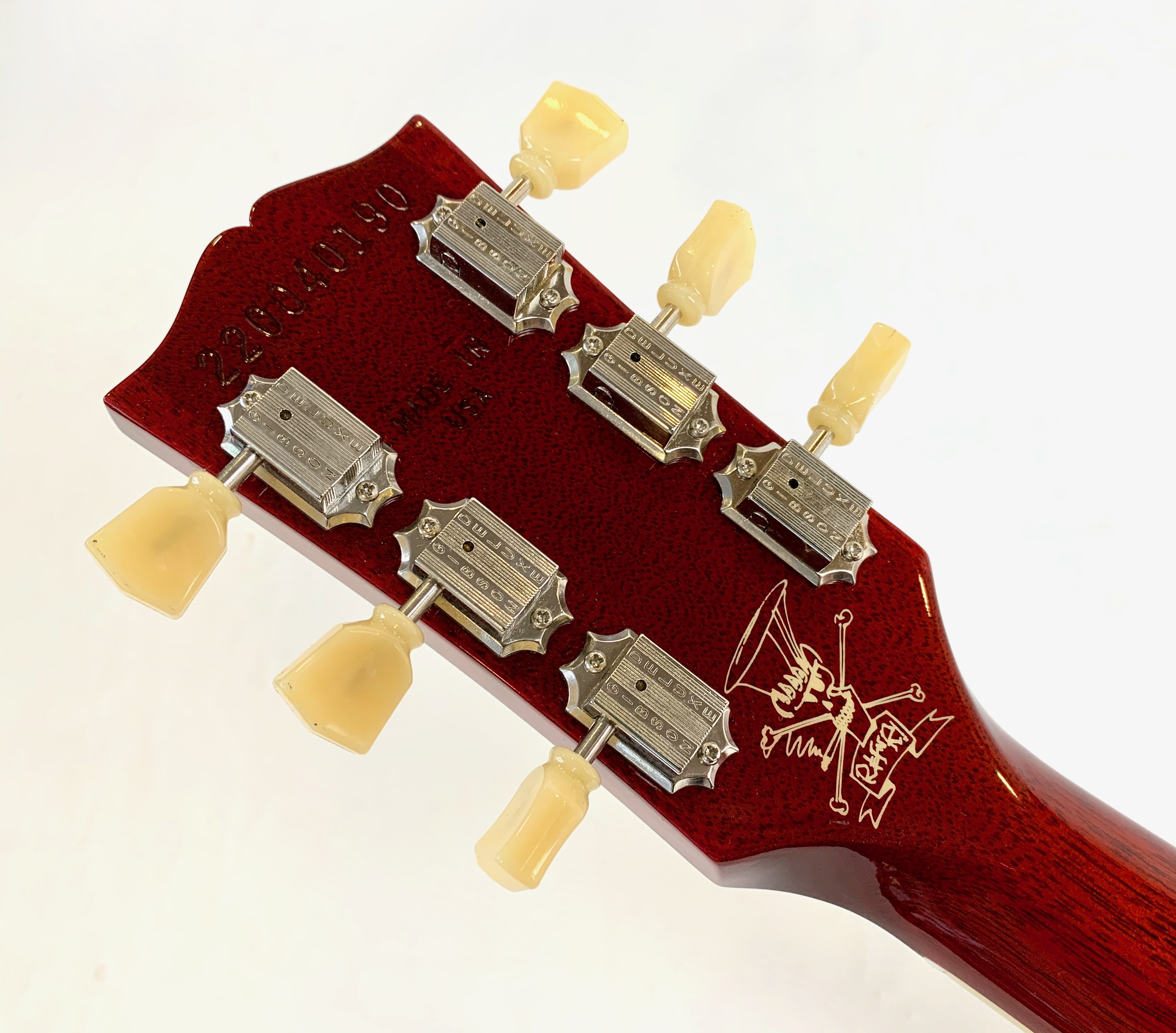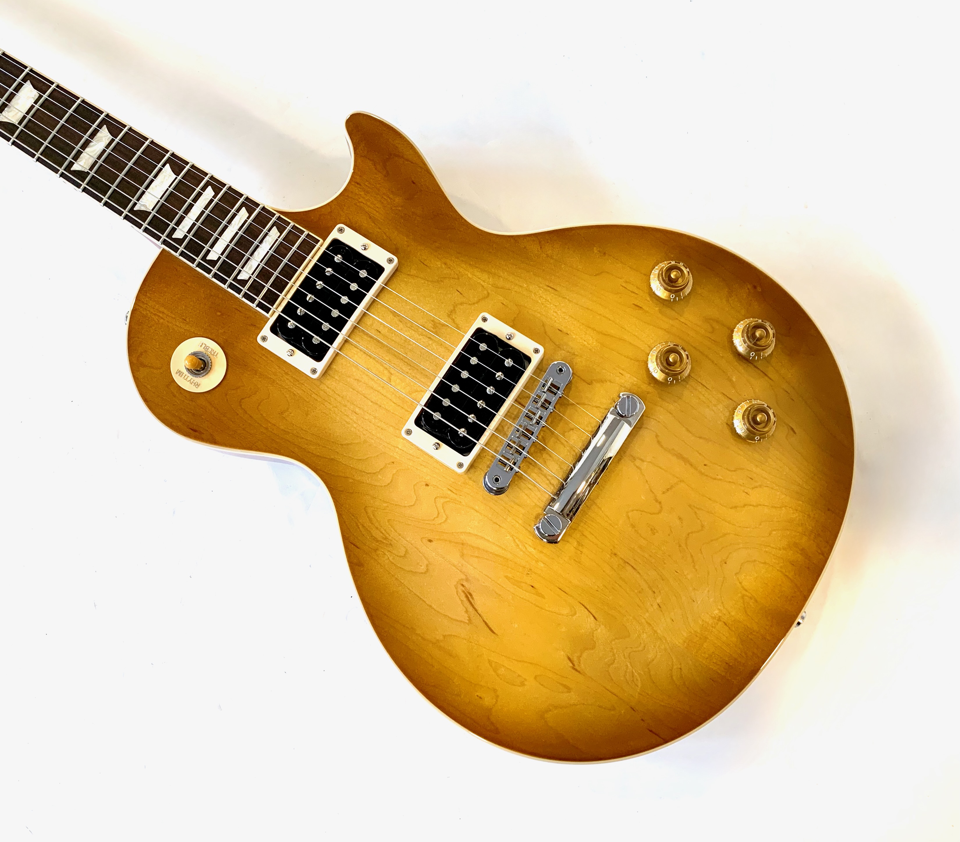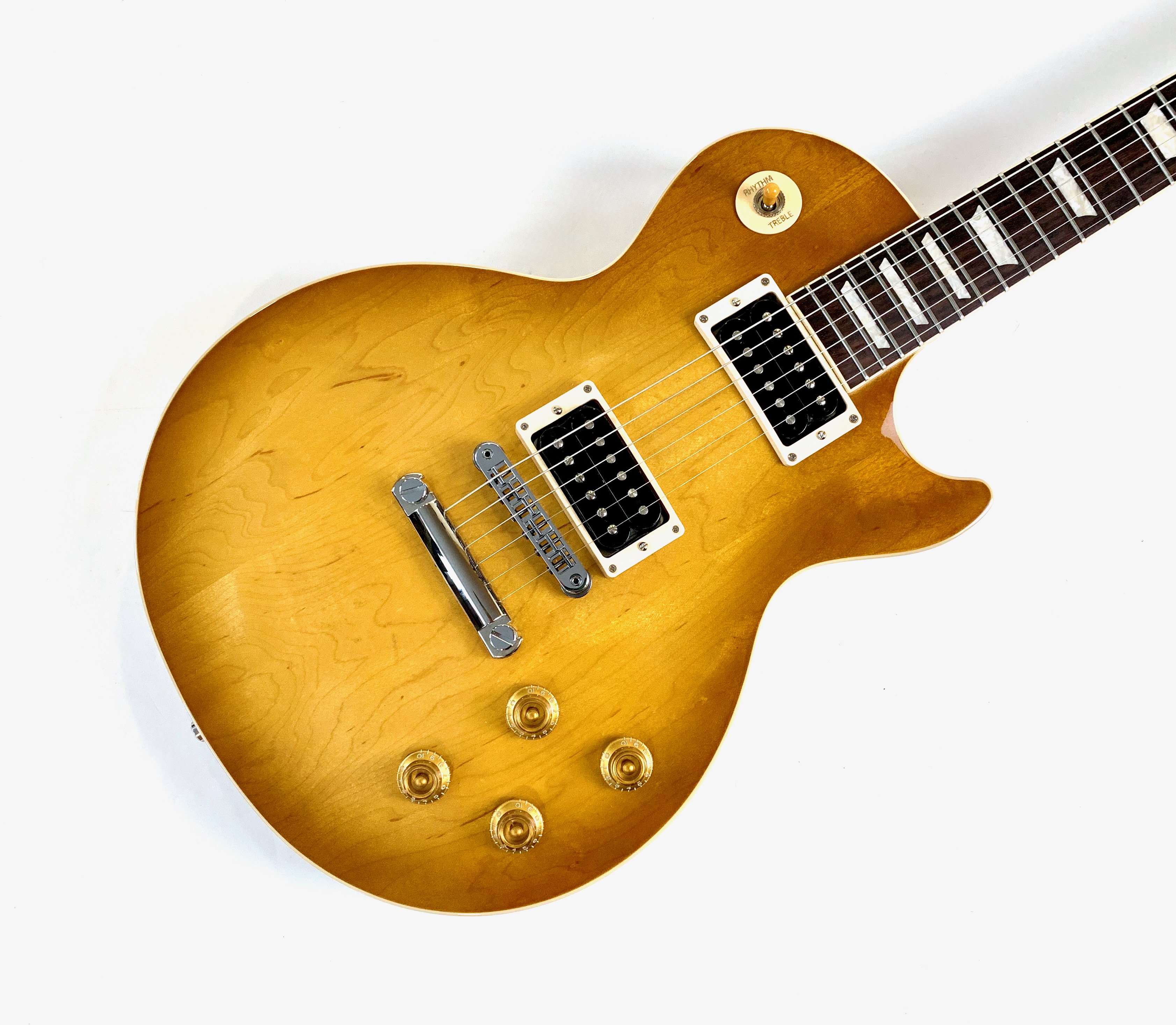 “Jessica” est la Les Paul envoyée par Gibson à Slash en 1988, reconnaissable à table Honeyburst en trois parties, elle suit encore de nos jours le guitariste à chapeau haut de forme ! Côté micros, elle s’équipe d’un set de Burstbucker à aimants alnico II. En très bon état, vendue dans son étui d’origine.Location, achat, vente, reprise, dépôt-vente.