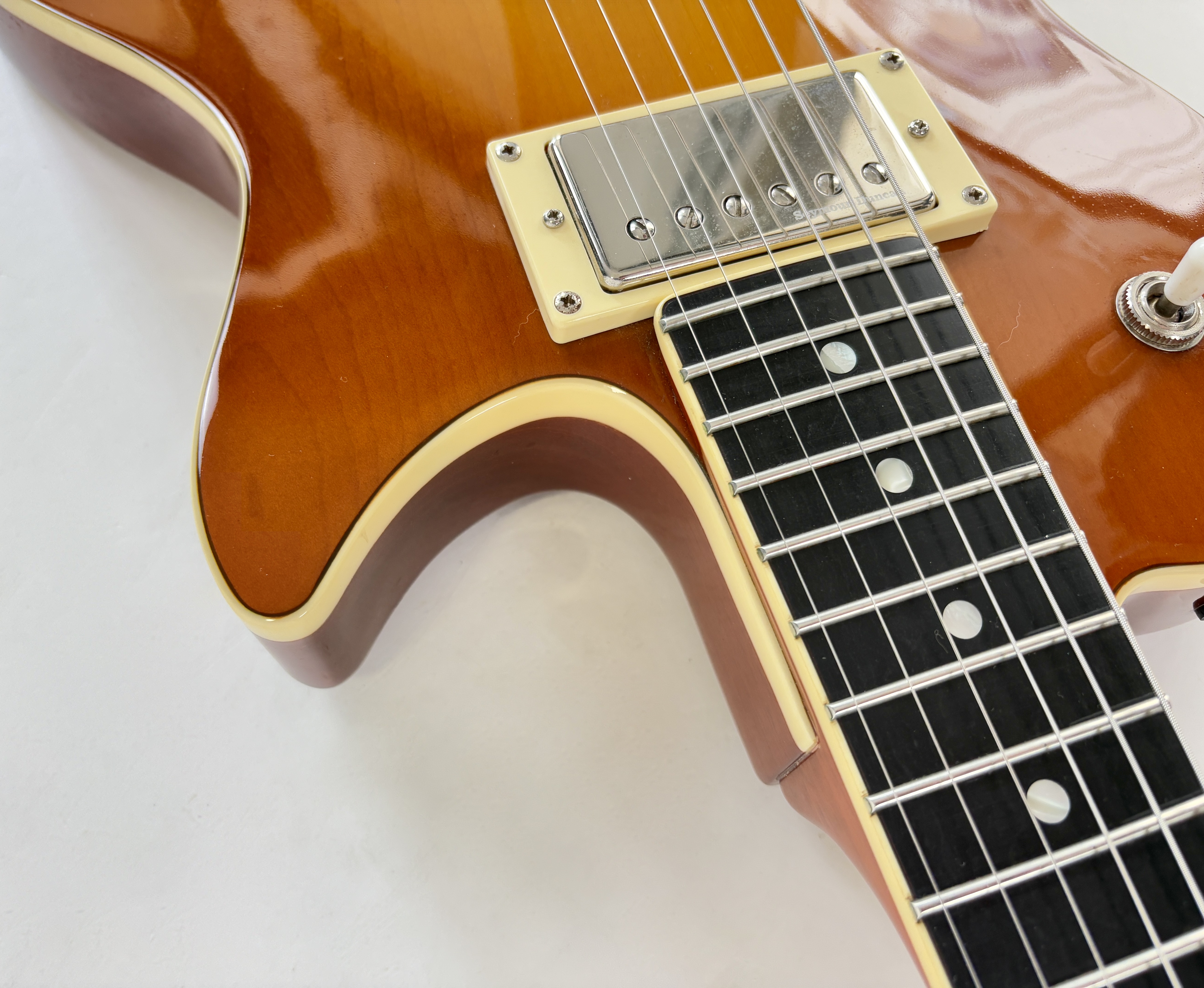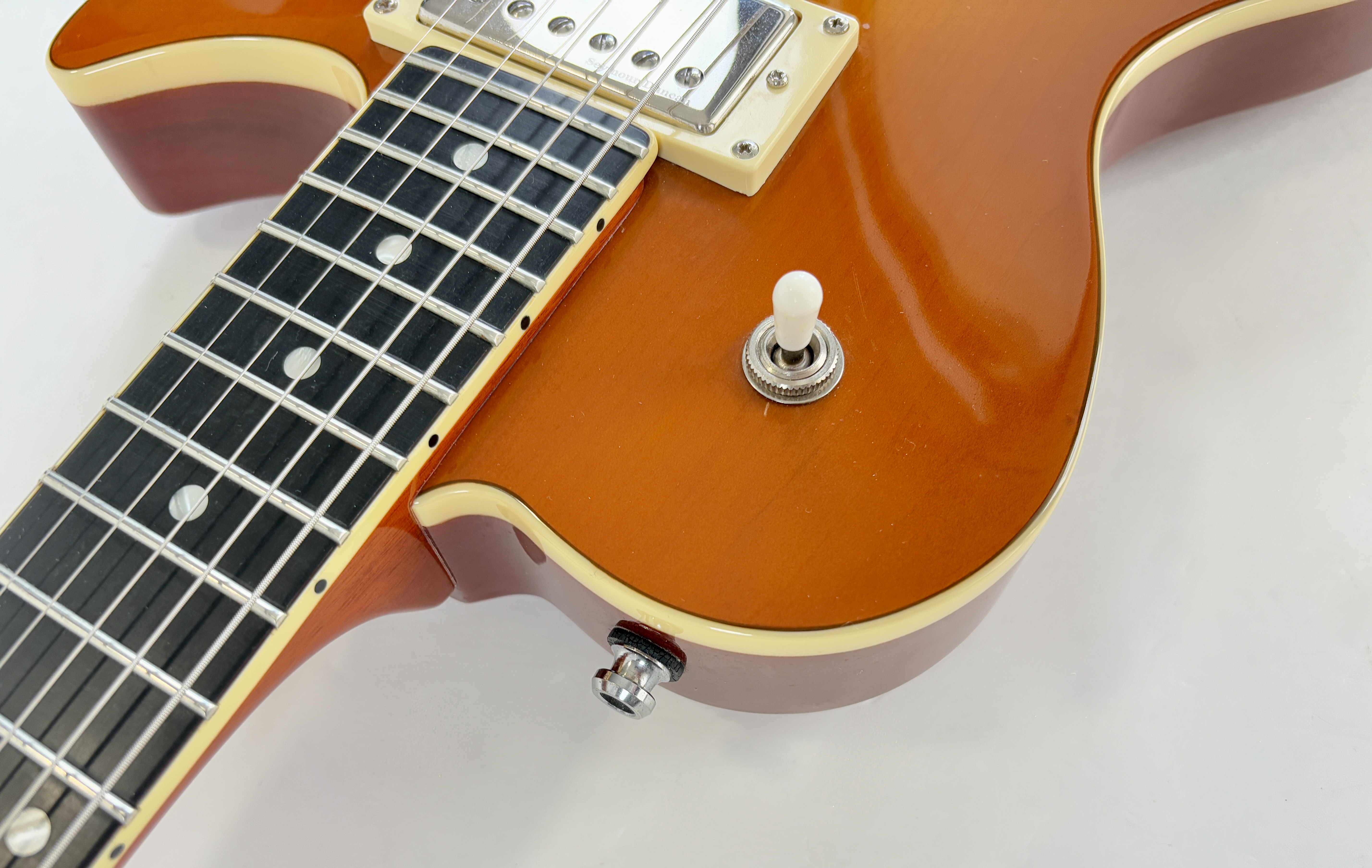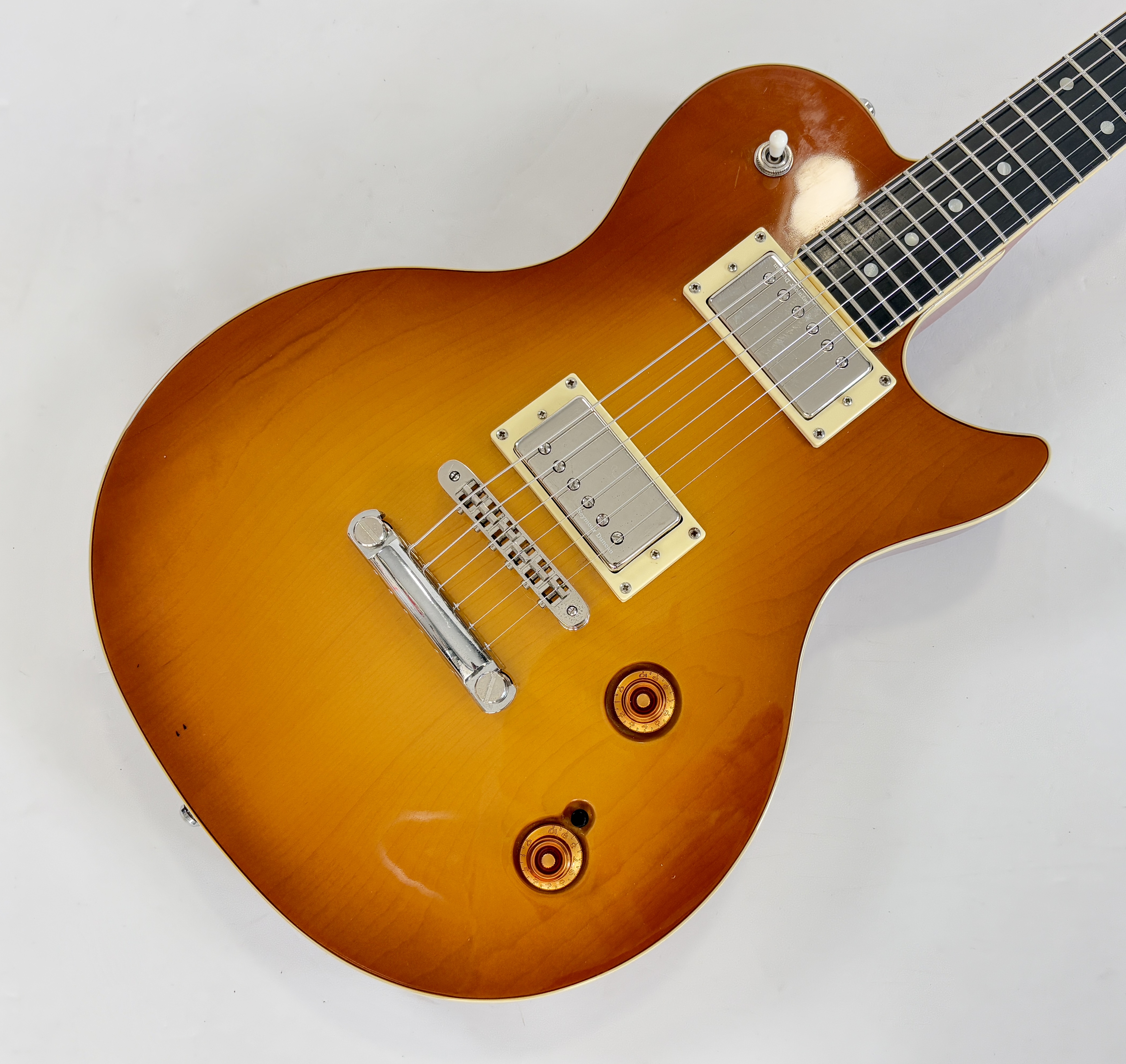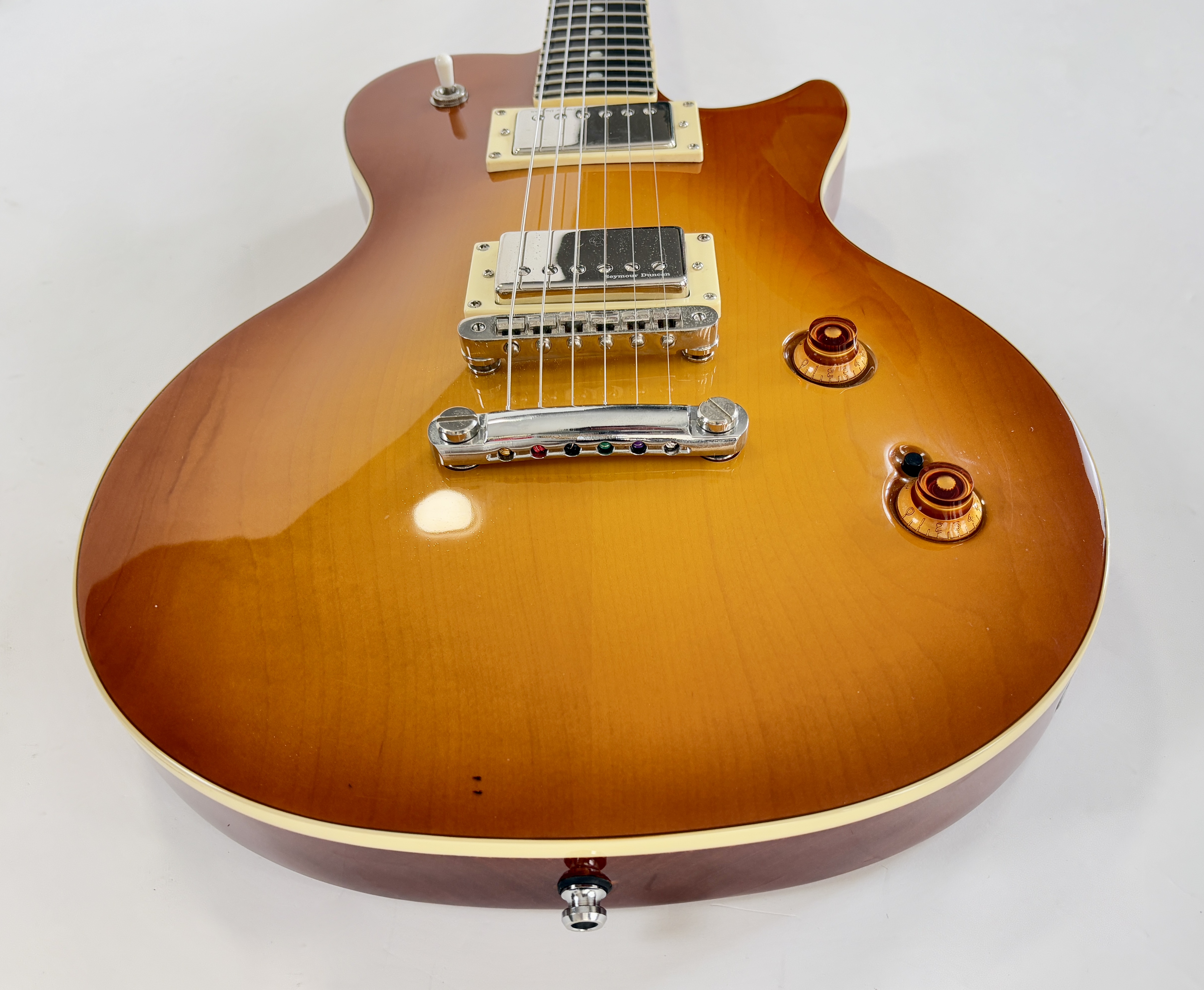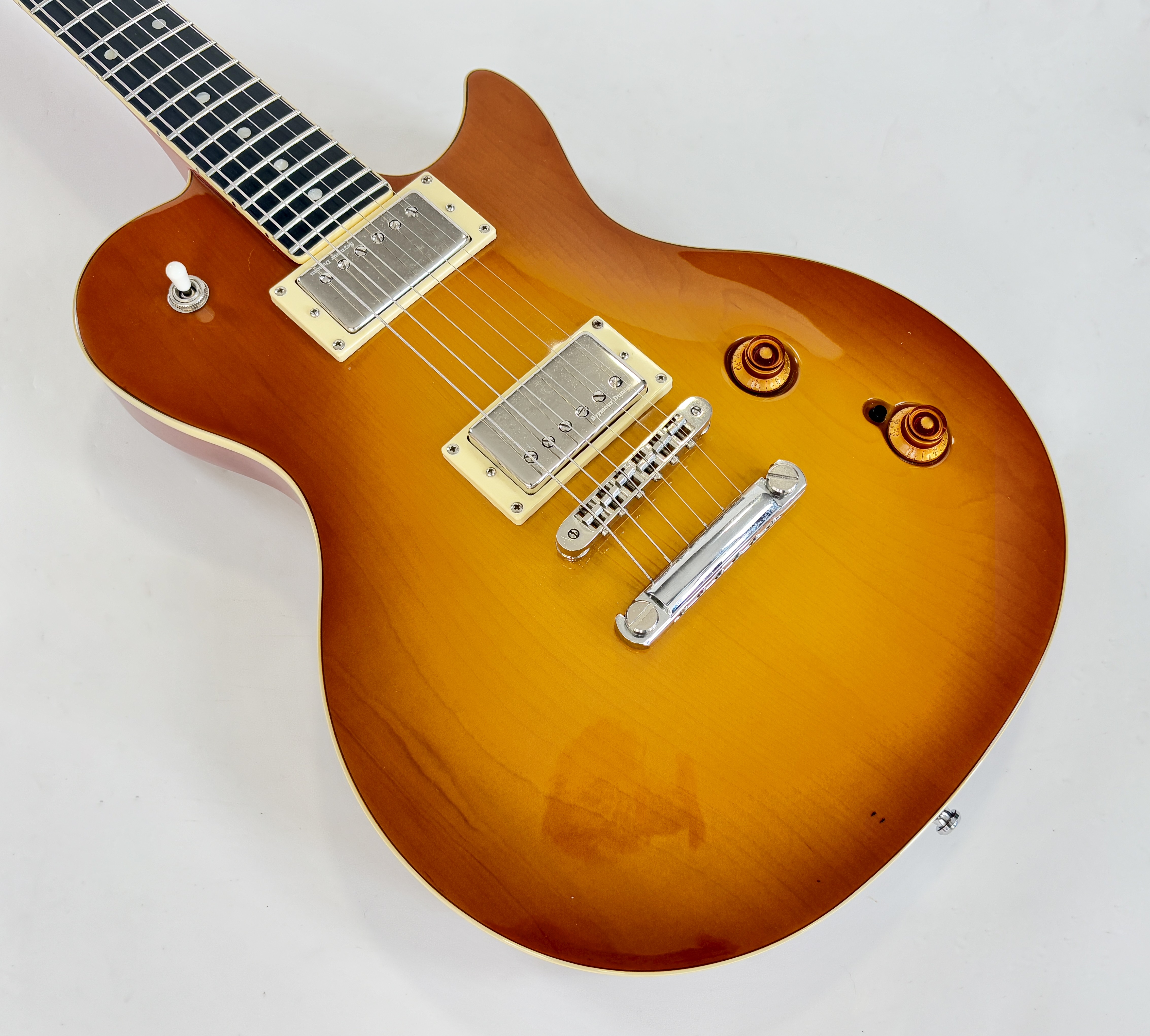 Cette belle guitare canadienne s'inspire de la Gibson Les Paul. Corps en cèdre, manche en acajou, superbe table en érable et une touche en richlite pour un touché proche de l'ébène. Les micros sont ici des Seymour Duncan, une paire de SH-1, reproduction des PAF de 1959.Dépôt-vente, achat, vente, reprise, location.