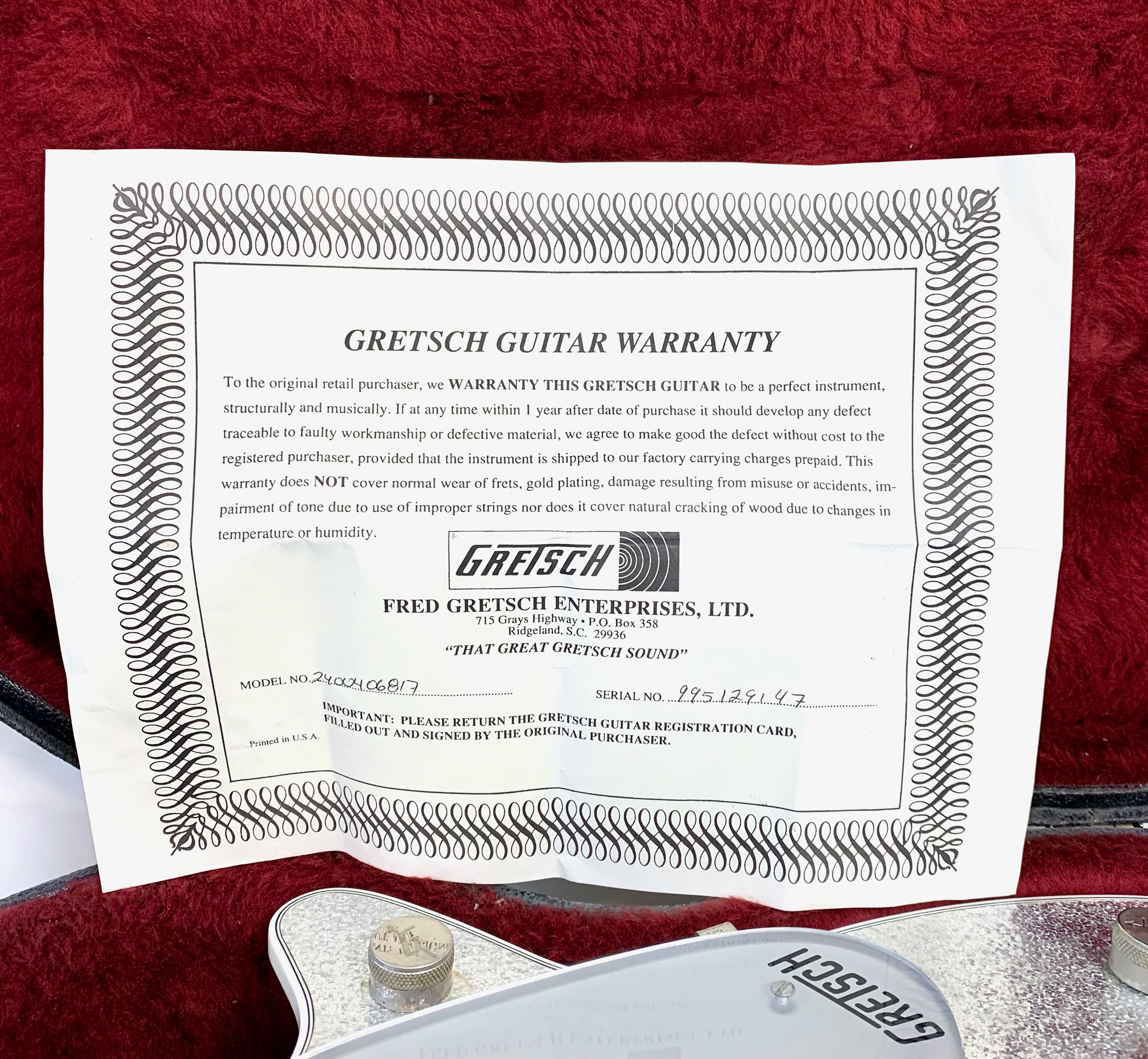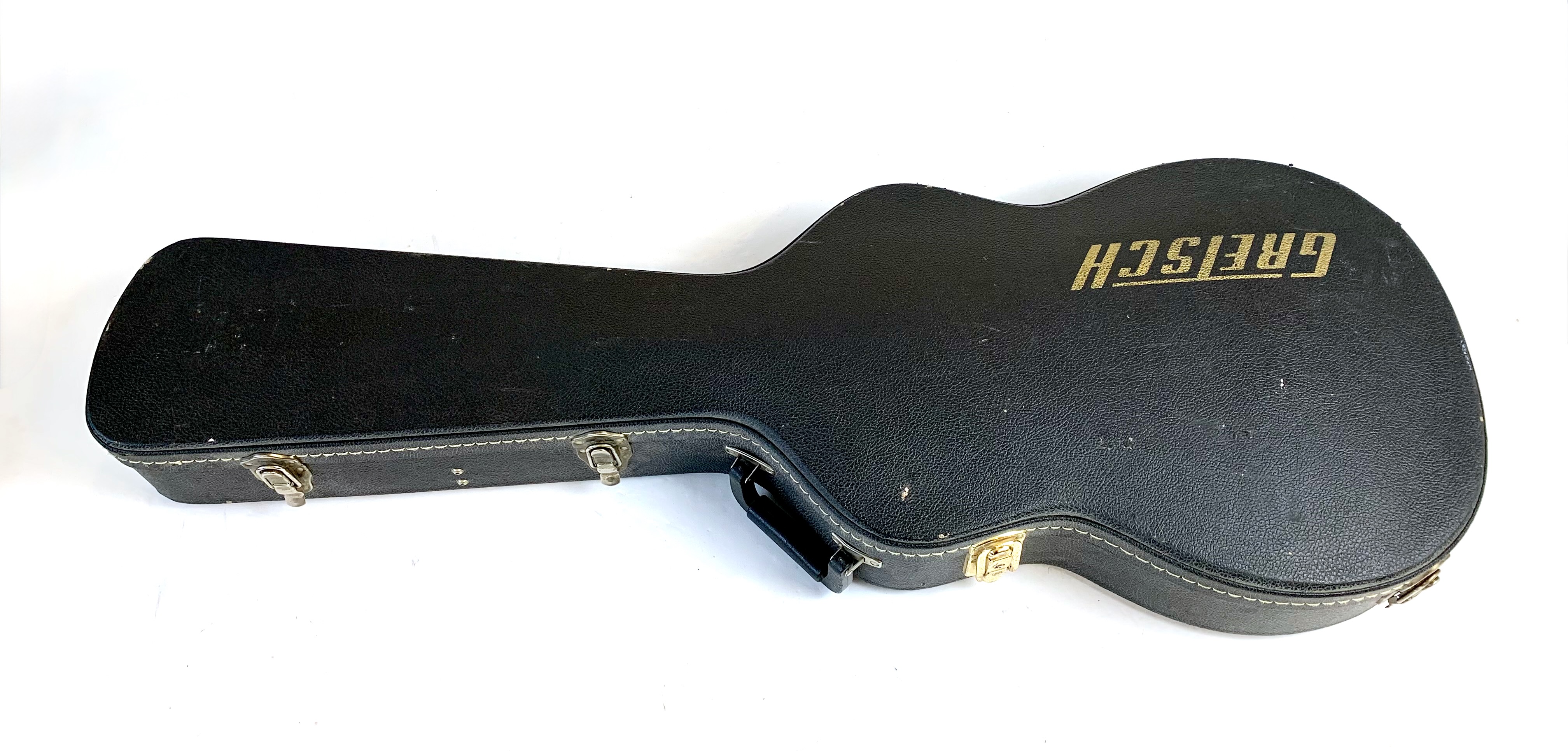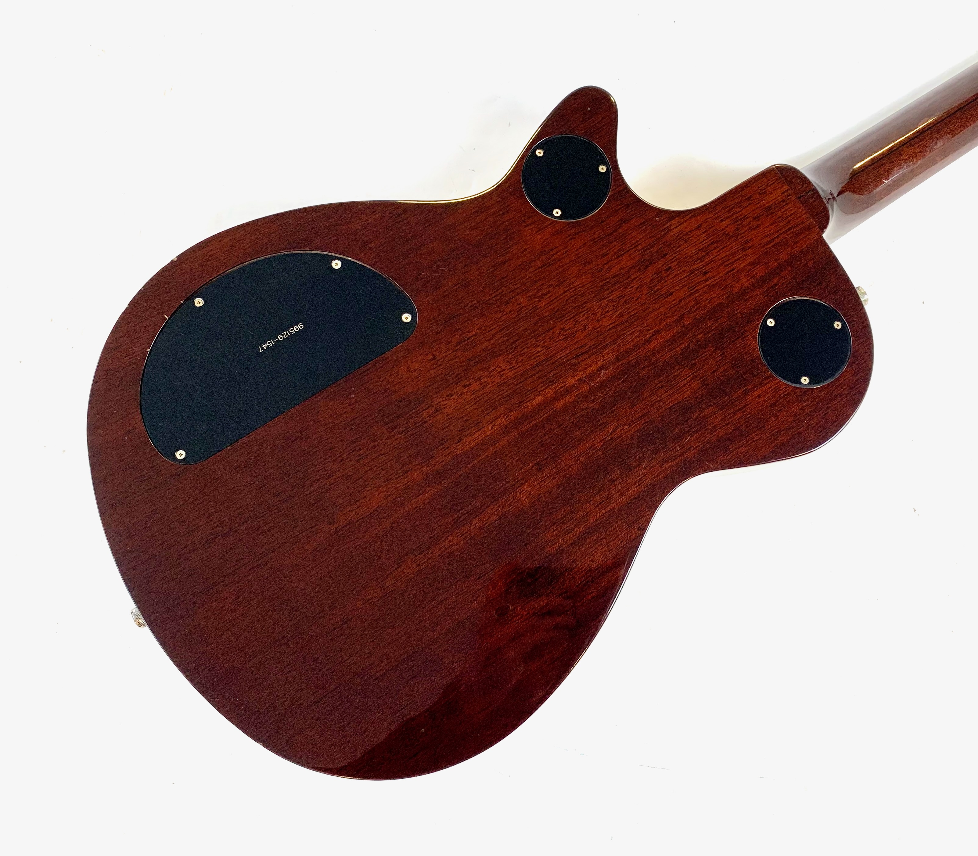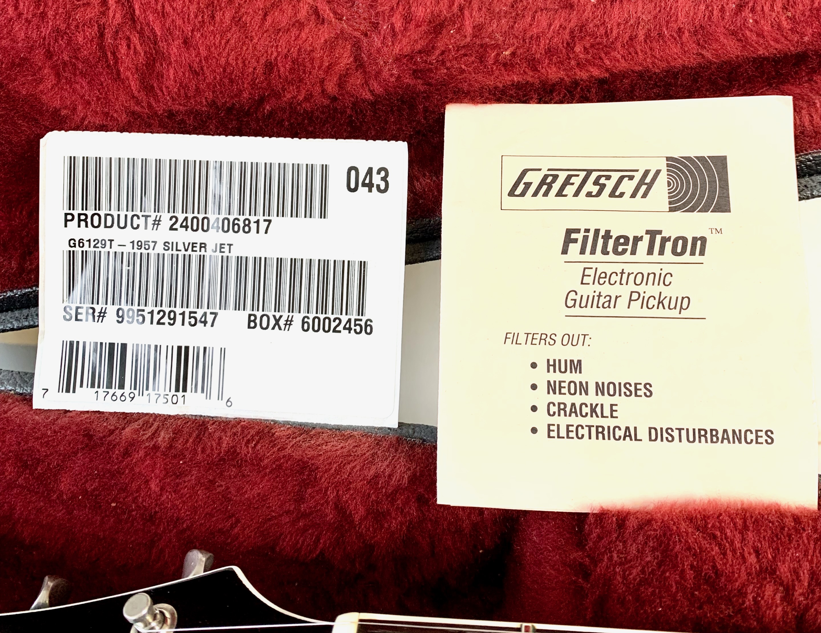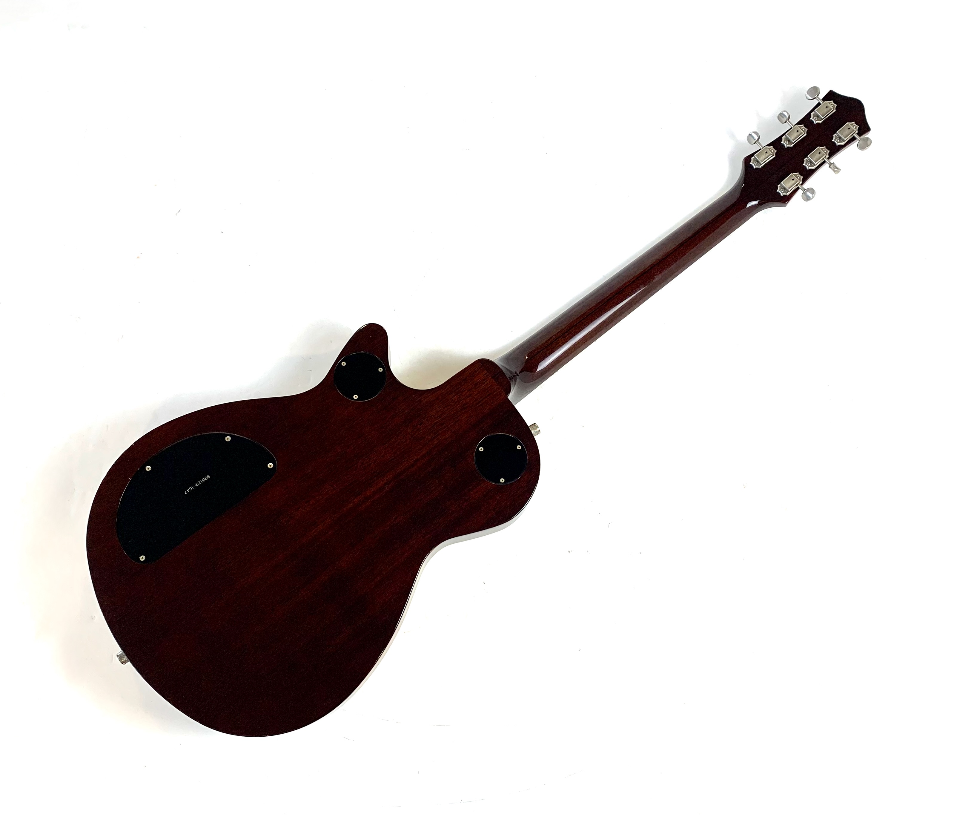 La Jet est lancée en 1953, niveau design elle pioche son inspiration de la Gibson Les Paul tout en étant construite très différemment : elle est en partie creuse. Cette 6129 faite au Japon est dotée d’une paire de micros FilterTron, on notera la présence d'une touche en ébène. C'est un modèle pré-Fender dont le Bigsby a été remplacé par un Tune-O-Matic avec Stopbar. Habillée comme une princesse avec sa table à paillettes elle est prête pour se retrouver sous les projecteurs. Vendue avec ses papiers dans son étui d’origine.Location, achat, vente, reprise, dépôt-vente.