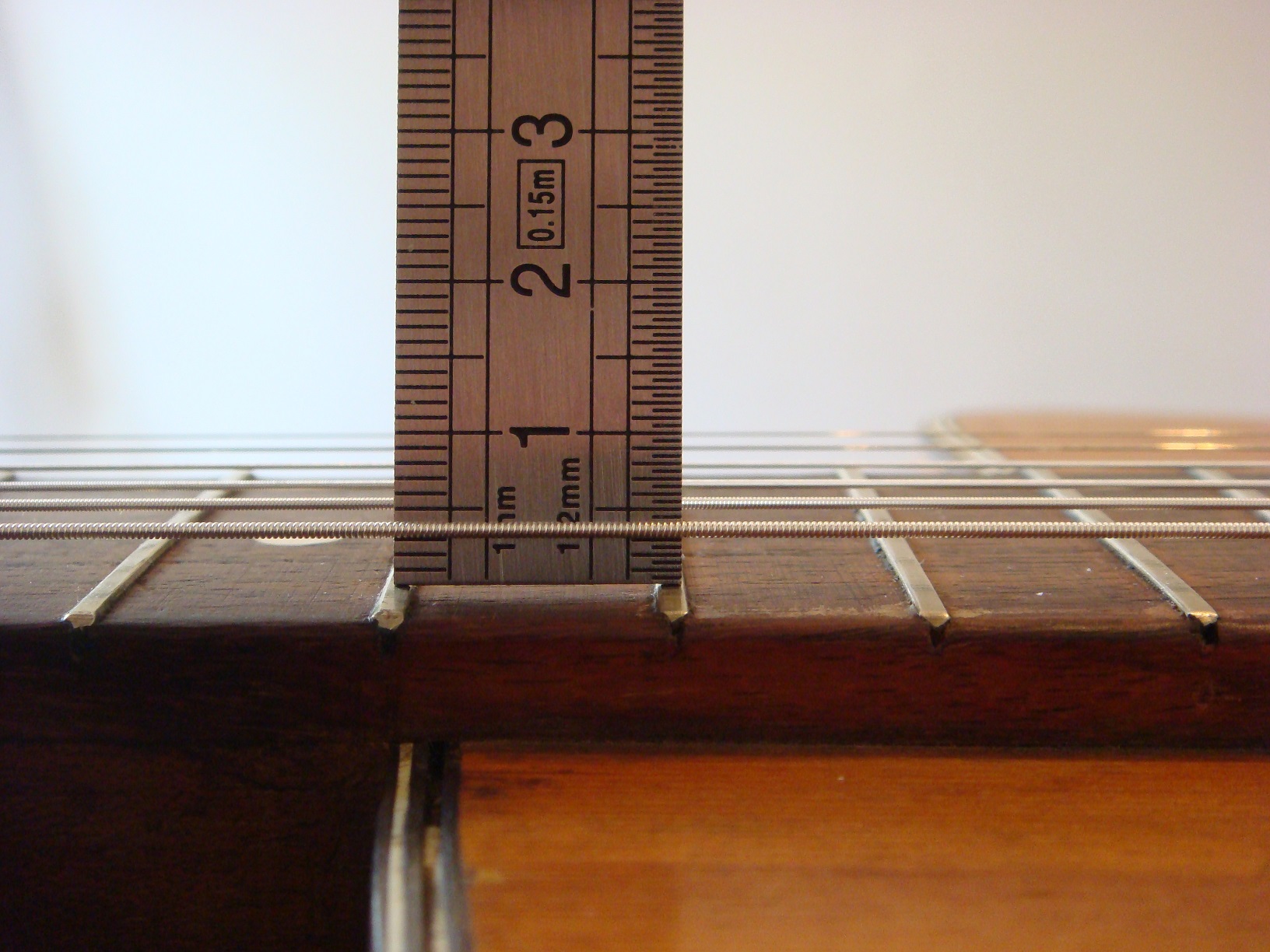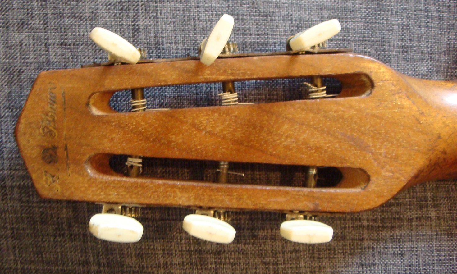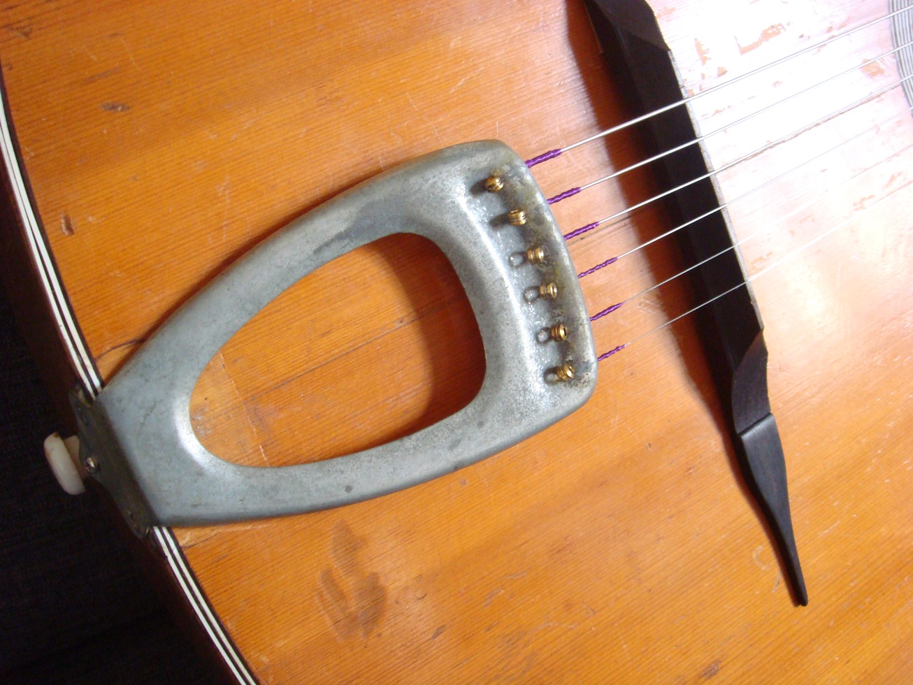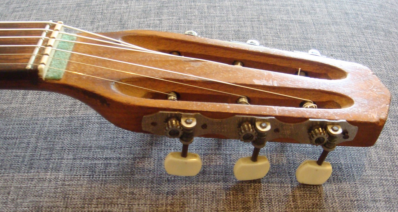 Le cordier, le chevalet et ses « moustaches » ne sont pas d'origine. En revanche, la feutrine verte sur la tête ainsi que les mécaniques, qui fonctionnent très bien, le sont (mécanique de la corde de sol légèrement tordue).