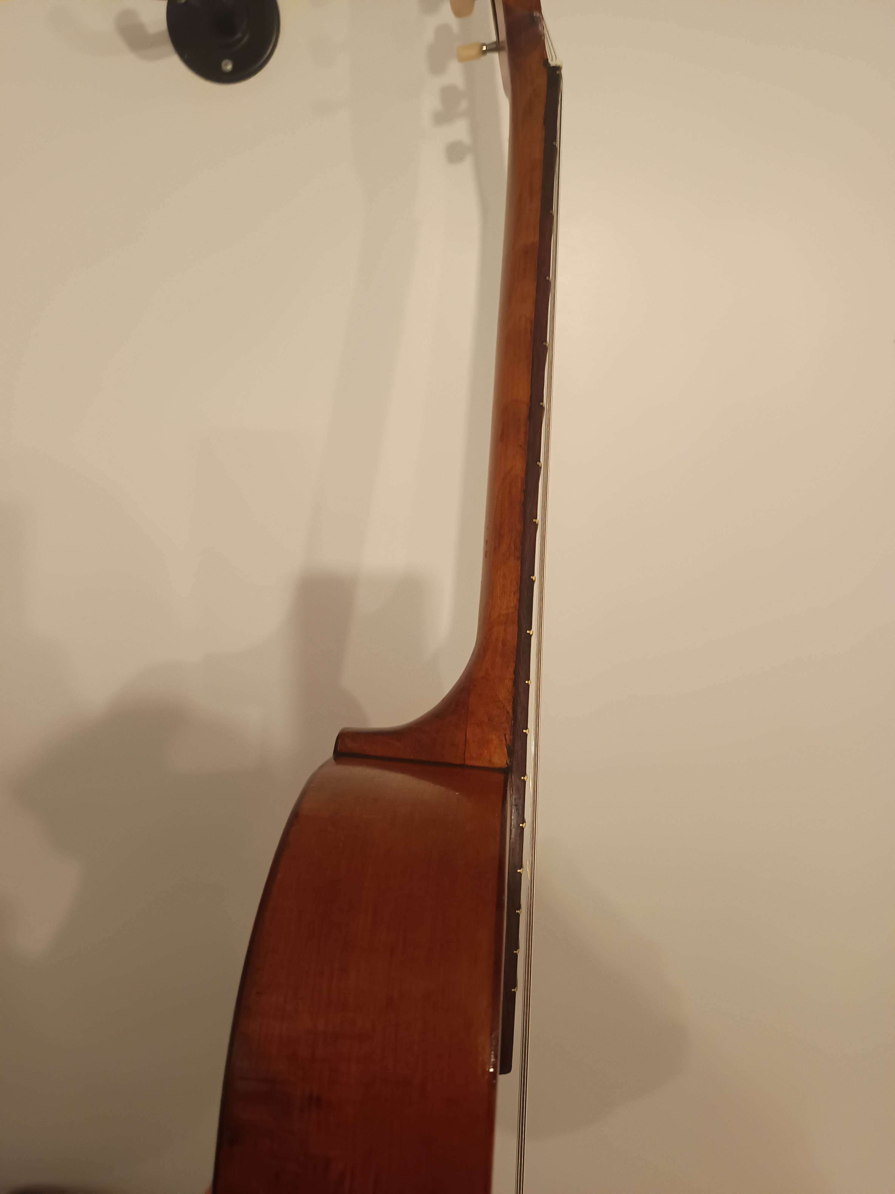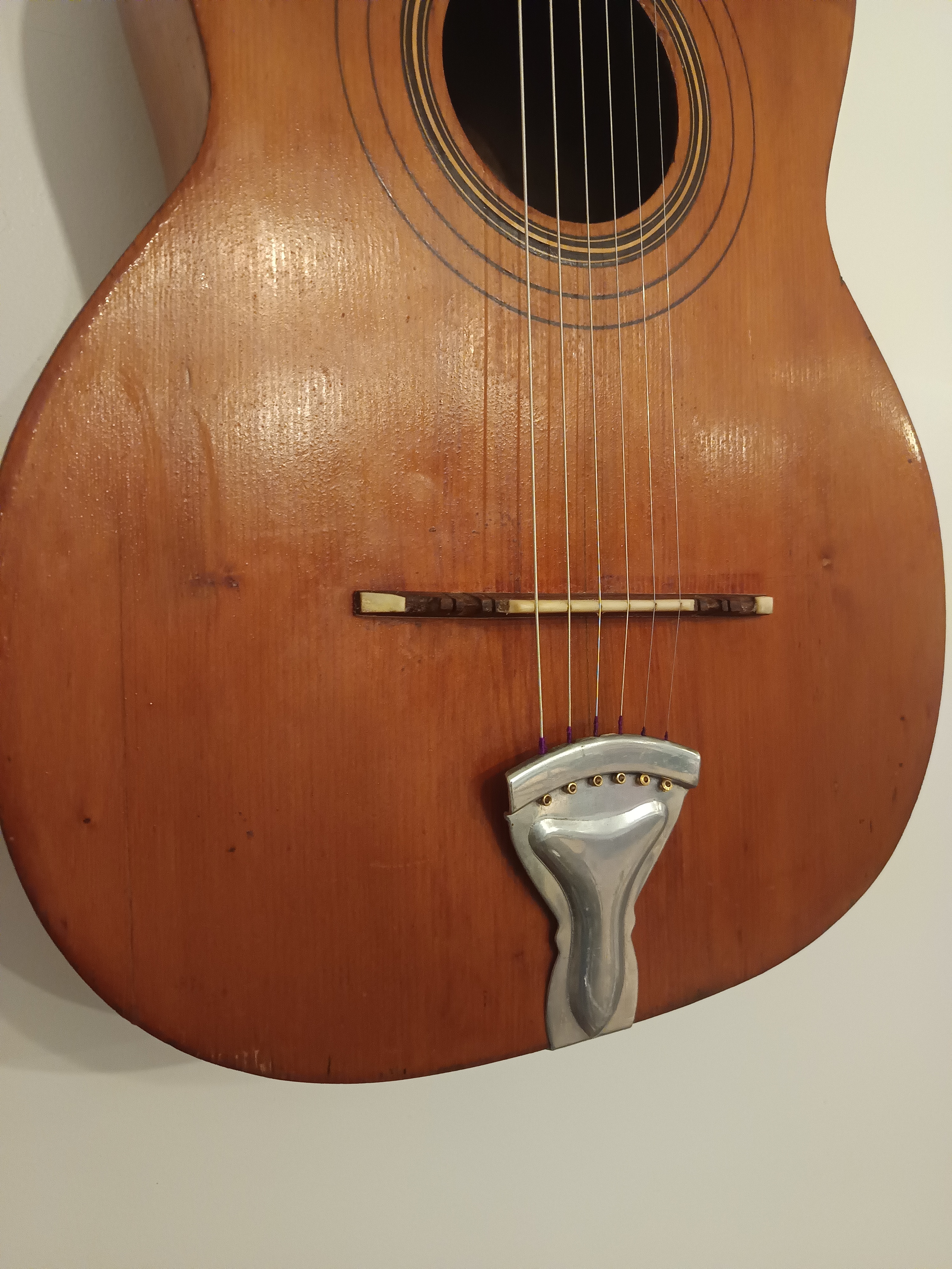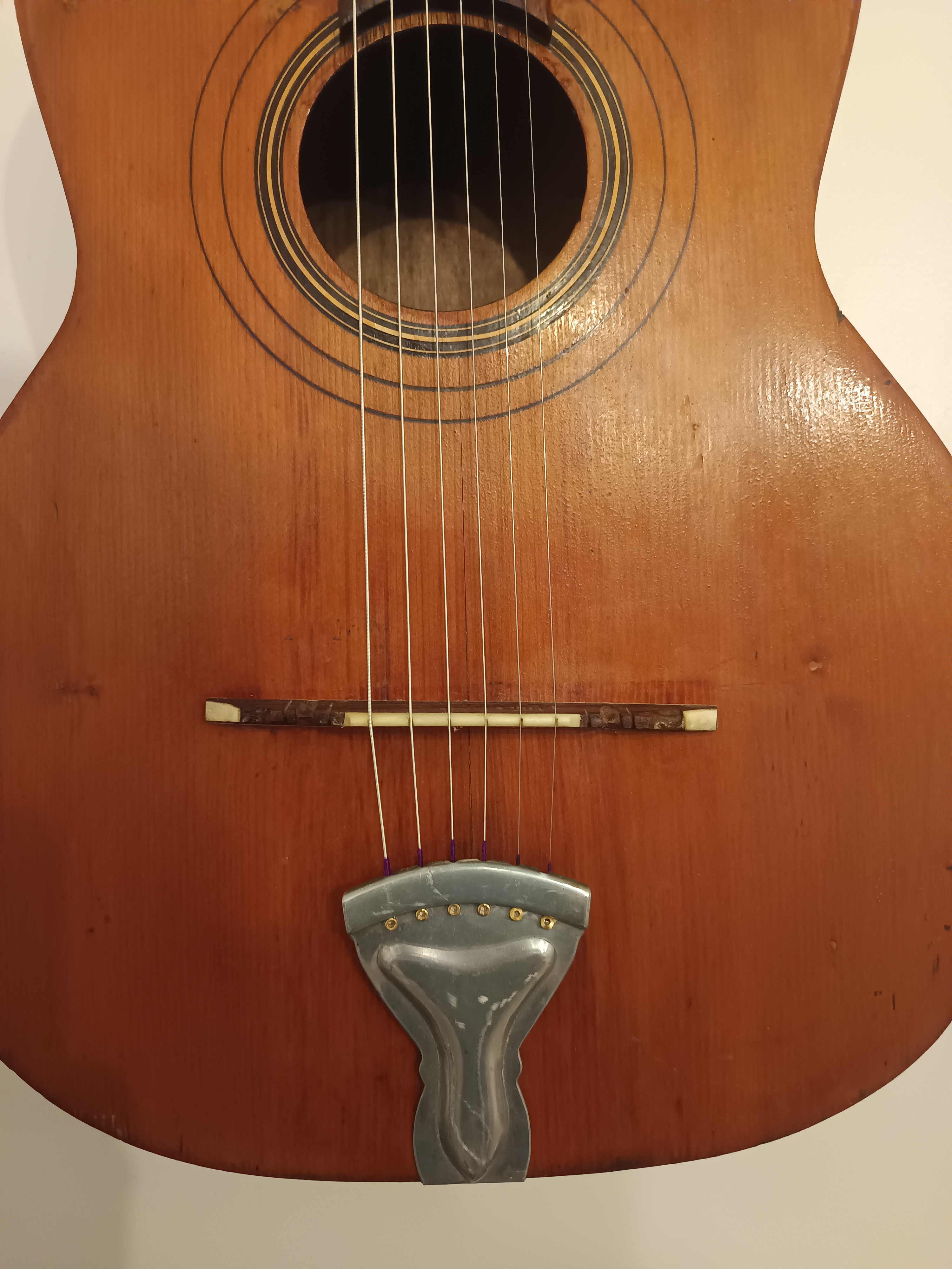 Guitare jazz manouche des années 40-50, pas d'étiquette intérieure, lutherie italienne région de Bari.Entièrement révisée pour être rejouée, 2 fissures de table stabilisées, touche dévernie et huilée, point de touche 12 refait, chevalet os/palissandre ajusté et réglé, cordes argentines neuves, manche parfaitement droit. Dos bombé.