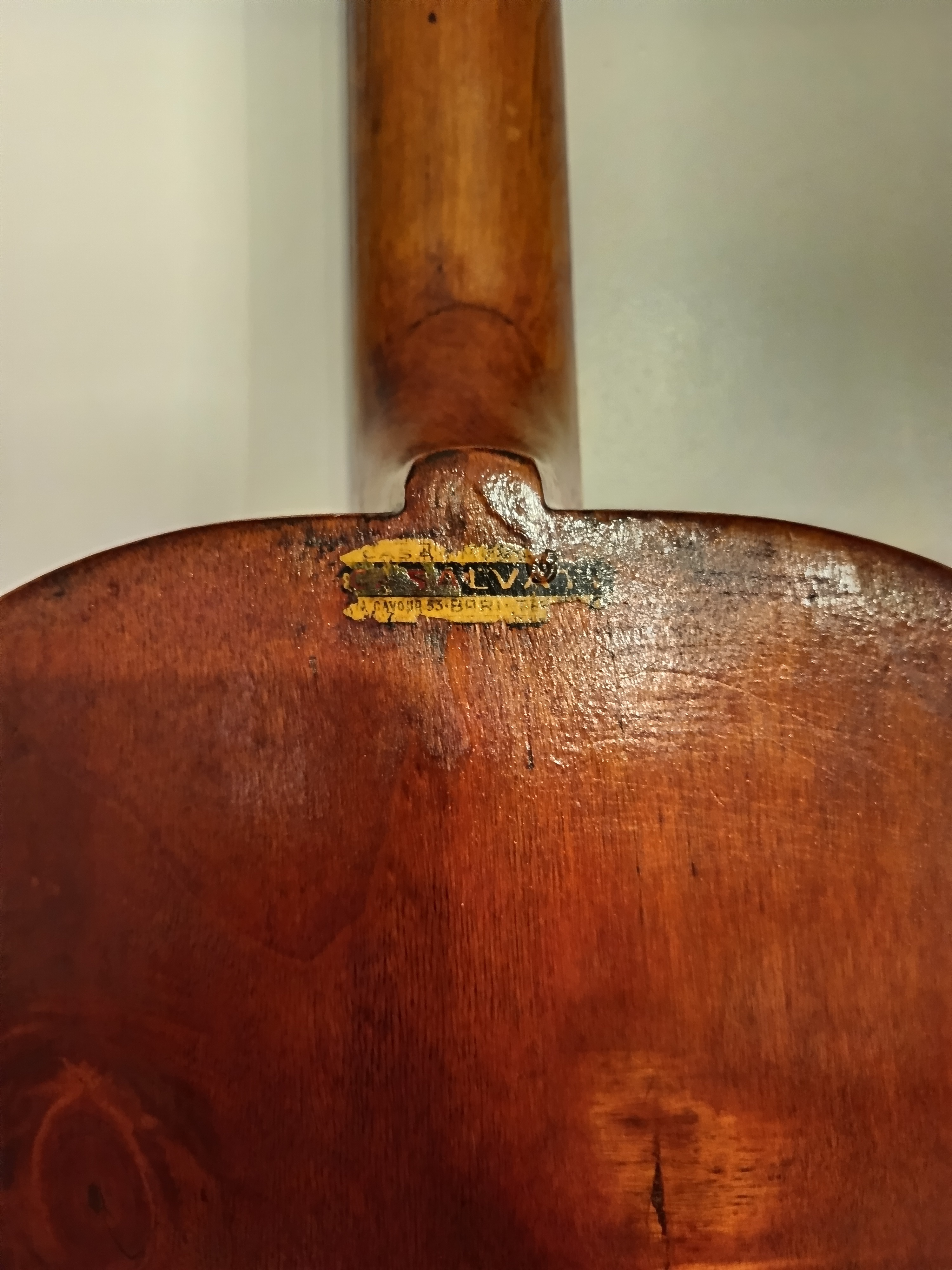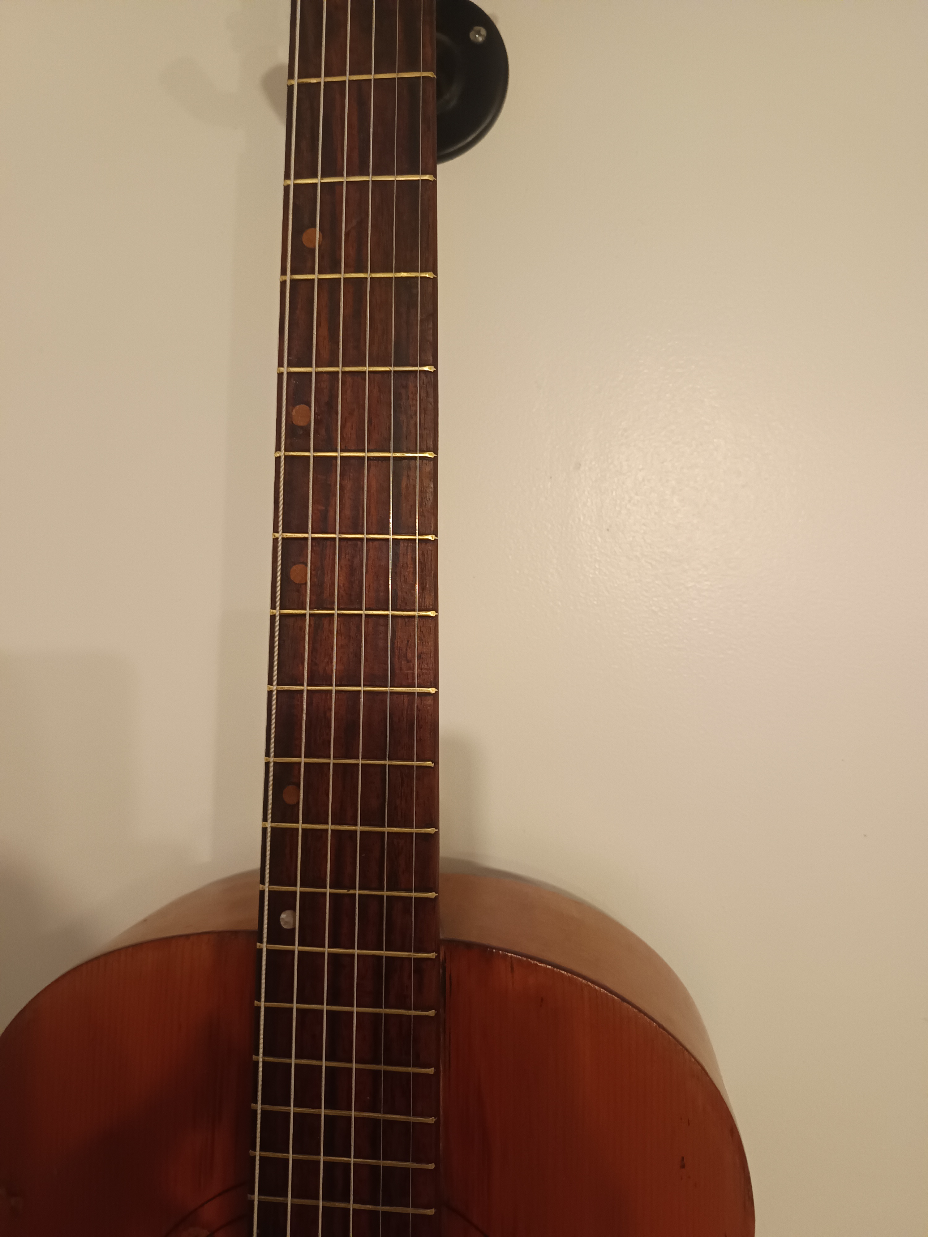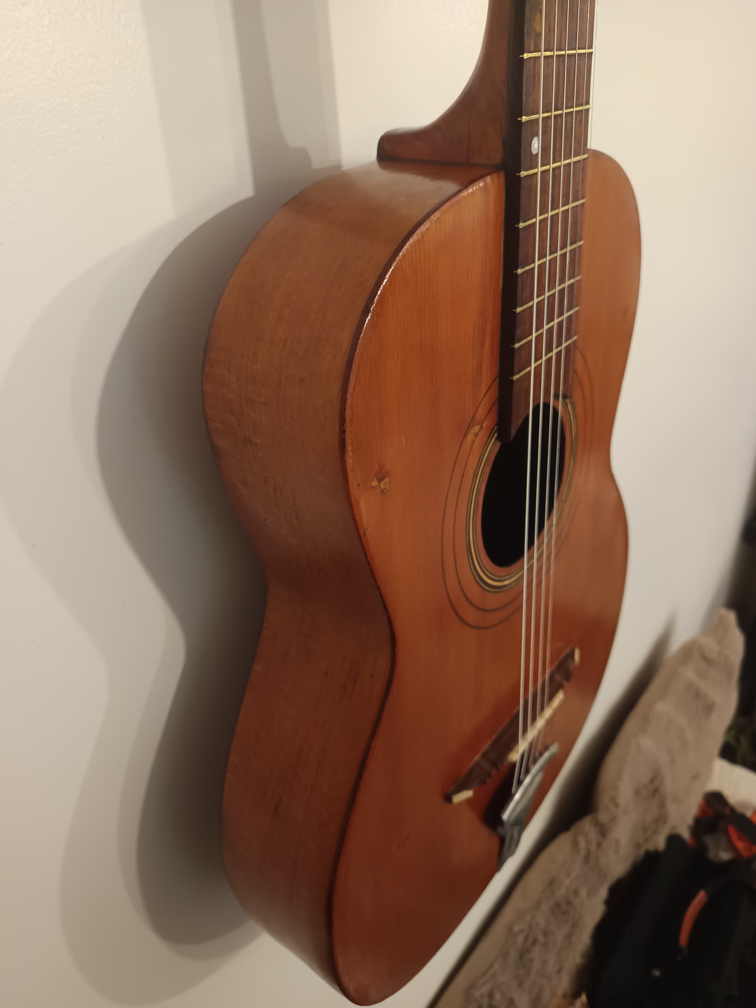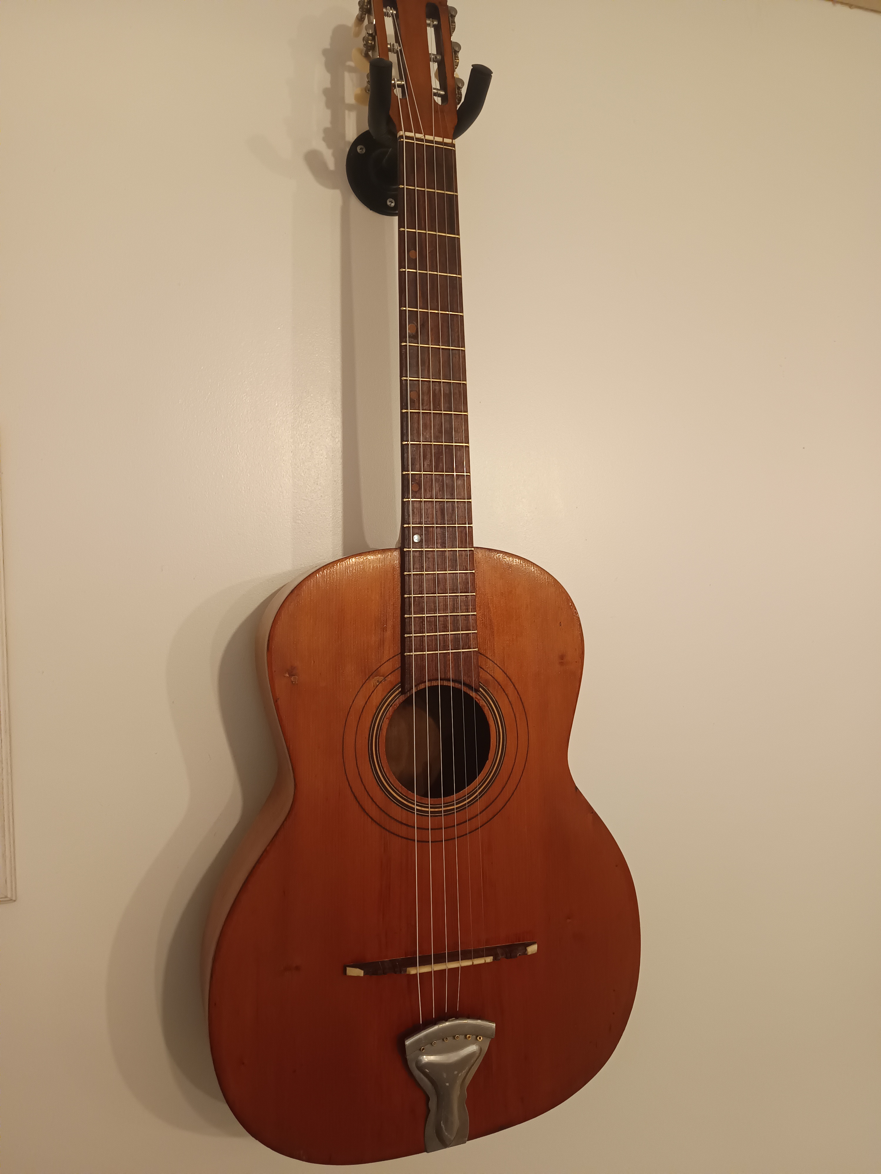 Guitare jazz manouche des années 40-50, pas d'étiquette intérieure, lutherie italienne région de Bari.Entièrement révisée pour être rejouée, 2 fissures de table stabilisées, touche dévernie et huilée, point de touche 12 refait, chevalet os/palissandre ajusté et réglé, cordes argentines neuves, manche parfaitement droit. Dos bombé.