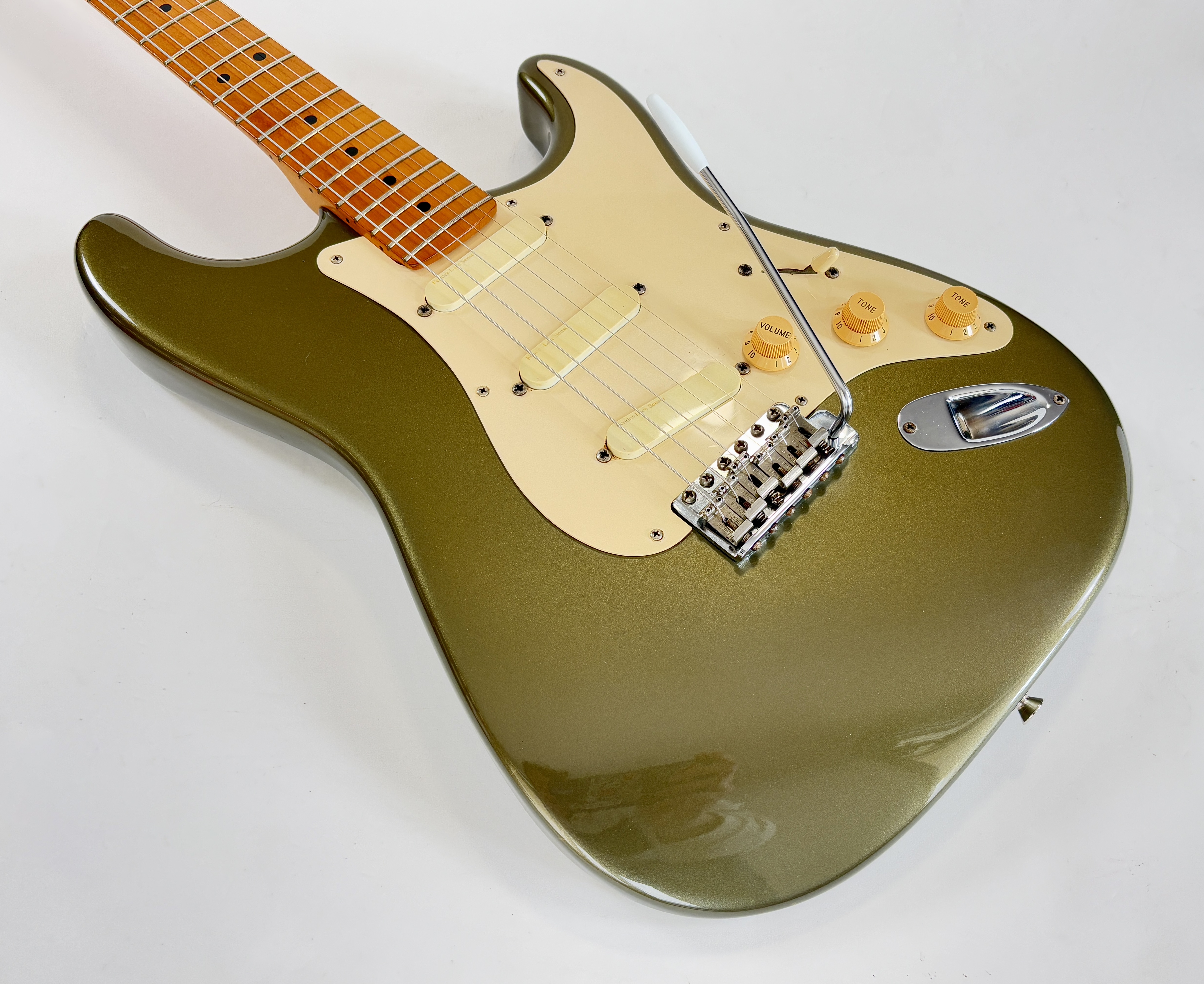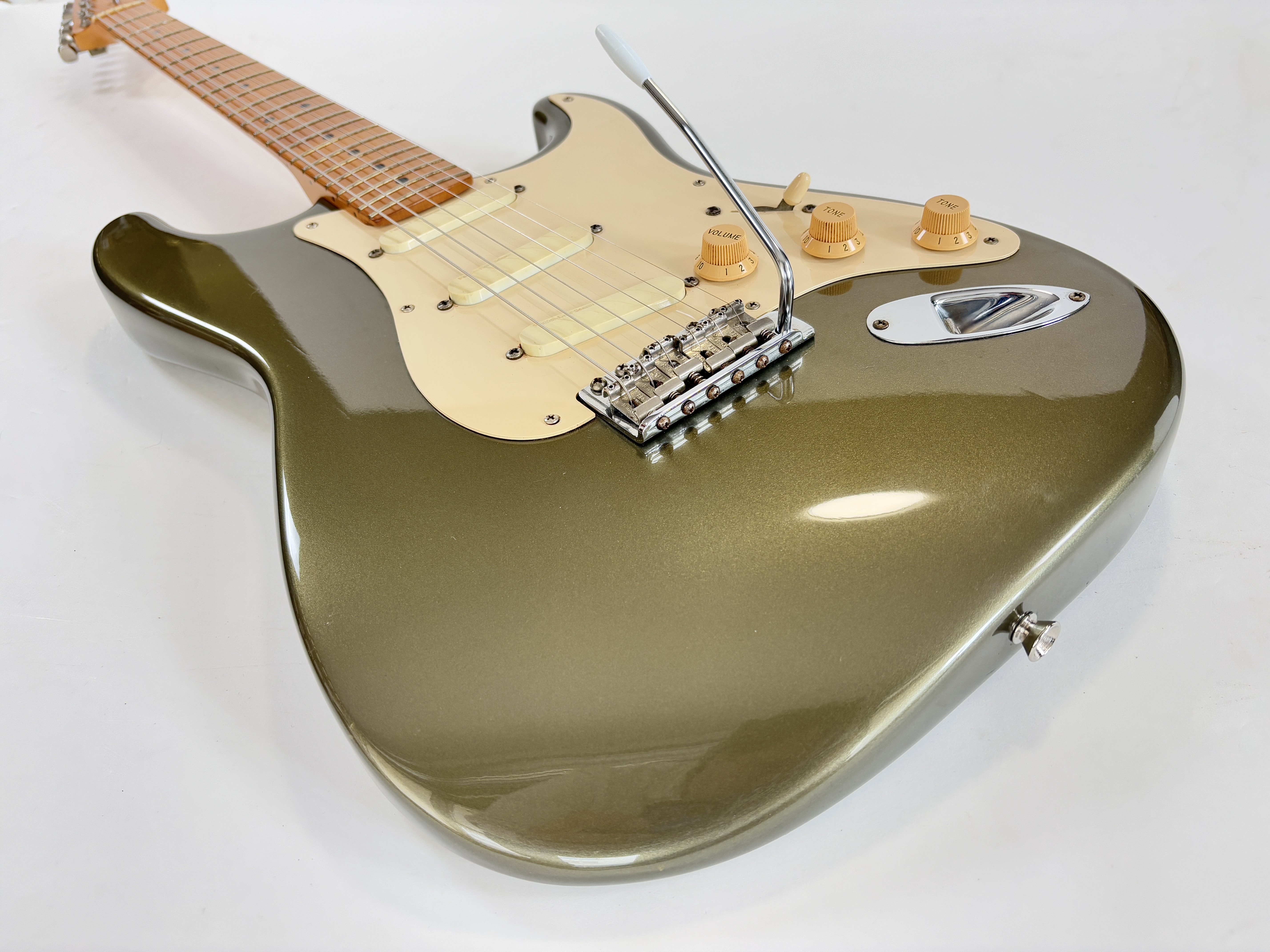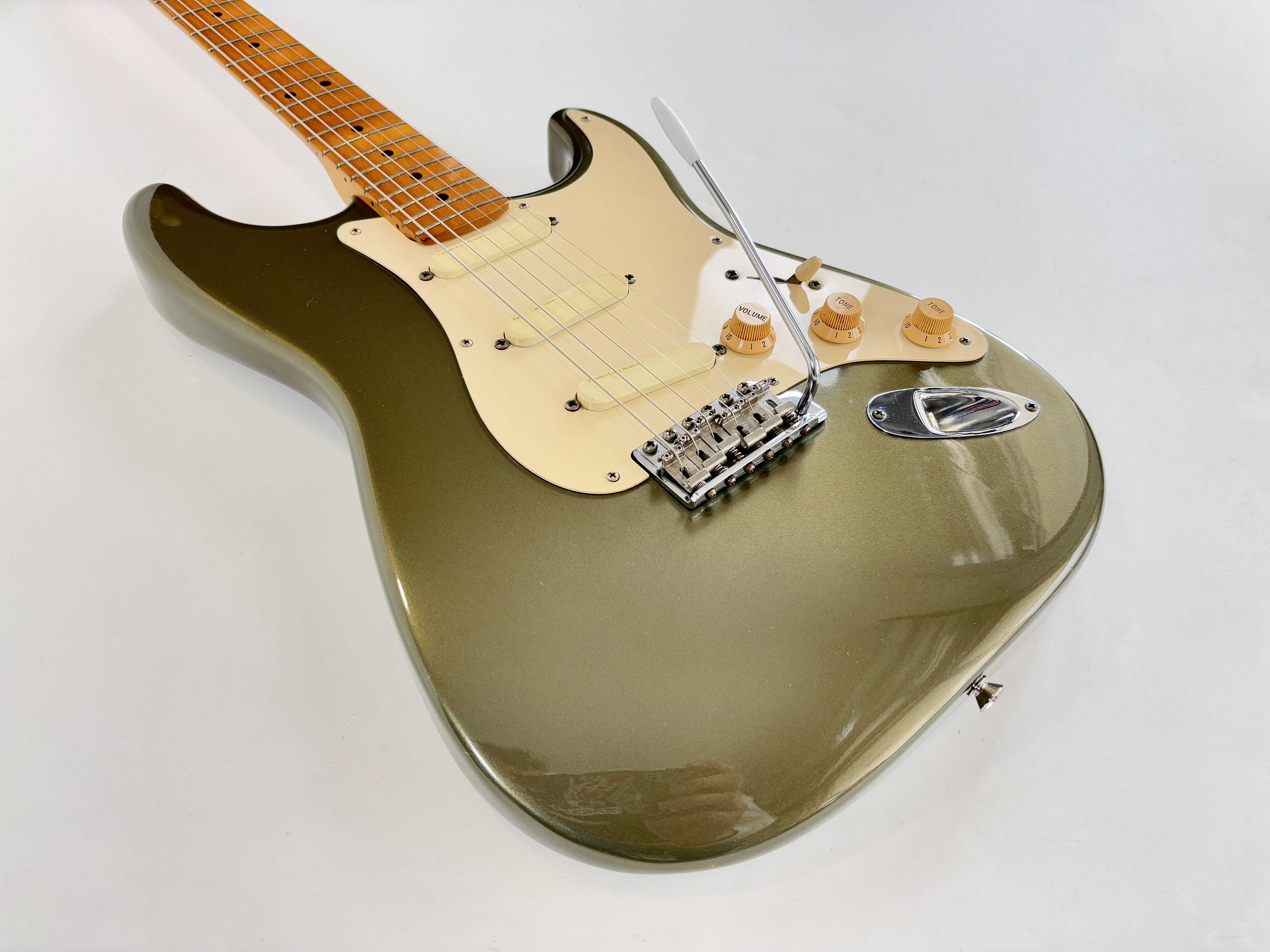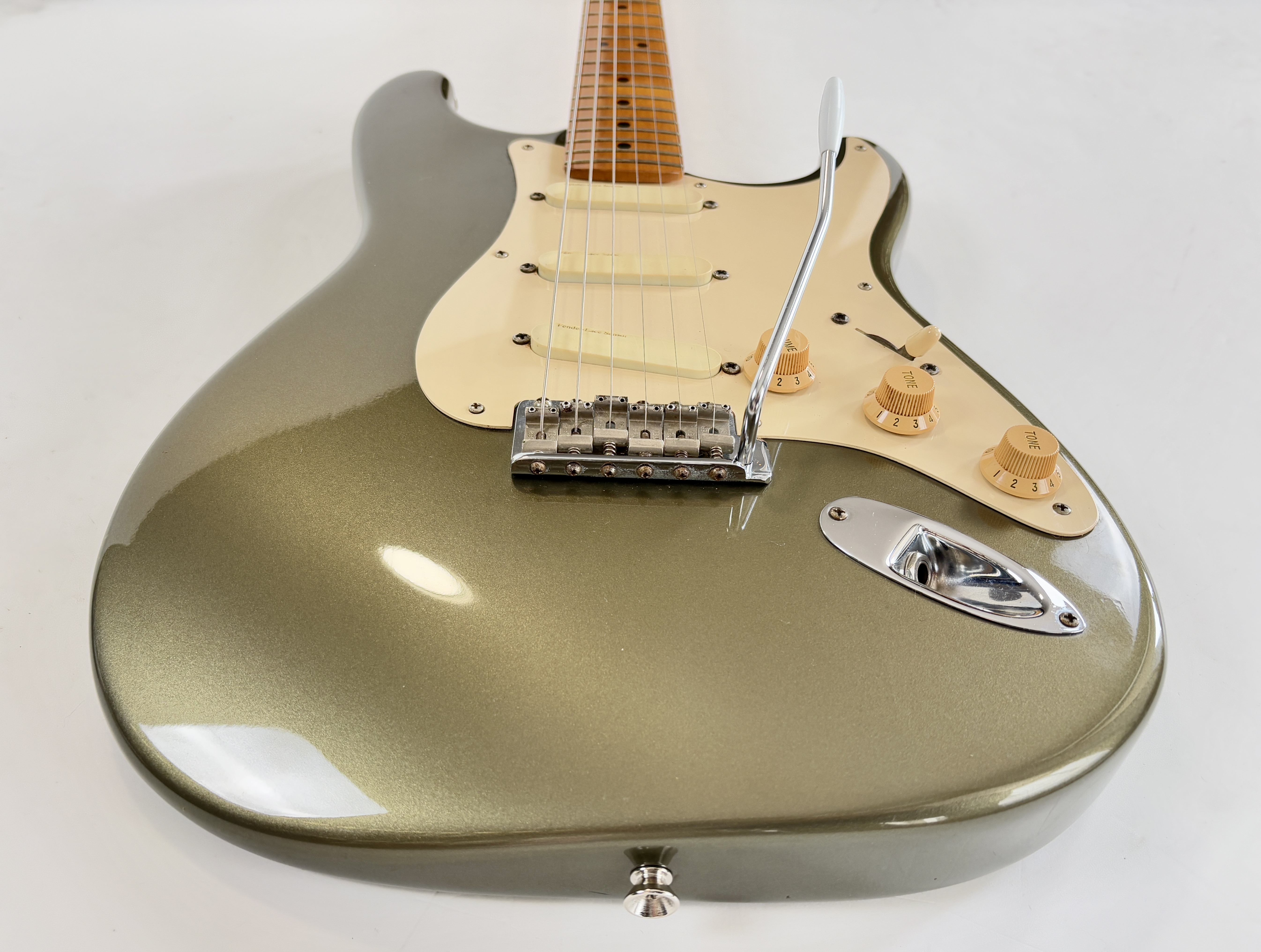 D’abord équipée de Lace Sensor, la série passe en Vintage Noiseless à partir de 2001. Les deux importantes particularités du modèle sont : un manche en soft V ainsi qu’un boost actif utilisable via le second potentiomètre de tonalité. Celle-ci date de la deuxième année de production : 1989 ! Sa couleur Pewter est fort désirable et typique de la période. Vendue en étui non d’origine.Dépôt-vente, achat, vente, reprise, location.