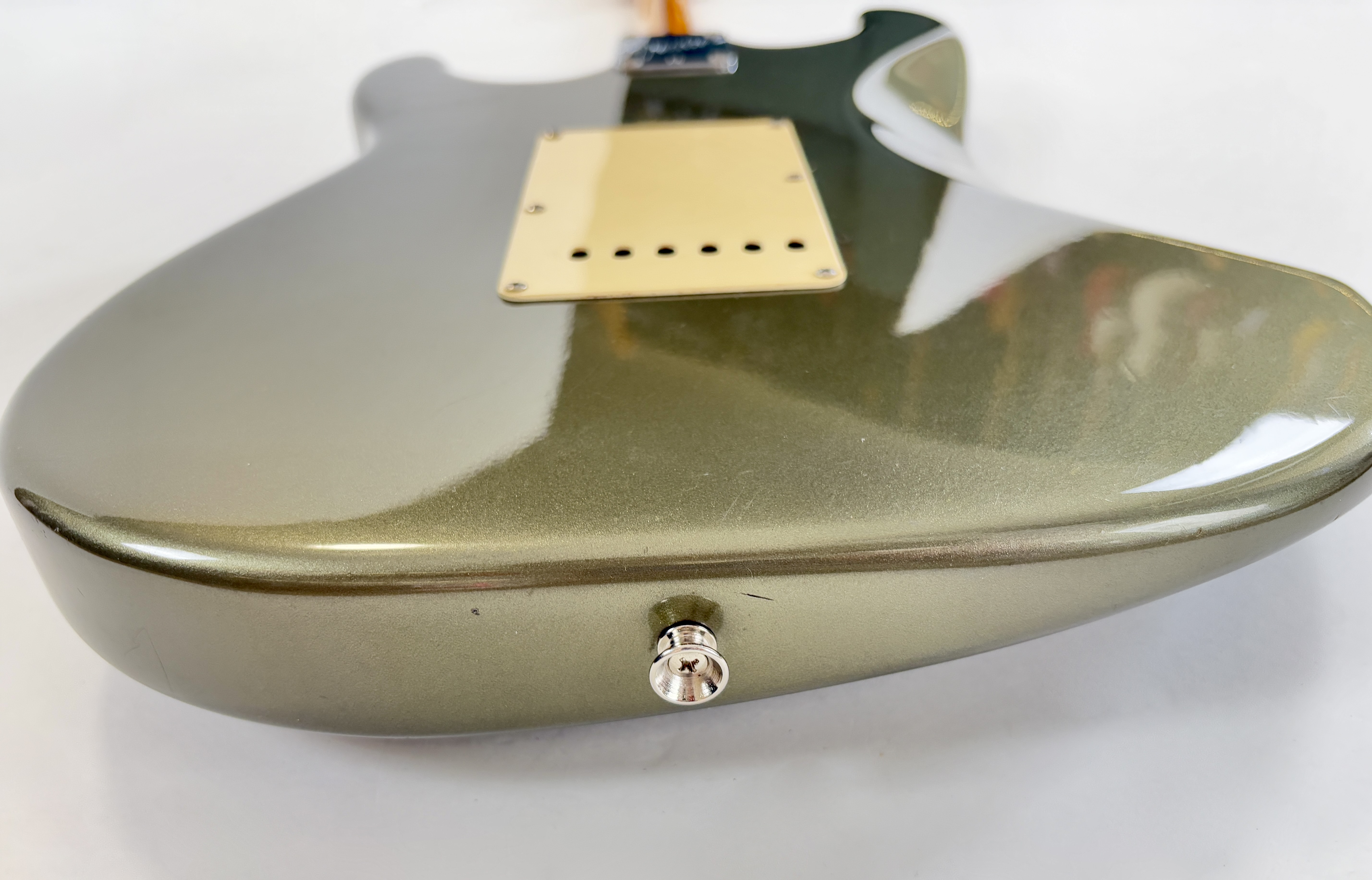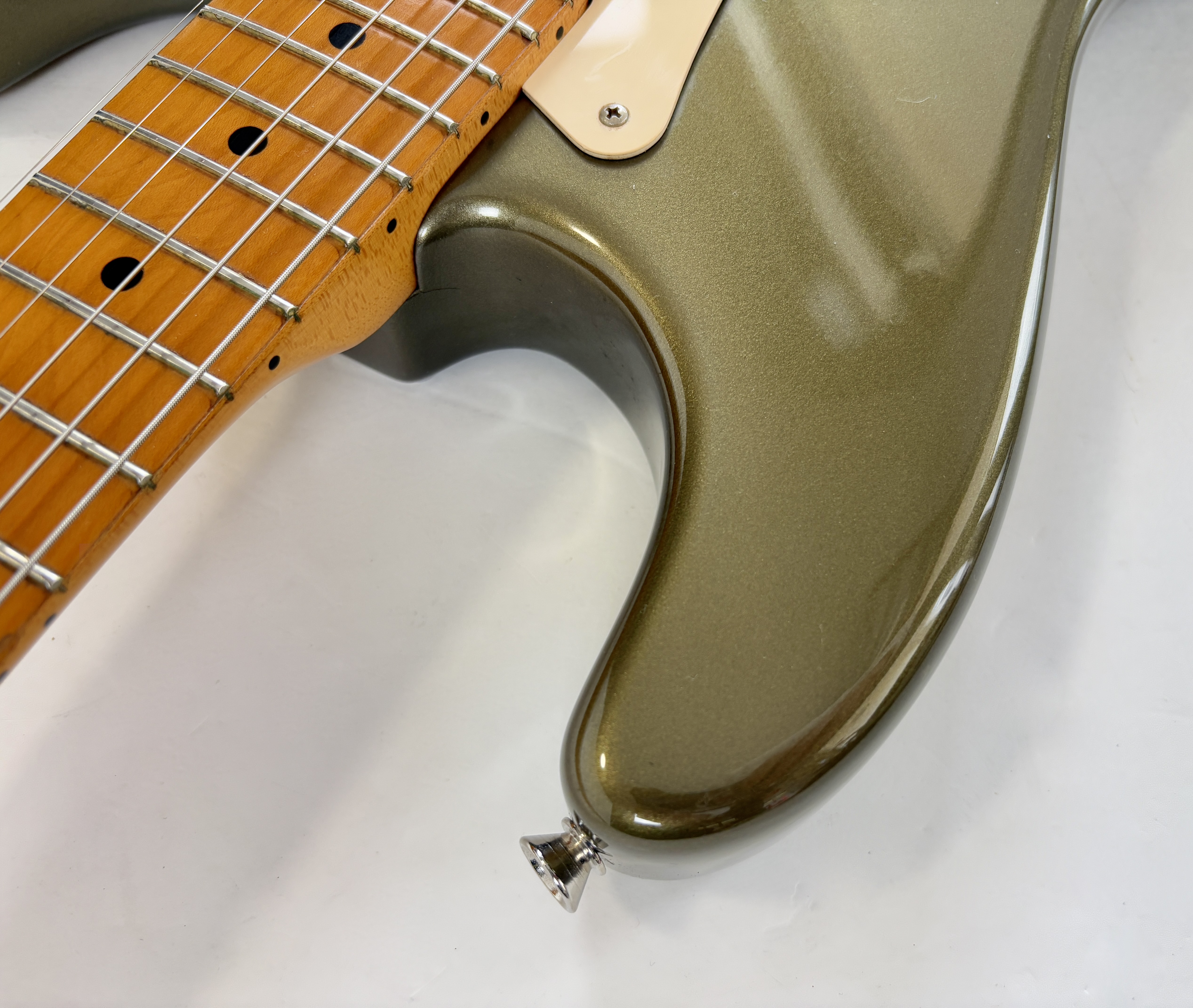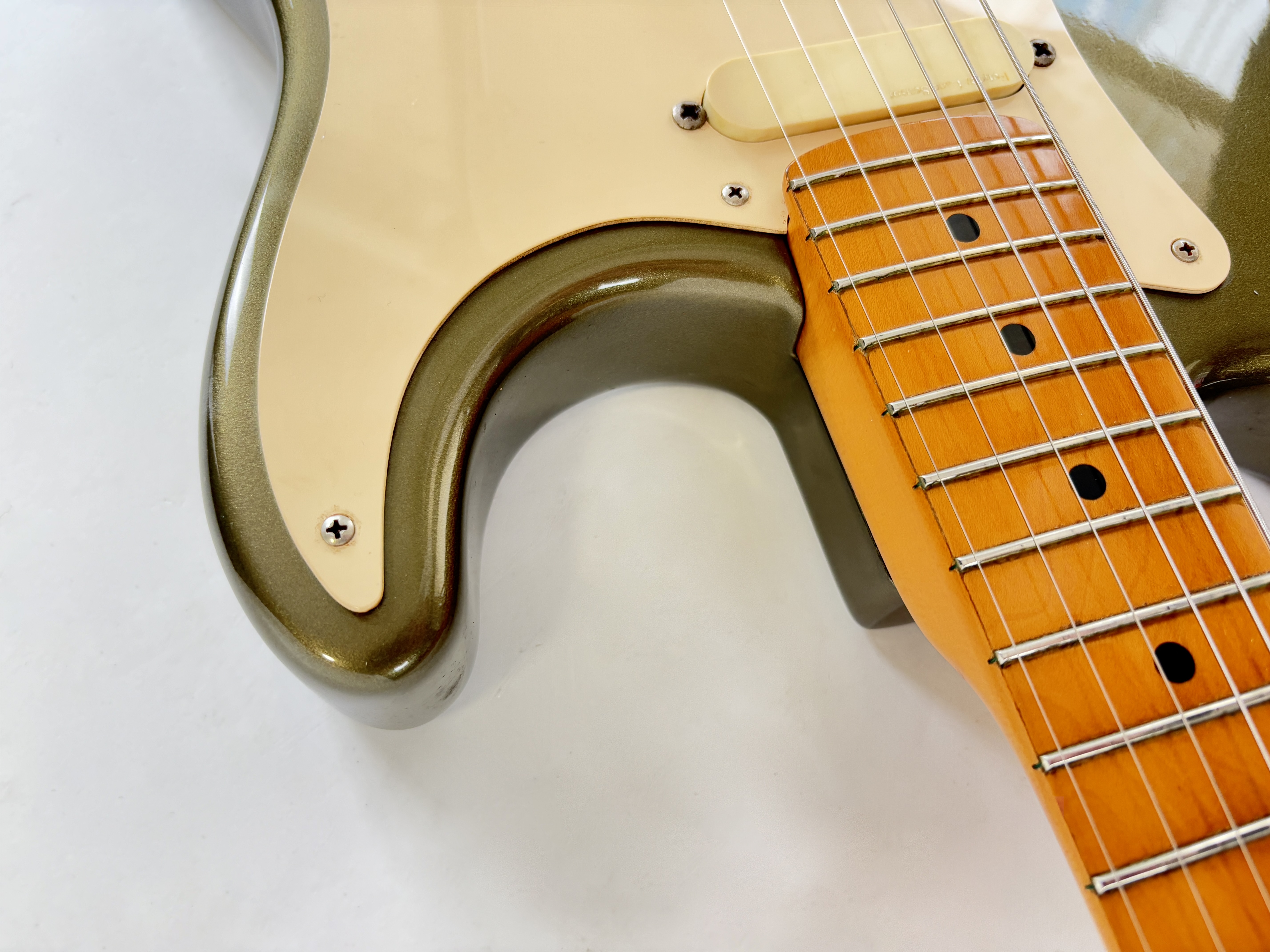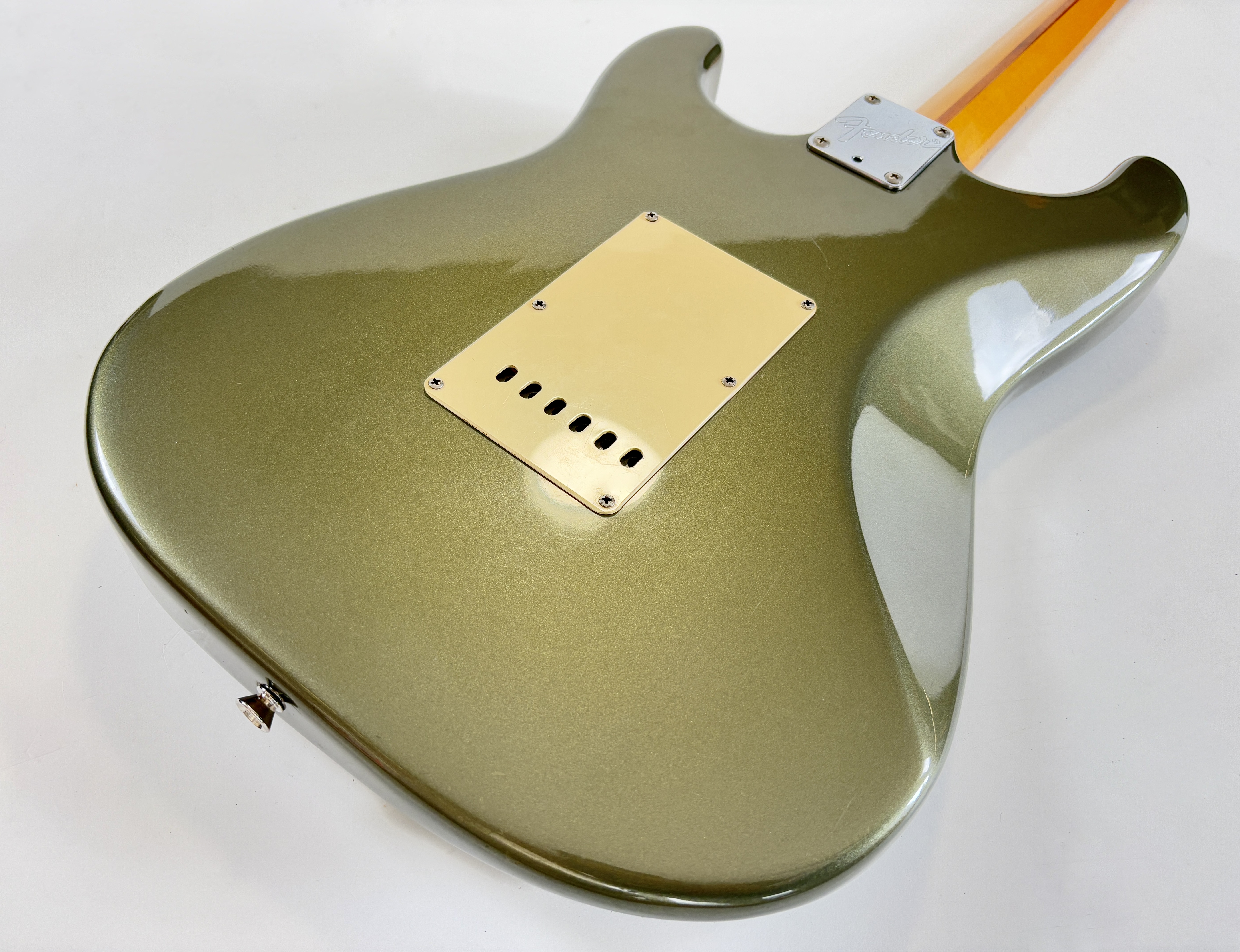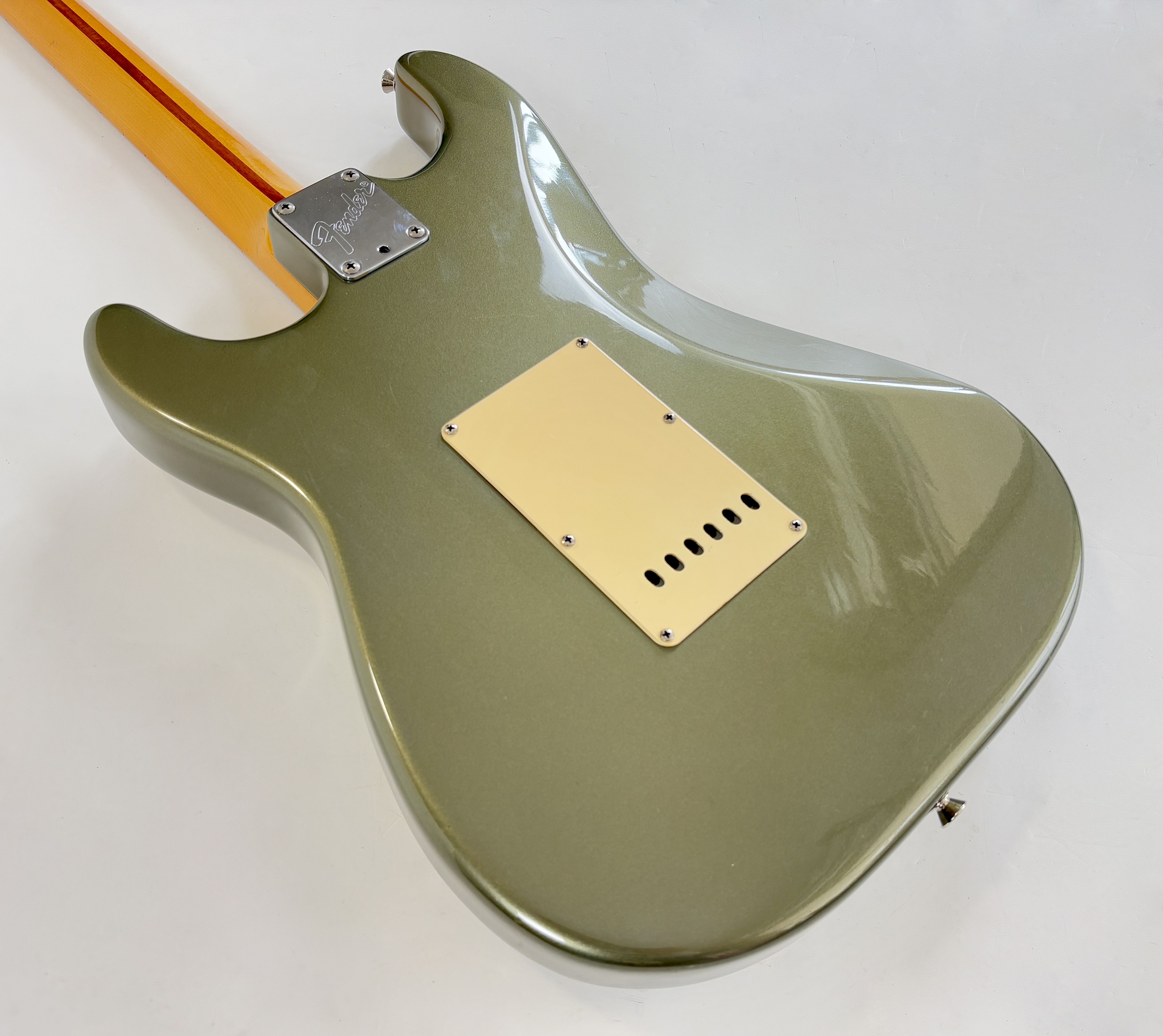 D’abord équipée de Lace Sensor, la série passe en Vintage Noiseless à partir de 2001. Les deux importantes particularités du modèle sont : un manche en soft V ainsi qu’un boost actif utilisable via le second potentiomètre de tonalité. Celle-ci date de la deuxième année de production : 1989 ! Sa couleur Pewter est fort désirable et typique de la période. Vendue en étui non d’origine.Dépôt-vente, achat, vente, reprise, location.