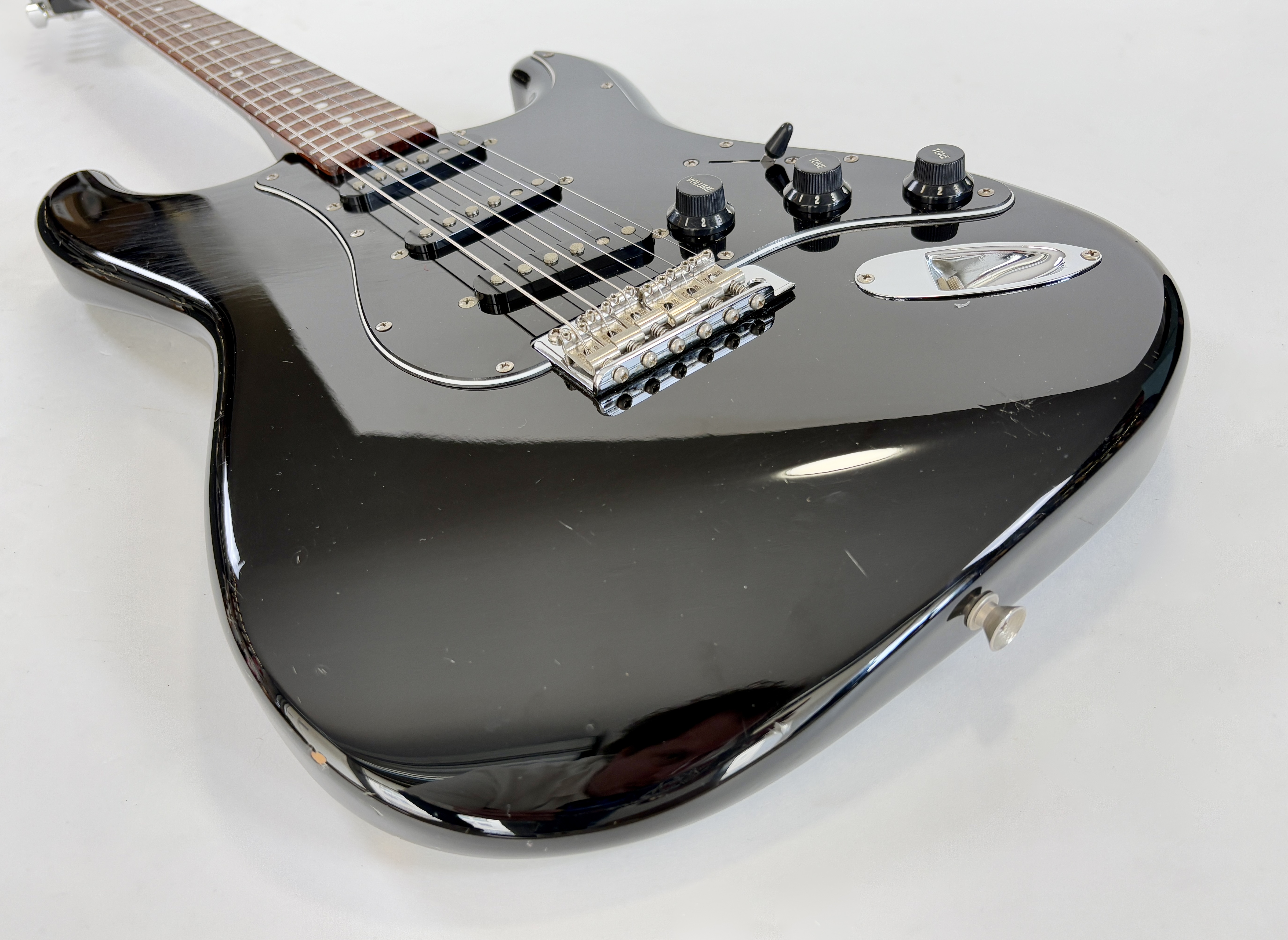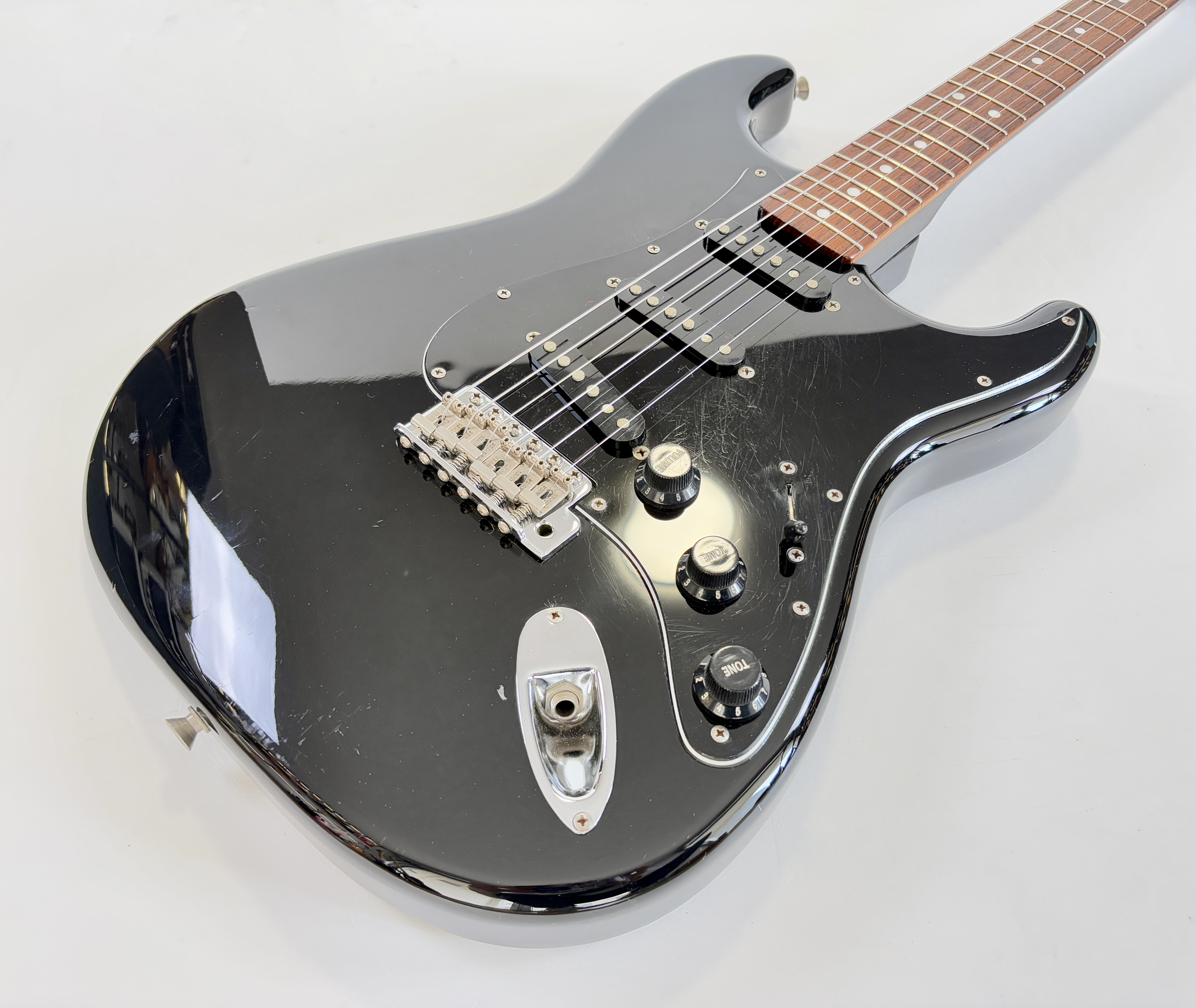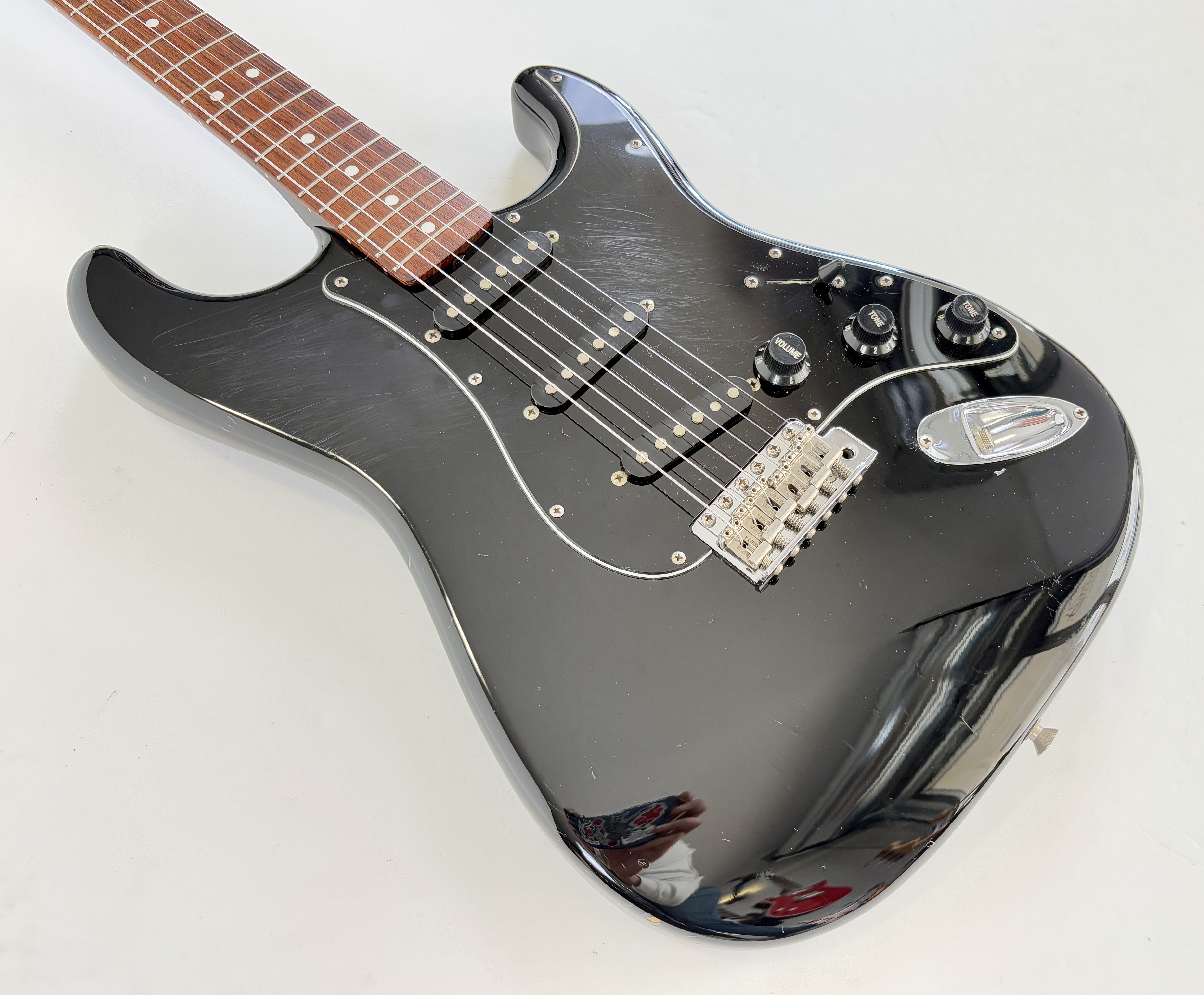 Comme d’habitude on retrouve la qualité de lutherie et l’assemblage sans faille typiquement nippons sur cette Strat faite entre 2006 et 2008. Reproduction de l'année 1962, elle s'offre ici un manche érable, touche palissandre épaisse type slab. Ici le look est full black : corps, pickguard et même le manche sont couleur noire ! Avec comme touche finale la tête assortie, dite matching headstock.Dépôt-vente, achat, vente, reprise, location.