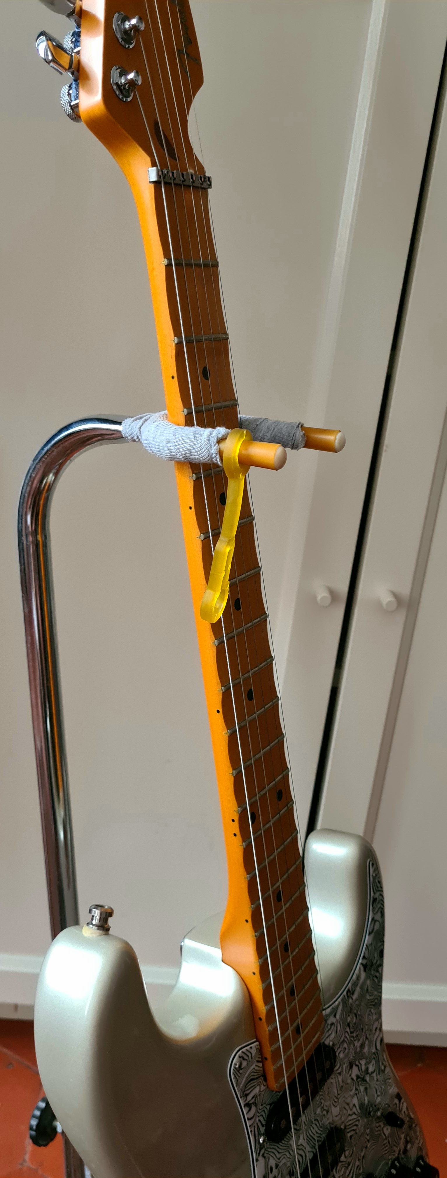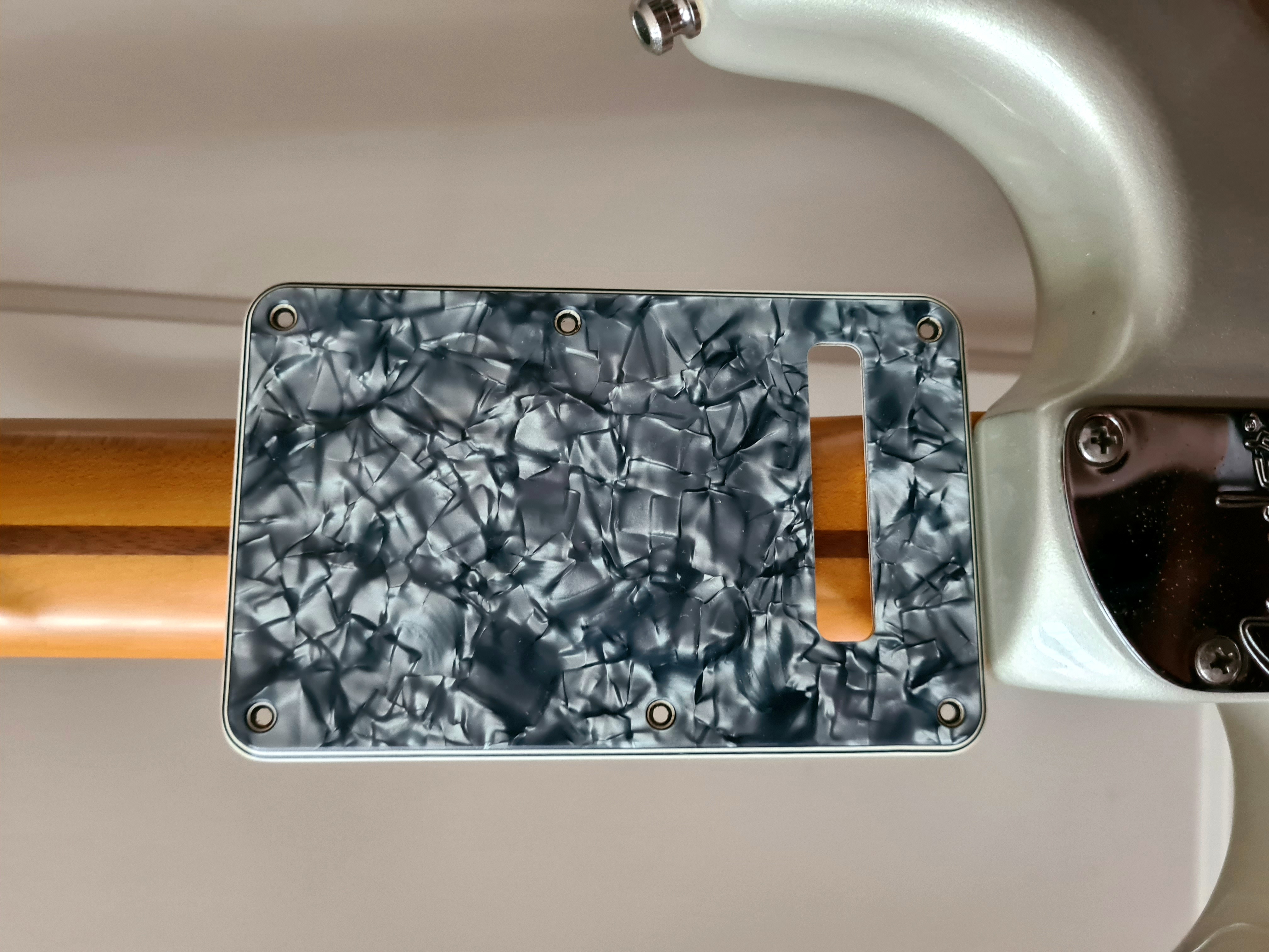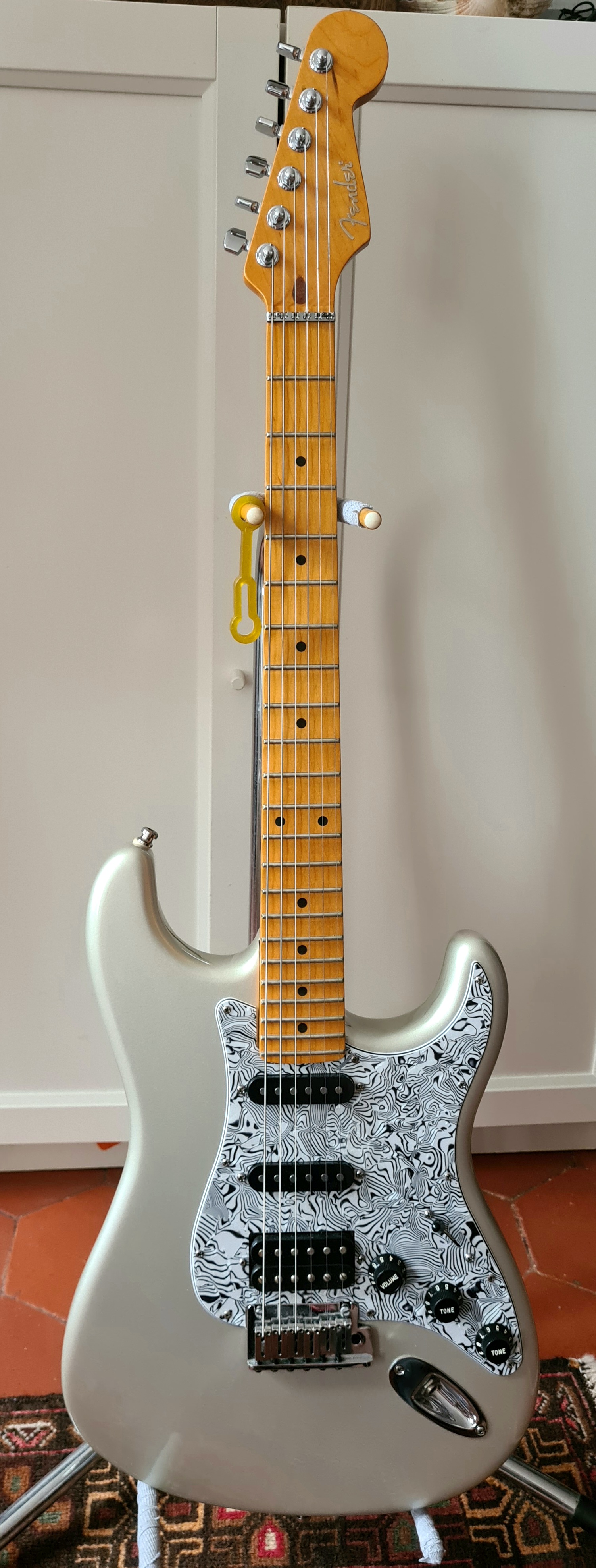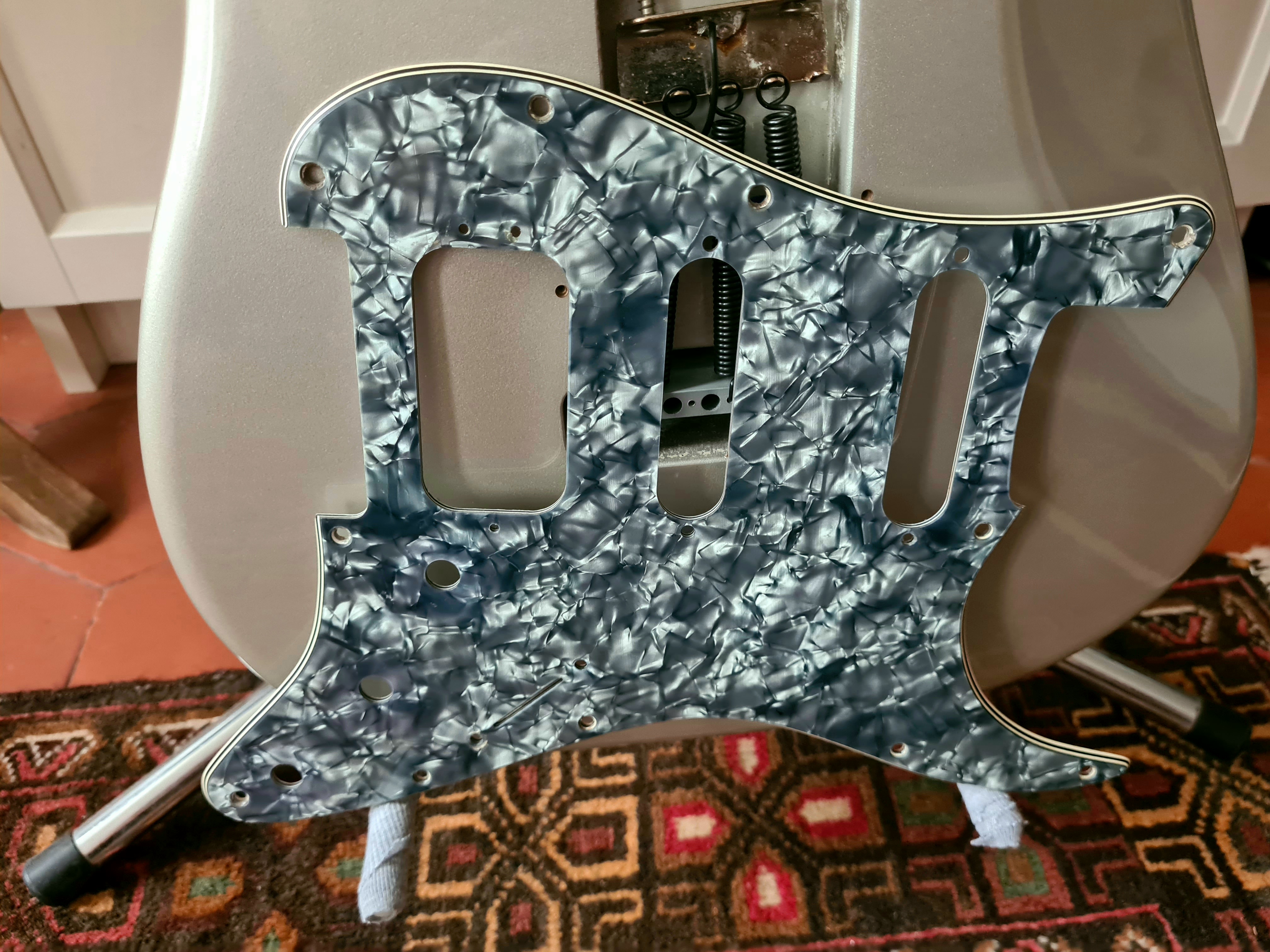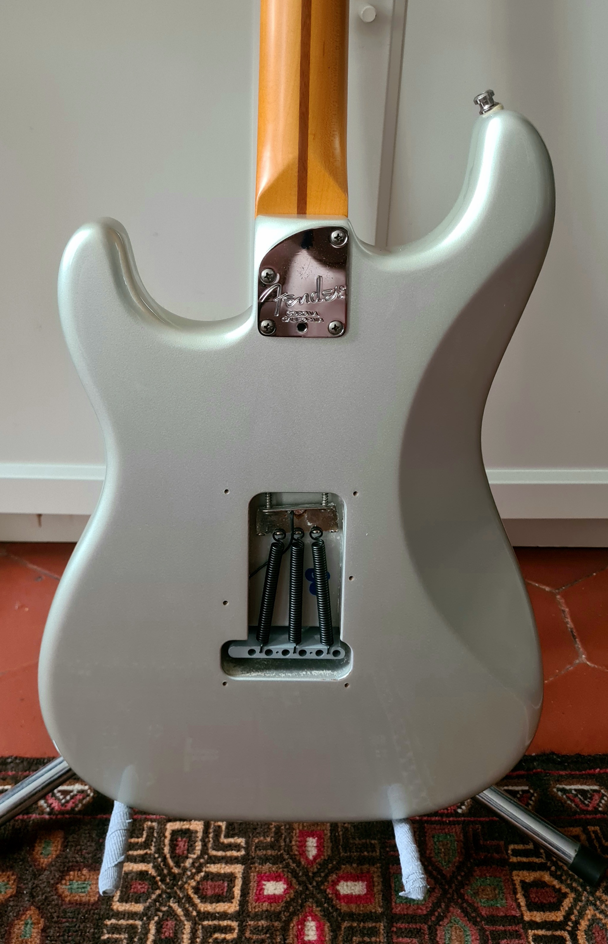 Corps en frêne des marais, les simples sont des noiseless SCN, moins froids que les N3 de mon autre Strat US, le double Fender semble être l'équivalent du Pearly Gates chez Gibson, très chantant.J'ai acheté le corps nu et j'ai fait monter un manche scallopé érable une pièce All Parts par mon luthier ainsi que des mécaniques Schaeller à blocage et un sillet à rouleau.