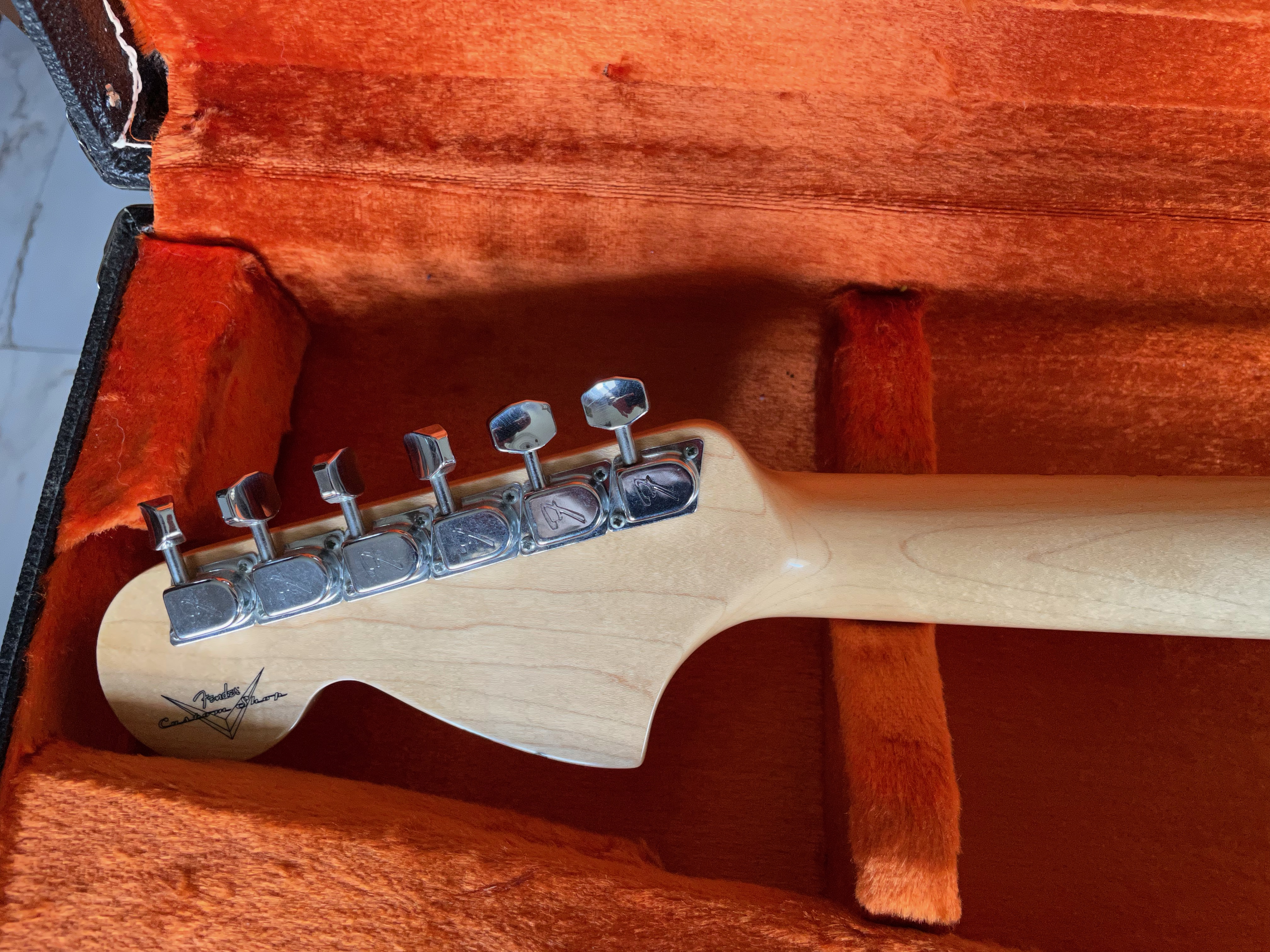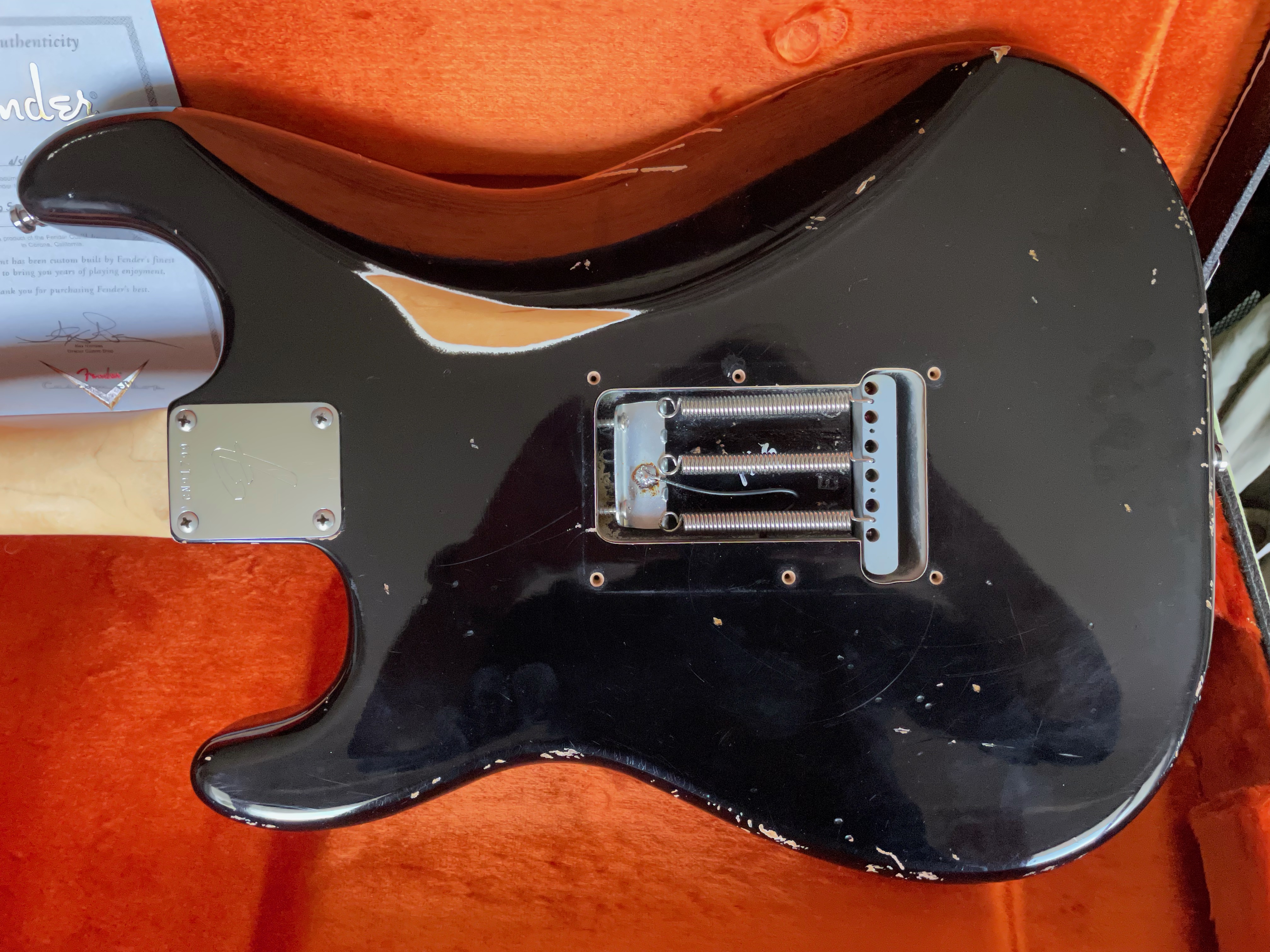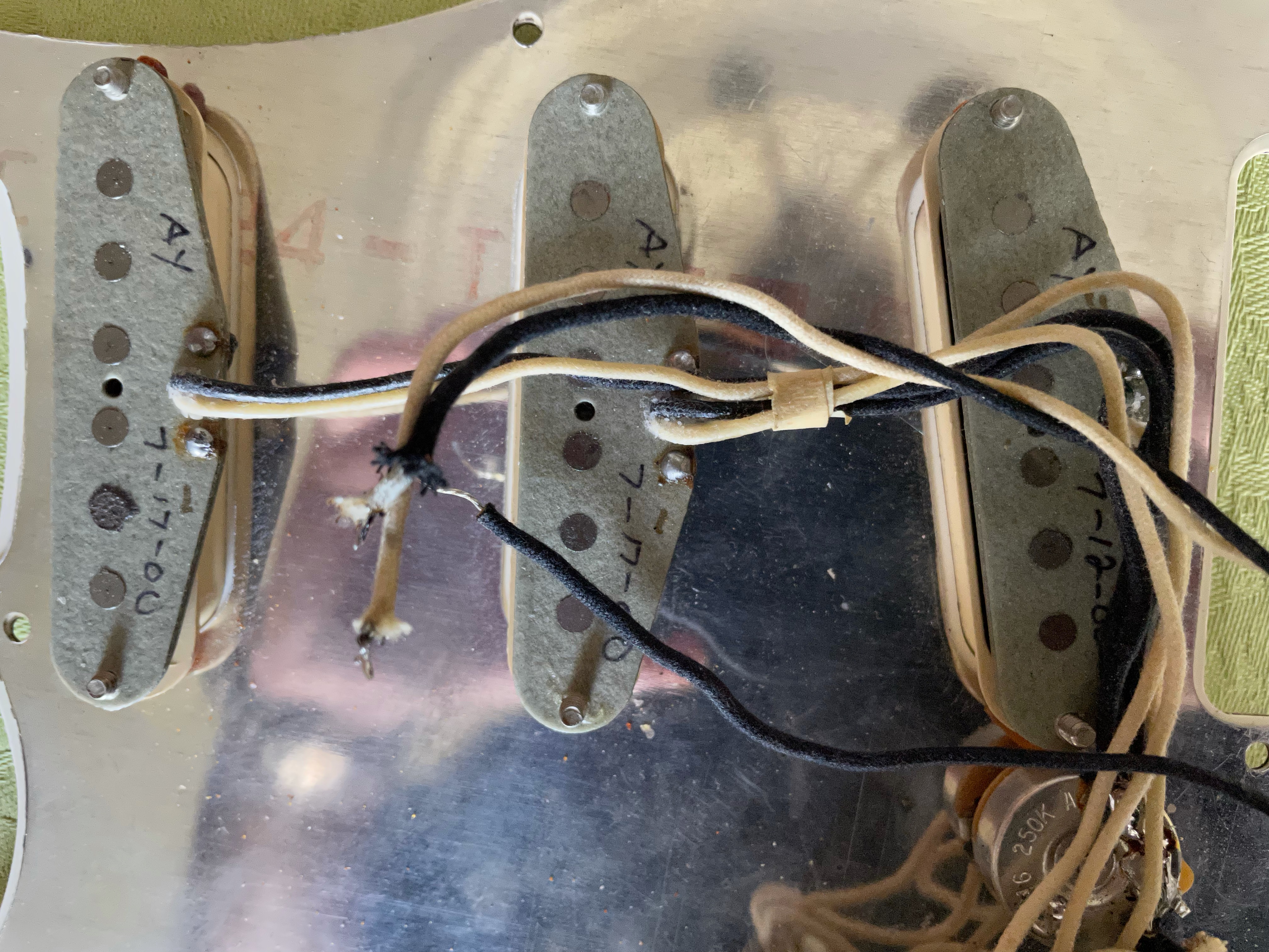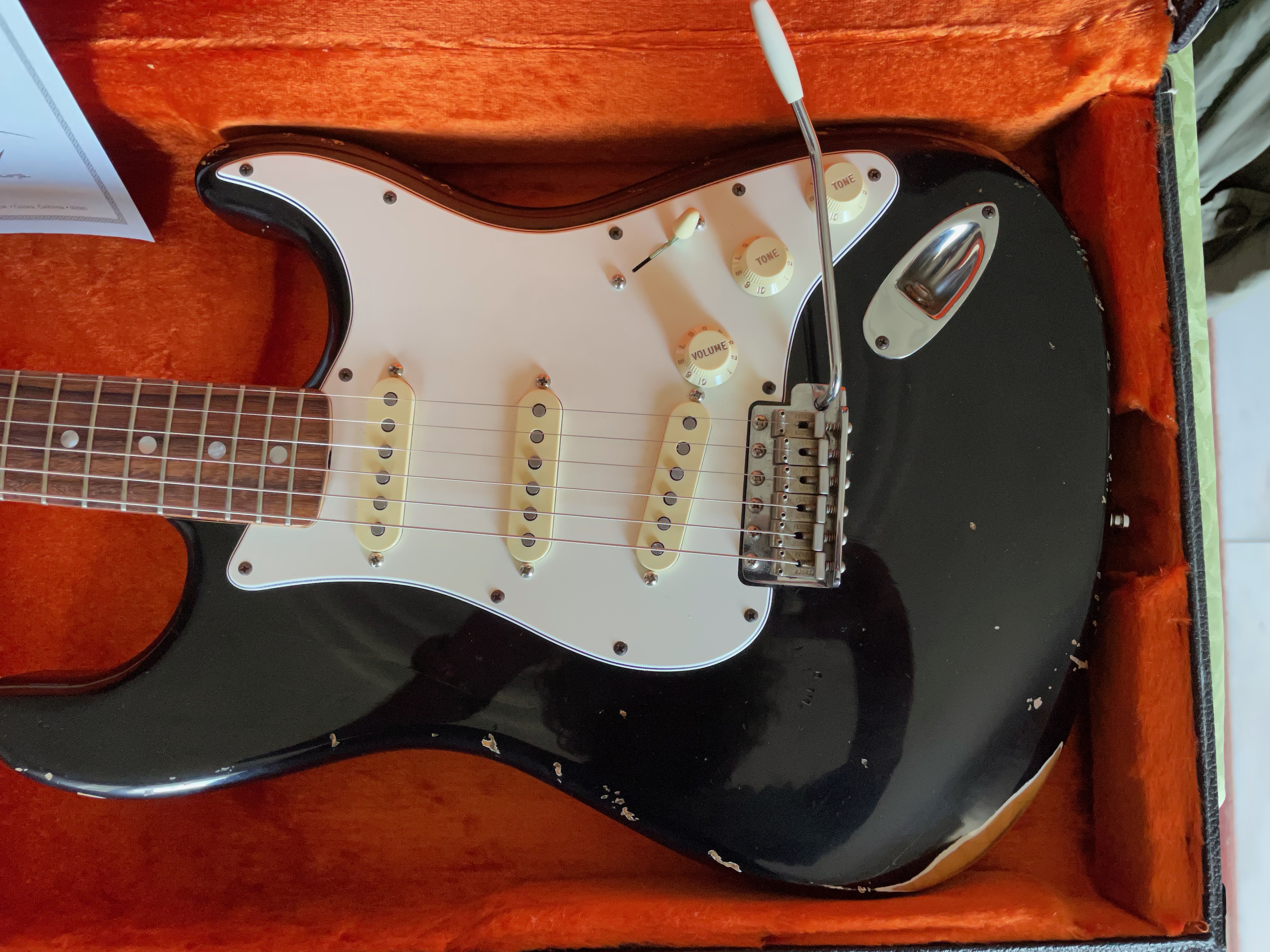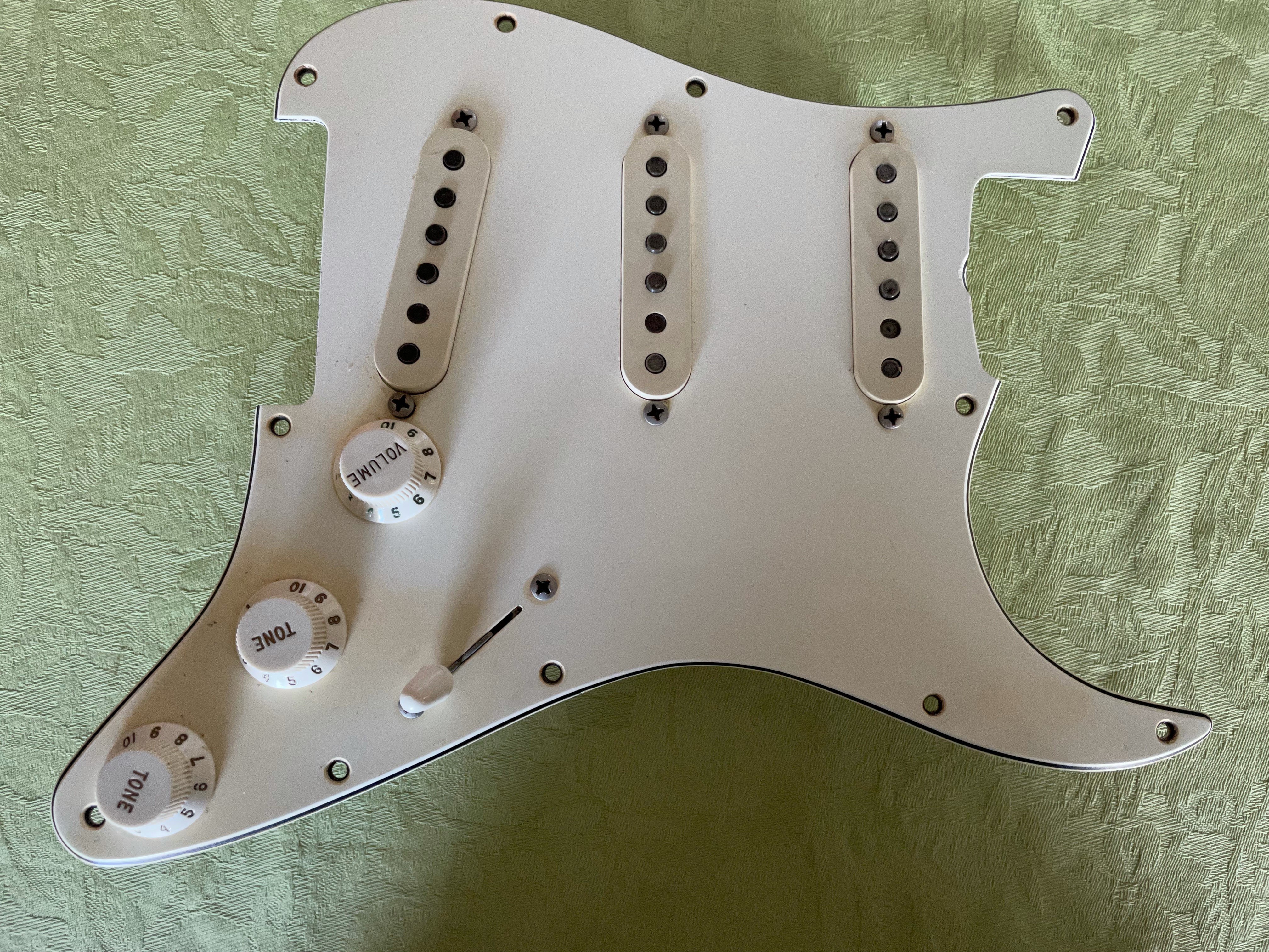 À noter que j’avais un temps monté un pickguard équipé de micros Texas Special, les photos ont été prises avec celui-ci. Le pickguard et les micros d’origine (en photo également) ont été remontés depuis.