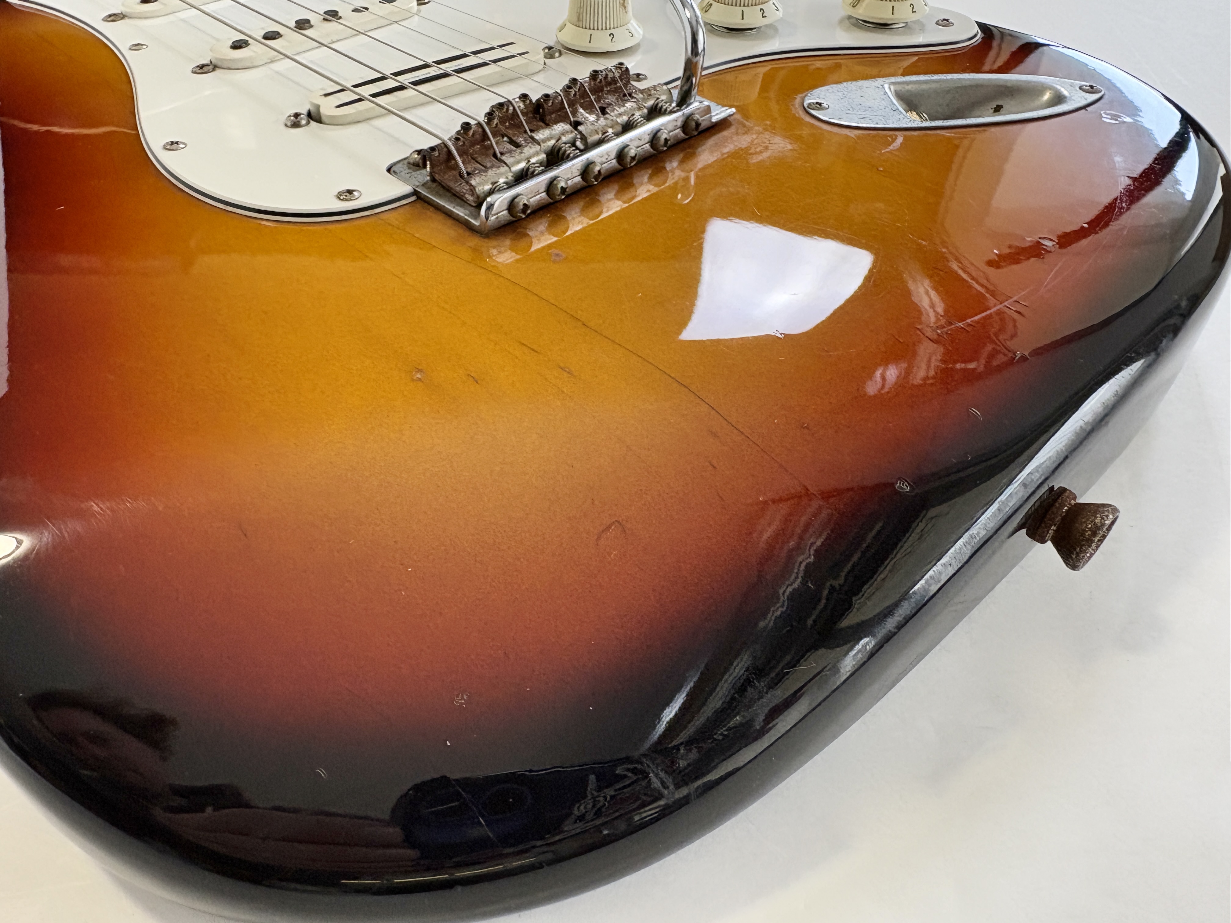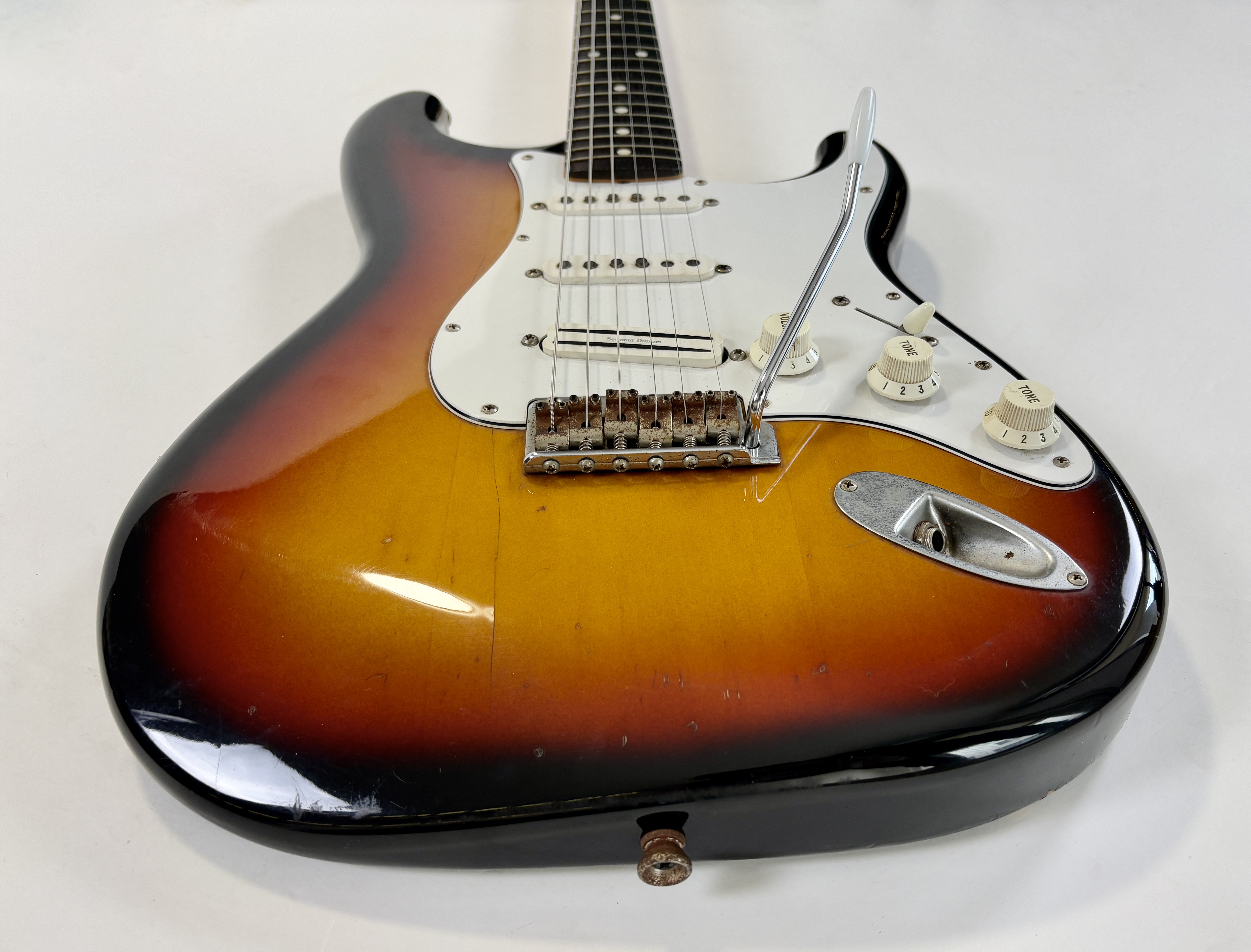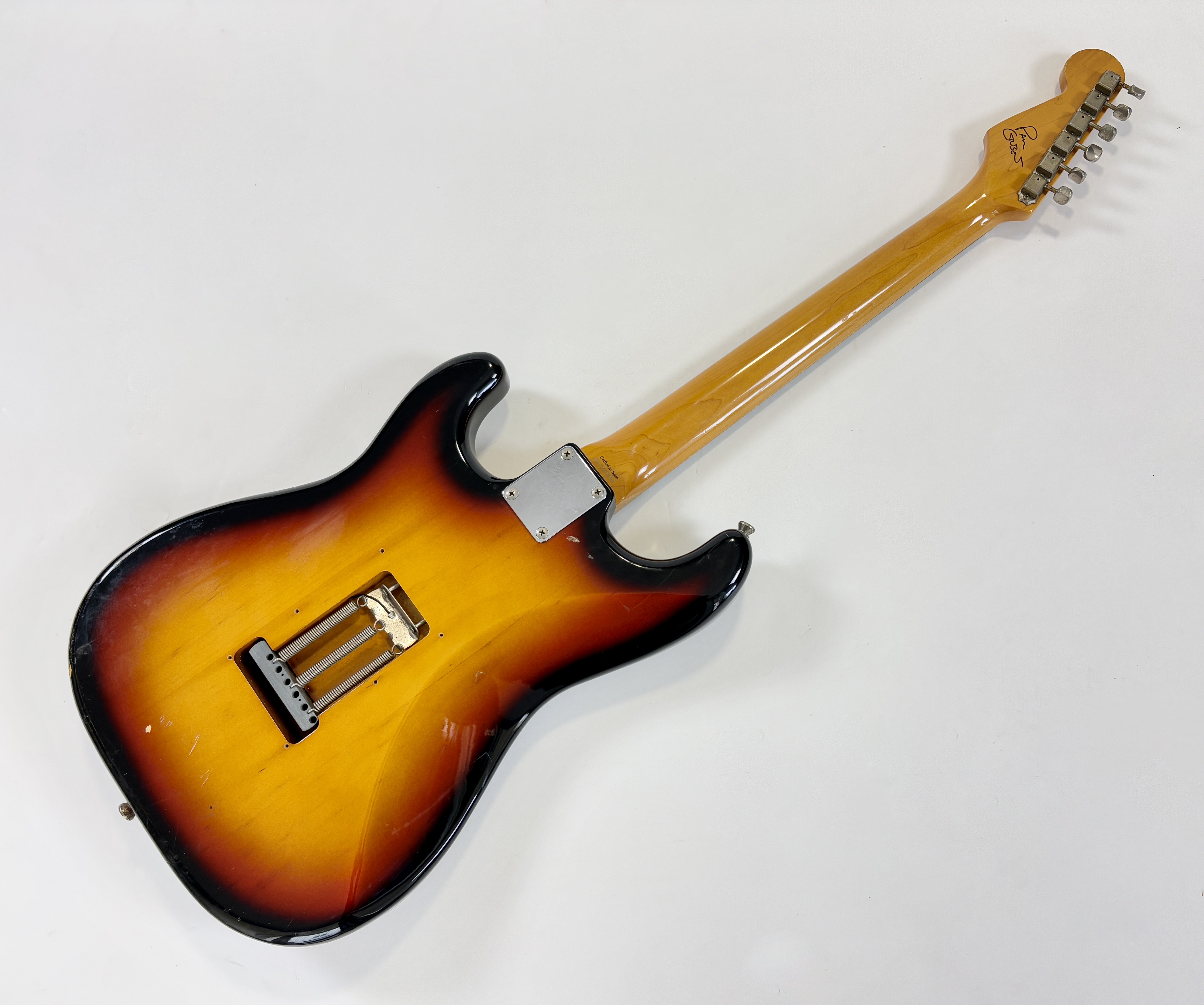 Comme d’habitude on retrouve la qualité de lutherie et l’assemblage sans faille typiquement nippons sur cette Strat faite entre 2004 et 2005. Les micros ont ici le bon goût d'être des Fender, made in USA, black bottom avec en chevalet un Seymour Duncan double format simple : SHR-1B, Hot Rails. Par la même occasion, les potentiomètres sont changés ici par des CTS. Reproduction de l'année 1962, elle s'offre ici un manche érable, touche palissandre épaisse type slab. Le dos de la tête a été signé par Paul Gilbert.Dépôt-vente, achat, vente, reprise, location.