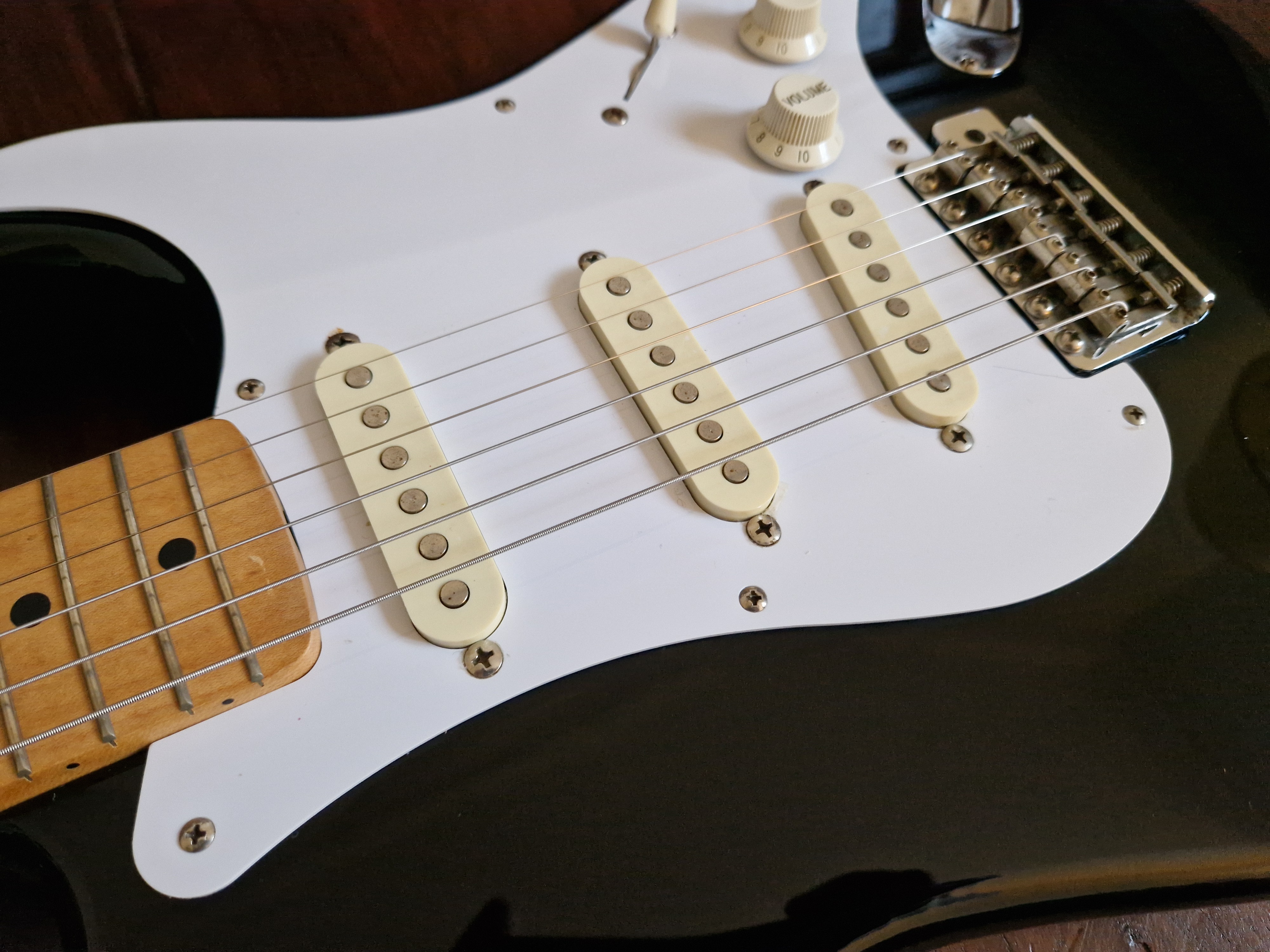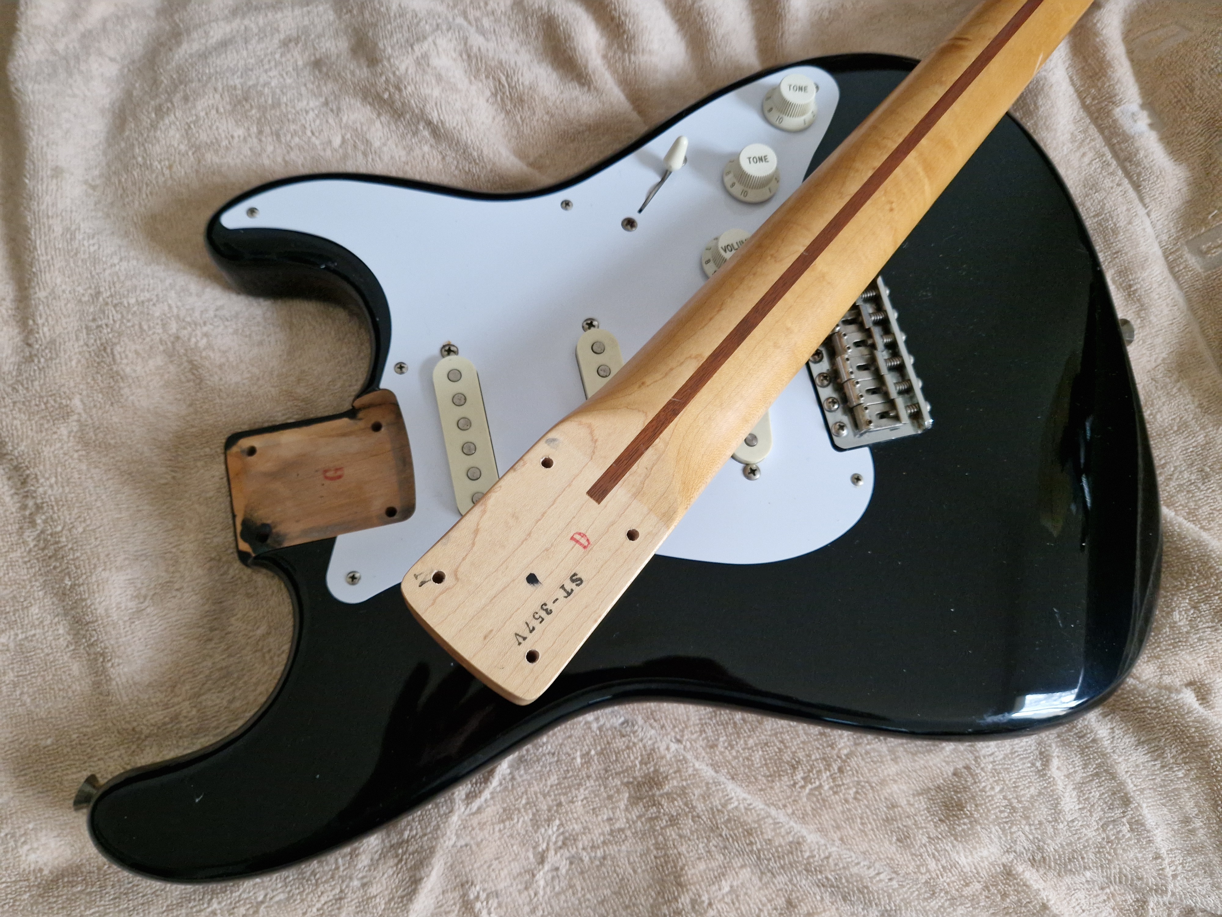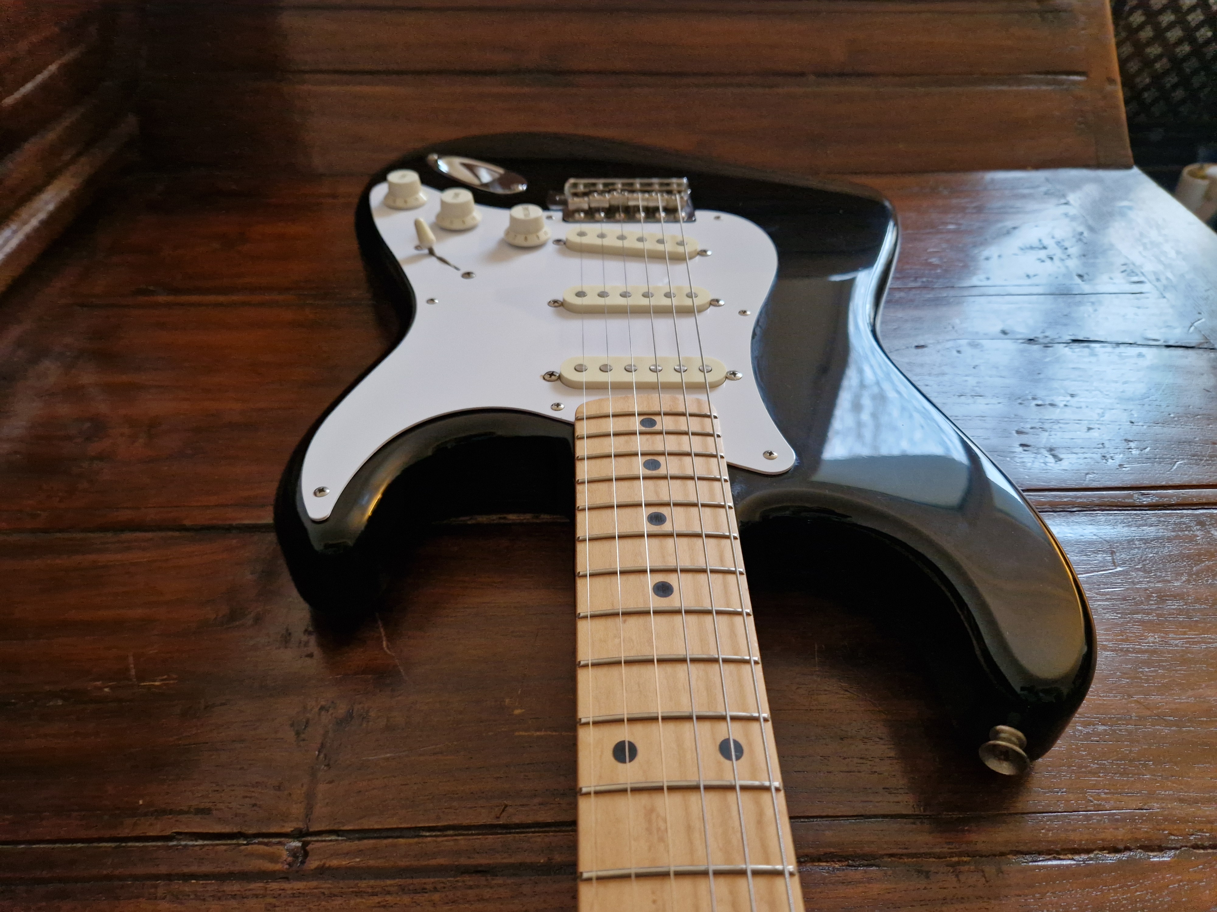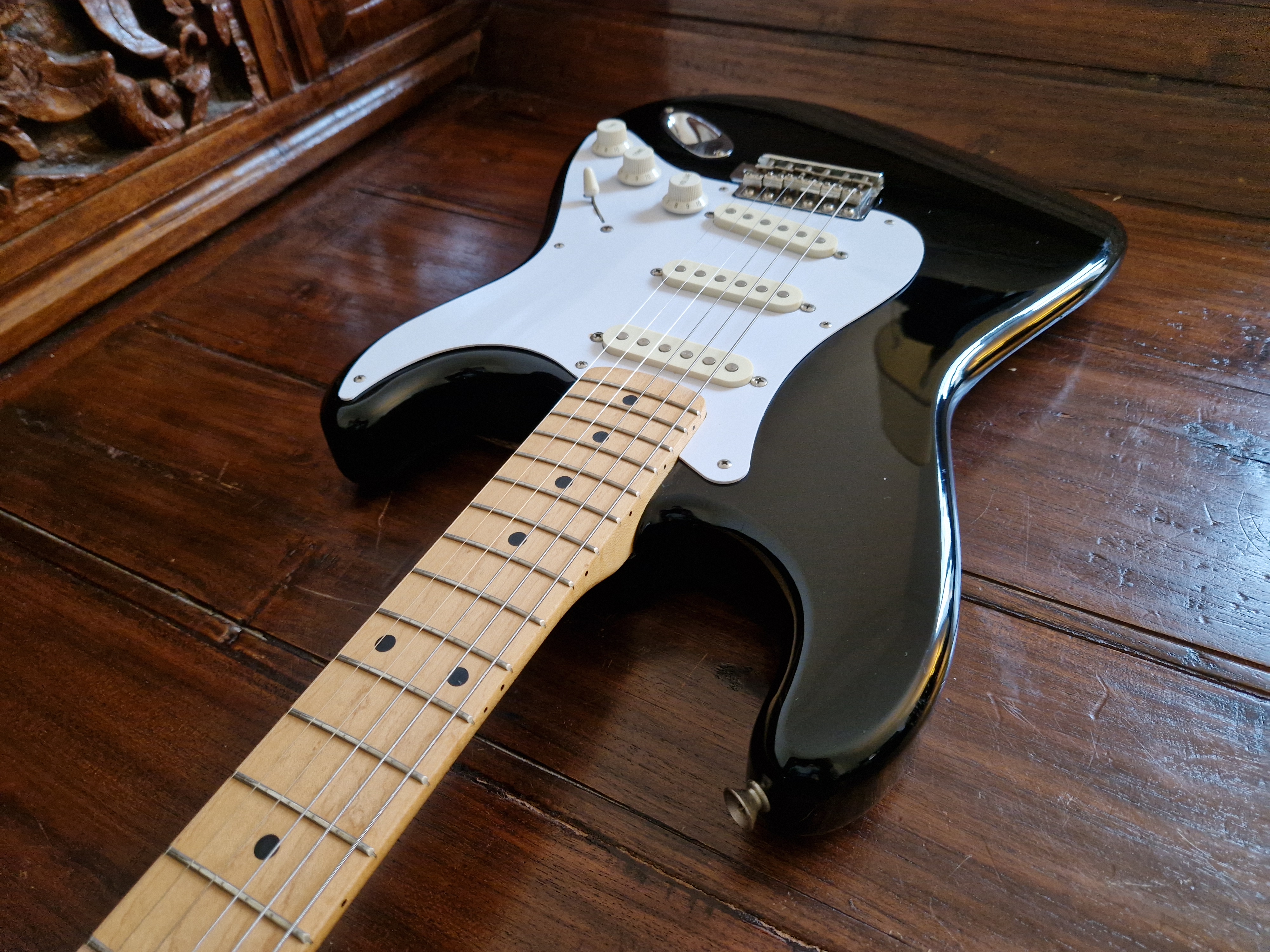 Je me sépare de ma Stratocaster Made In Japan ST357V de 1988 (numé de série en H) en finition BlackieIl s'agit d'une réédition Japonaise de la Stratocaster de 1957.
