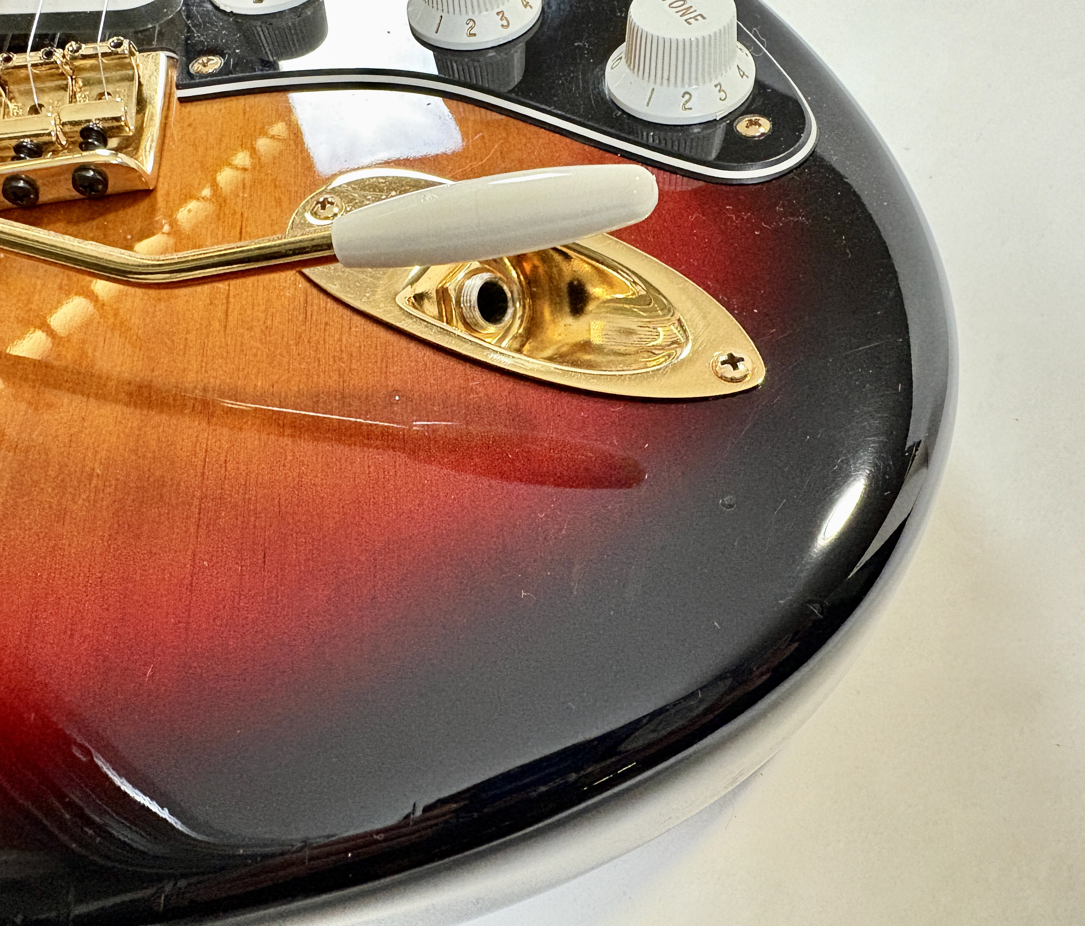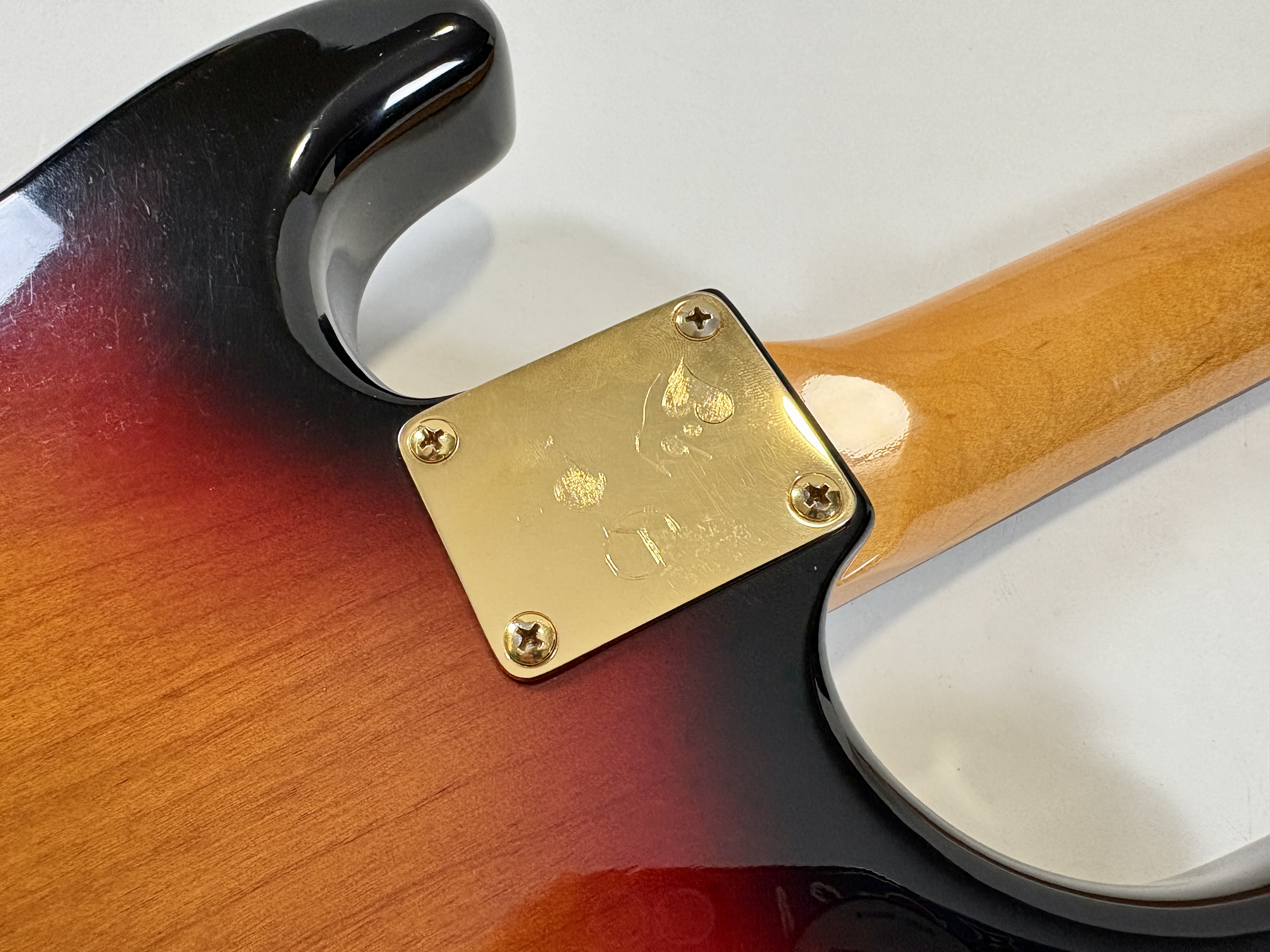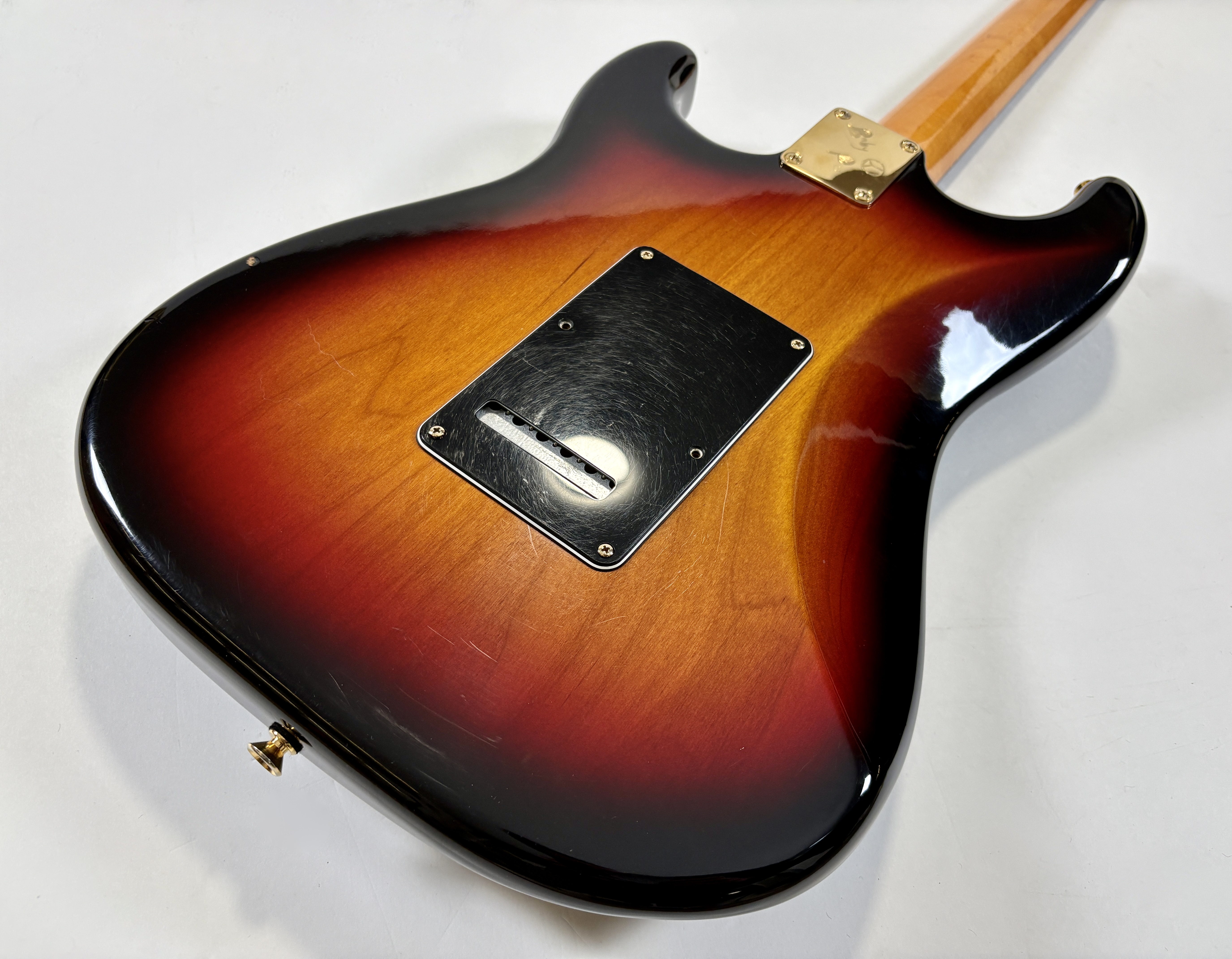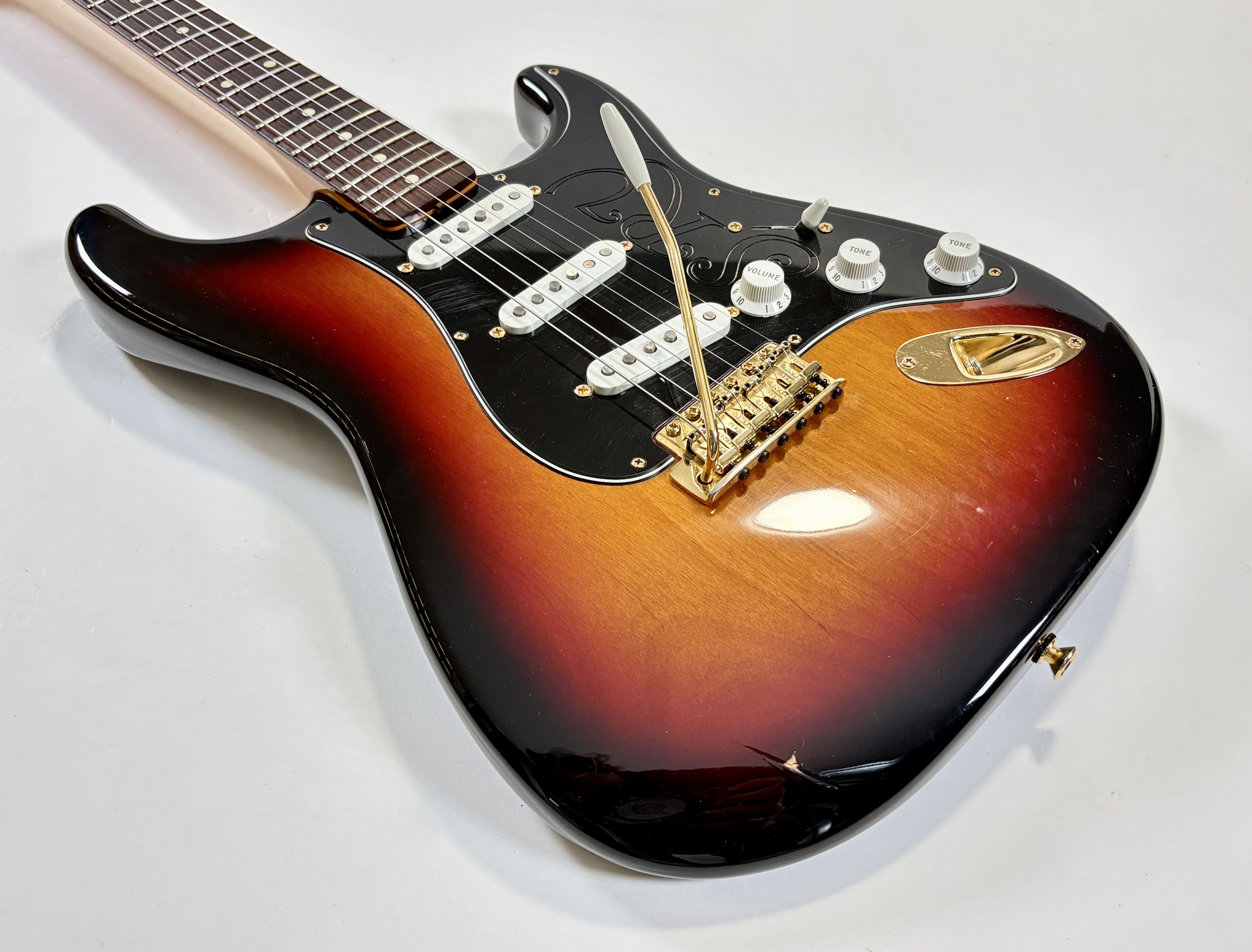 Equipée d’un set de micros Texas Special, la signature SRV envoie la sauce ! On notera également sur le modèle le bras de vibrato inversé ainsi que le pickguard personnalisé. Le corps est en aulne, le manche en érable assez épais s'offre une touche au radius de 7,25 pouces. Vendue dans son étui tweed d'origine.Location, achat, vente, reprise, dépôt-vente.