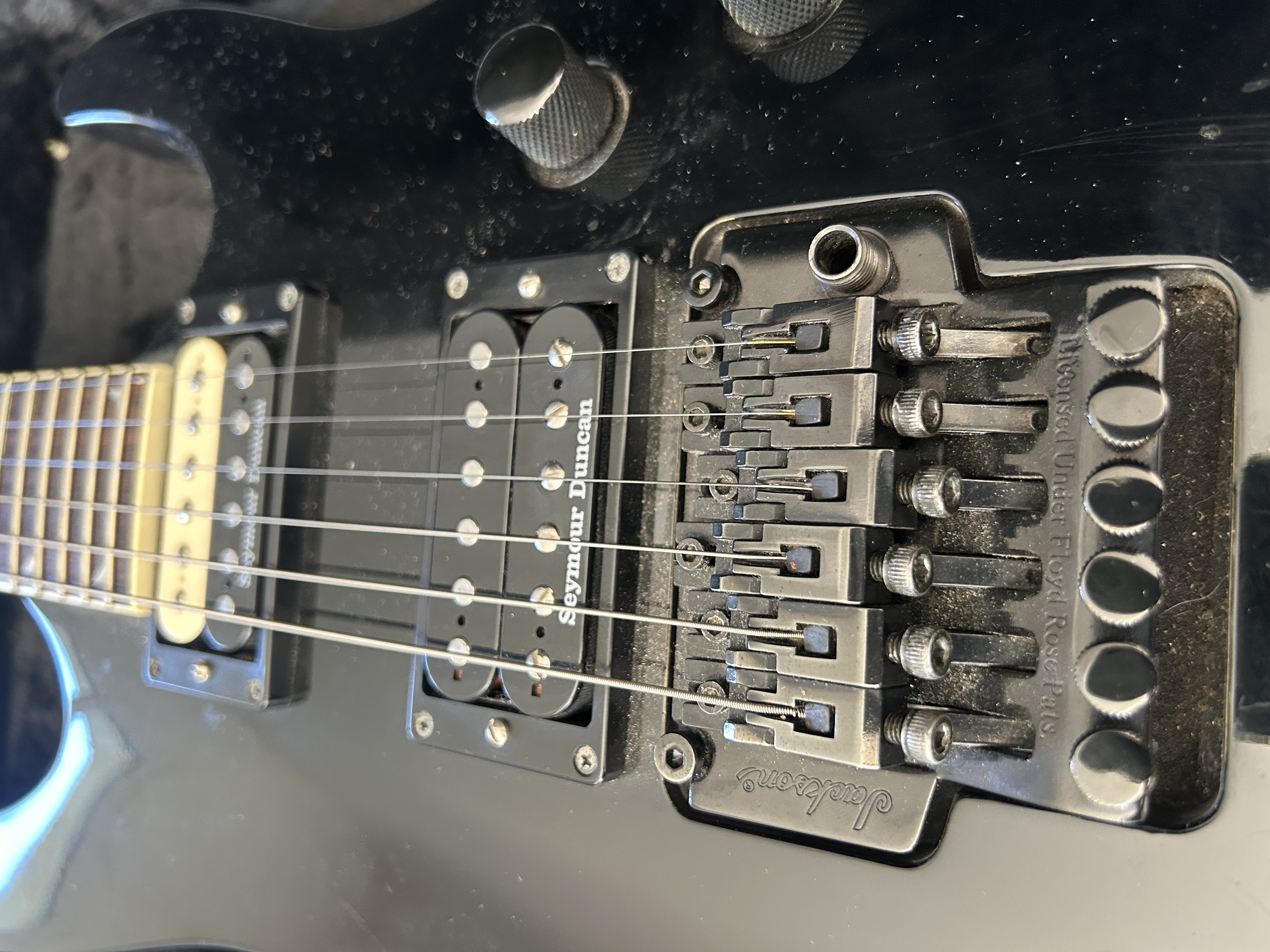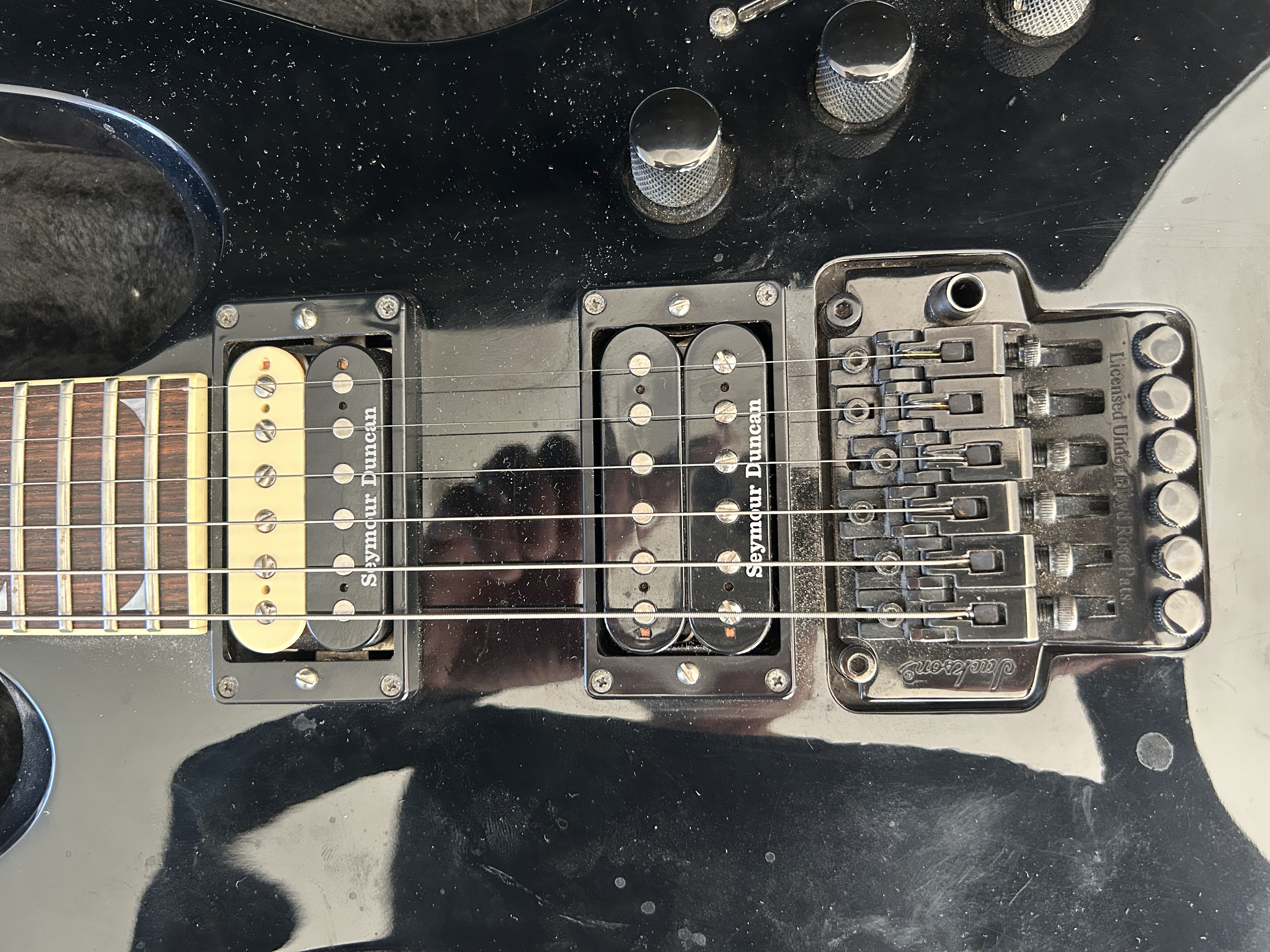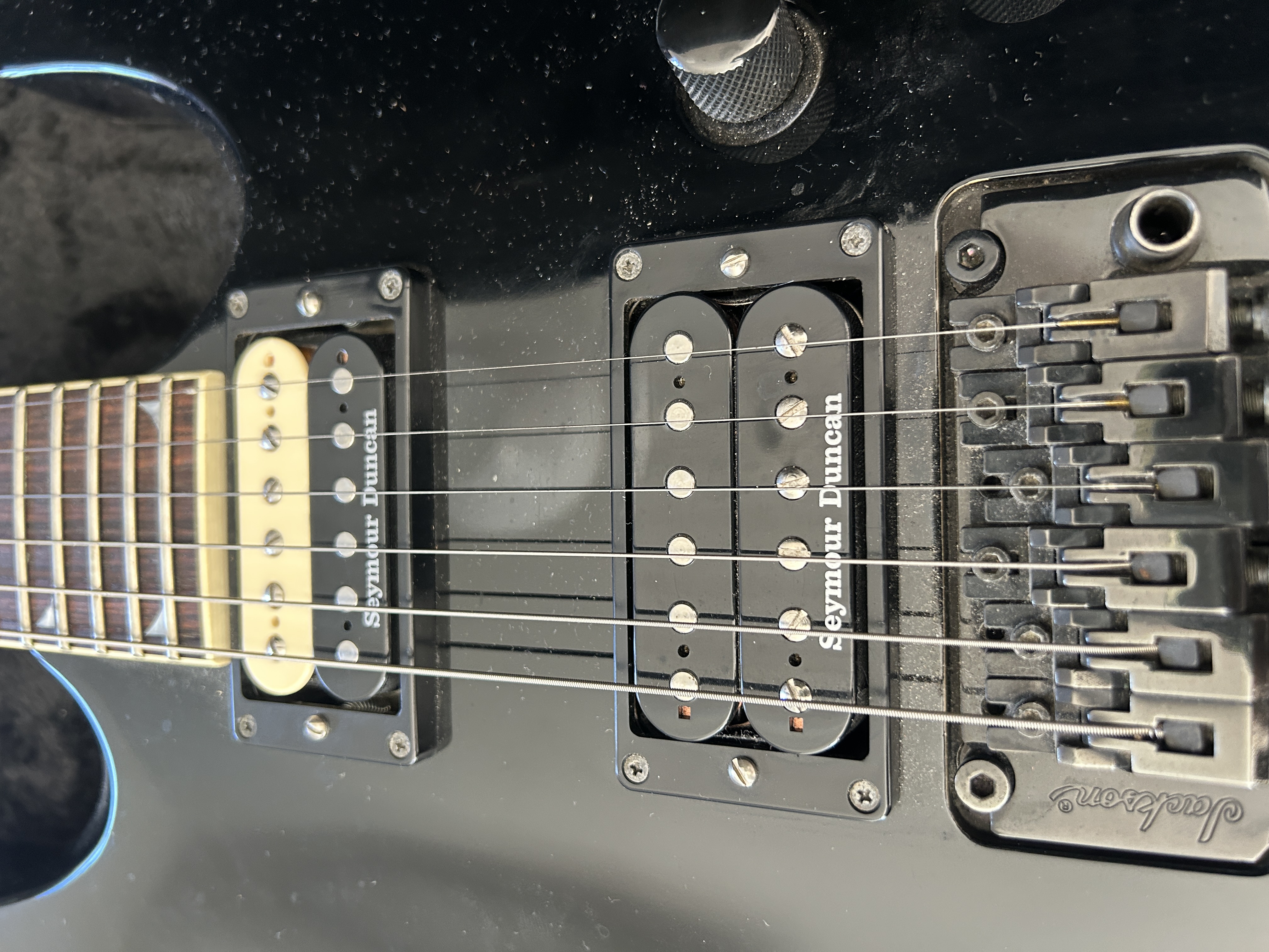 Je l'ai faite modifiée avec 2 micros SEYMOUR DUNCAN - Jazz Model en chevalet équipé d'un potard split et un Custom trembucker en manche. Les ancien micros et le boost d'origine sont conservés et vendus avec.