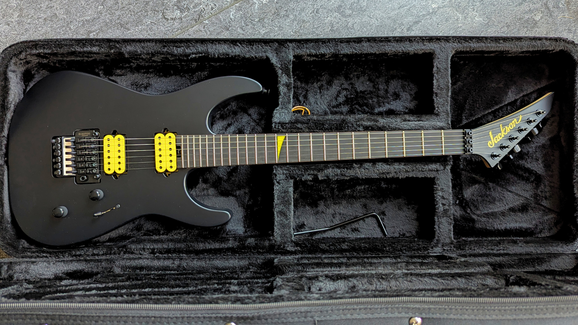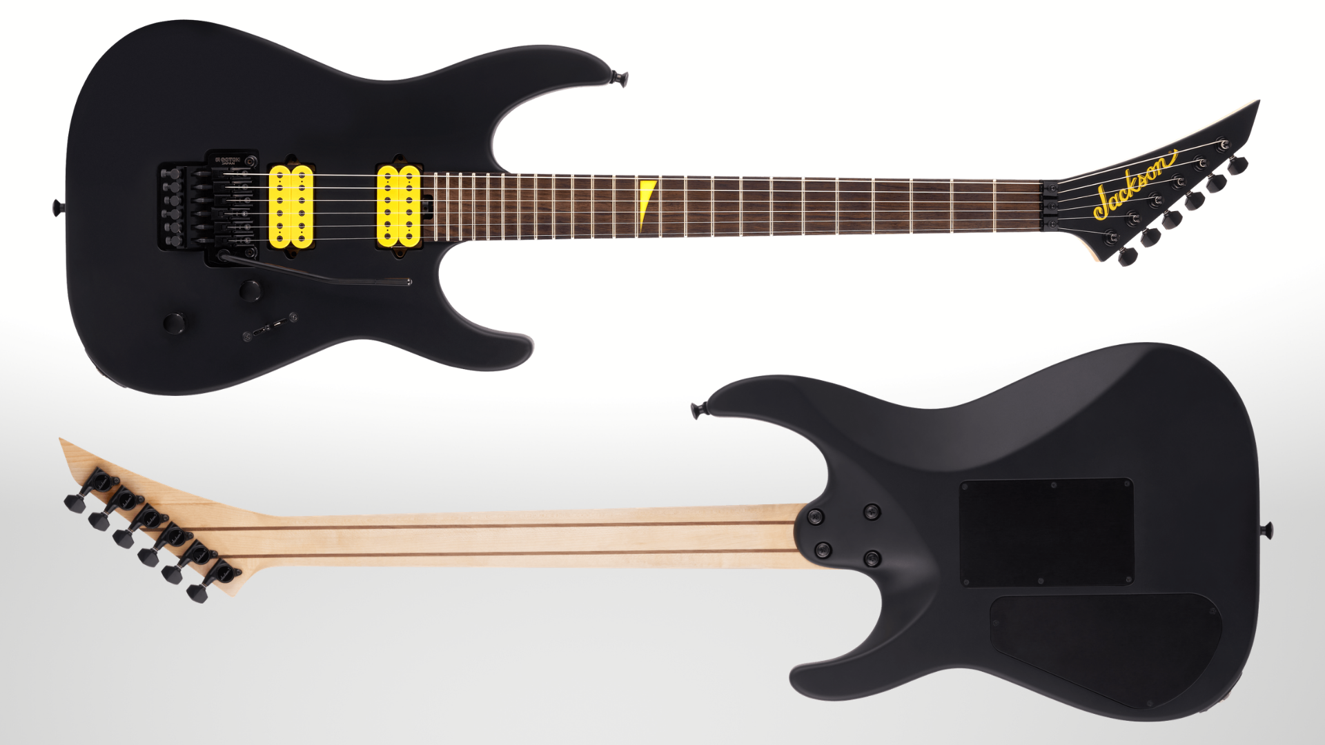 - Disponible en finition Matte Black Ash avec tête Jackson « reverse » assortie à la forme pointue et 6 mécaniques alignées, filet blanc le long du corps et de la tête, et accastillage noir