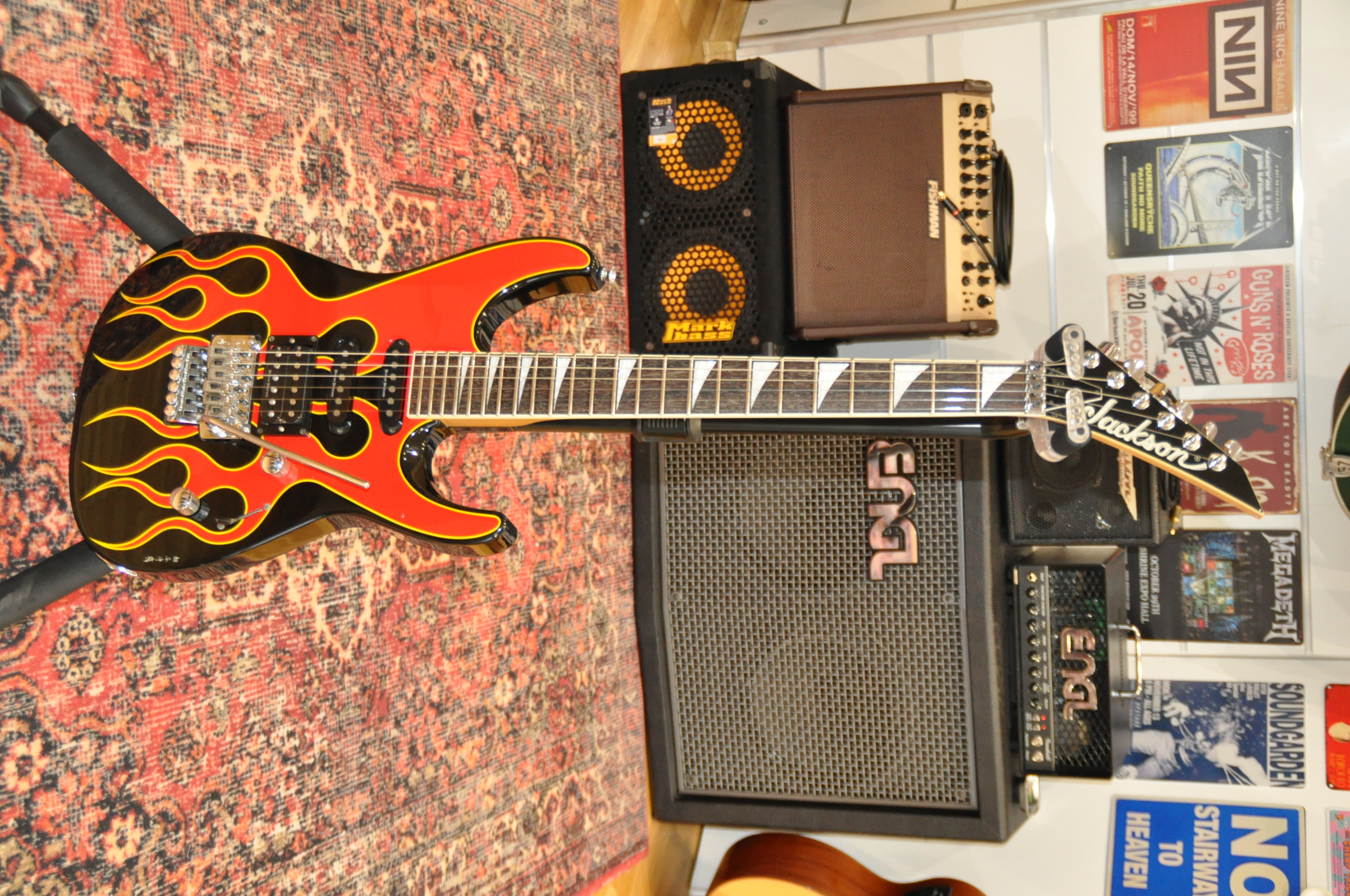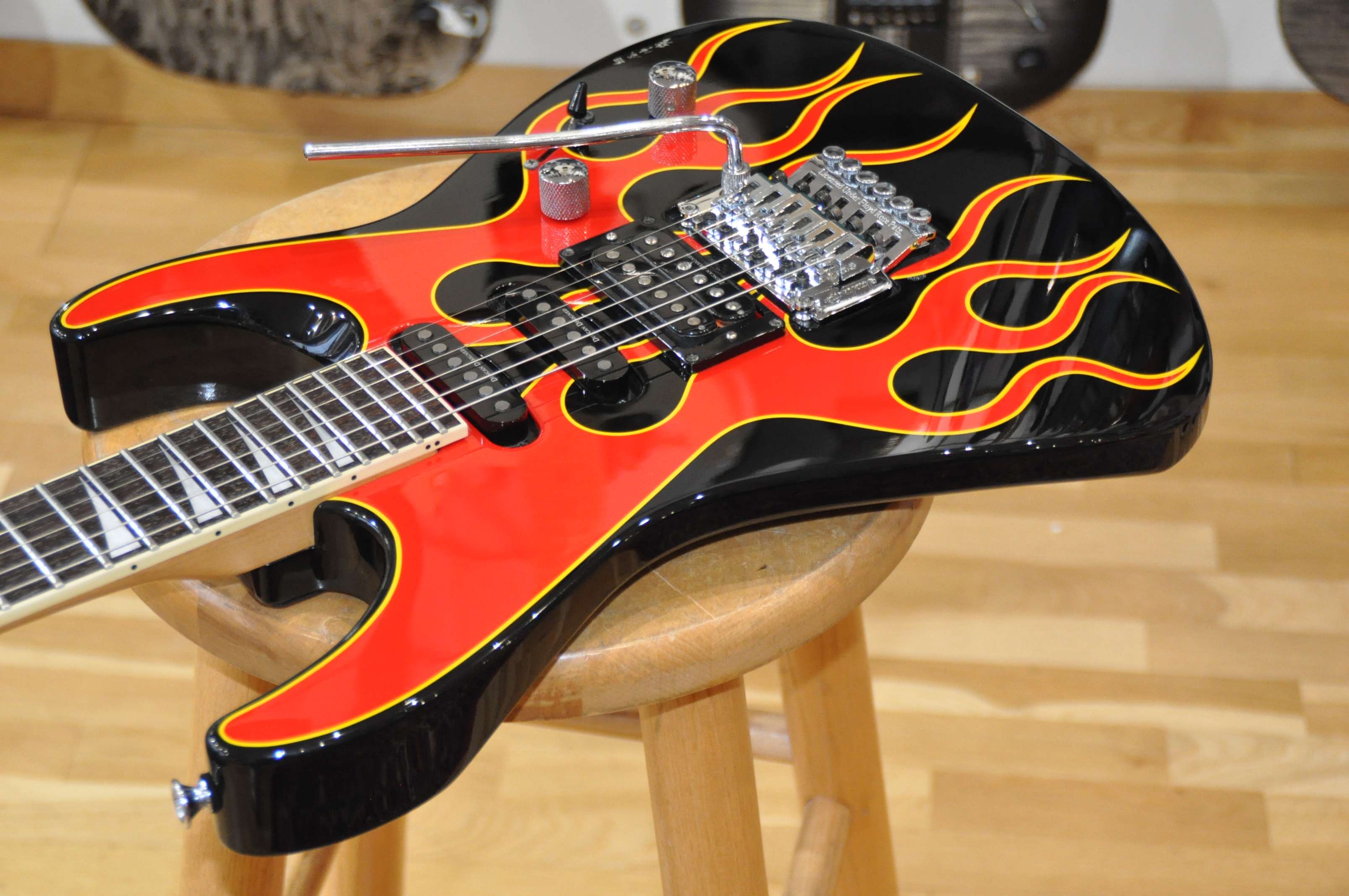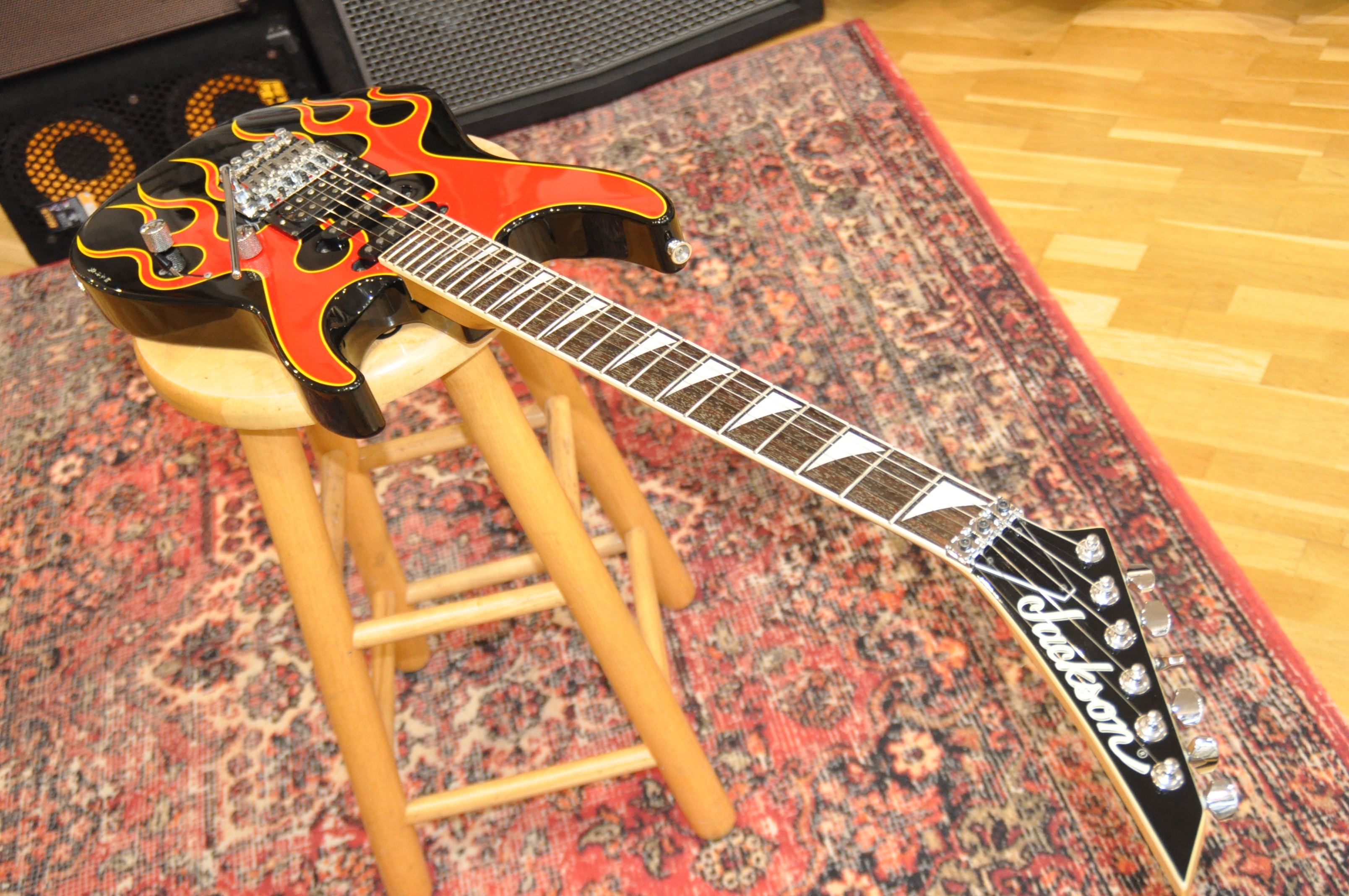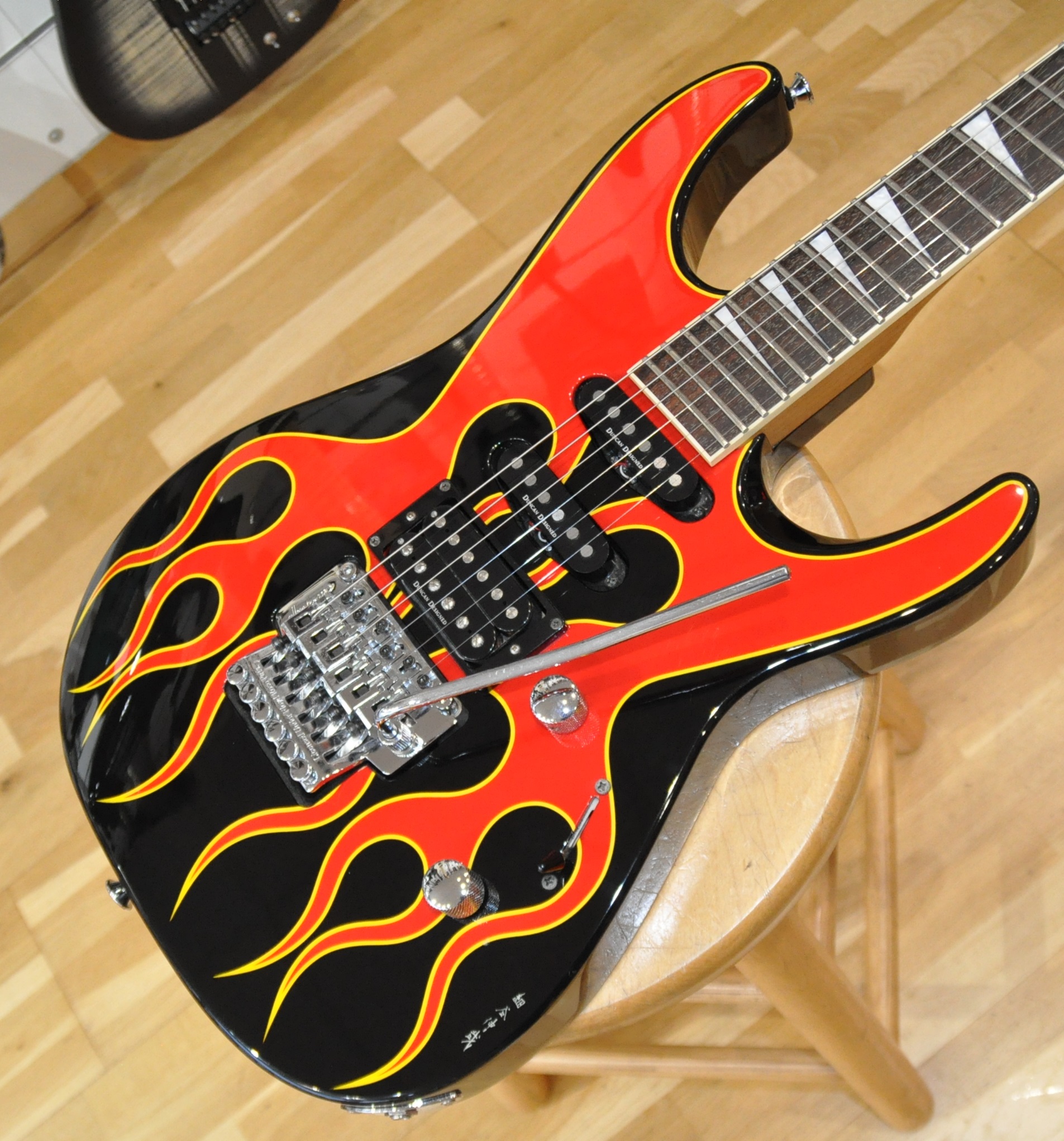 La finition Hot Rod Flames est au cœur de cette identité. Réalisée à la main par Shinya Hosoya, artiste reconnu pour son travail graphique au sein des ateliers japonais de Jackson, elle dépasse largement le simple décor. Les flammes ont une profondeur, un mouvement et une précision qui témoignent d’un vrai savoir-faire artistique, loin des finitions industrielles standardisées. Chaque exemplaire possède ainsi sa propre personnalité, et la présence de l’artiste derrière le visuel confère à cette guitare une dimension presque artisanale, aujourd’hui de plus en plus recherchée par les passionnés et collectionneurs.