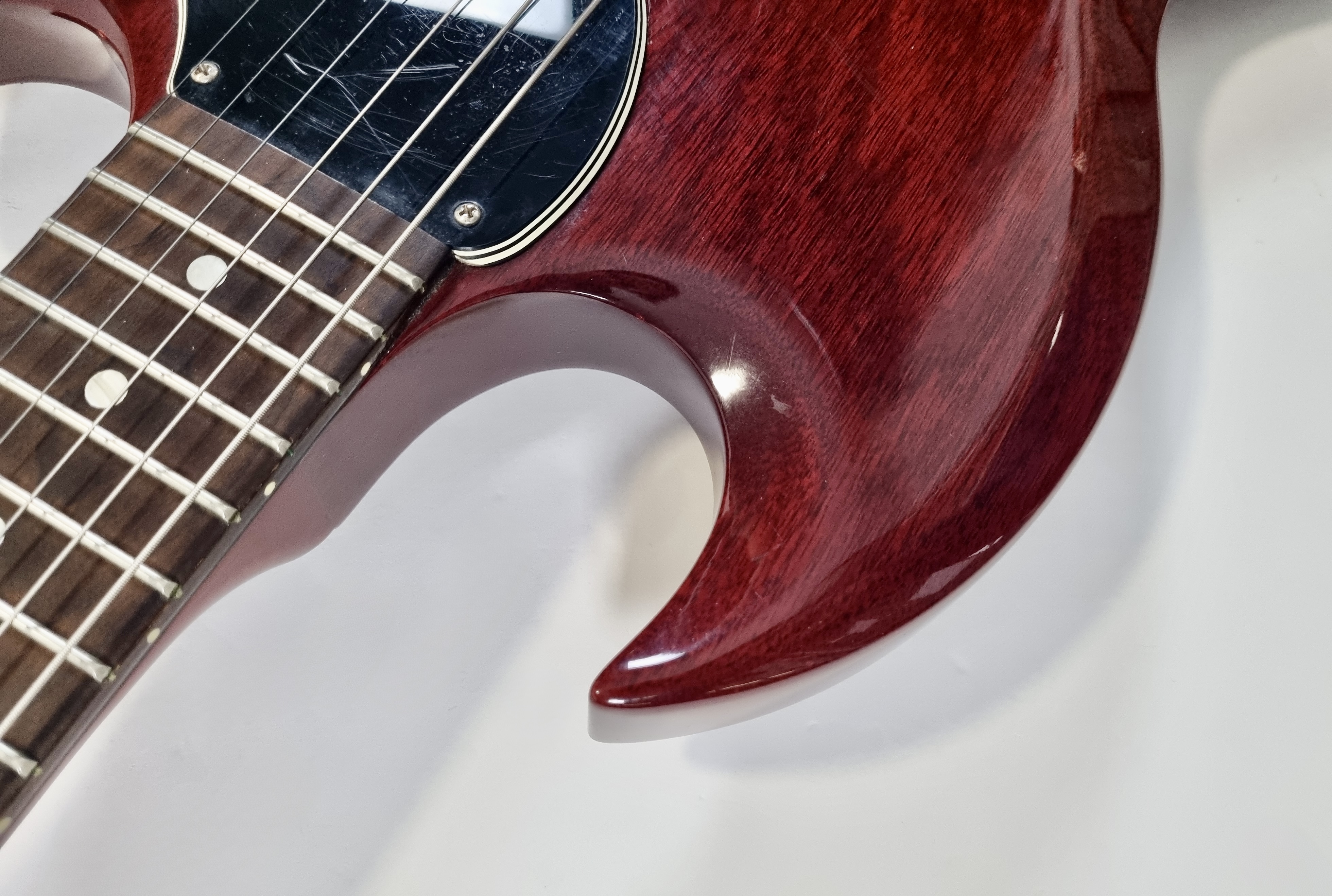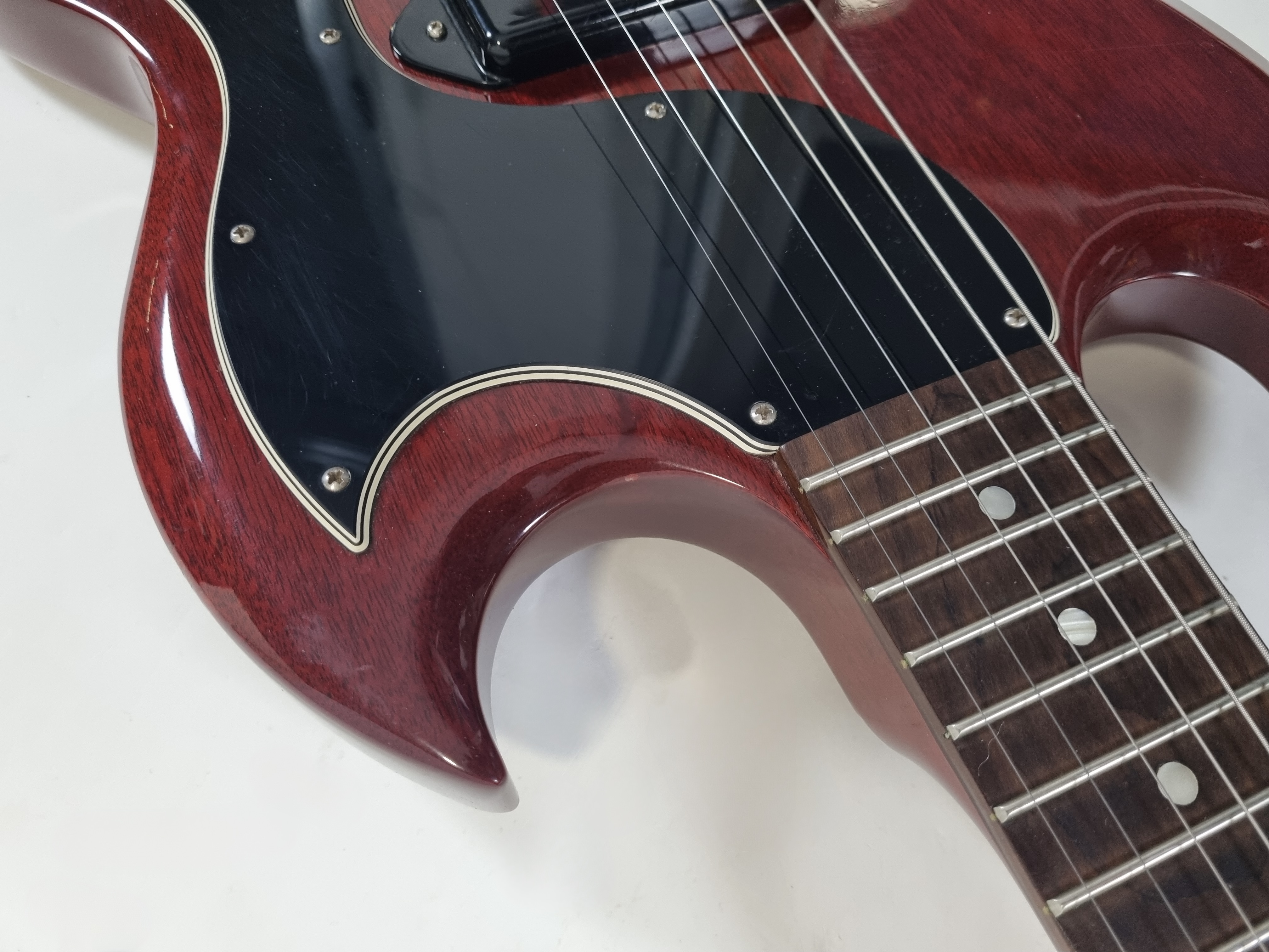 En 1961, lorsque la Les Paul change de forme pour devenir la SG, la Junior fait de même. Cette Junior de 2011 adopte un look sympa avec sa couleur vintage Cherry et son petit pickguard. Un P90 et deux potentiomètres sont largement suffisants pour en faire une excellente petite machine à riff ! Le wraparound a été remplacé par un modèle avec pontets indépendants.Dépôt-vente, achat, vente, reprise, location.