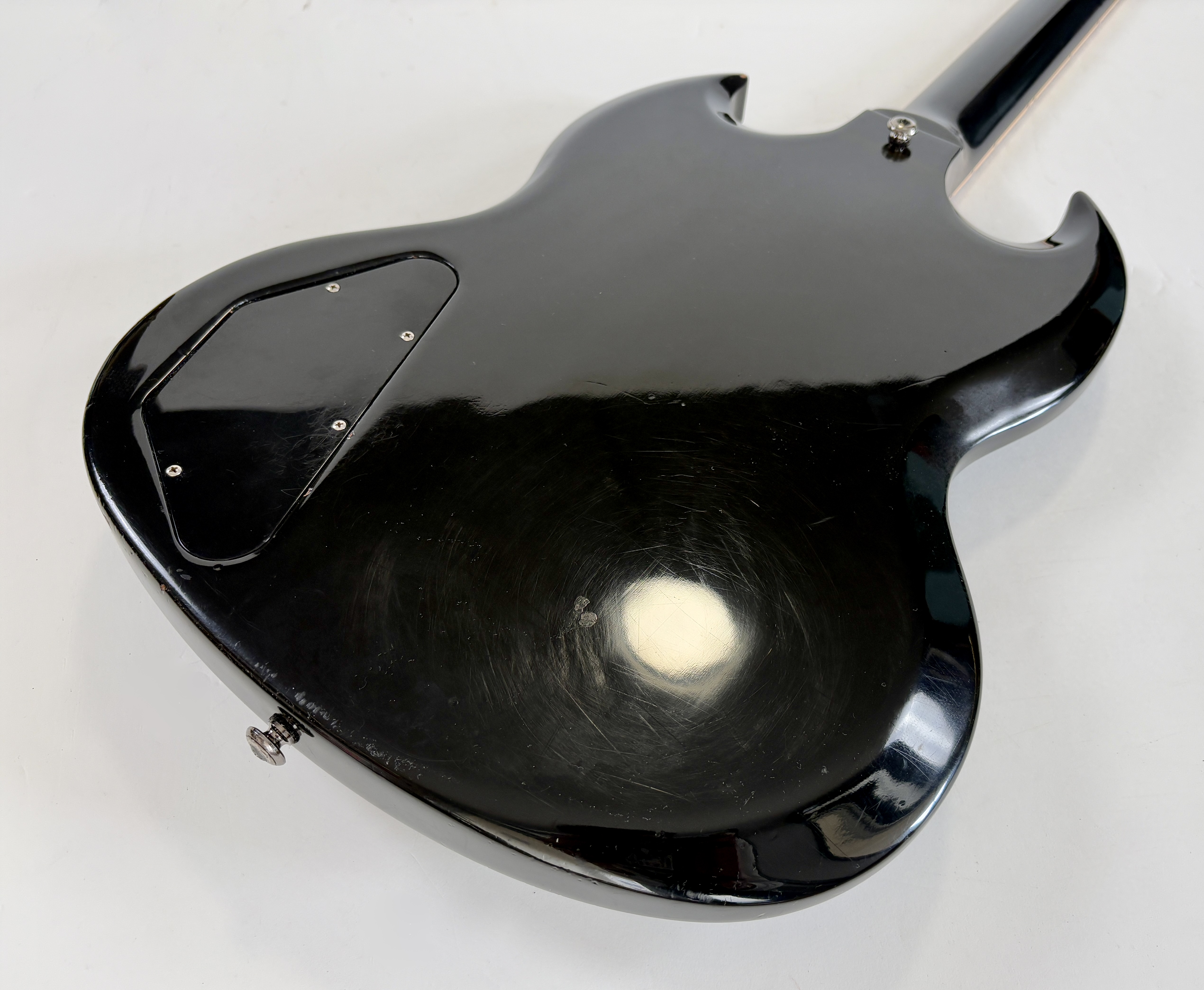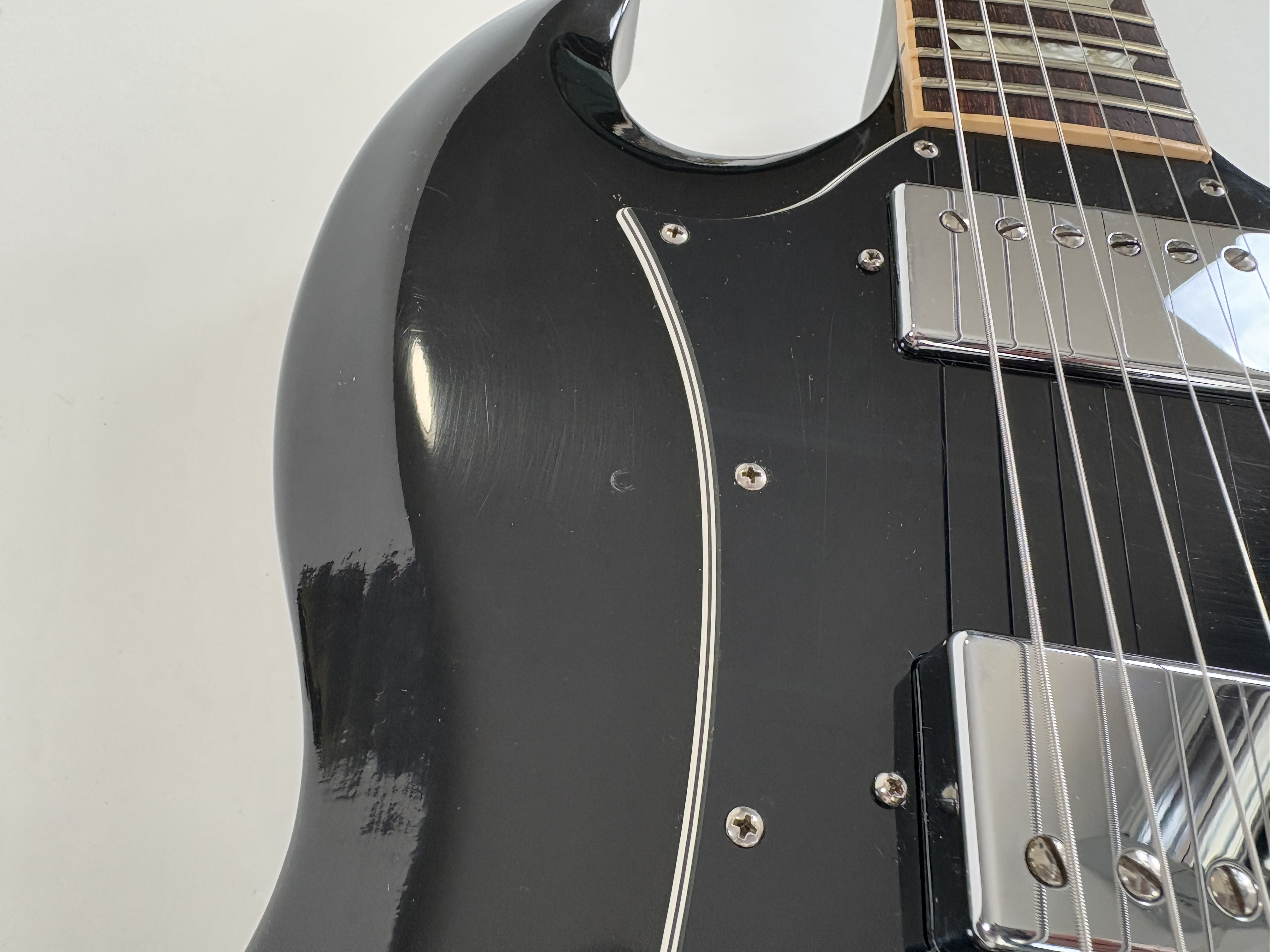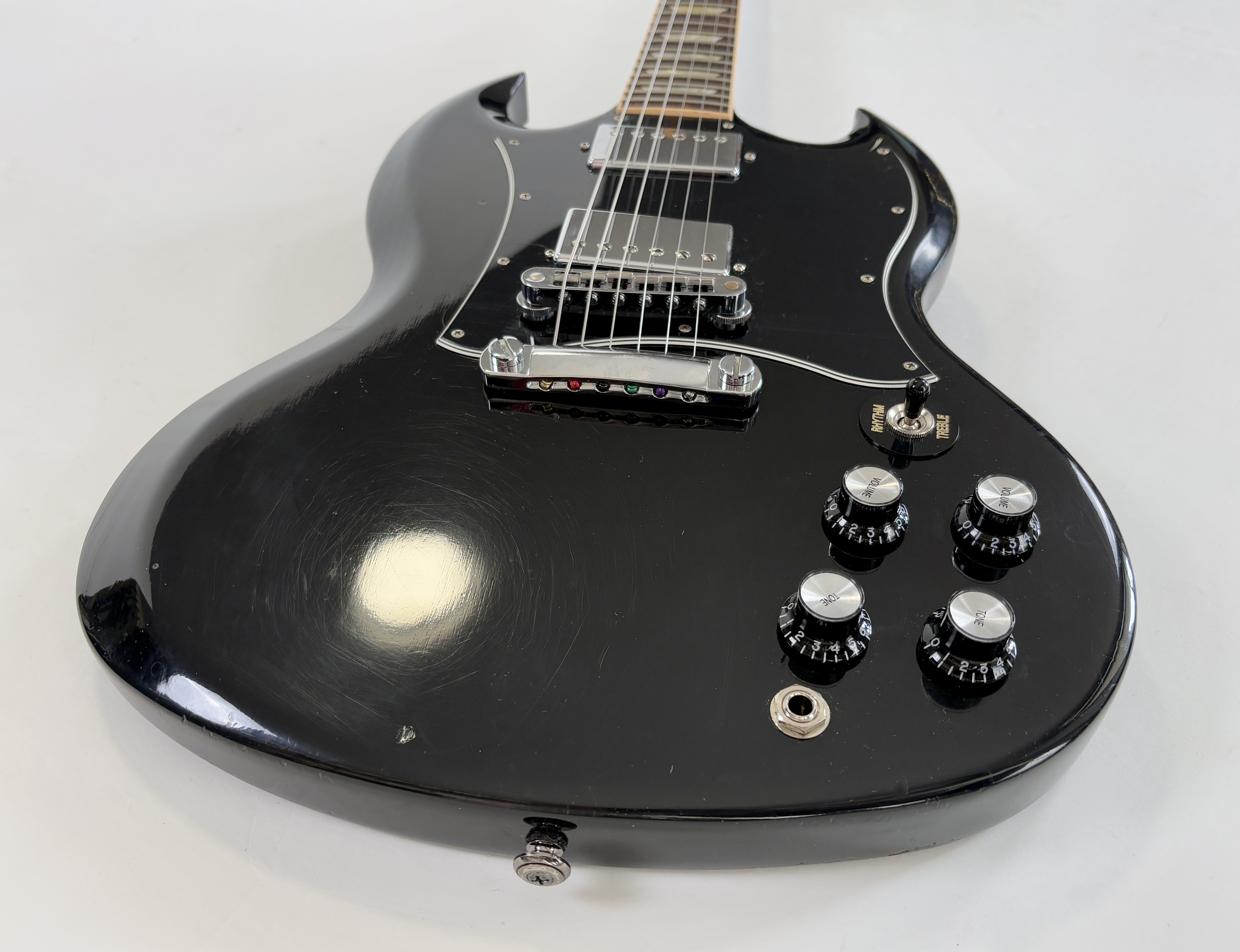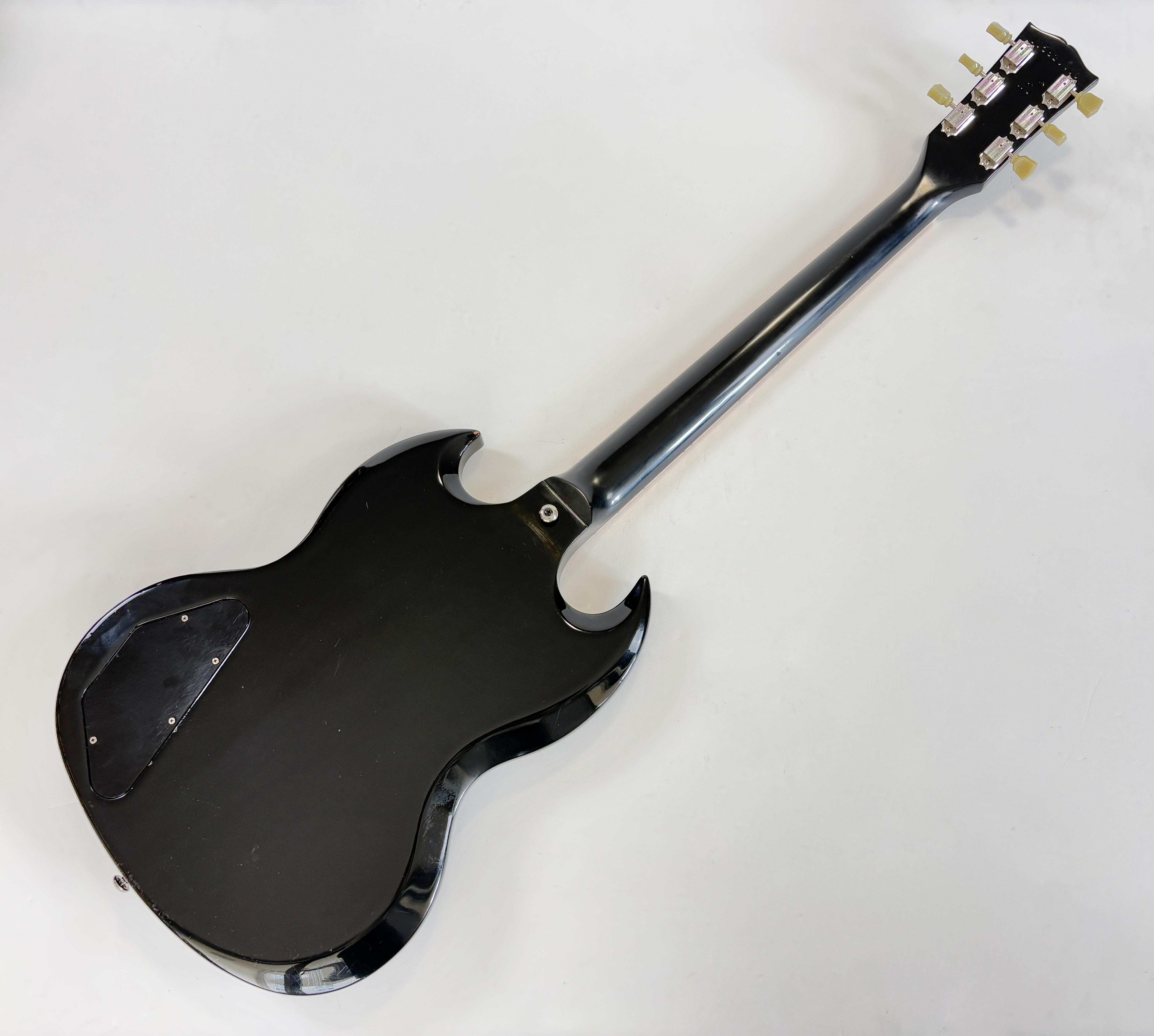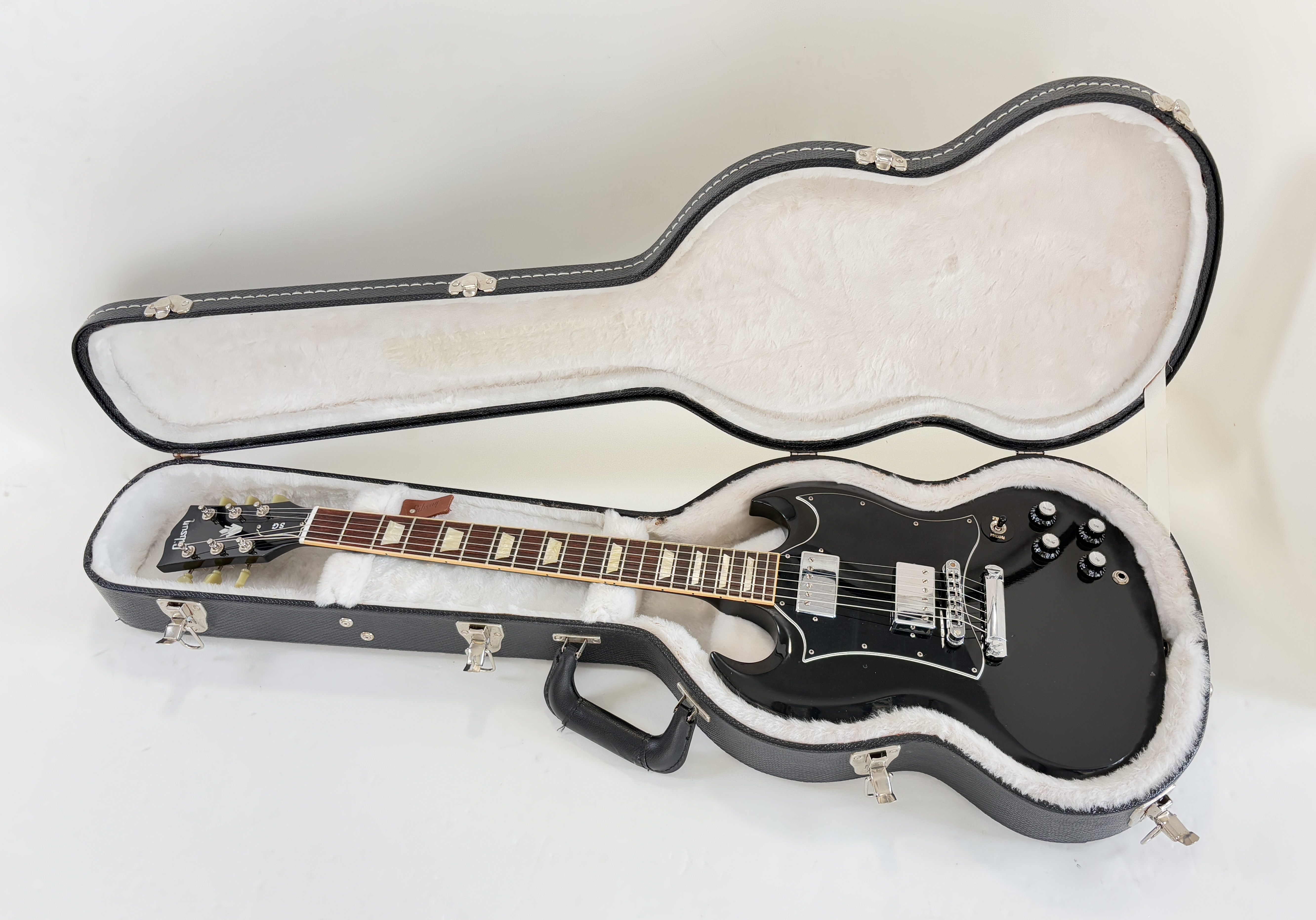Une SG, c’est souvent Cherry, ici elle se pare d’une couleur plus originale : Ebony ! La construction est classique : corps et manche en acajou, touche au radius de 12 pouces en palissandre. Cet exemplaire de 2012 se dote du duo classique de l’époque (qu’on trouvait sur les Special ou encore les Les Paul Studio, Standard ou Custom) : un doux 490R en position manche et un puissant 498T côté chevalet. Vendue dans son étui d’origine.Location, achat, vente, reprise, dépôt-vente.