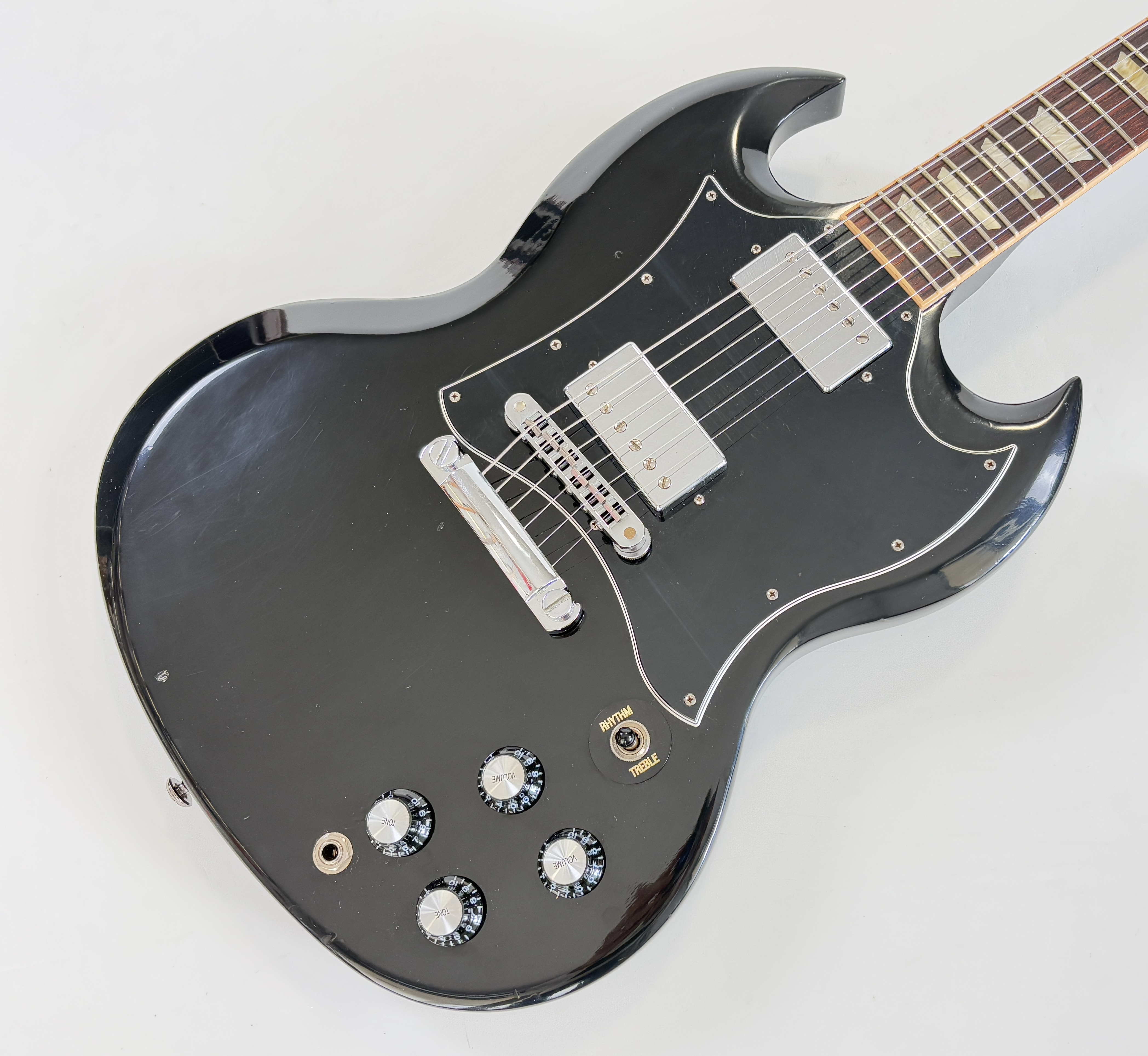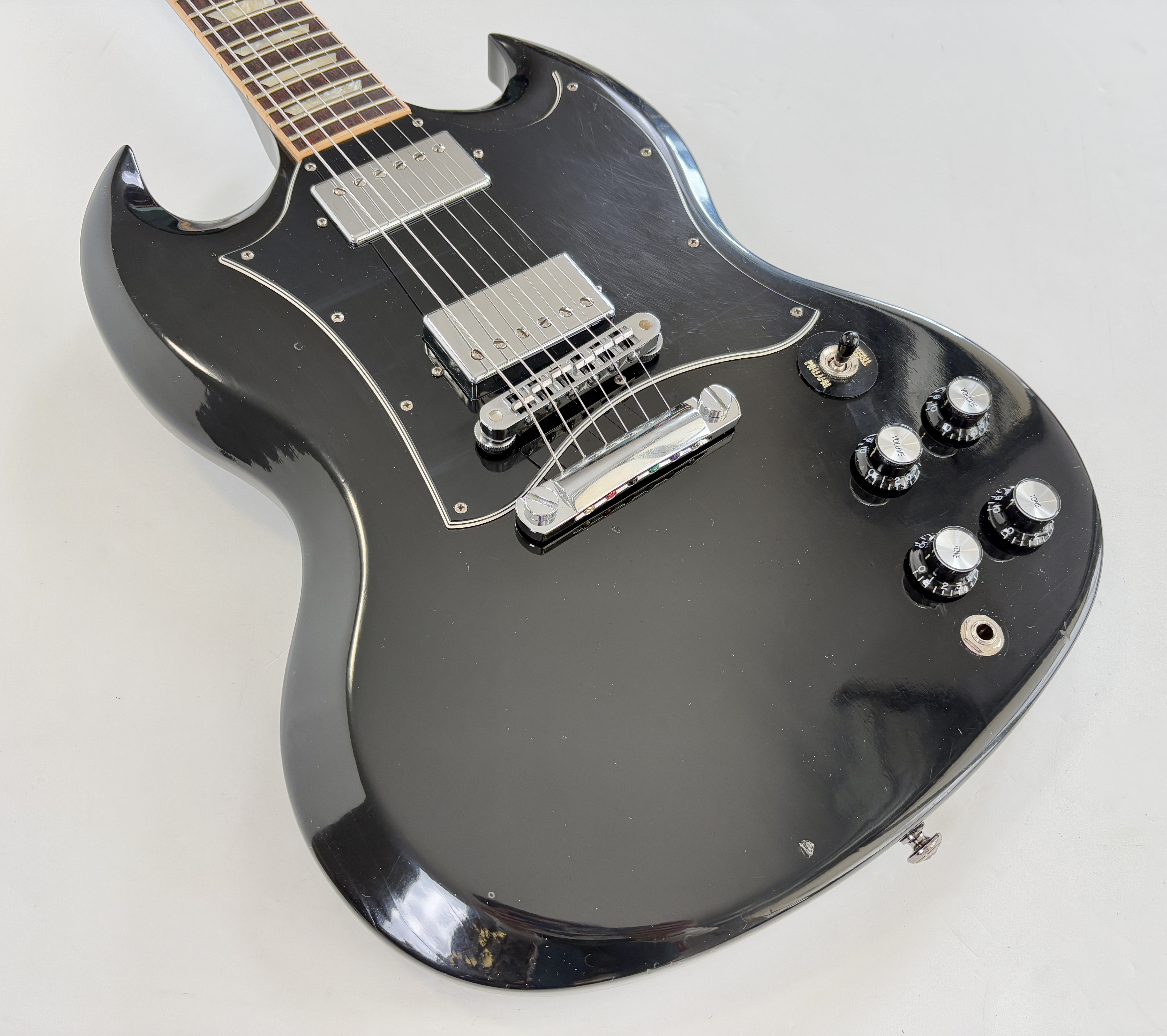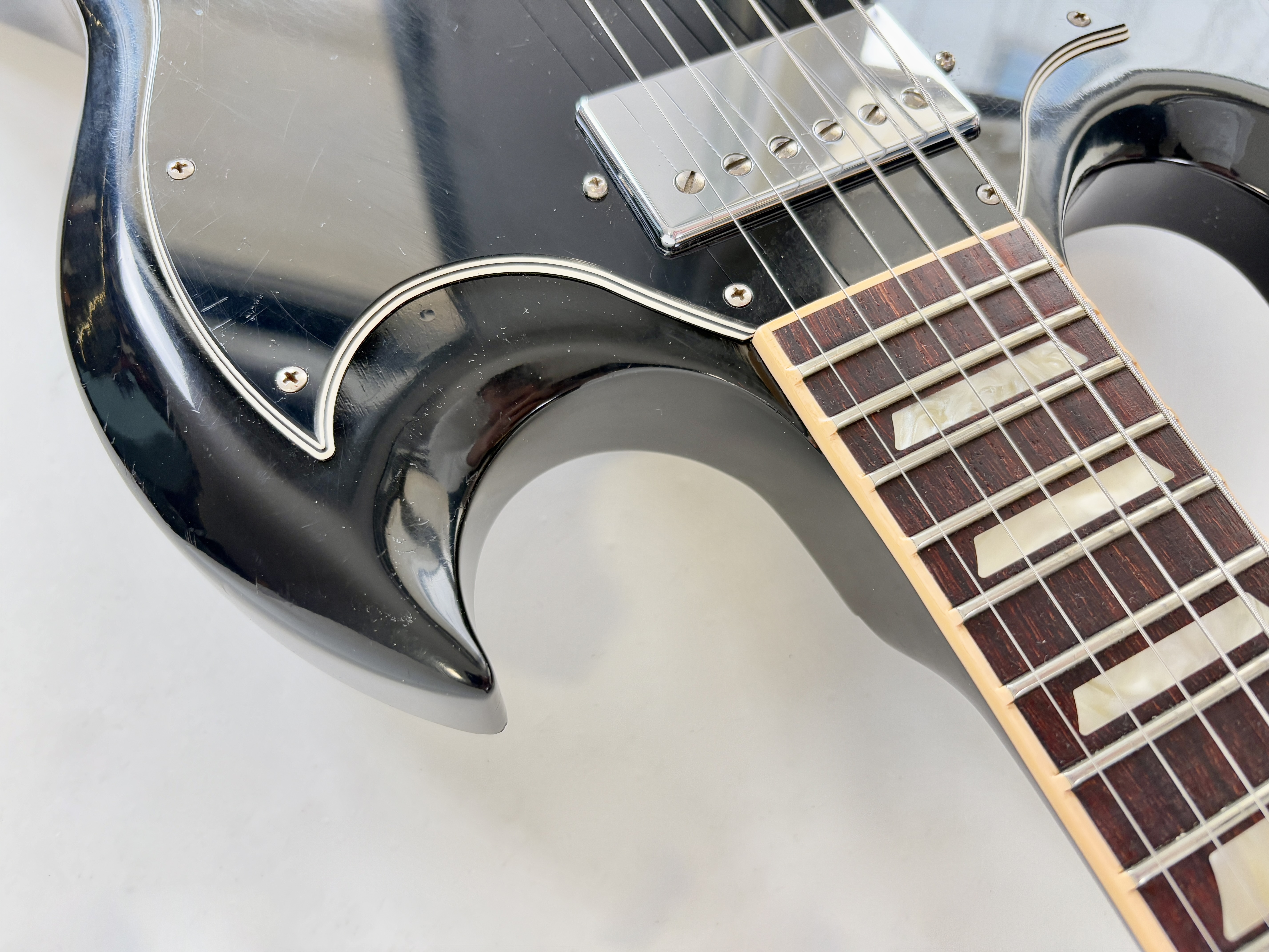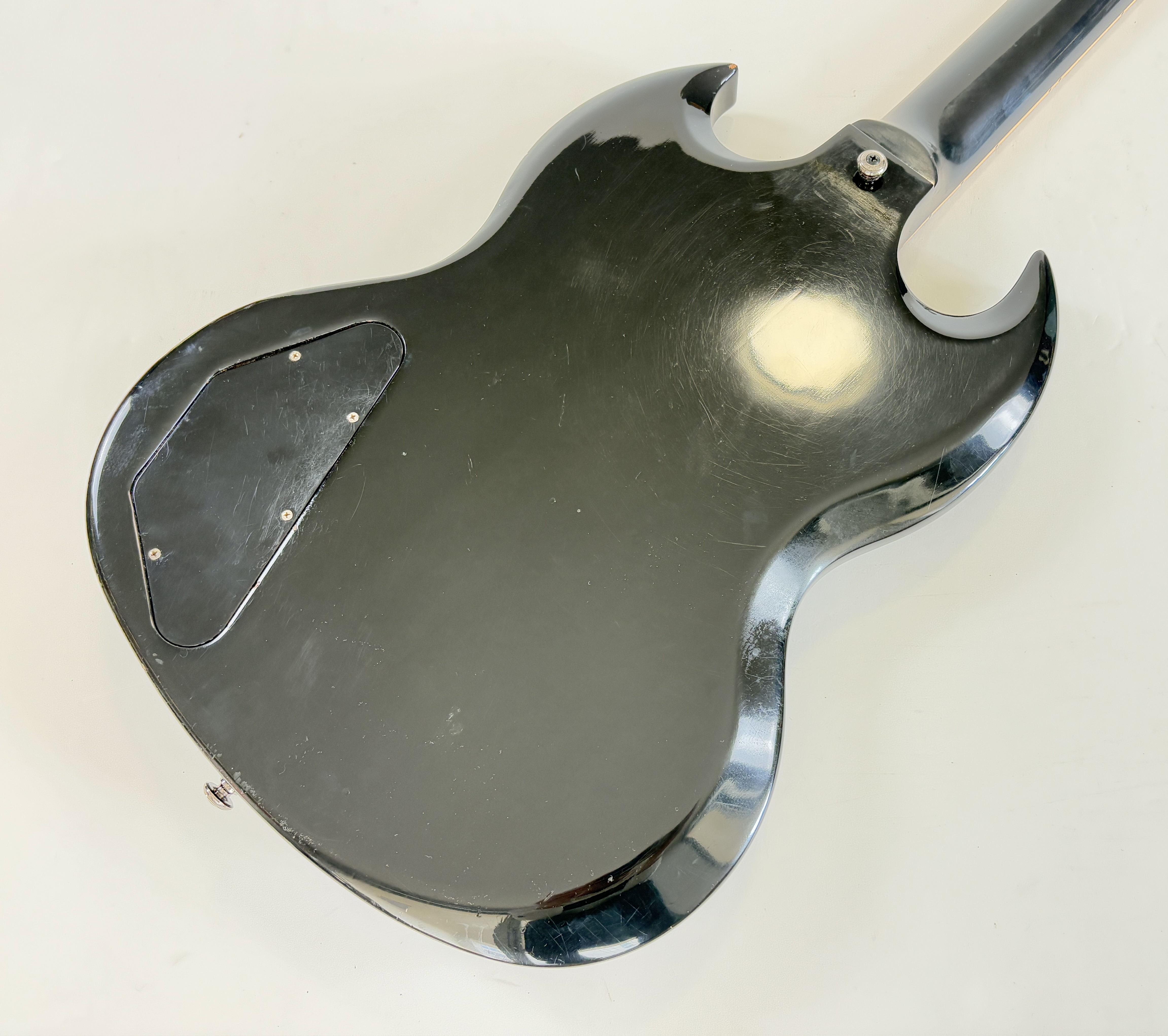 Une SG, c’est souvent Cherry, ici elle se pare d’une couleur plus originale : Ebony ! La construction est classique : corps et manche en acajou, touche au radius de 12 pouces en palissandre. Cet exemplaire de 2012 se dote du duo classique de l’époque (qu’on trouvait sur les Special ou encore les Les Paul Studio, Standard ou Custom) : un doux 490R en position manche et un puissant 498T côté chevalet. Vendue dans son étui d’origine.Location, achat, vente, reprise, dépôt-vente.
