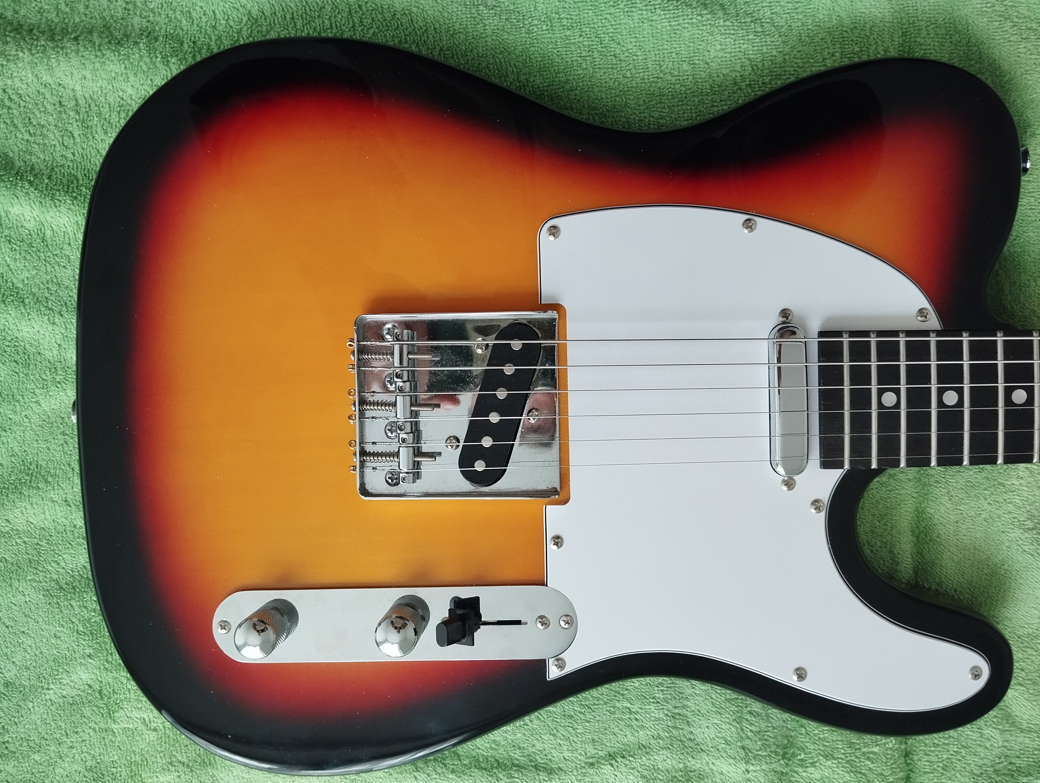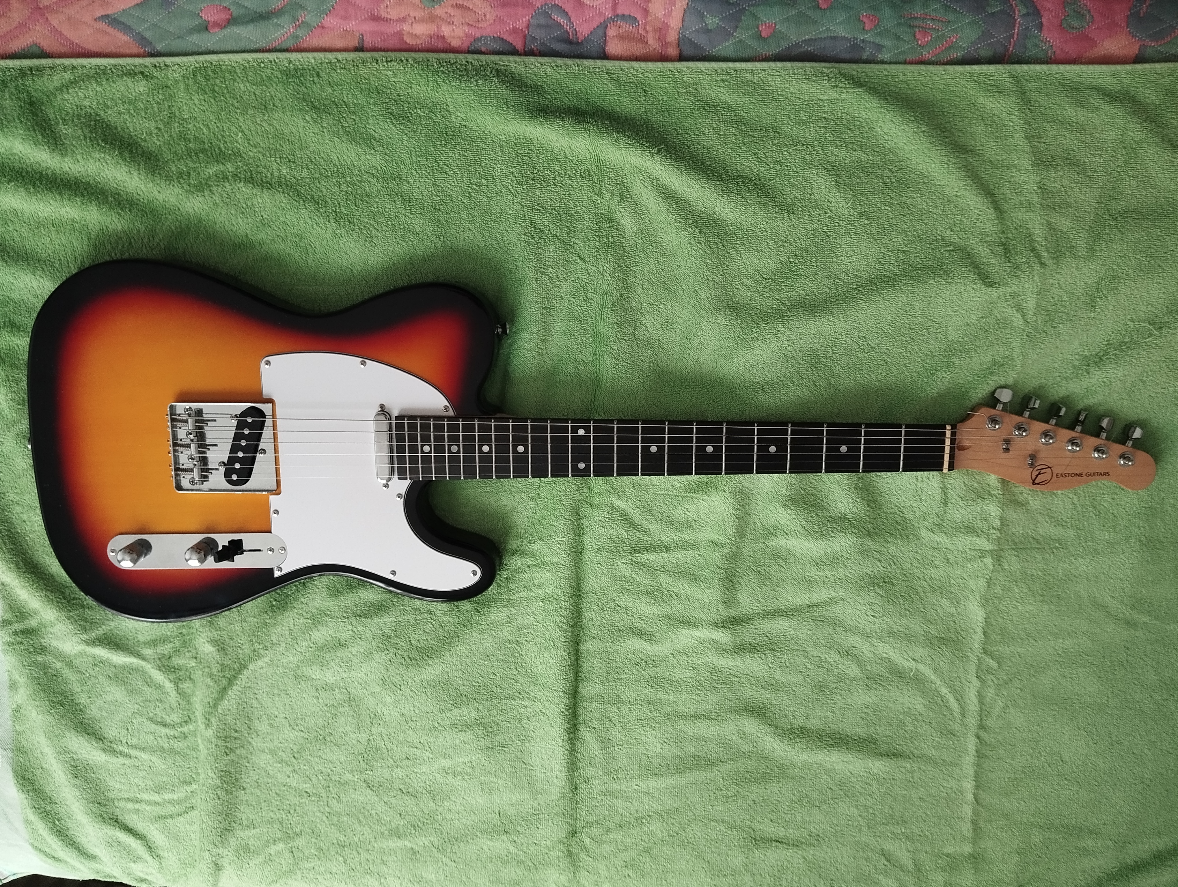 Copie chinoise Télé, Eastone, couleur Sunburst. Etat neuf. ni pet, ni rayure. Jamais sortie dehors. Son Télé convaincant, voir test sur AF. Micro chevalet perçant comme il faut. Entretenue luthier : action, intonation, reprise sillet. Frettes impeccables, montée en 10/46. Comme guitare débutant ou spare. A voir Paris 13