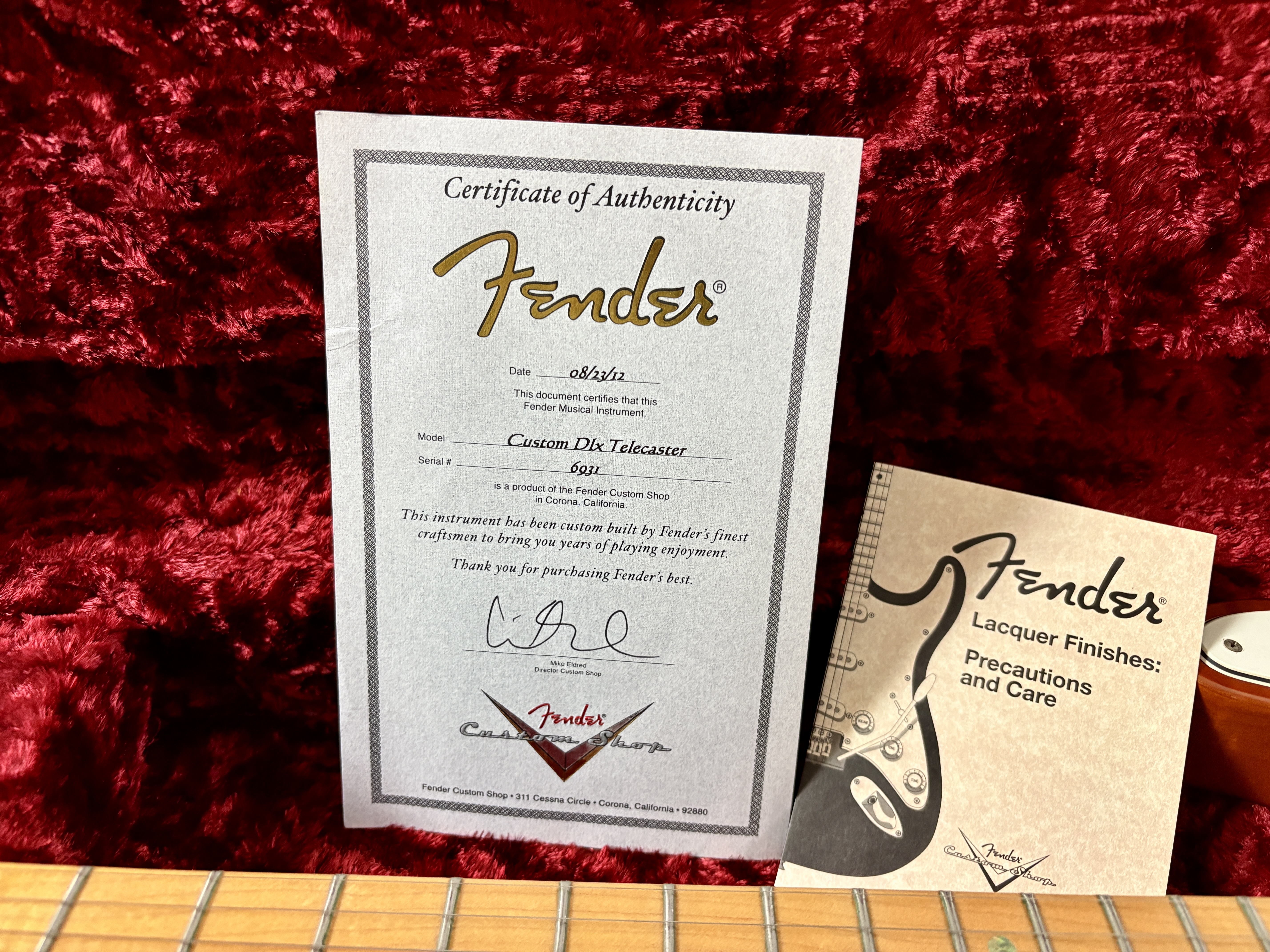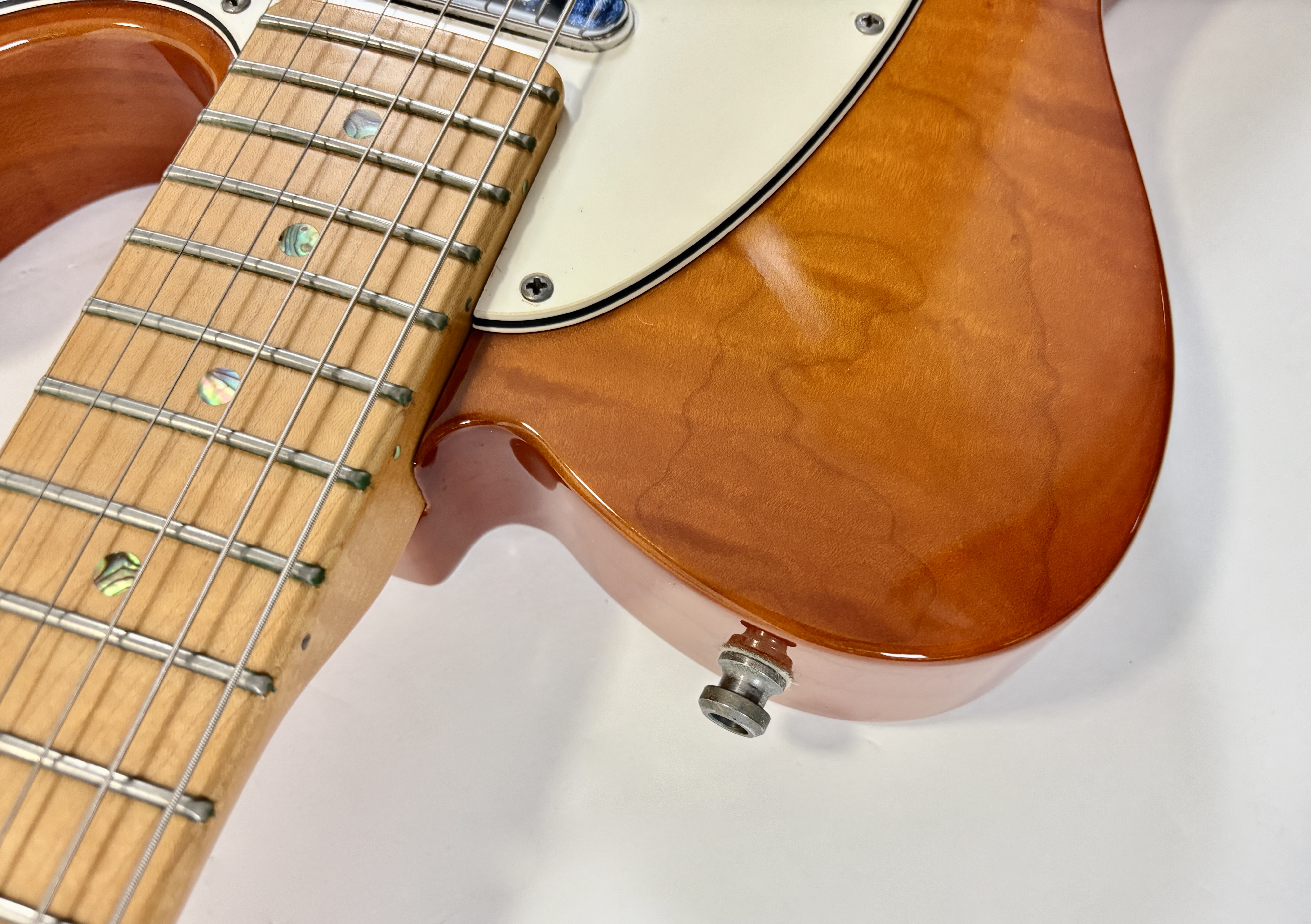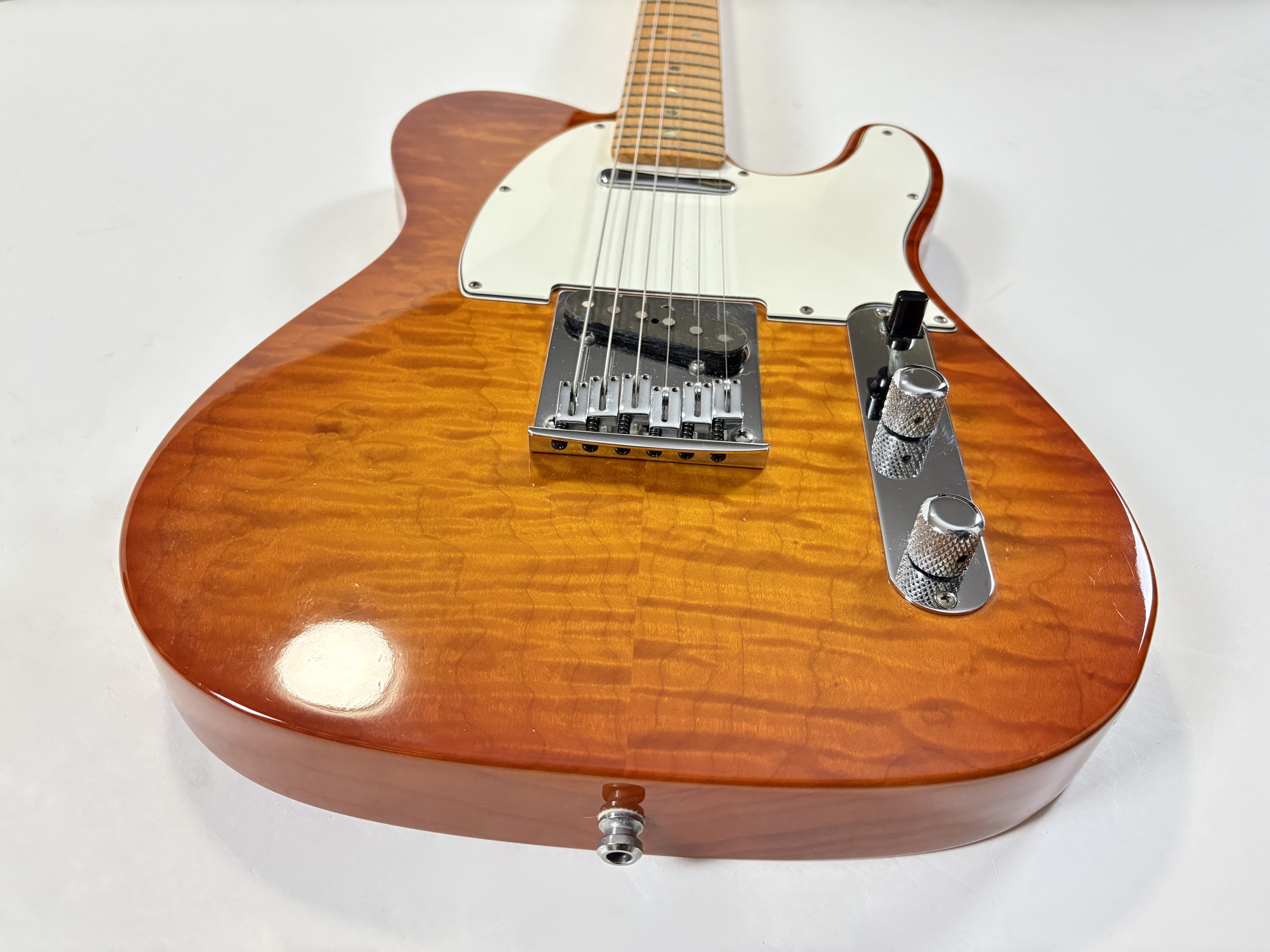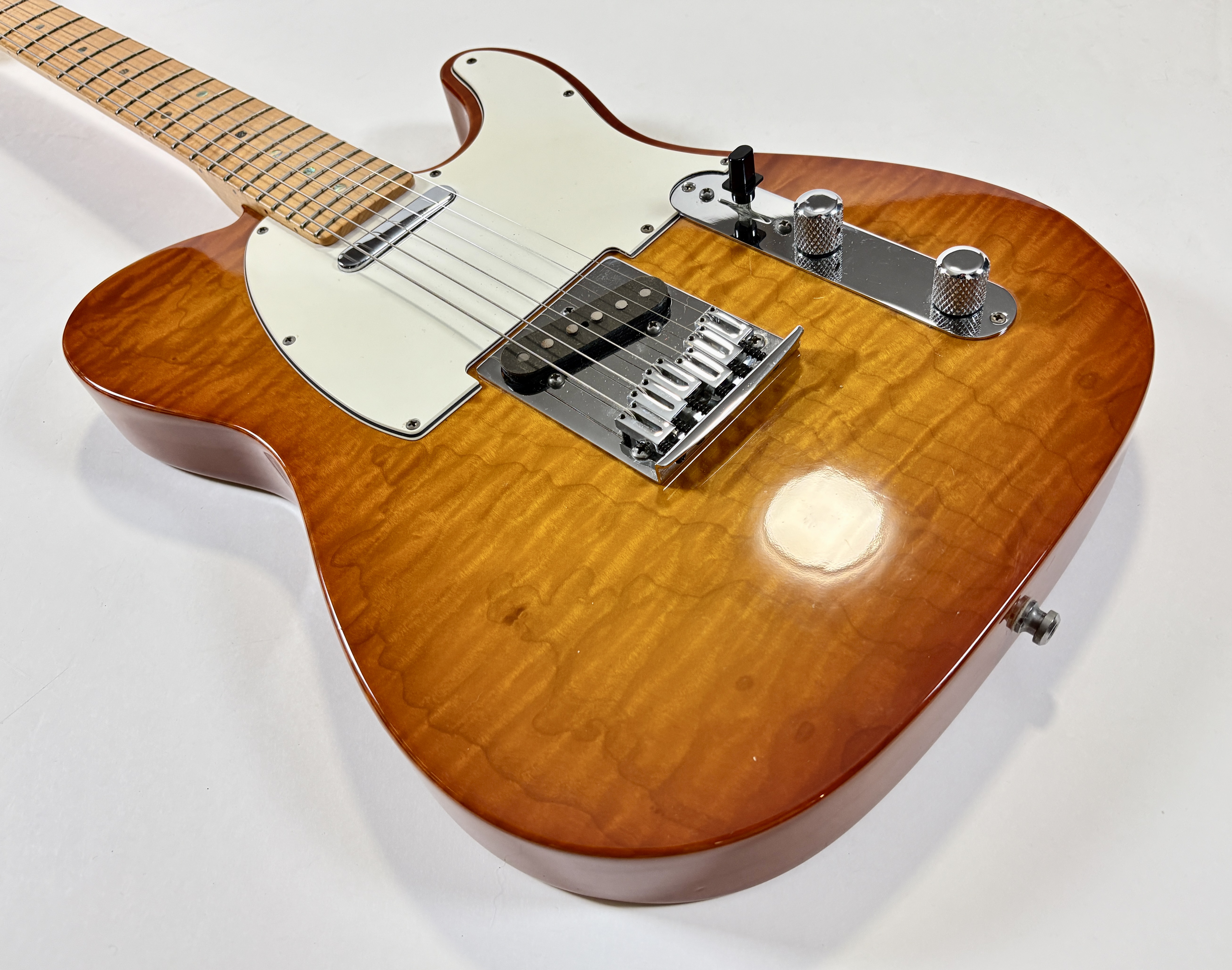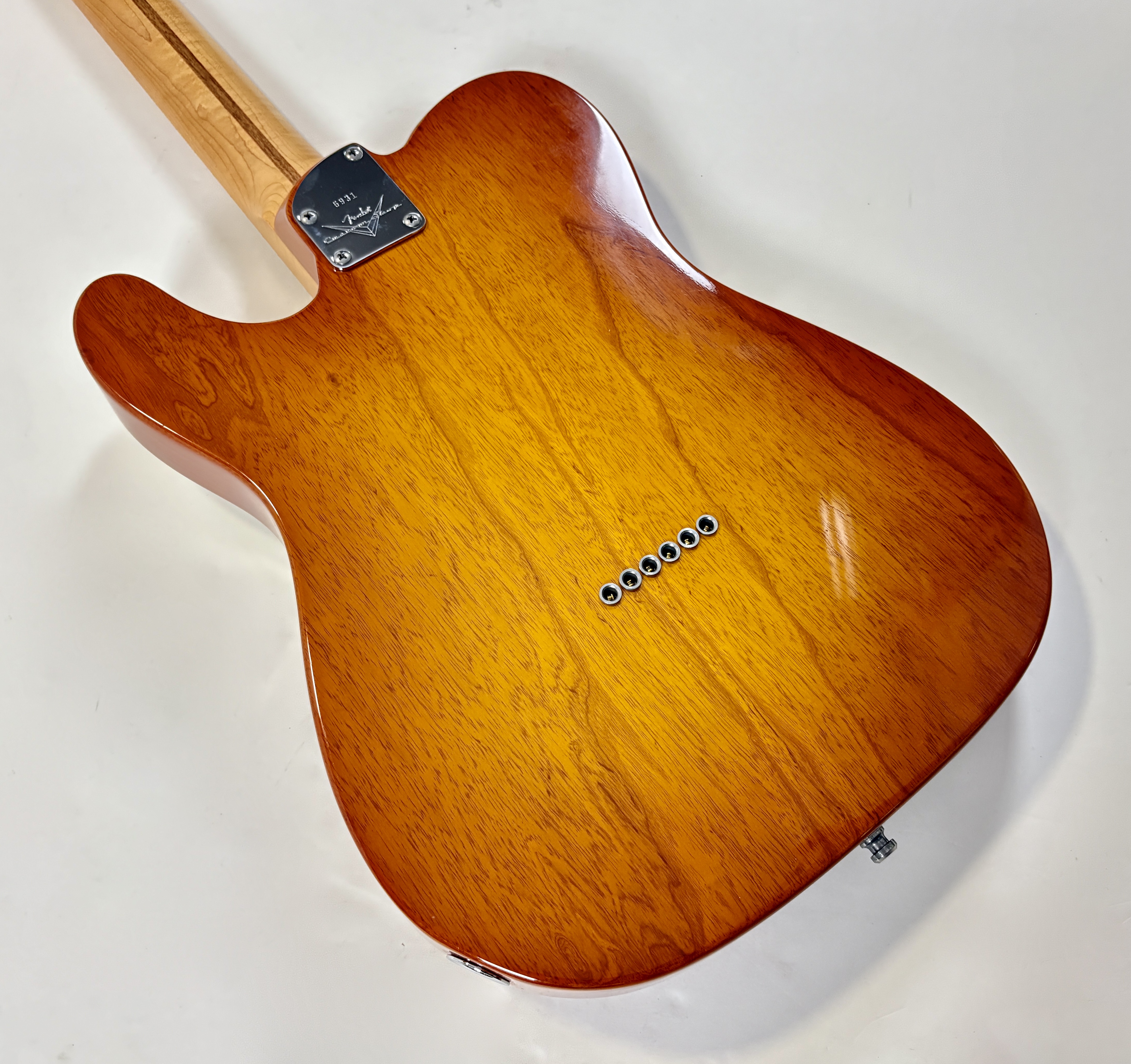 Le Custom Shop de la marque californienne se concentre surtout sur des reproductions des modèles originaux des année 50/60. Cette Deluxe offre le summum de la qualité que la firme peut produire en modernisant la Telecaster (à l'instar des American Deluxe ou actuelles Ultra). Le corps en frêne se pare d'une table en érable dite quilted, qualité AAA, du plus bel effet. Le manche, en érable, a une touche de la même essence de bois au radius de 9,5 pouces. La partie électronique est confiée à une paire de micros Twisted Tele bobinés main, signés, par la légendaire Abigail « Abby » Ybarra. En très bon état, vendue avec son certificat d'authenticité, dans son étui d'origine.Location, achat, vente, reprise, dépôt-vente.