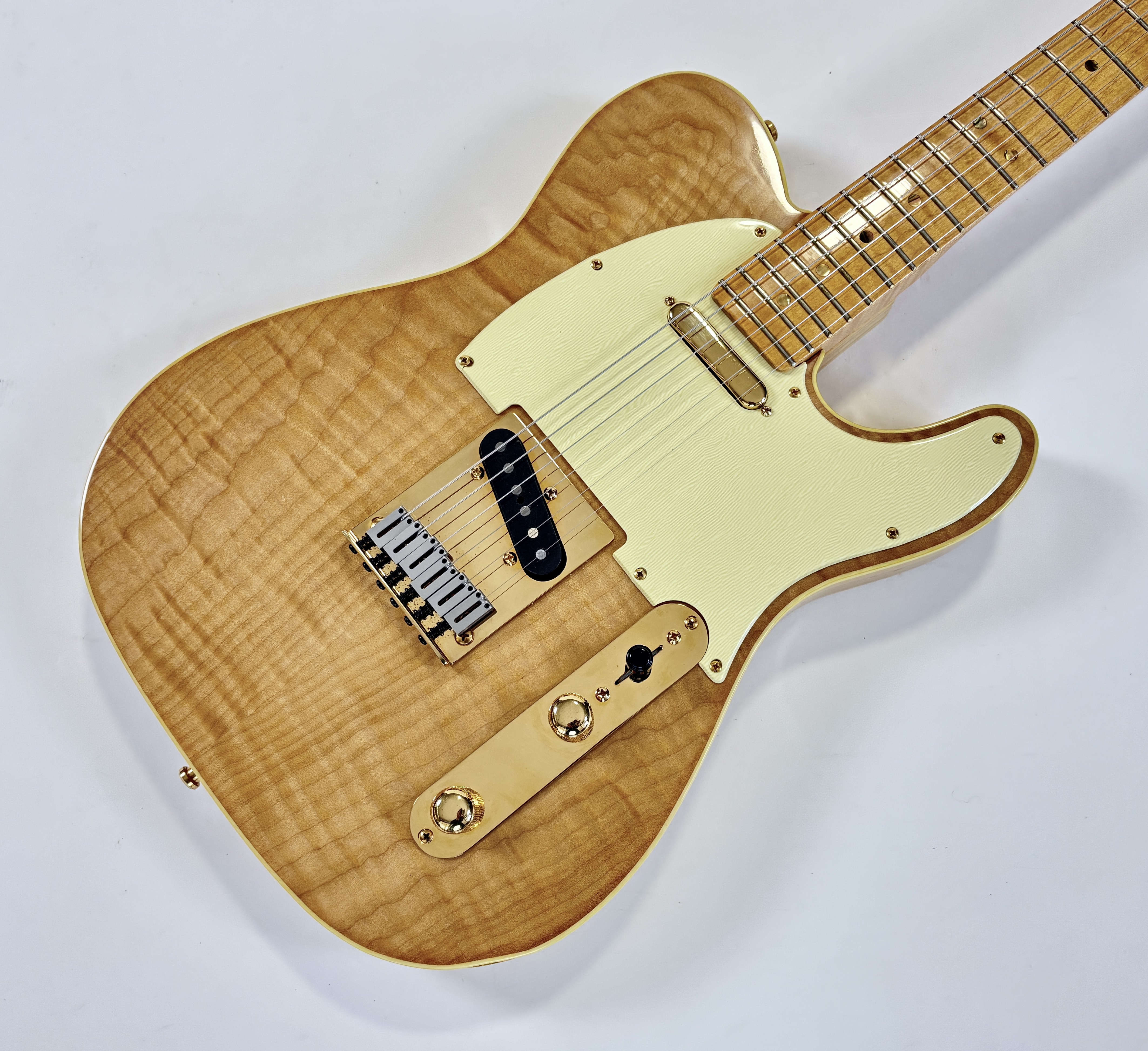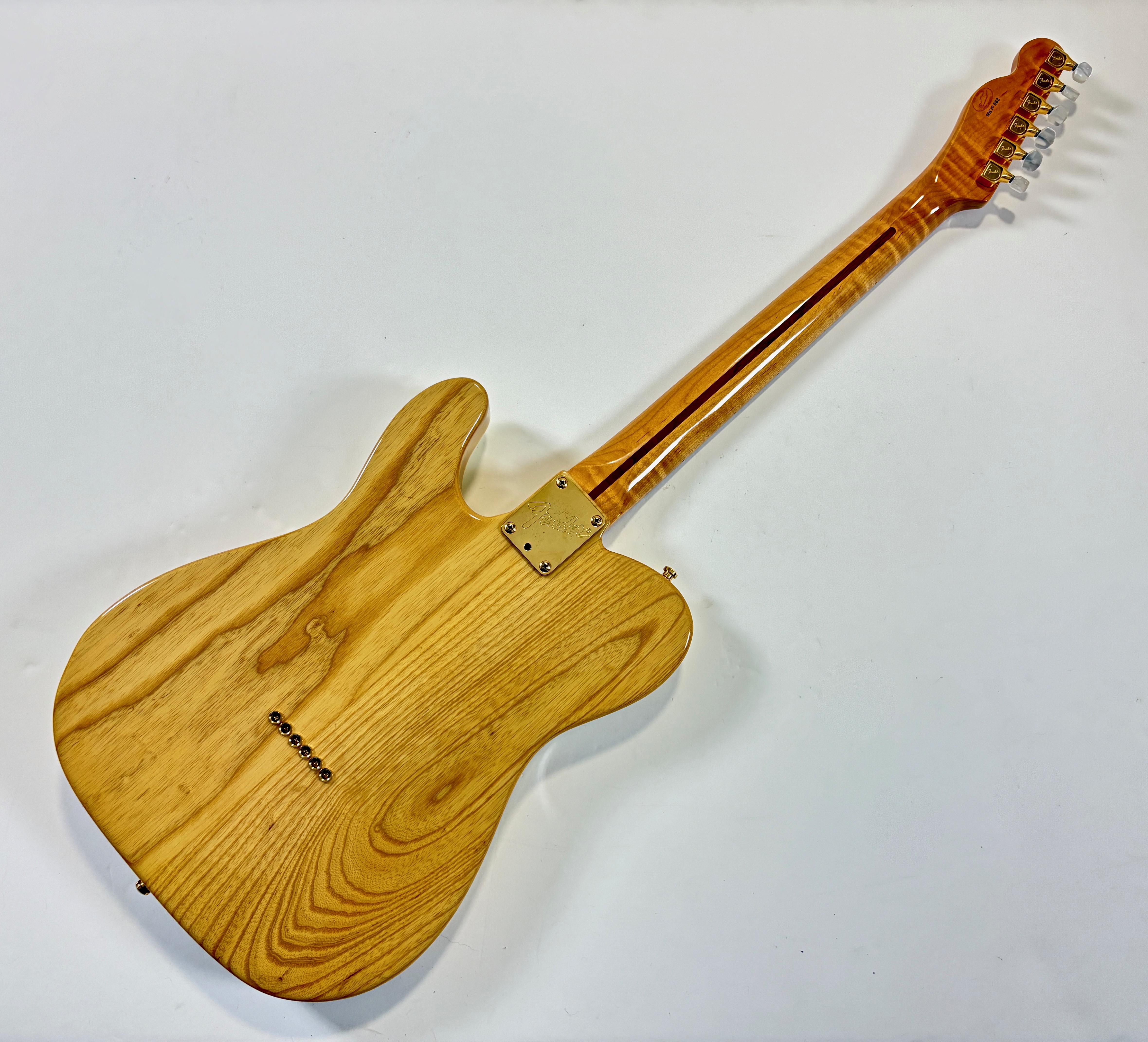 Le Custom Shop de la marque californienne fait ses premiers pas en 1987, au début il n’avait pas spécialement vocation à recréer les modèles originels, plutôt de proposer le meilleur du meilleur ! Ici cette 40ème anniversaire s’éloigne gentiment de la Telecaster “de base” avec un corps en frêne, décoré d’une superbe table en érable ondé, le manche est tout aussi beau et de la même essence de bois. De teinte Tinted Natural, avec accastillage doré, elle est fort désirable. En excellent état, avec tous ses accessoires, son certificat d’authenticité, dans son étui tweed d’origine.Dépôt-vente, achat, vente, reprise, location.
