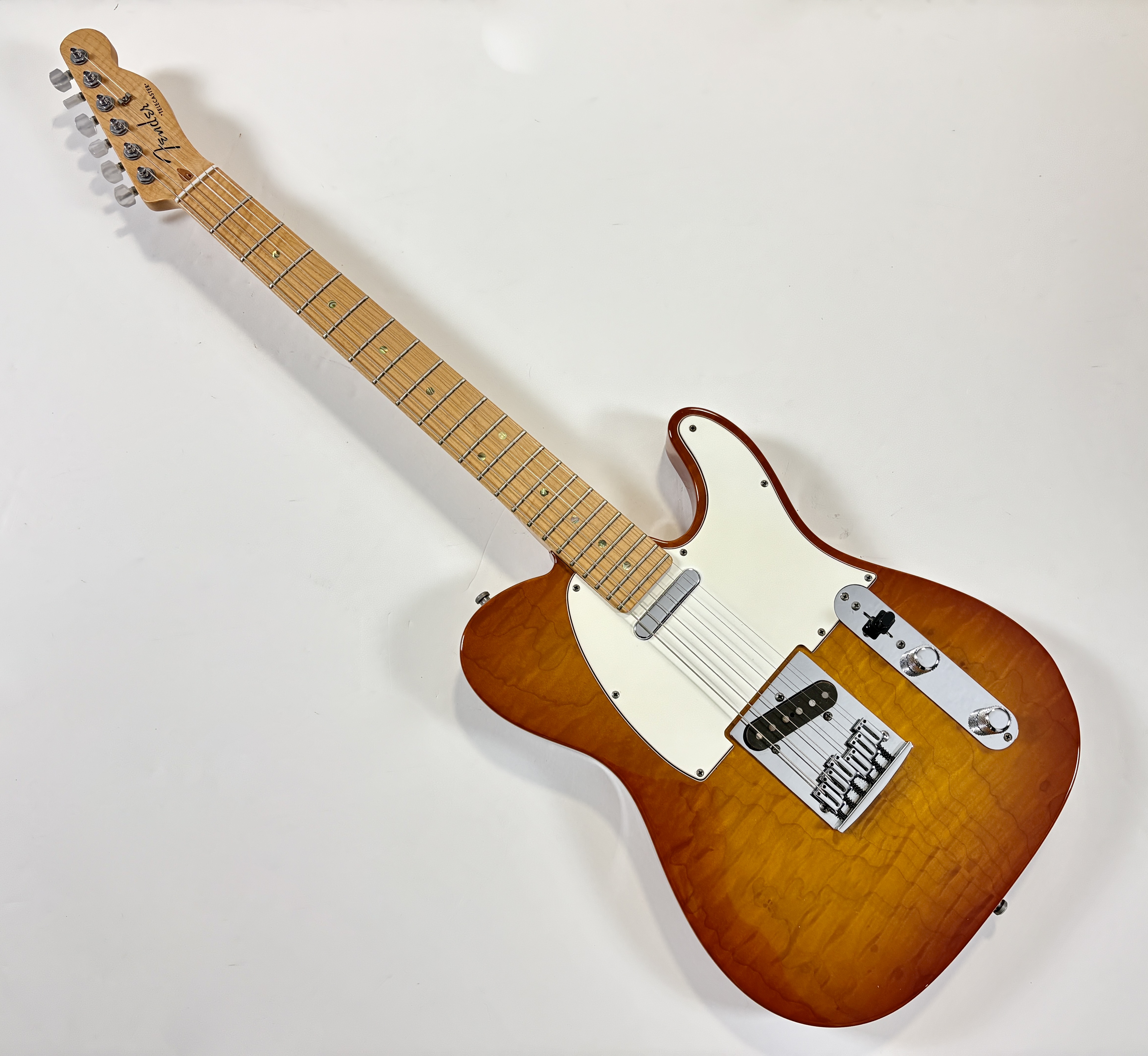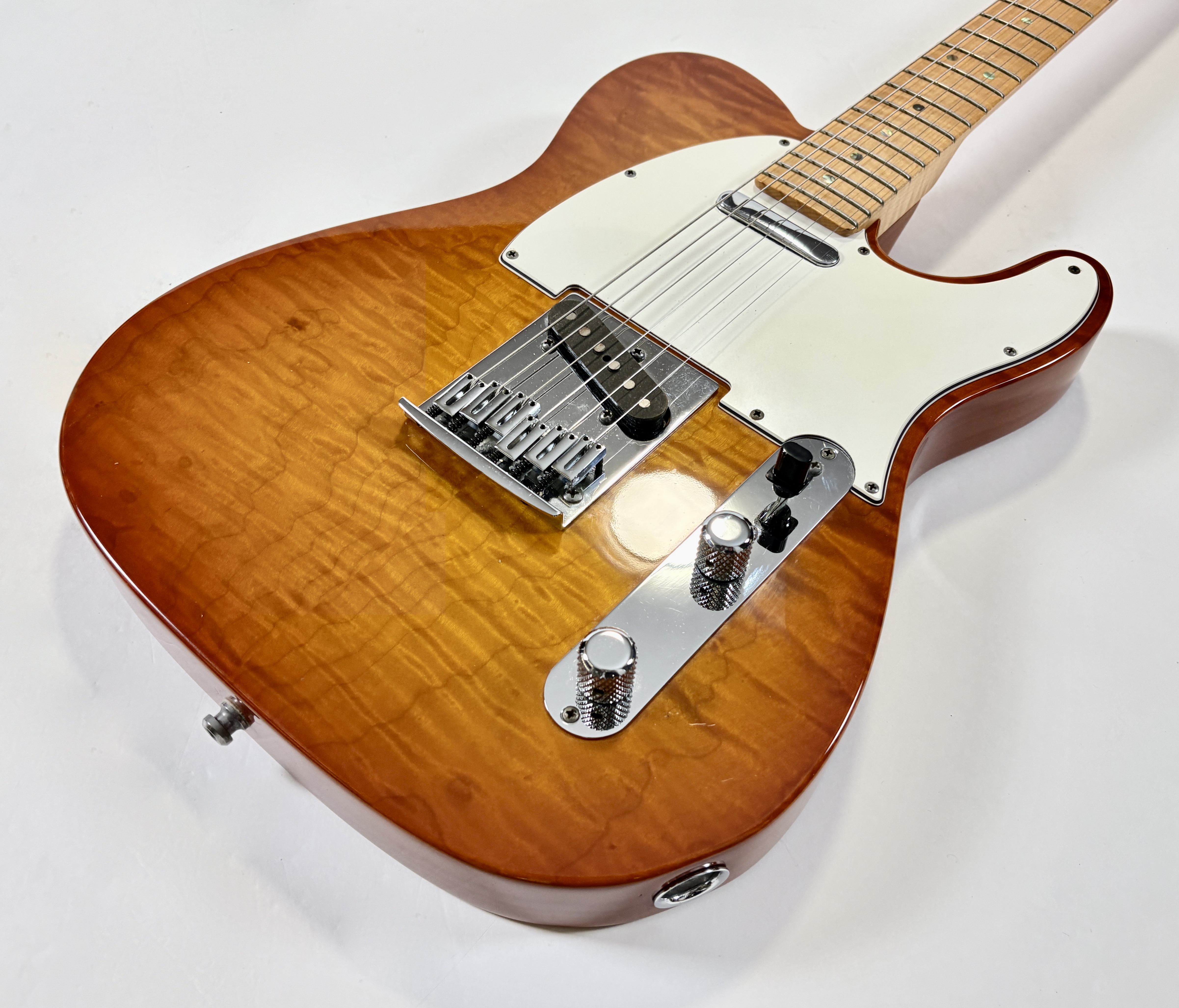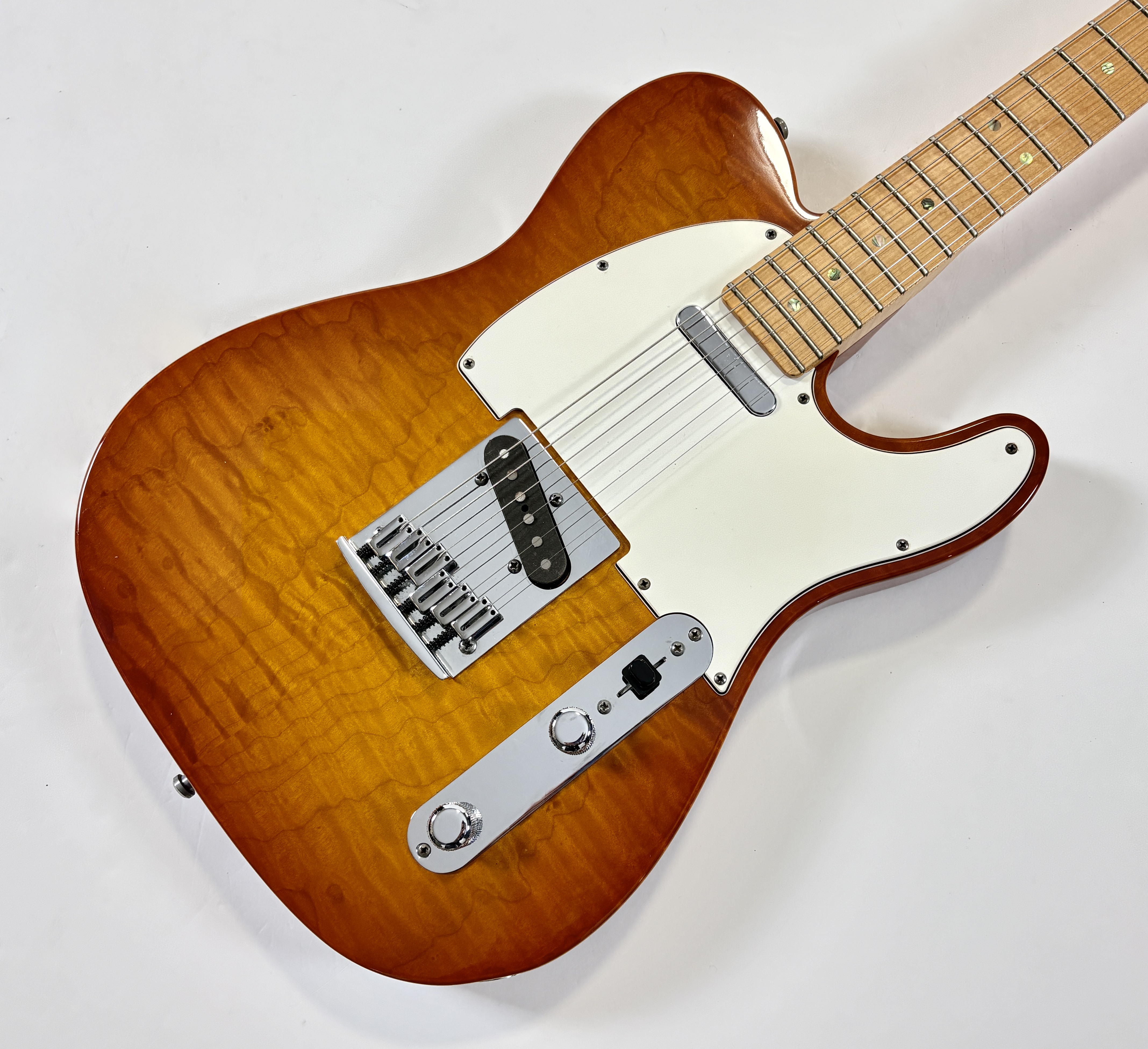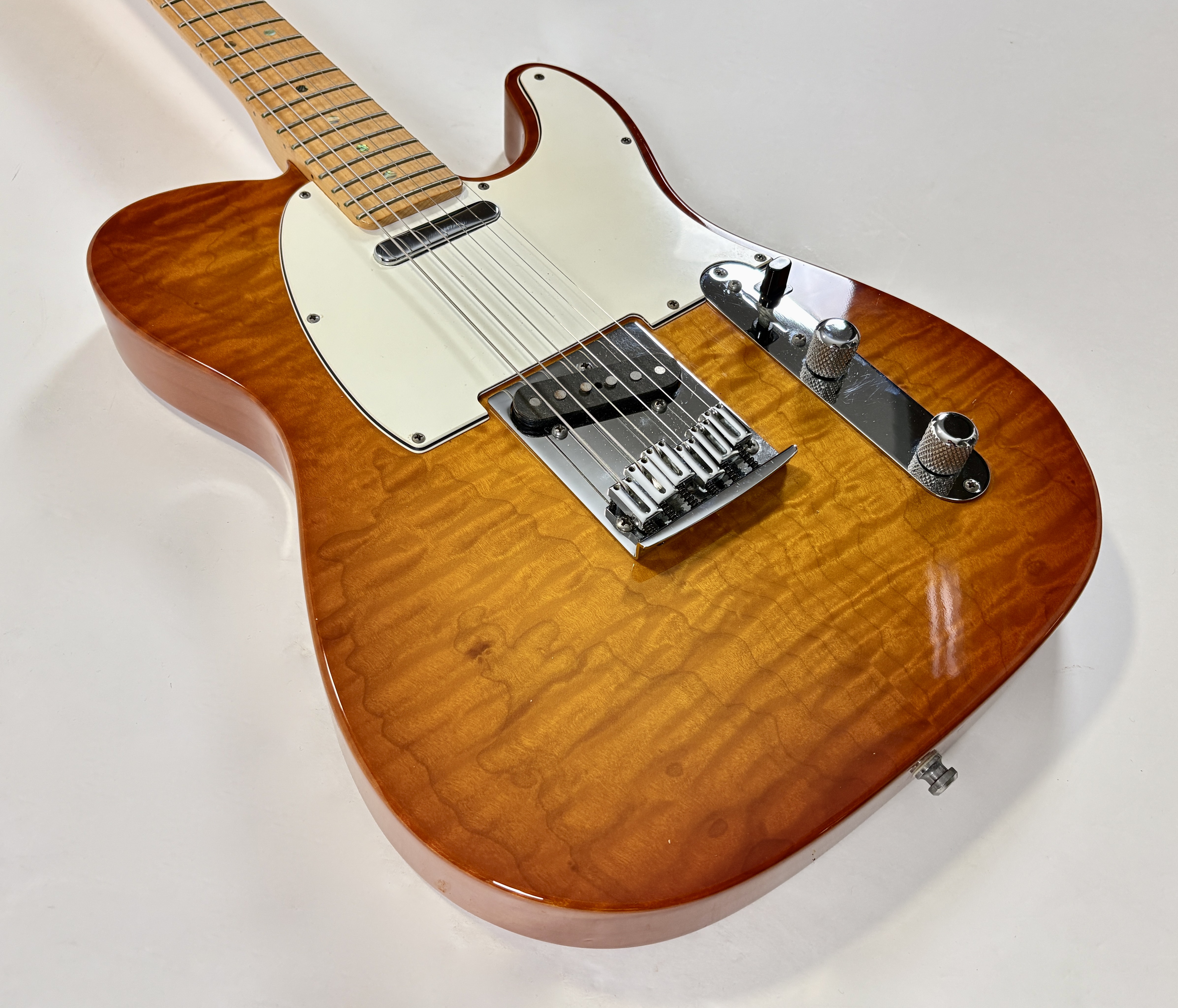Le Custom Shop de la marque californienne se concentre surtout sur des reproductions des modèles originaux des année 50/60. Cette Deluxe offre le summum de la qualité que la firme peut produire en modernisant la Telecaster (à l'instar des American Deluxe ou actuelles Ultra). Le corps en frêne se pare d'une table en érable dite quilted, qualité AAA, du plus bel effet. Le manche, en érable, a une touche de la même essence de bois au radius de 9,5 pouces. La partie électronique est confiée à une paire de micros Twisted Tele bobinés main, signés, par la légendaire Abigail « Abby » Ybarra. En très bon état, vendue avec son certificat d'authenticité, dans son étui d'origine.Location, achat, vente, reprise, dépôt-vente.
