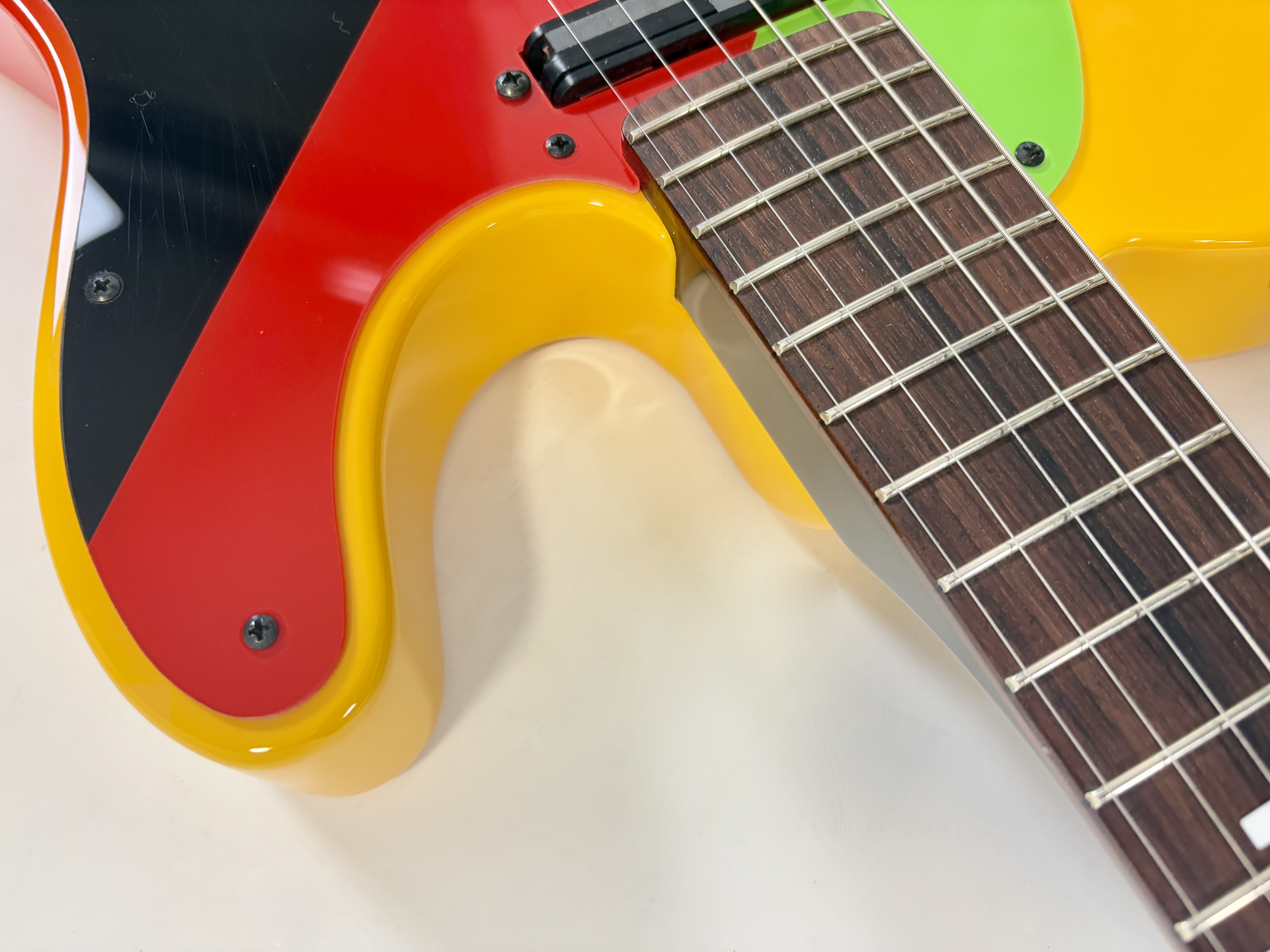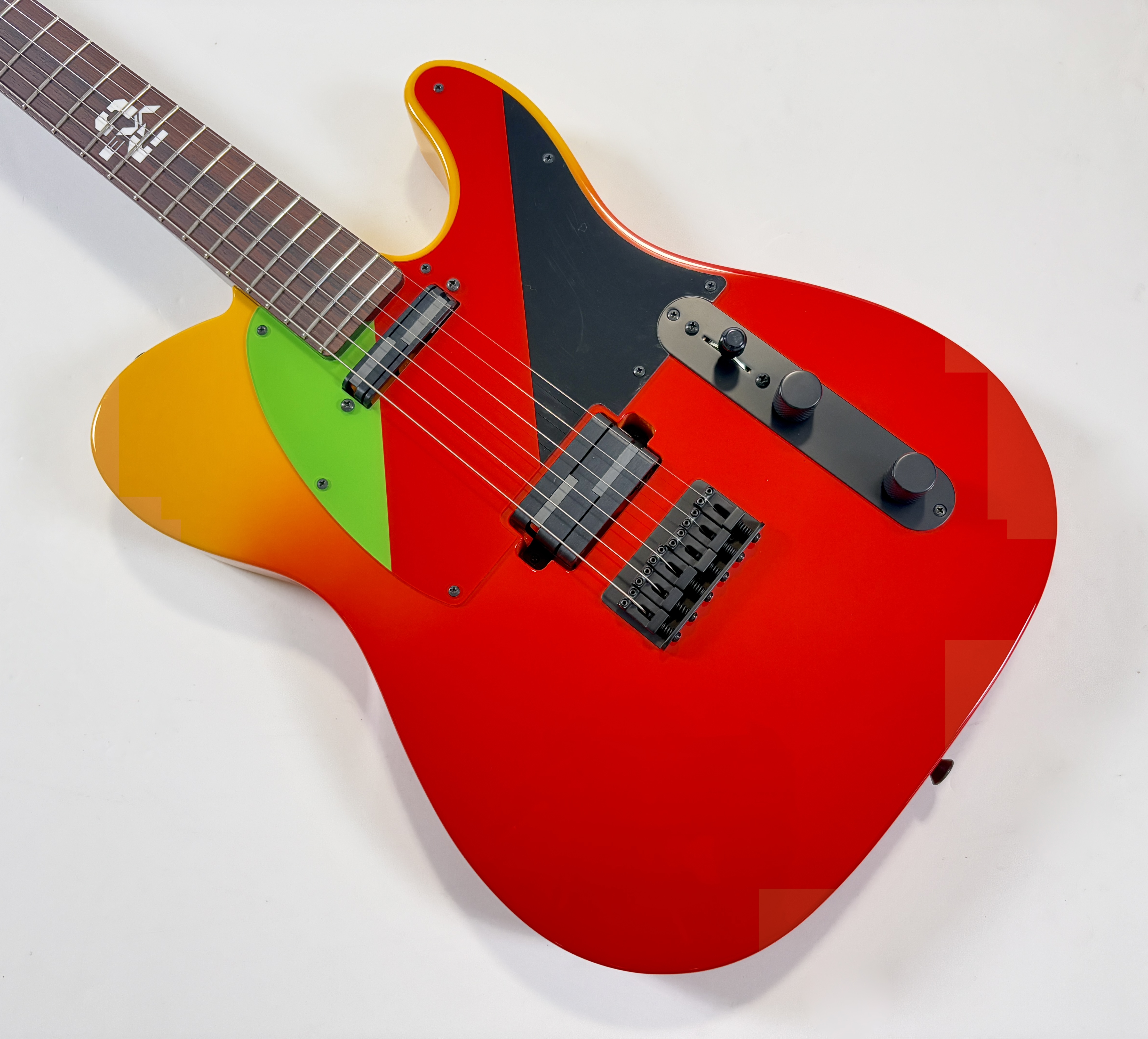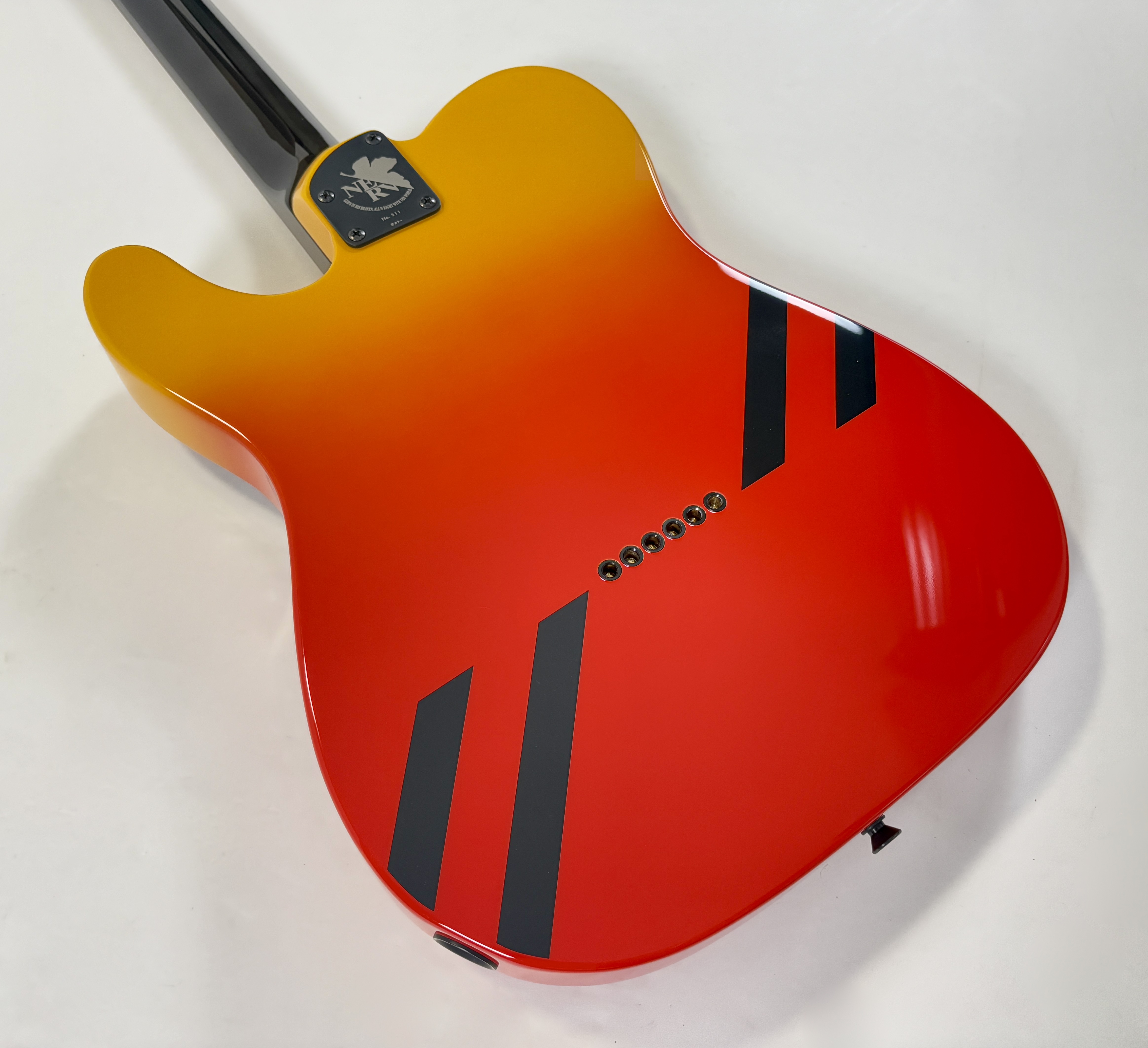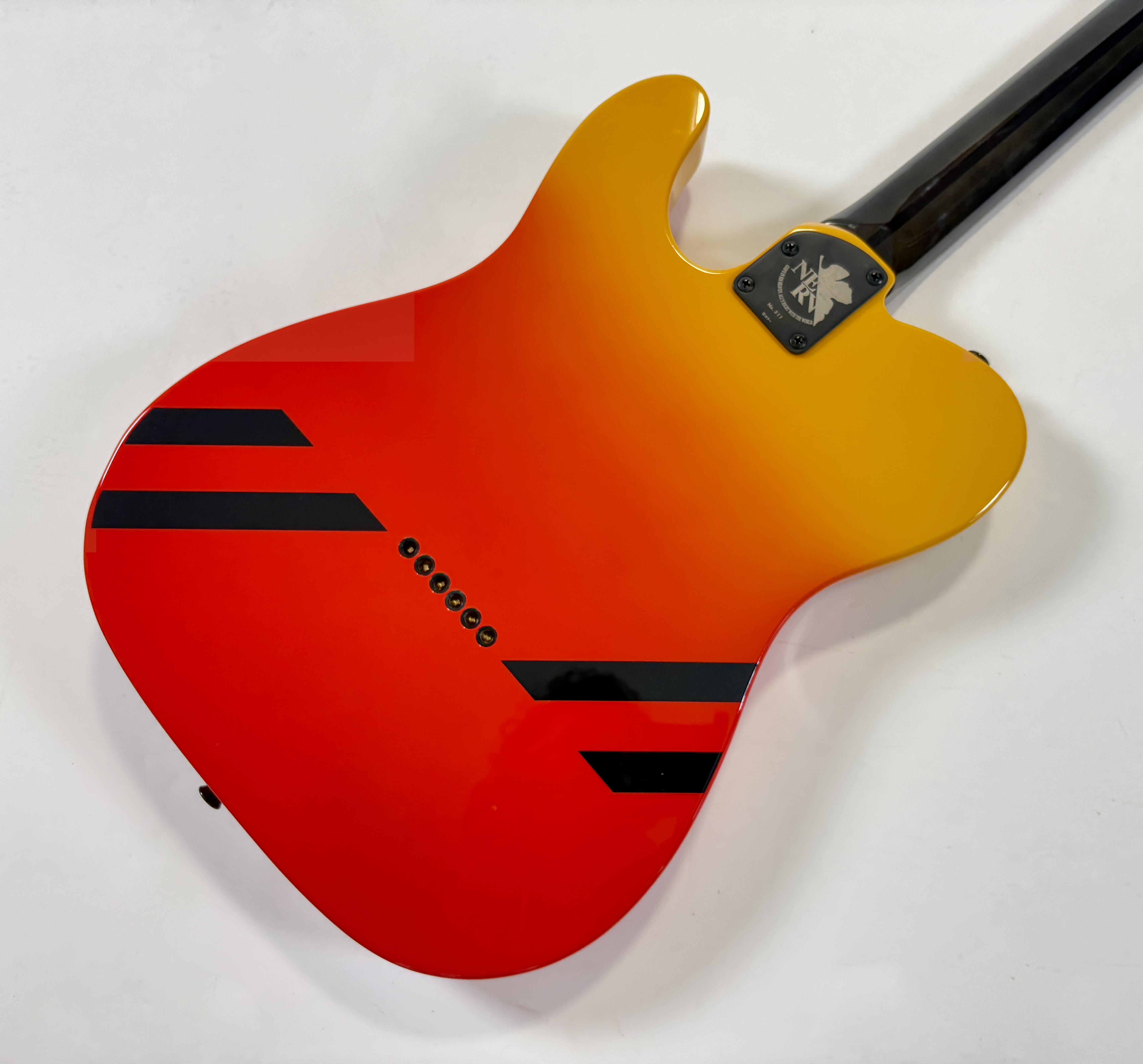 Issue de la série d'animation japonaise Neon Genesis Evangelion cette Telecaster s'offre un design unique ! La lutherie est assez classique : corps en aulne, manche en érable avec touche palissandre au radius de 9,5 pouces. En revanche la partie électronique configuration HS change puisqu'elle est dotée d'une paire de micros Lace Alumitone, un simple en manche et un double en position chevalet. Celle-ci porte le numéro 311, vendue avec son certificat d'authenticité, dans son étui rigide.Location, achat, vente, reprise, dépôt-vente.
