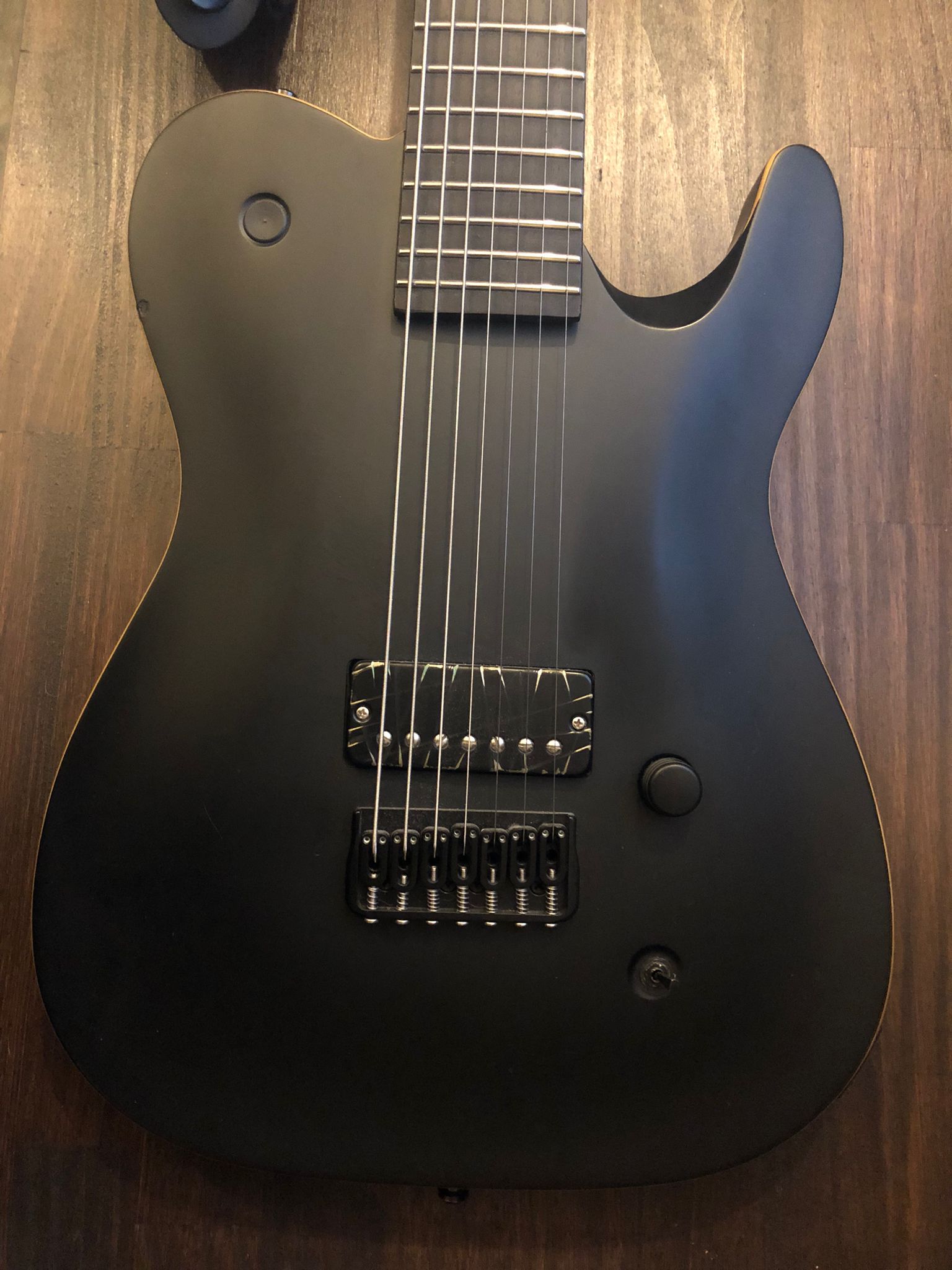 Jericho Fusion Ignition 7 cordes baritone 27"Montée avec un Bare Knuckle Nailbomb Ceramic Black Battleworn Soapbar 4 conducteurs