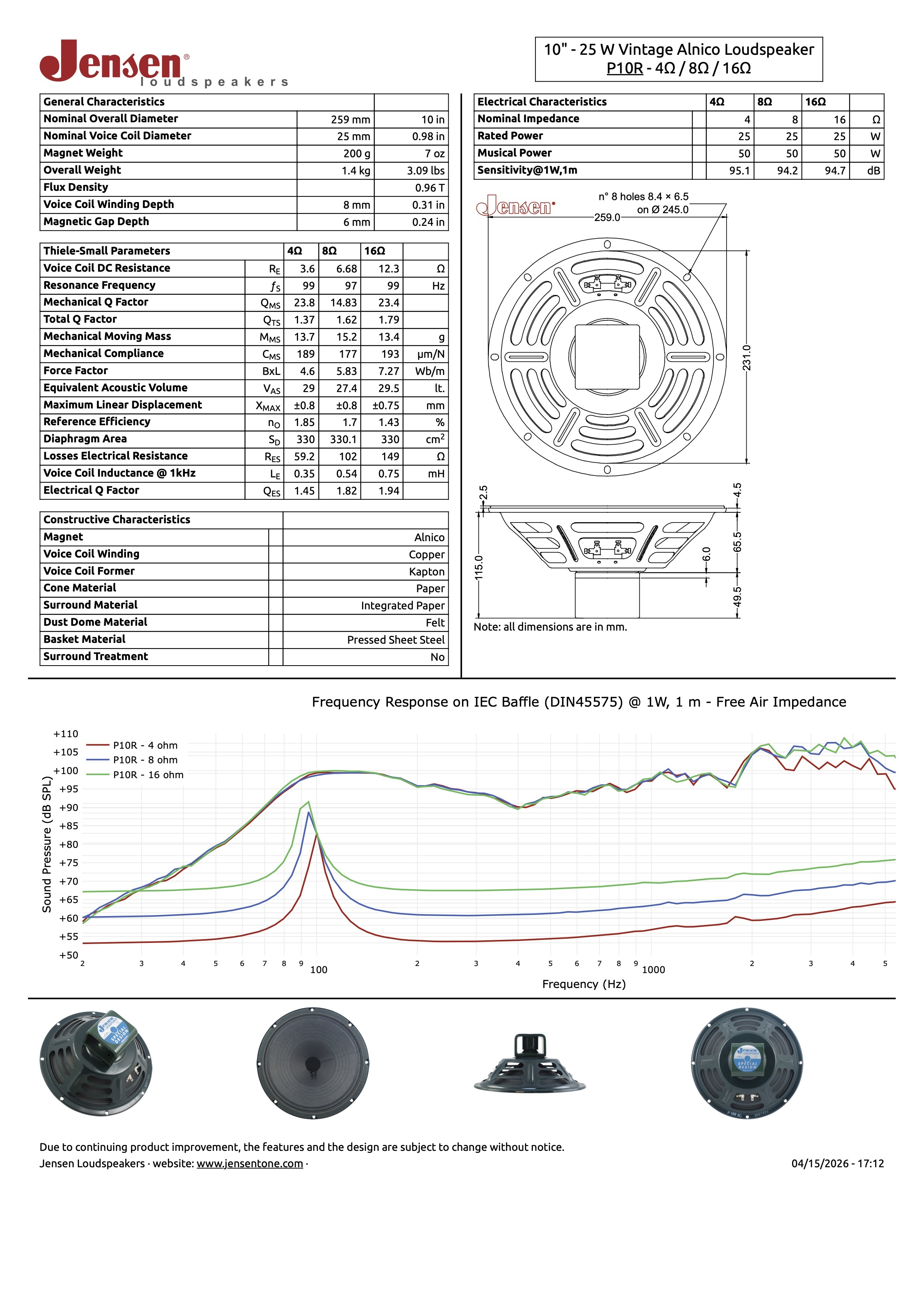 Jensen P10R Alnico Vintage 8 Ohm neuf