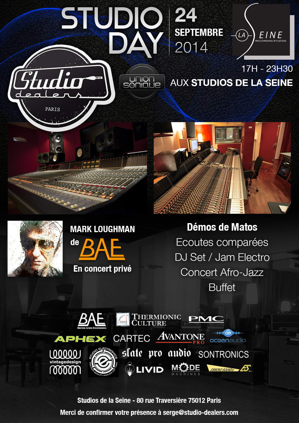 À partir de 17 heures, vous pourrez assister à des démos de matériel (préamplis BAE, Thermionic Culture, Aphex…), assister à des écoutes comparées (enceintes PMC vs PS), assister au concert de Mark Loughman de BAE. Un set de DJ et une jam electro sont également prévus. Le tour autour d’un buffet…
