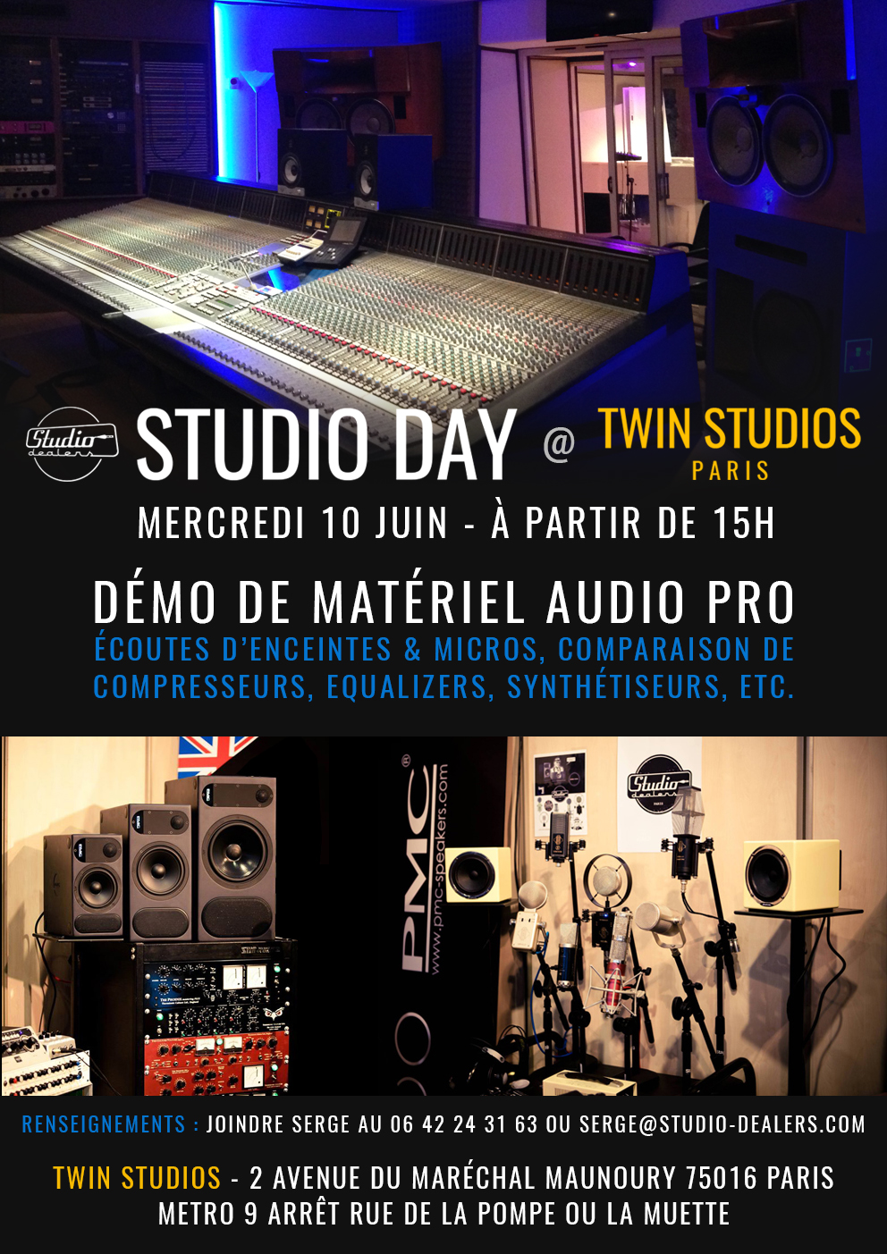Rendez-vous donc mercredi 10 juin à partir de 15h aux Twin Studios, 2 avenue du Maréchal Maunoury dans le 16e arrondissement de Paris (métro 9 Rue de la Pompe ou La Muette). Les places sont limitées, si vous souhaitez assister à l’évènement, contactez serge@studio-dealers.com.